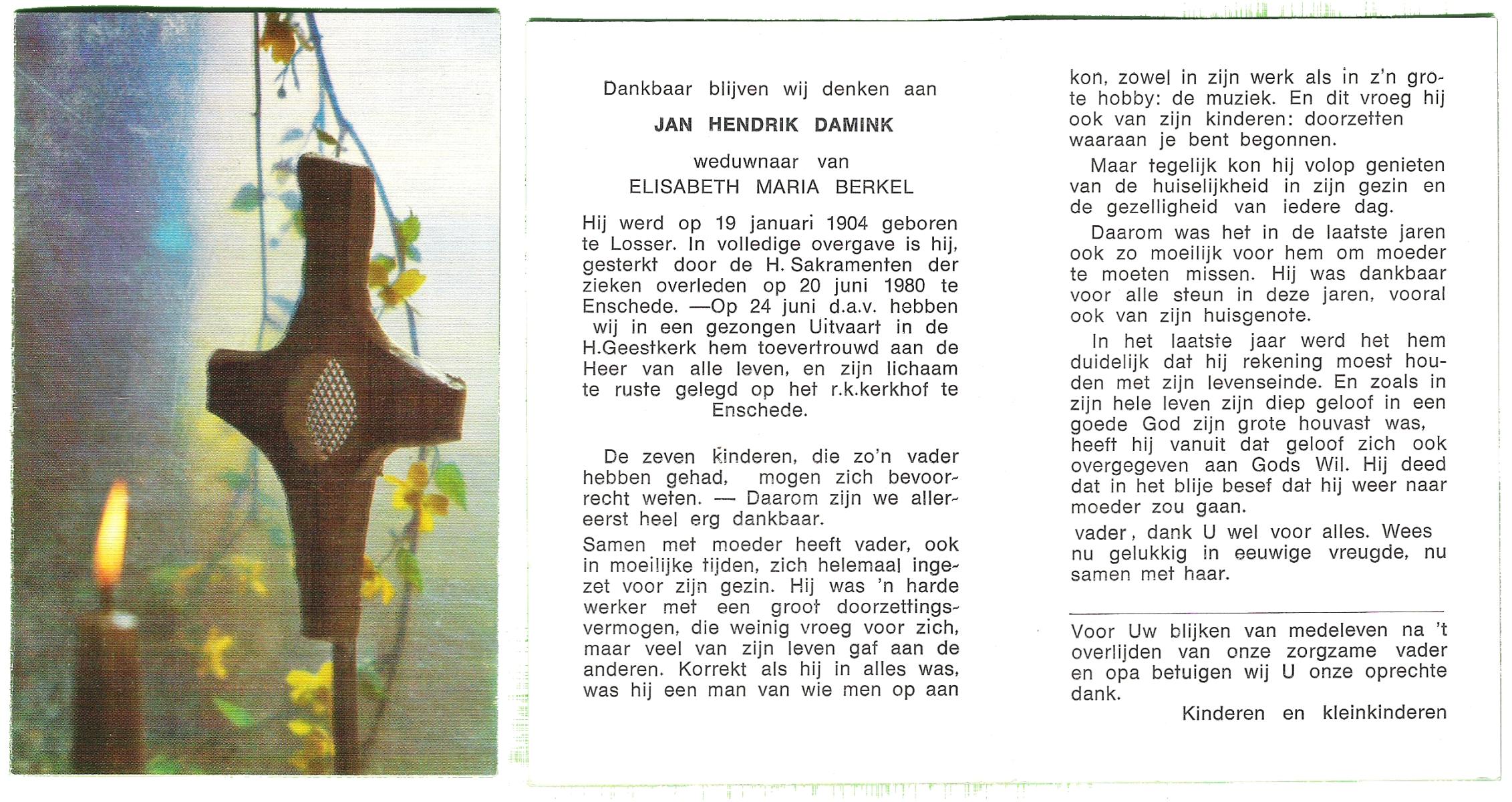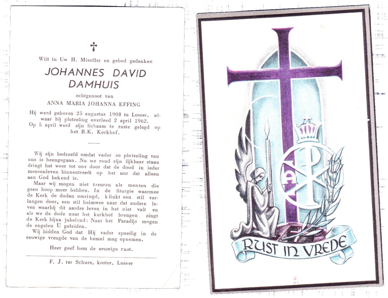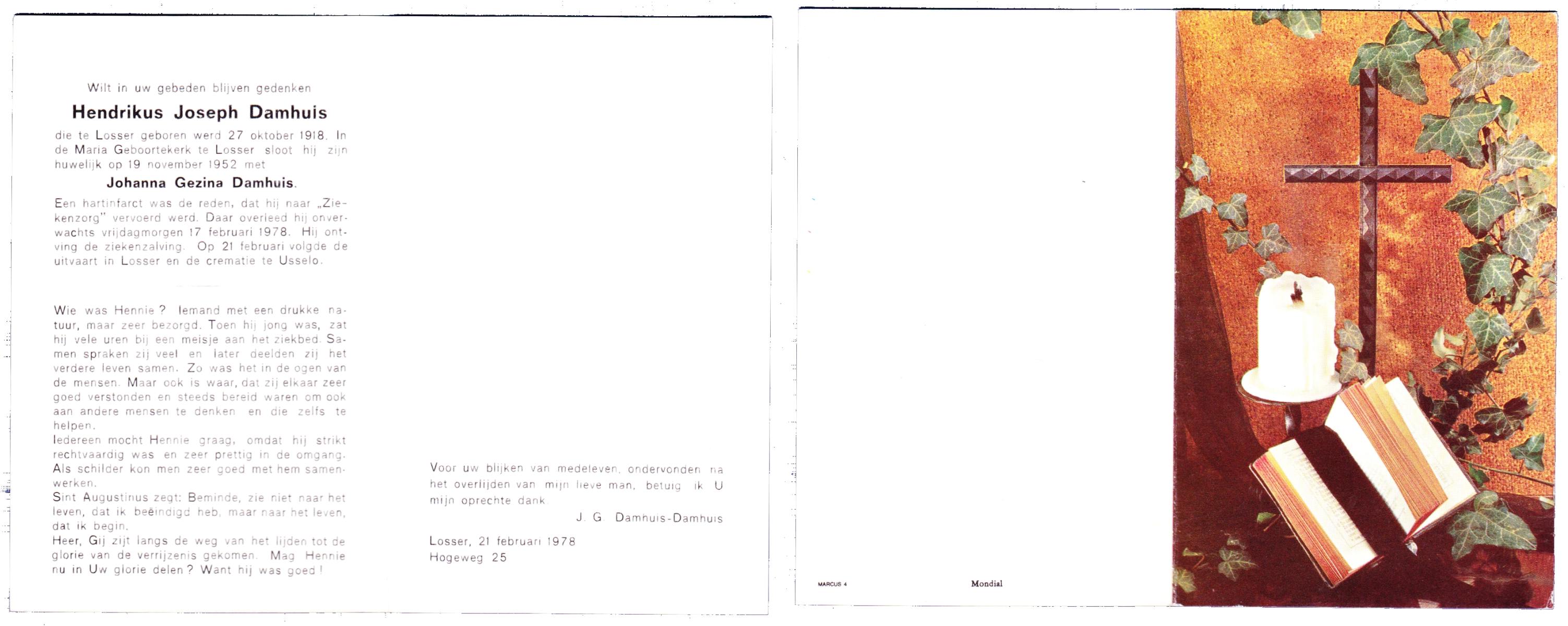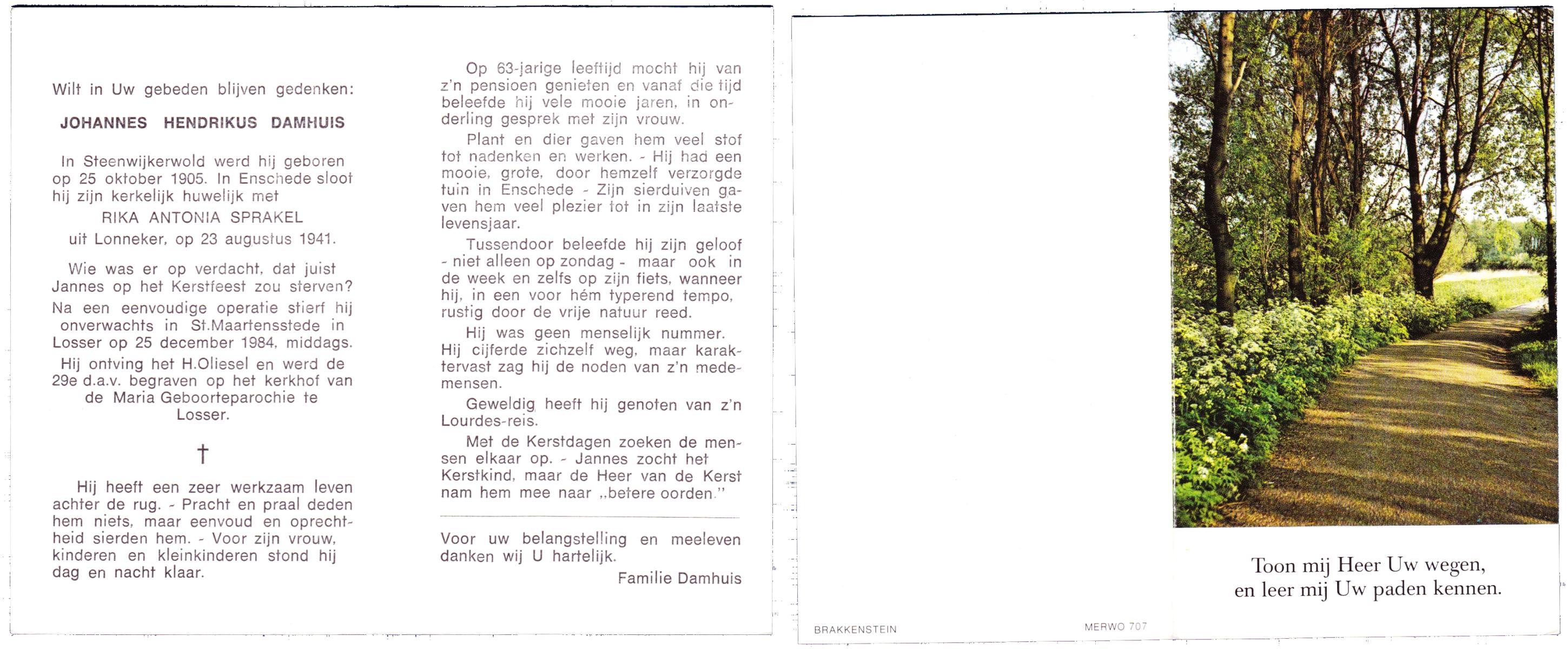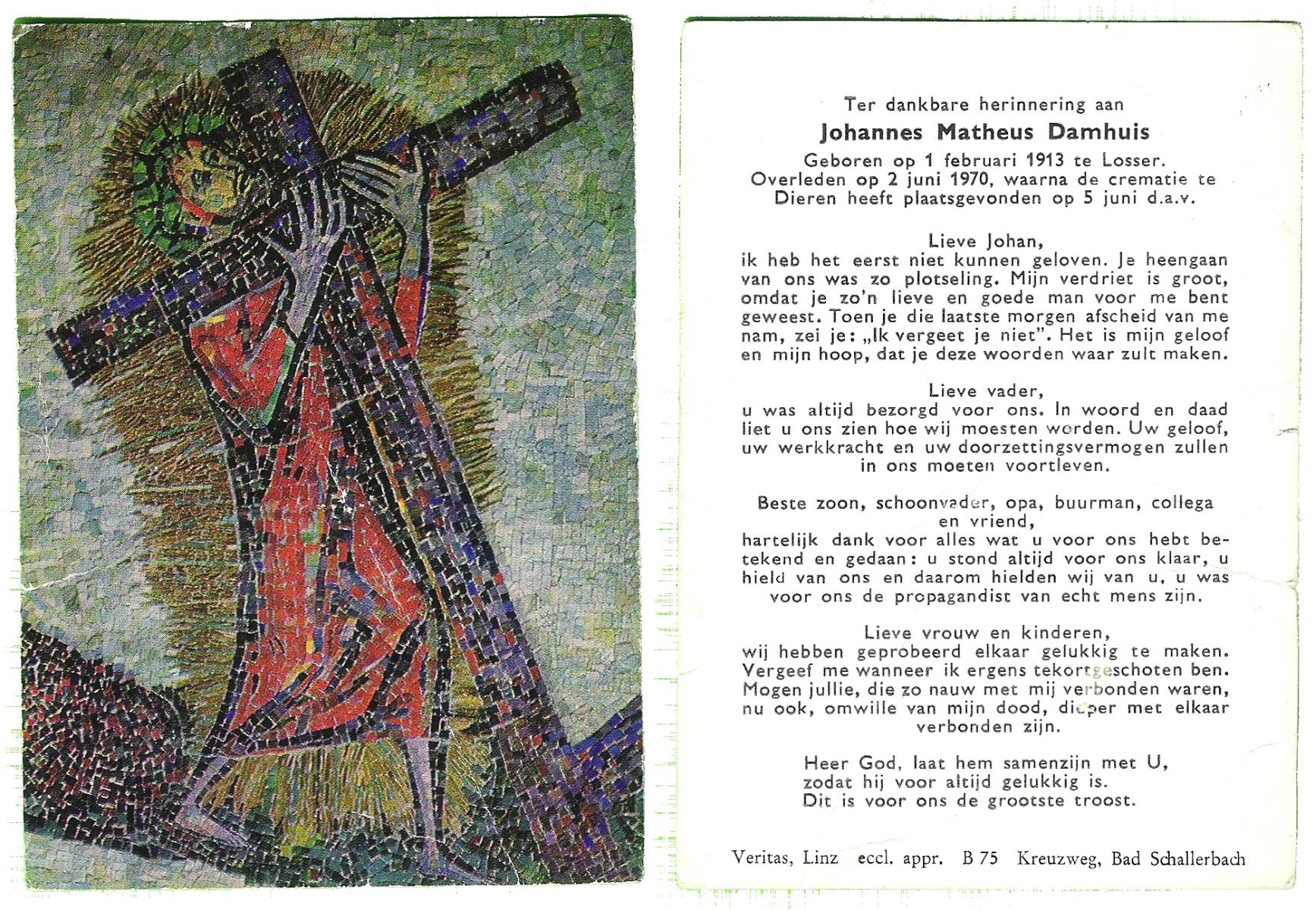 DAMHUIS, Bernardus Hendrikus, geboren op 19-8-1908 te Weerselo, overleden op 10-4-1969 te Losser op 60-jarige leeftijd, begraven op 14-4-1969 te Losser.