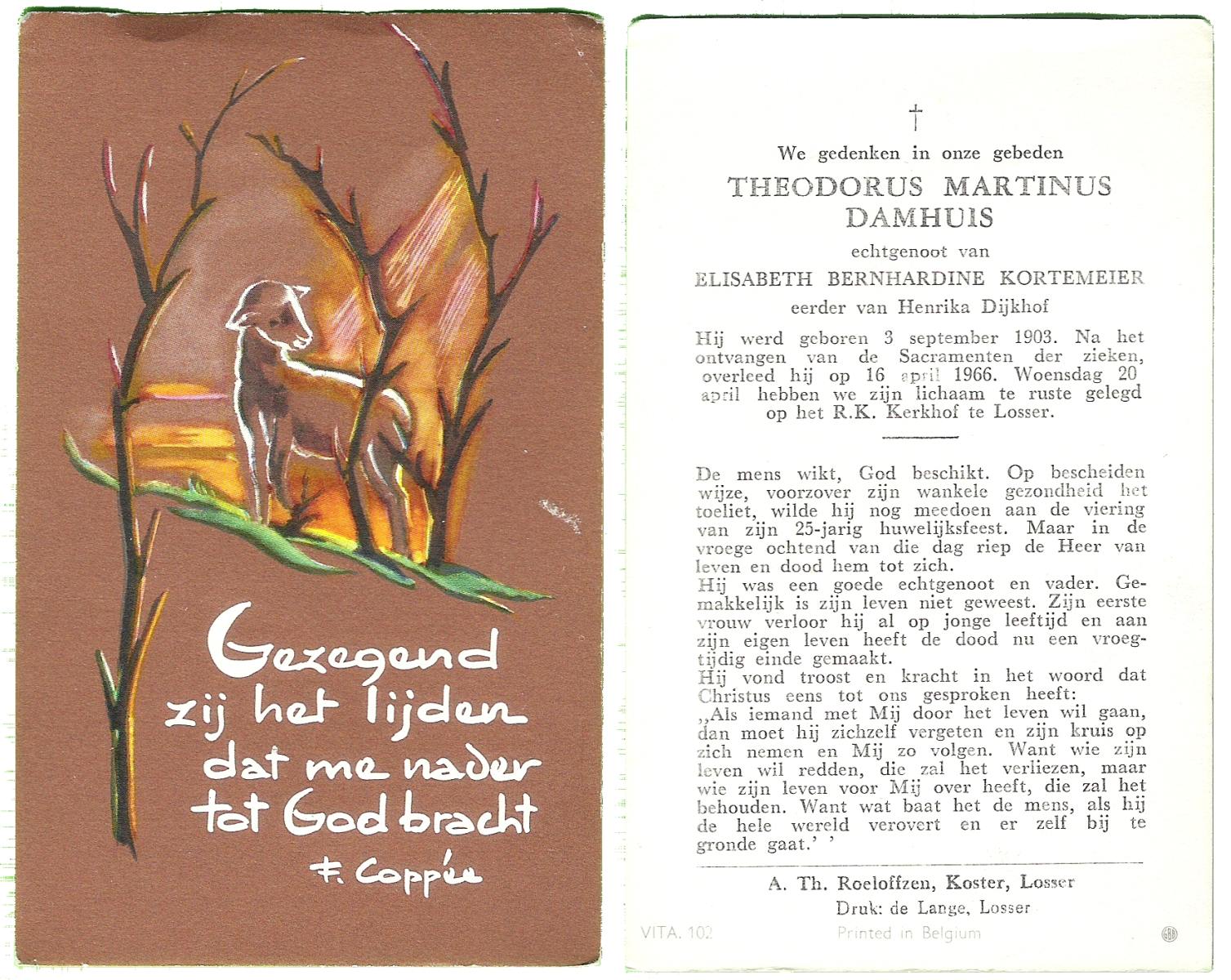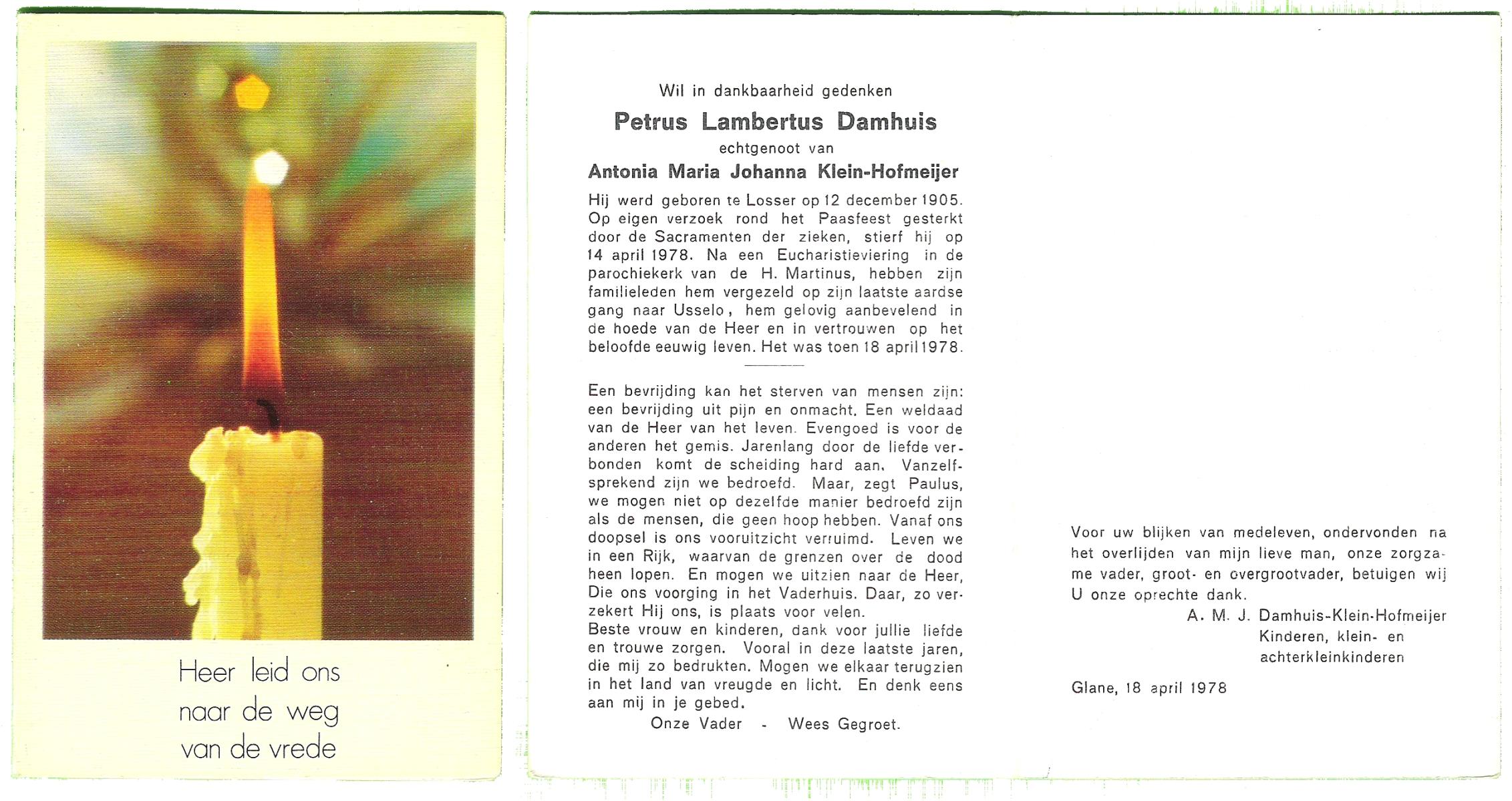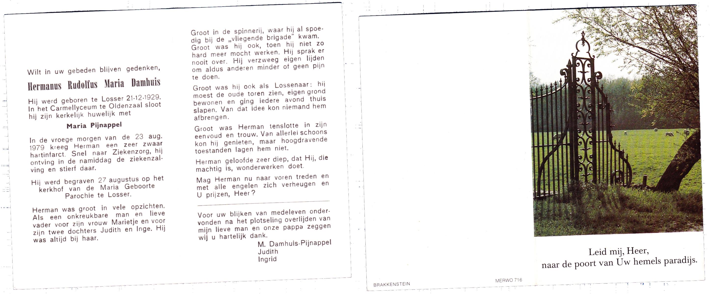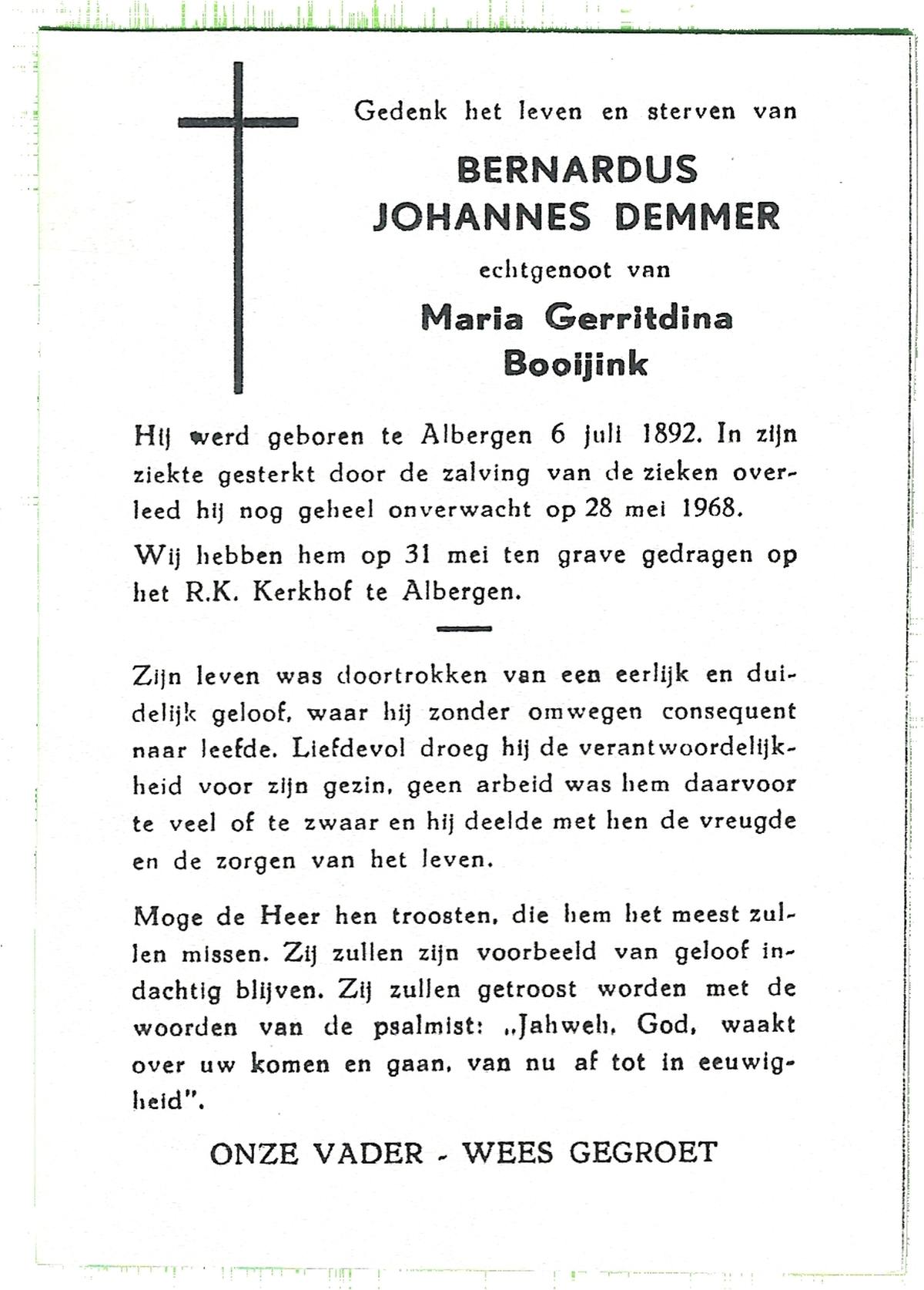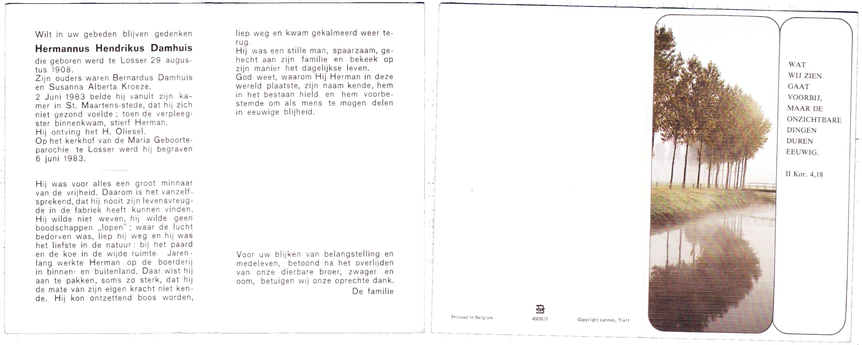 DAMHUIS, Bernardus Hendrikus, geboren op 19-8-1908 te Weerselo, overleden op 10-4-1969 te Losser op 60-jarige leeftijd, begraven op 14-4-1969 te Losser.