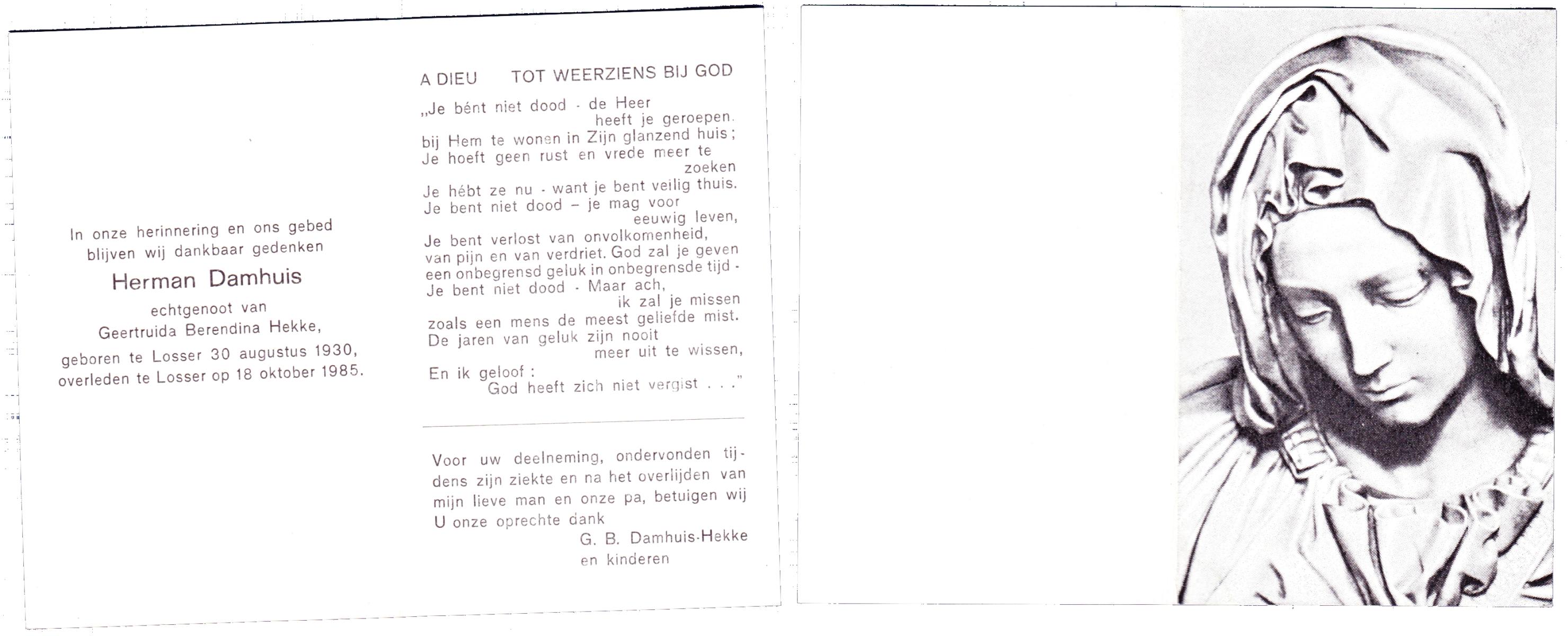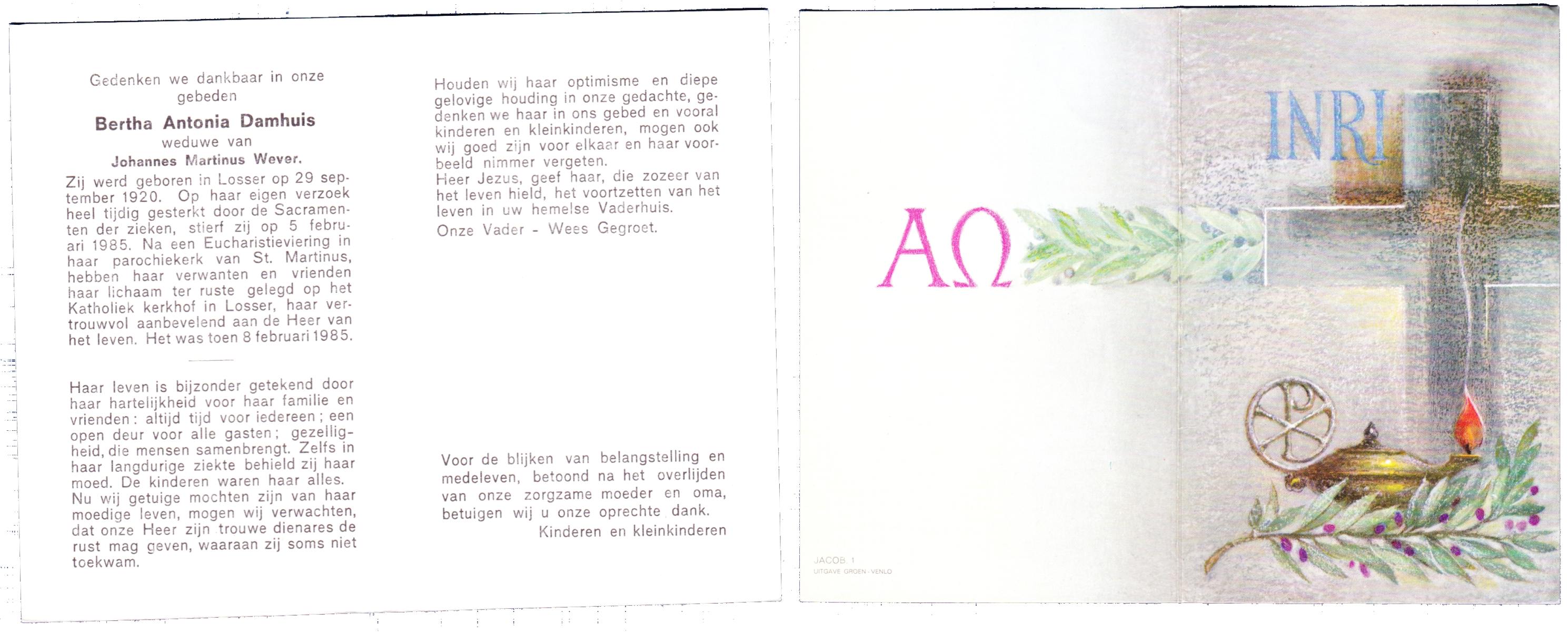 DAMHUIS, Bertha Antonia, geboren op 29-9-1920 te Losser, overleden op 5-2-1985 op 64-jarige leeftijd, begraven op 8-2-1985 te Losser.