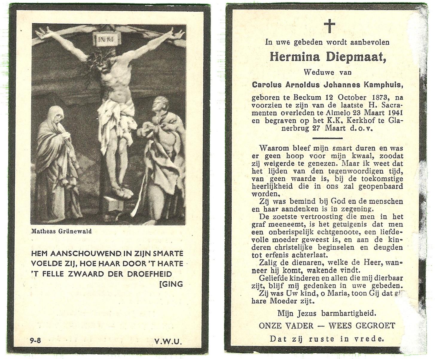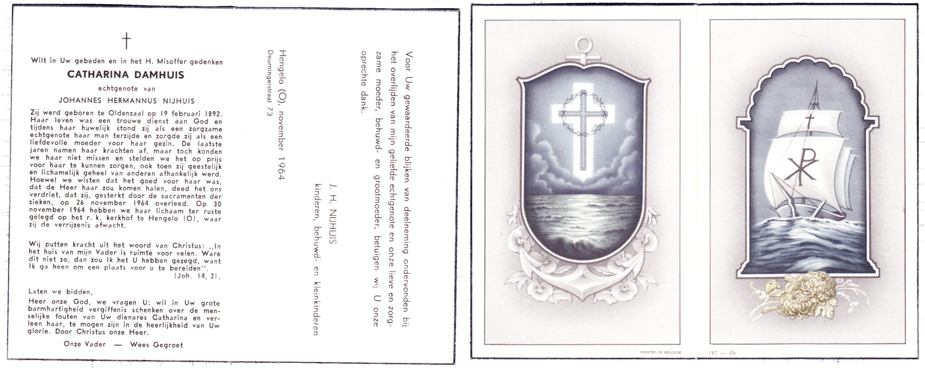 DAMHUIS, Catharina, geboren op 19-02-1892 te Oldenzaal, overleden op 26-11-1964 op 72-jarige leeftijd, begraven op 30-11-1964 te Hengelo (Ov.).