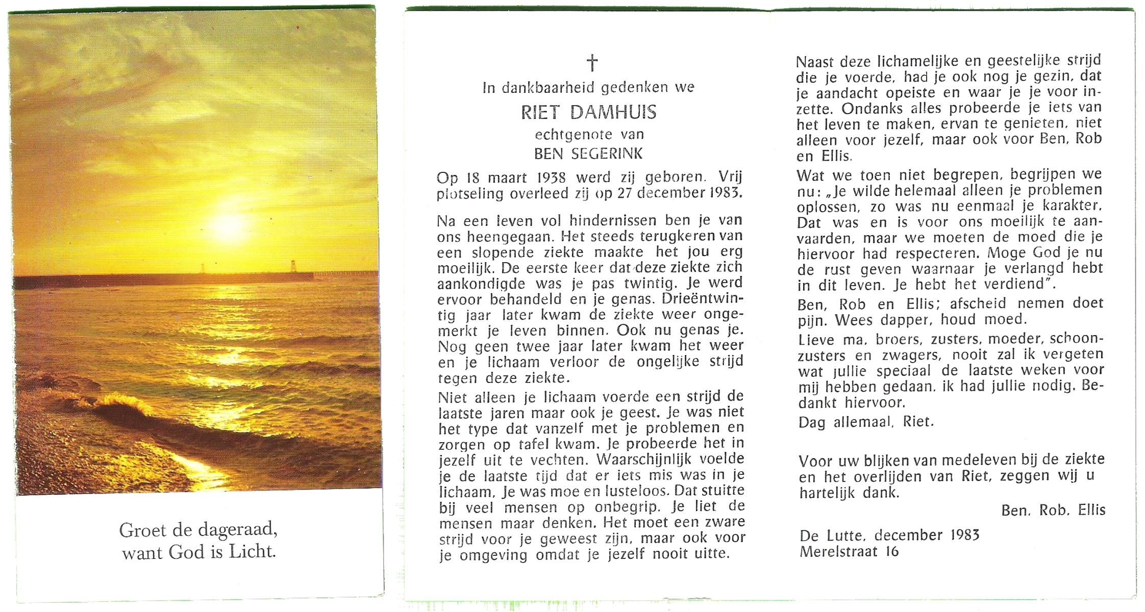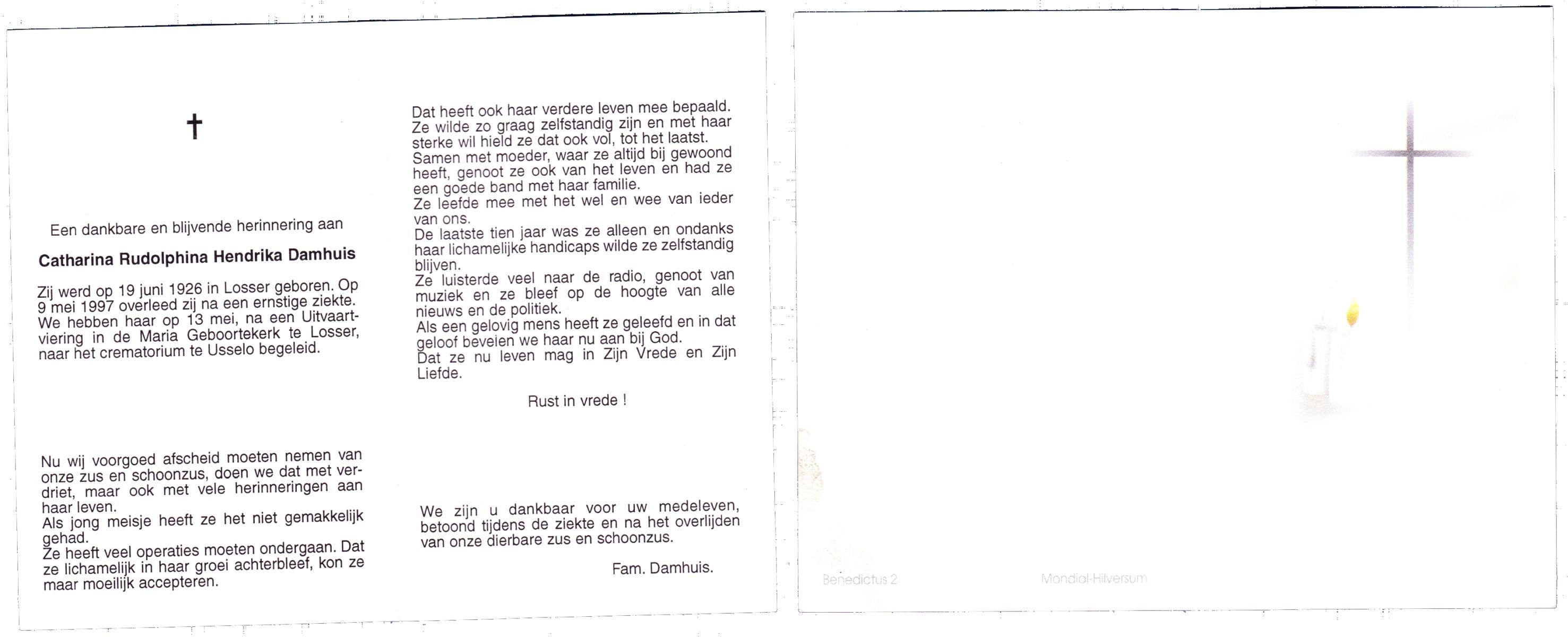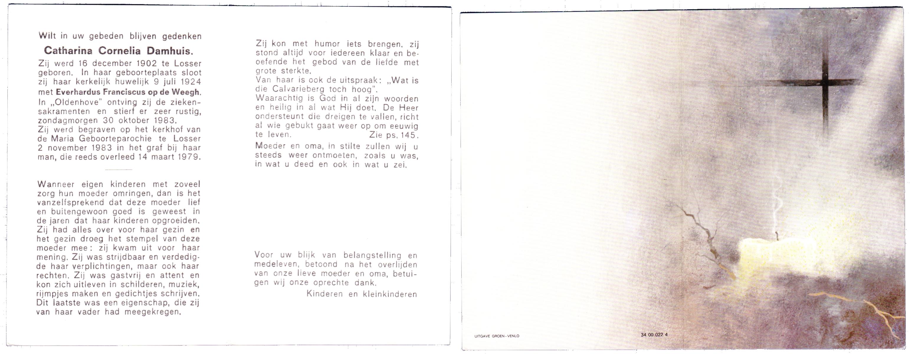 DAMHUIS, Catharina Cornelia, geboren op 16-12-1902 te Losser, overleden op 30-10-1983 te Losser op 80-jarige leeftijd, begraven op 2-11-1983 te Losser.
