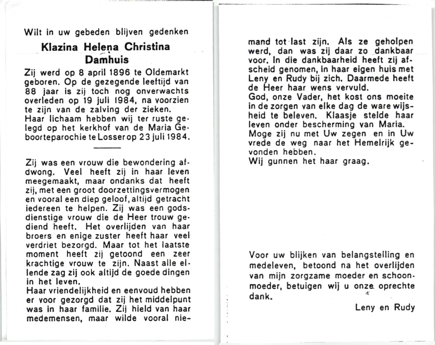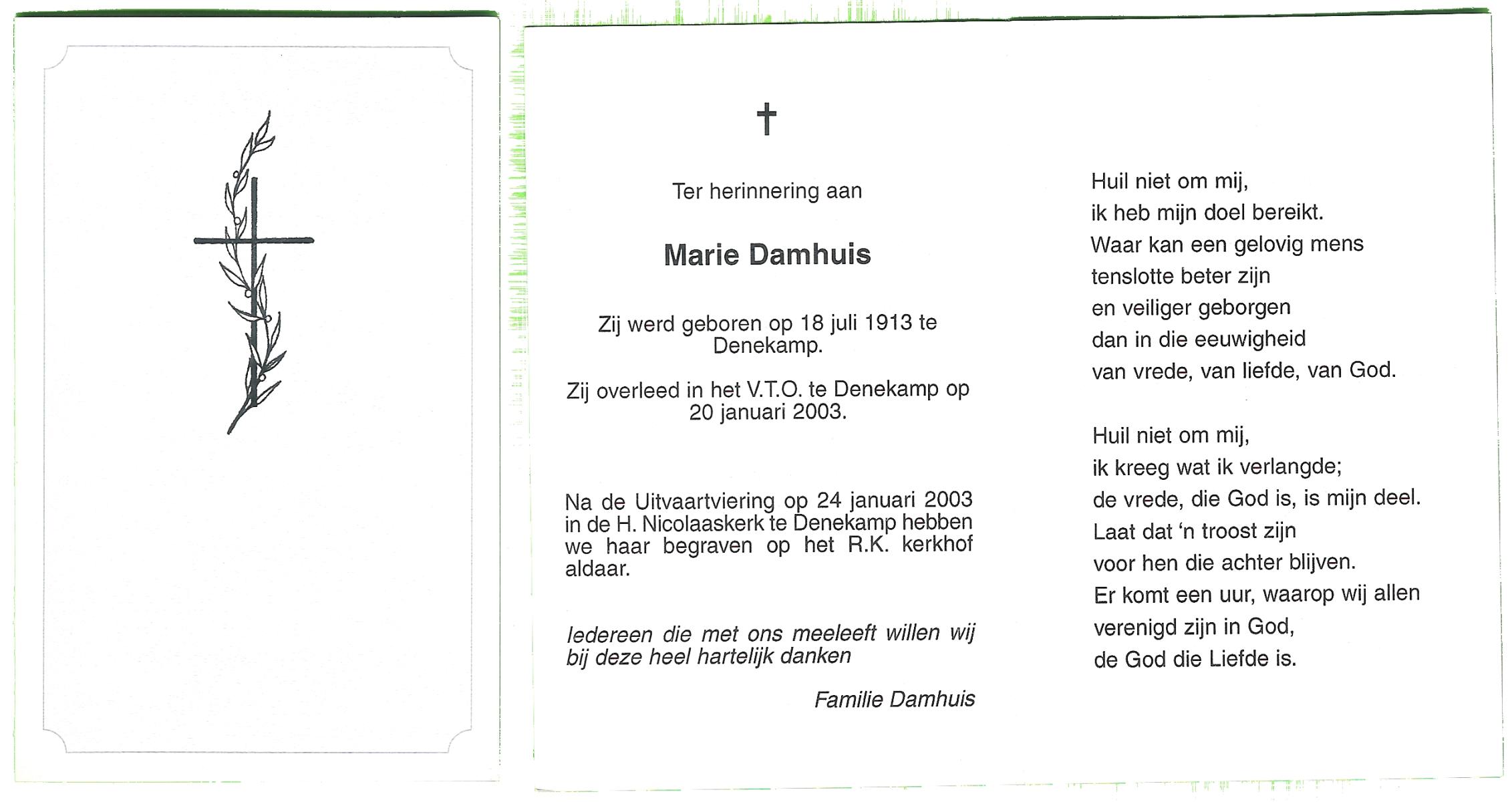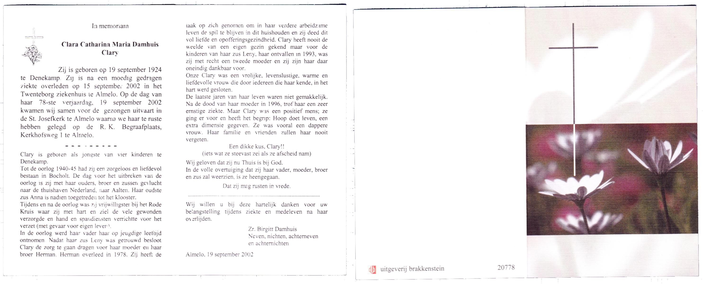 DAMHUIS, Clara Catharina Maria, geboren op 19-9-1924 te Denekamp, overleden op 15-9-2002 te Almelo op 77-jarige leeftijd, begraven op 19-9-2002 te Almelo R.K.Kerkhof.