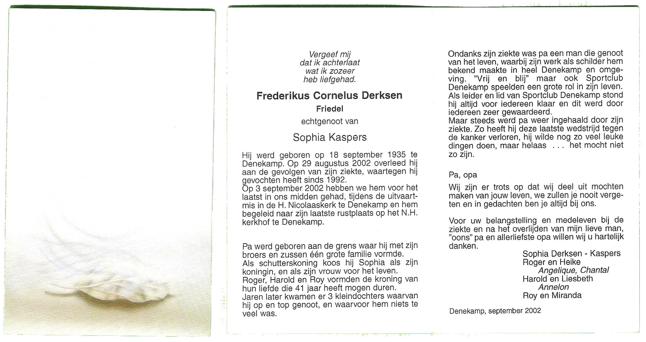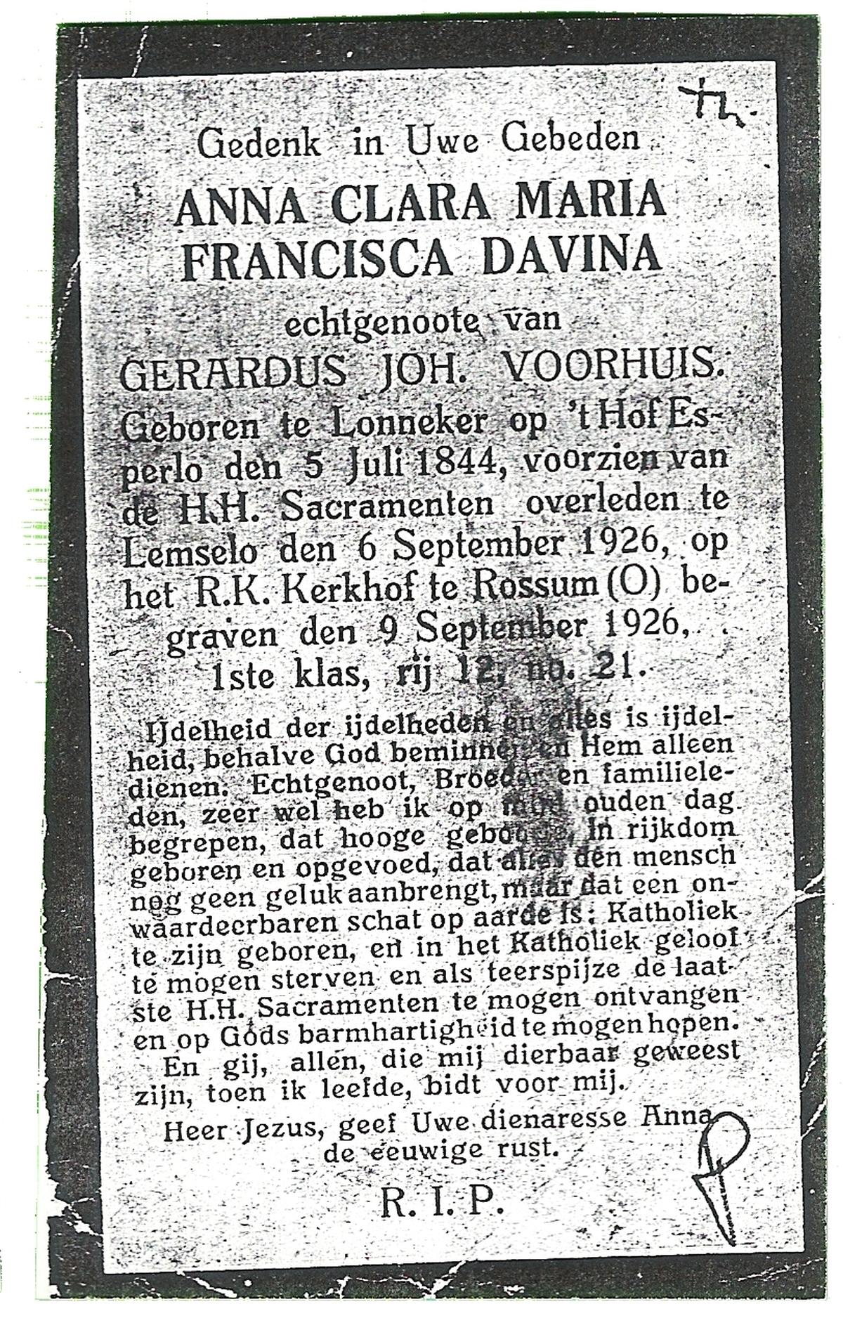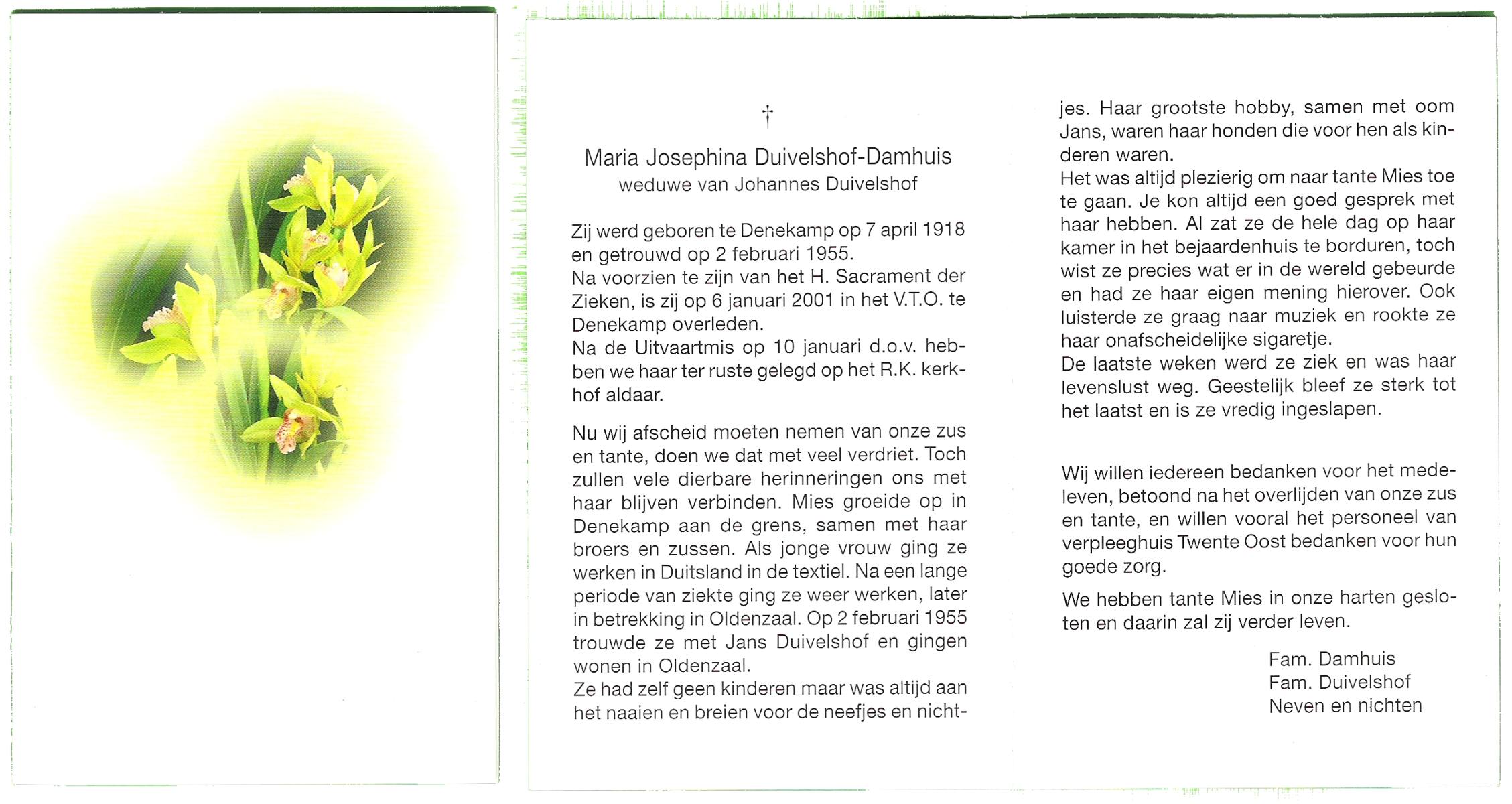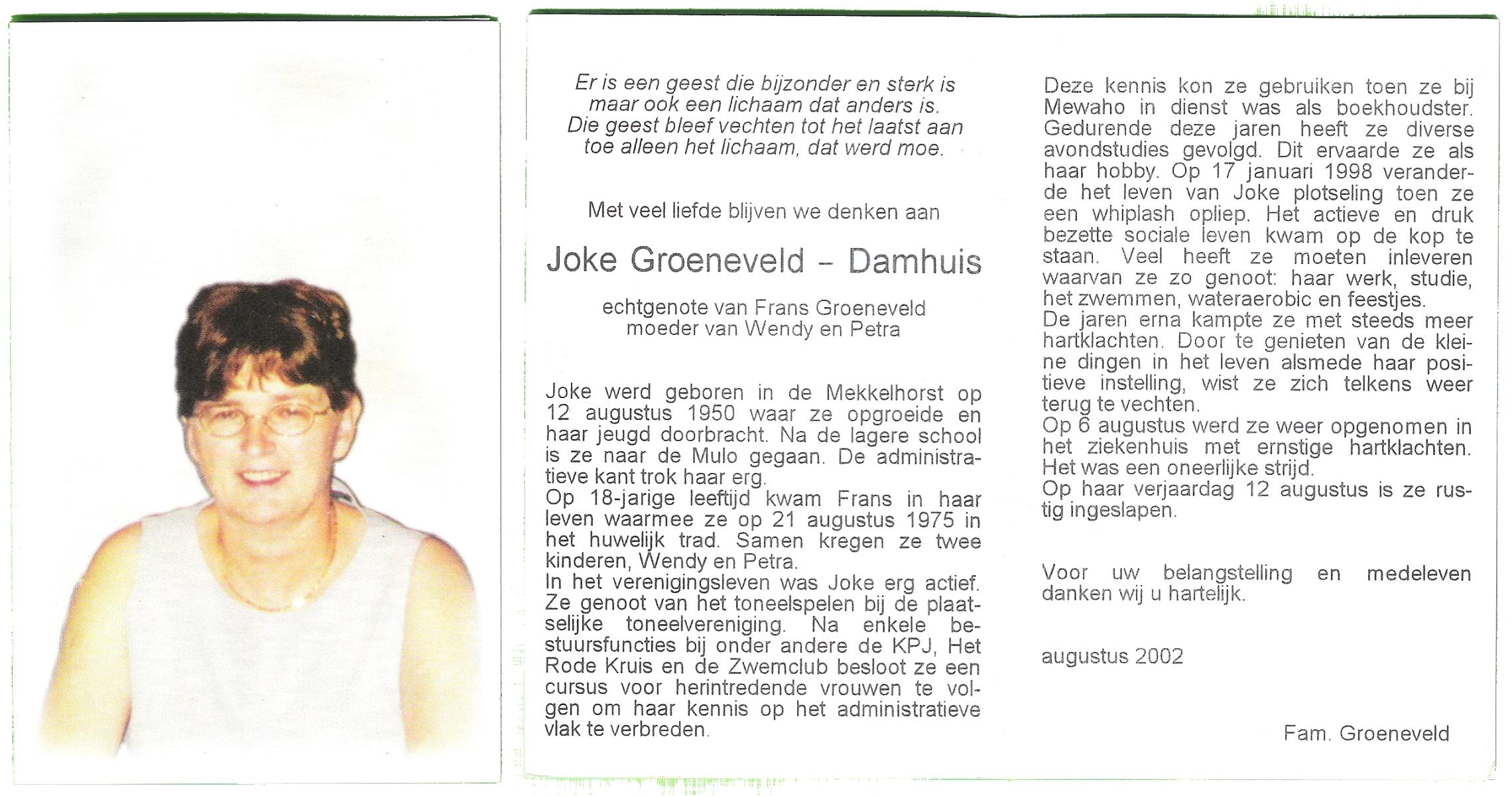 DAMHUIS, Clara Catharina Maria, geboren op 19-9-1924 te Denekamp, overleden op 15-9-2002 te Almelo op 77-jarige leeftijd, begraven op 19-9-2002 te Almelo R.K.Kerkhof.