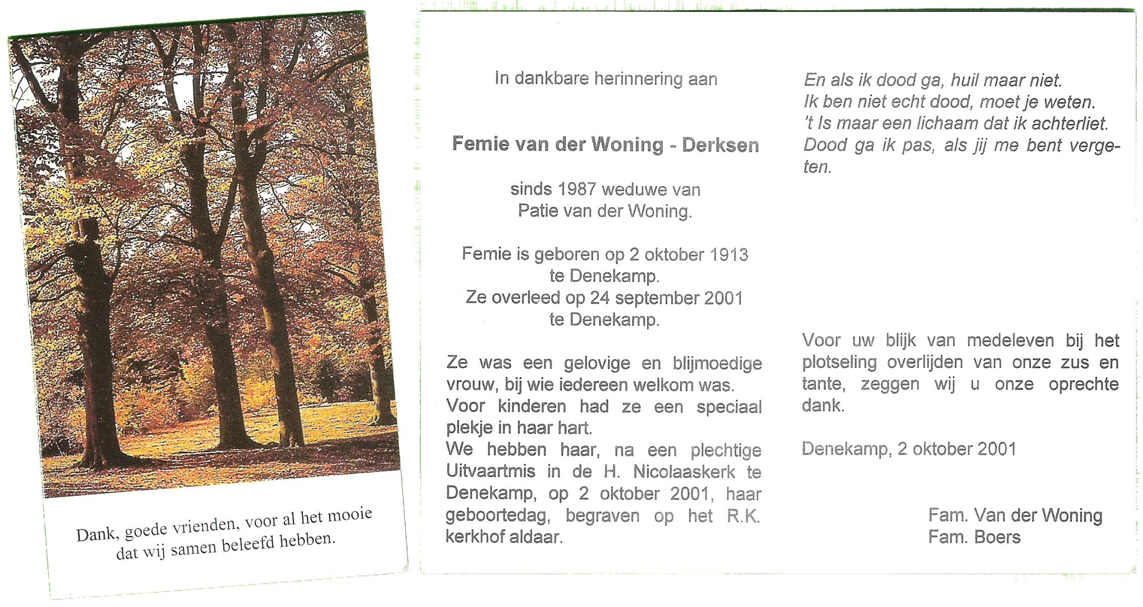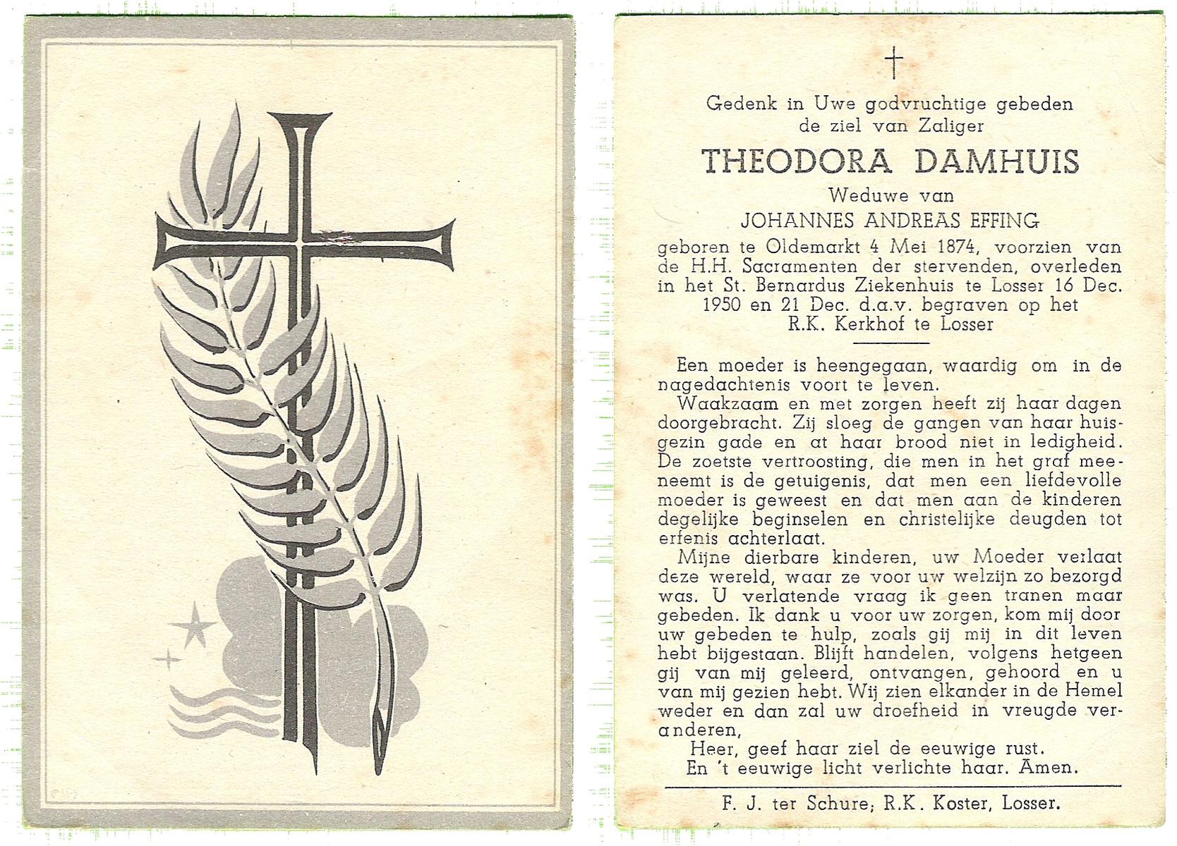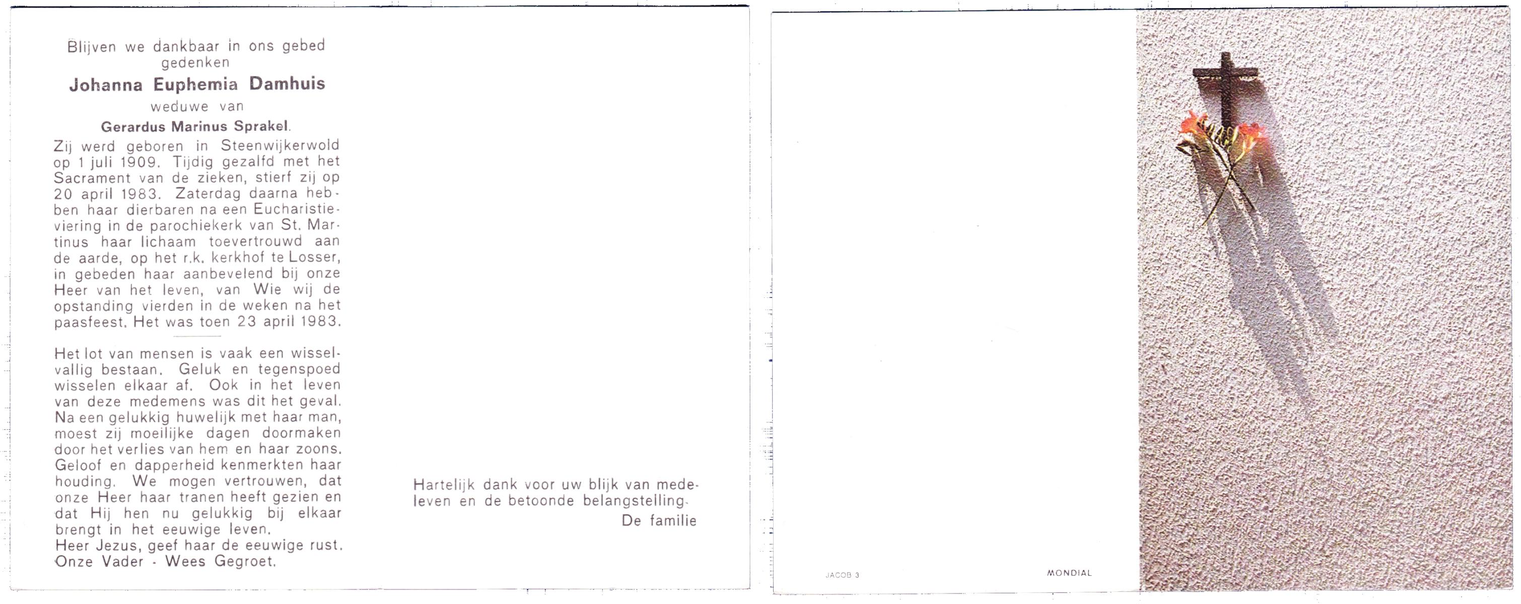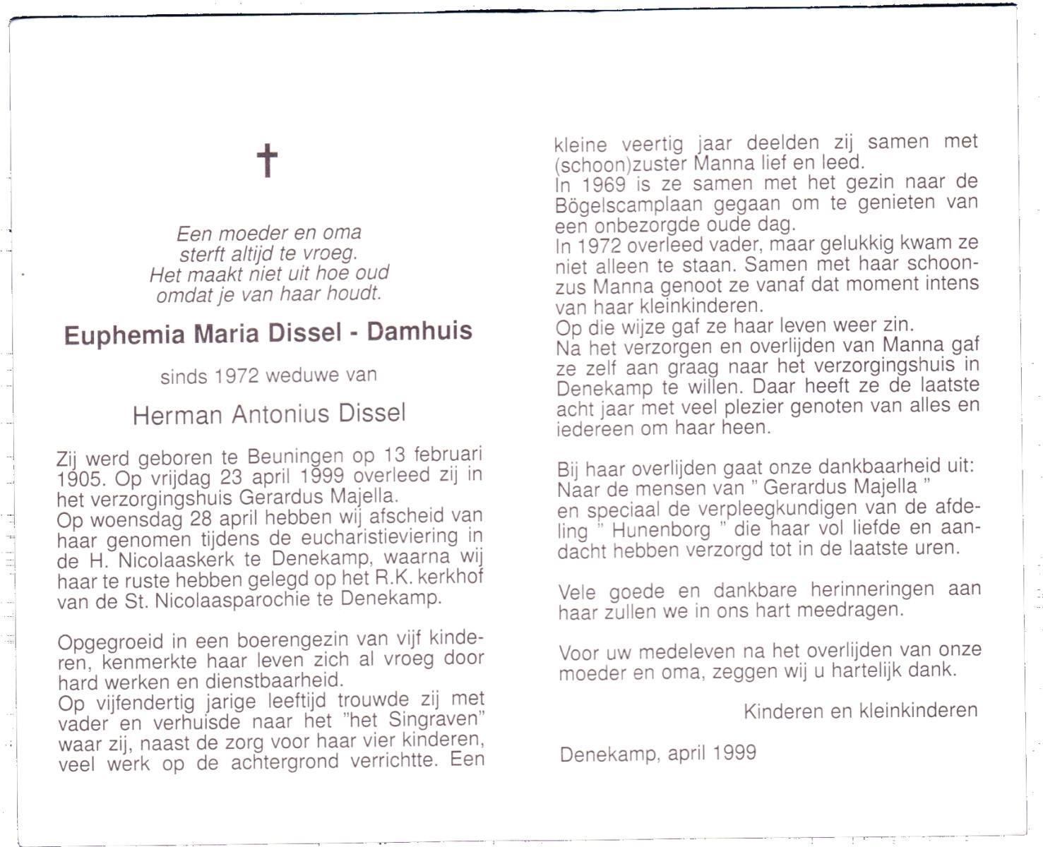 DAMHUIS, Euphemia Maria, geboren op 13-2-1905 te Beuningen (Ov.), overleden op 23-4-1999 op 94-jarige leeftijd, begraven op 28-4-1999 te Denekamp.