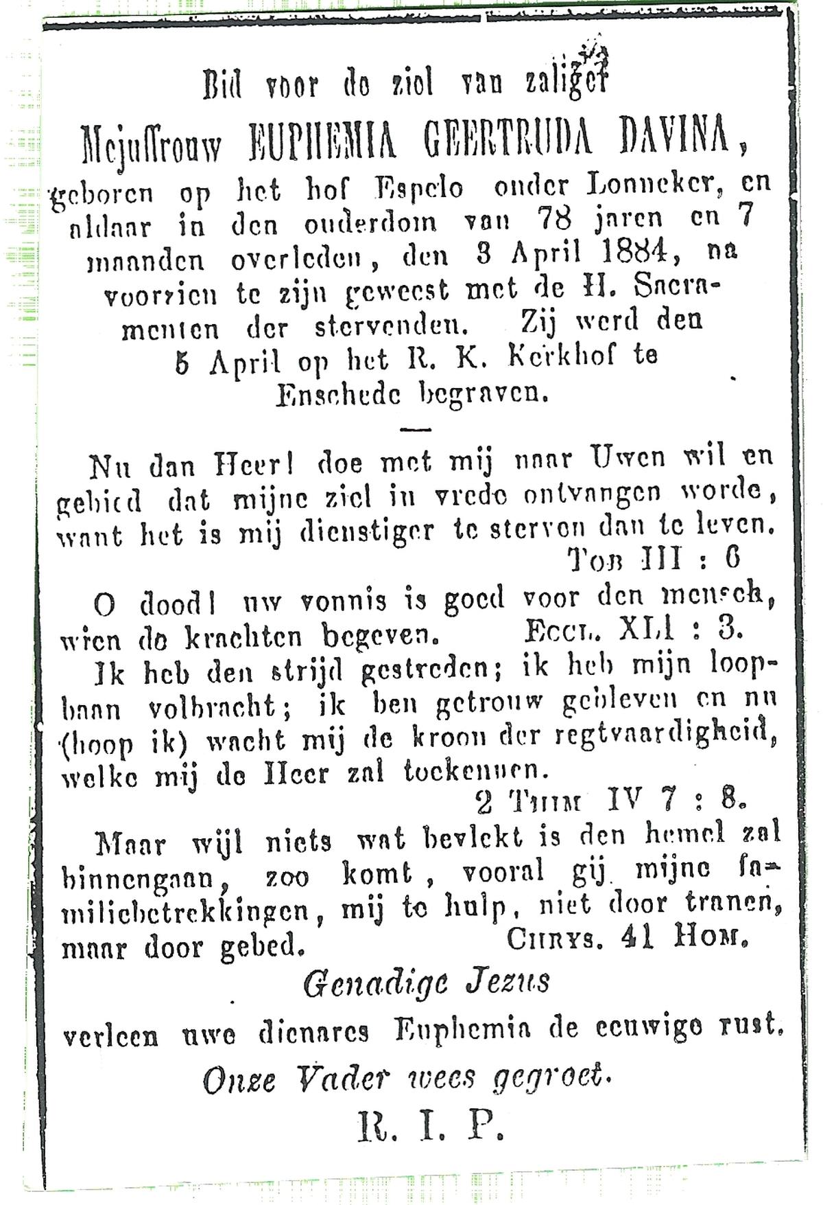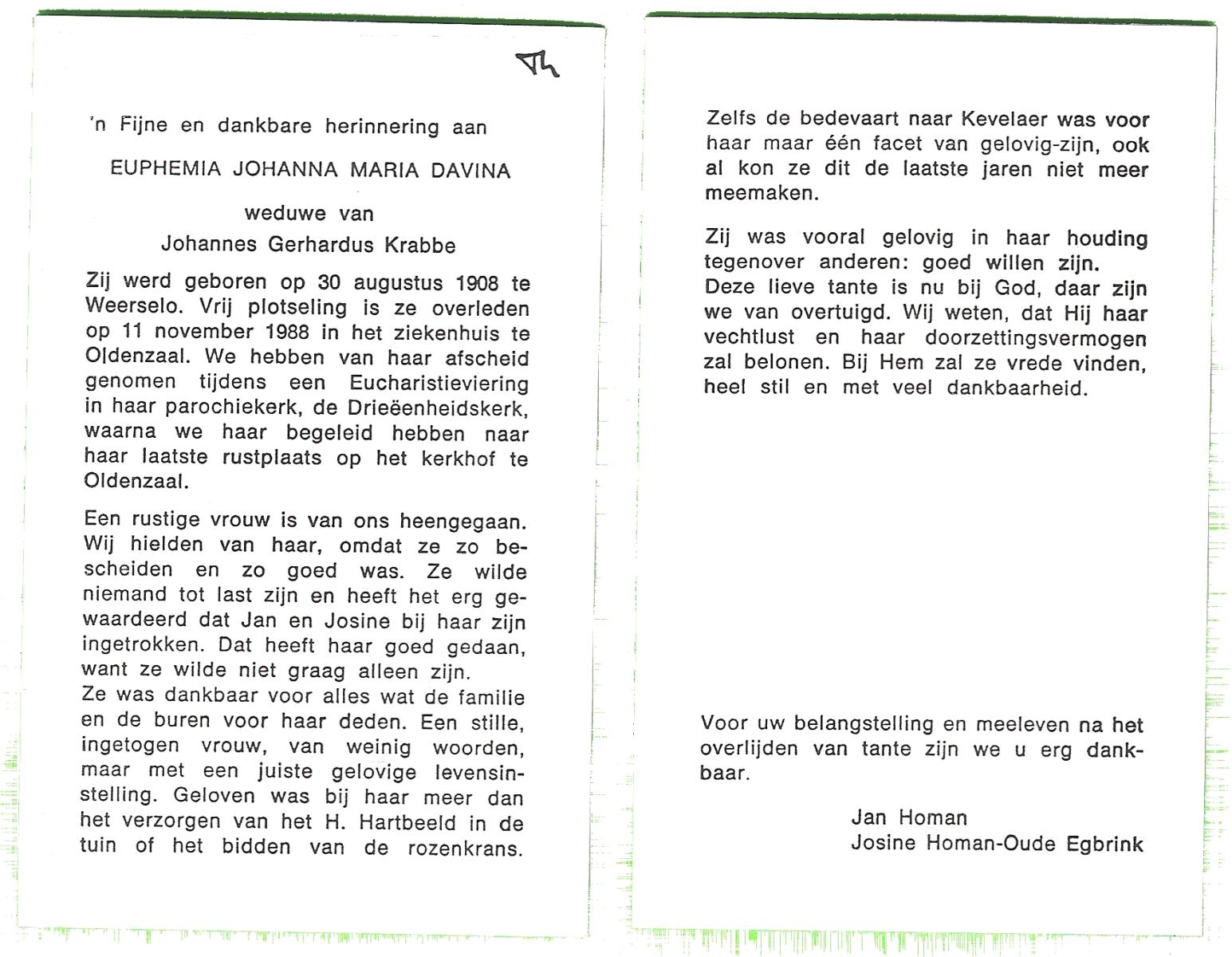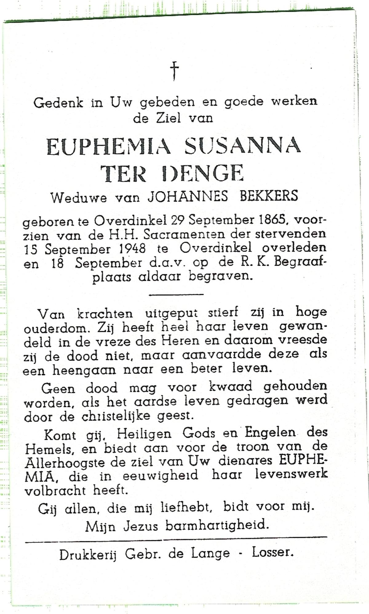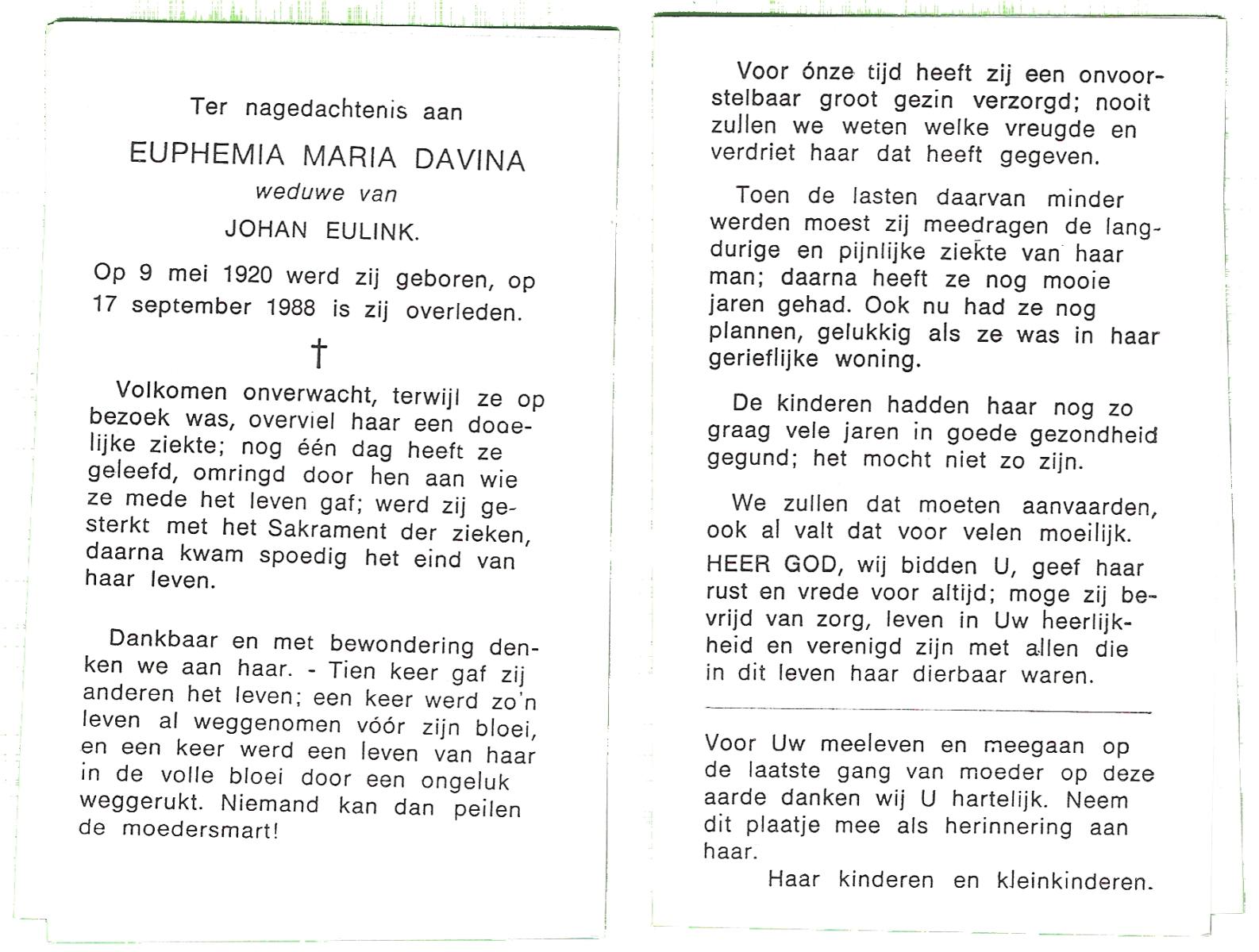 DAMHUIS, Euphemia Maria, geboren op 13-2-1905 te Beuningen (Ov.), overleden op 23-4-1999 op 94-jarige leeftijd, begraven op 28-4-1999 te Denekamp.