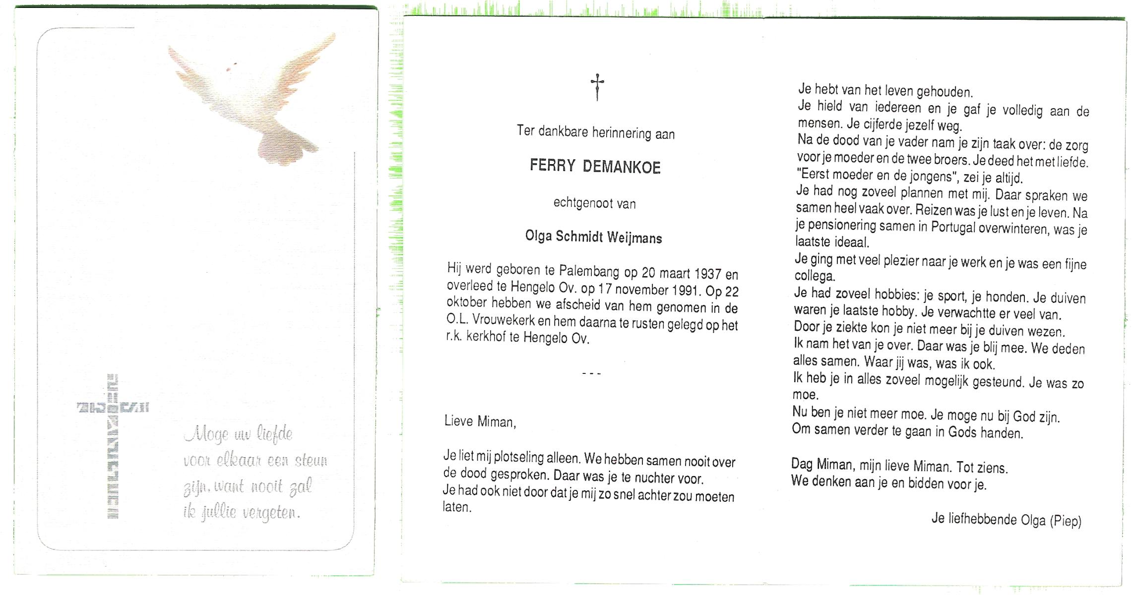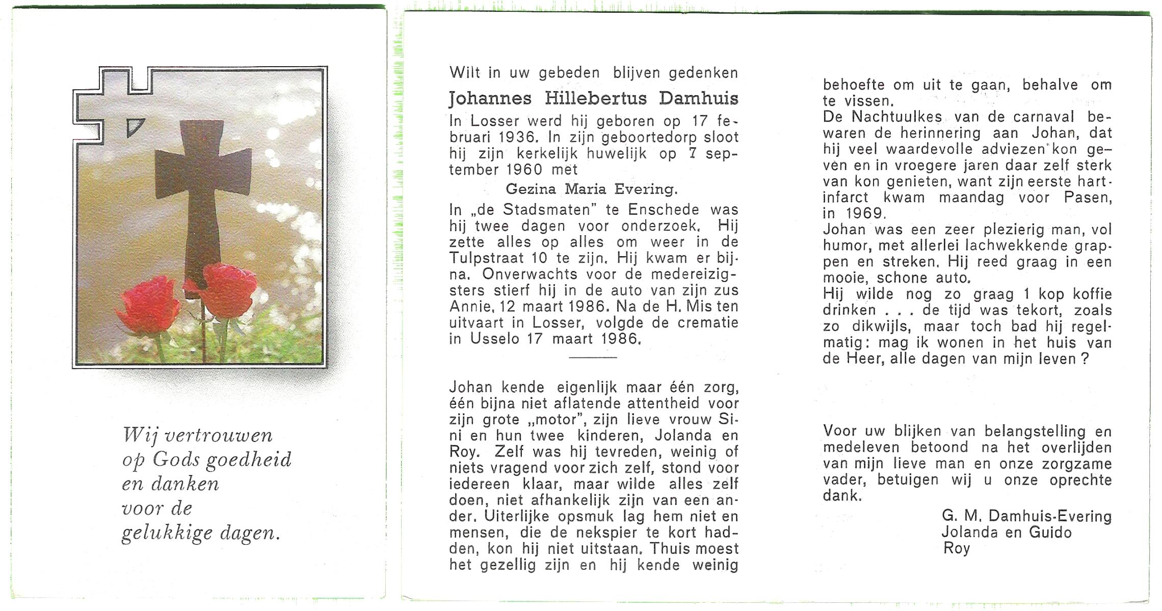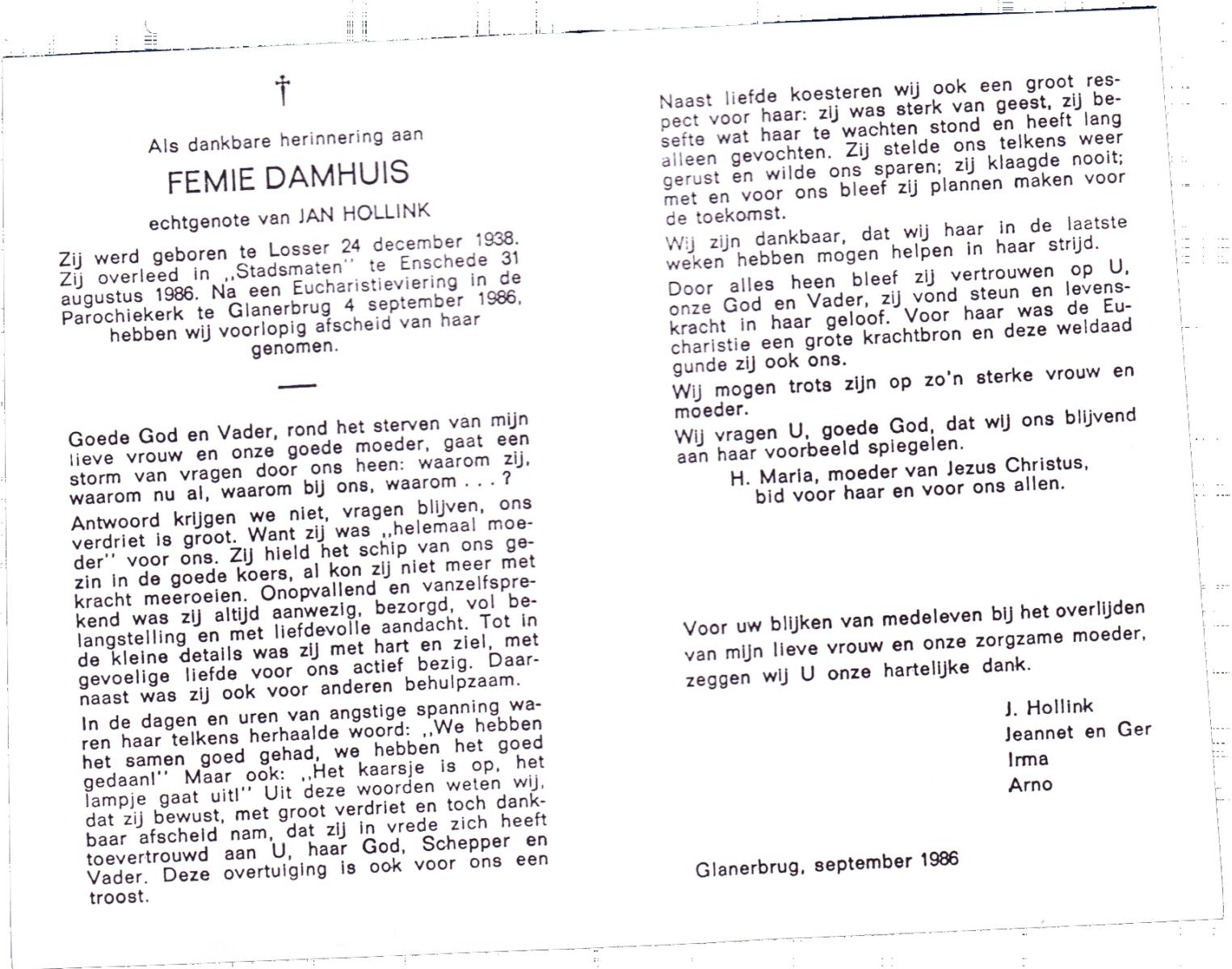 DAMHUIS, Femie, geboren op 24-12-1938 te Losser, overleden op 31-8-1986 te Enschede op 47-jarige leeftijd.