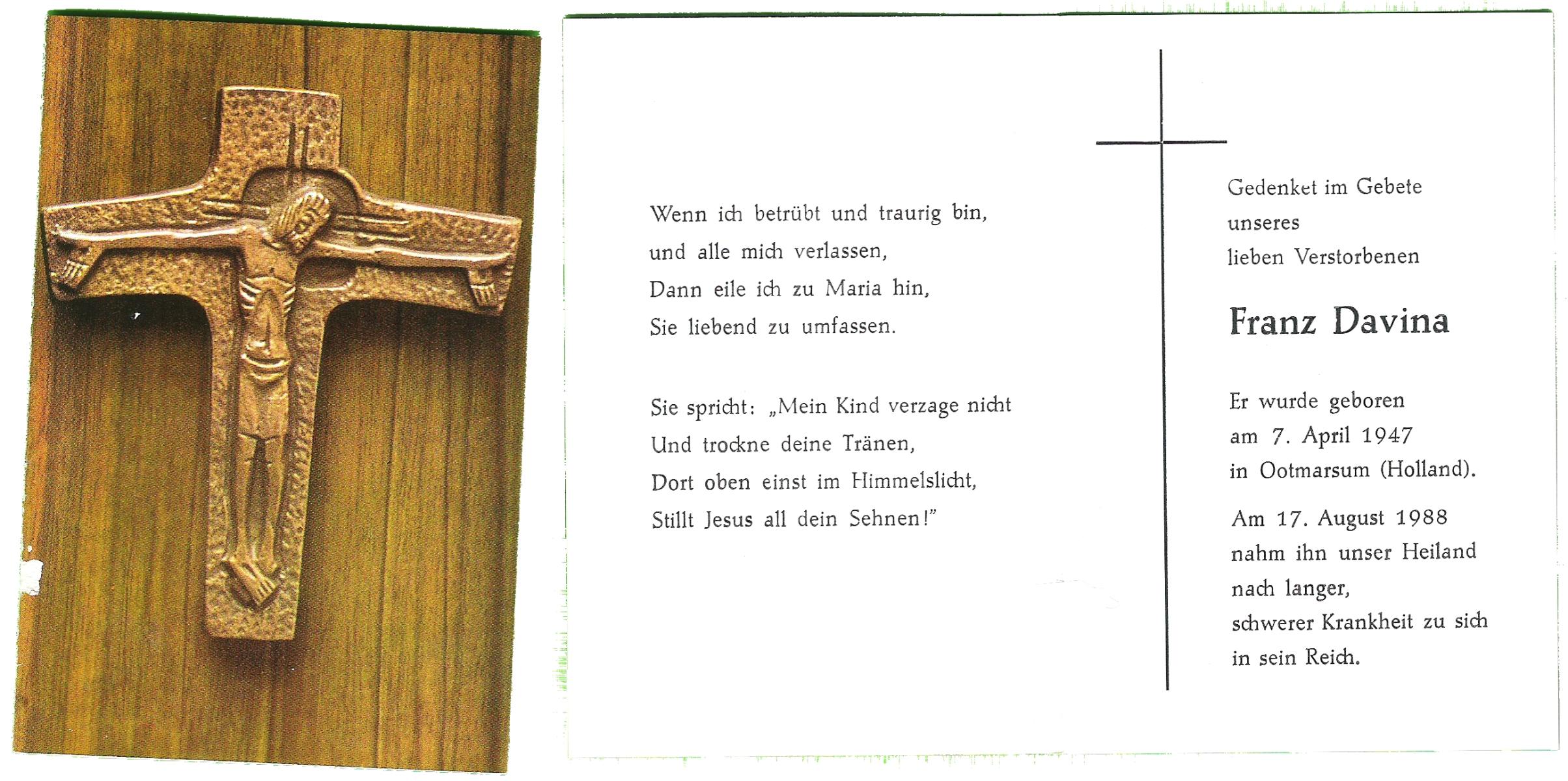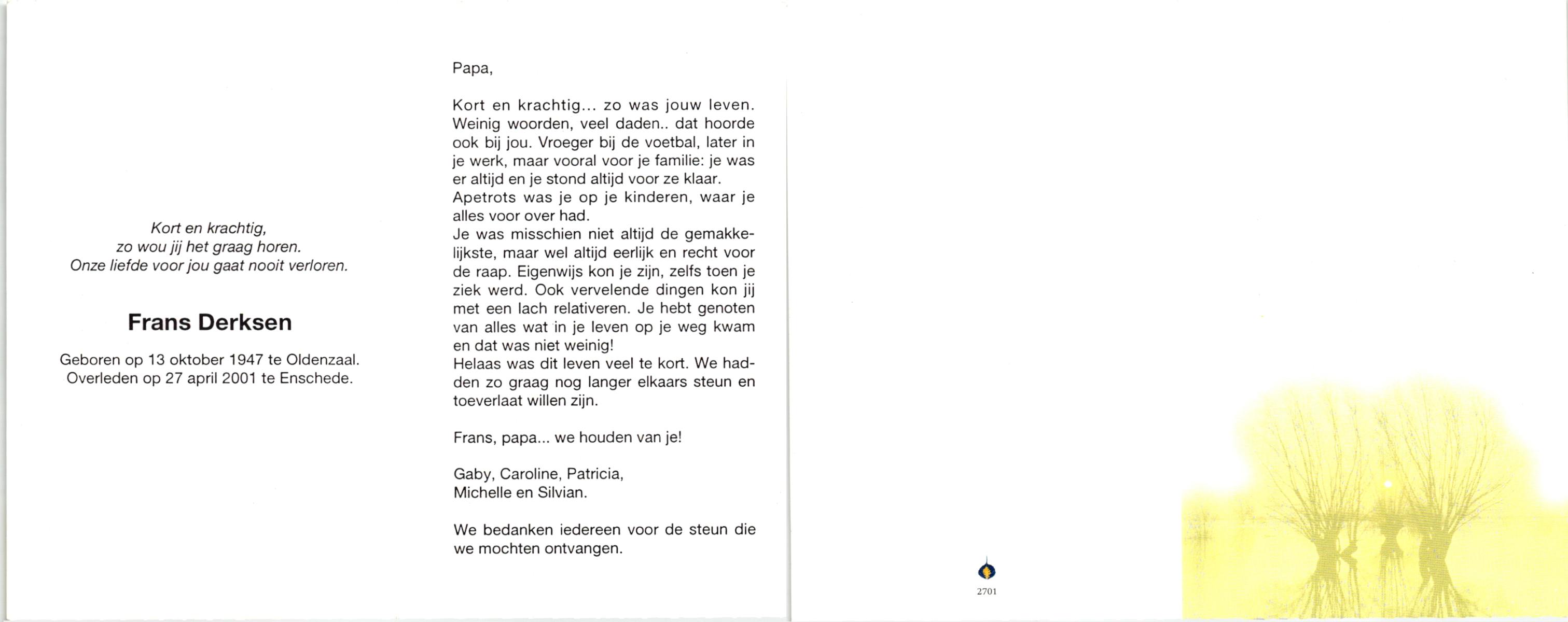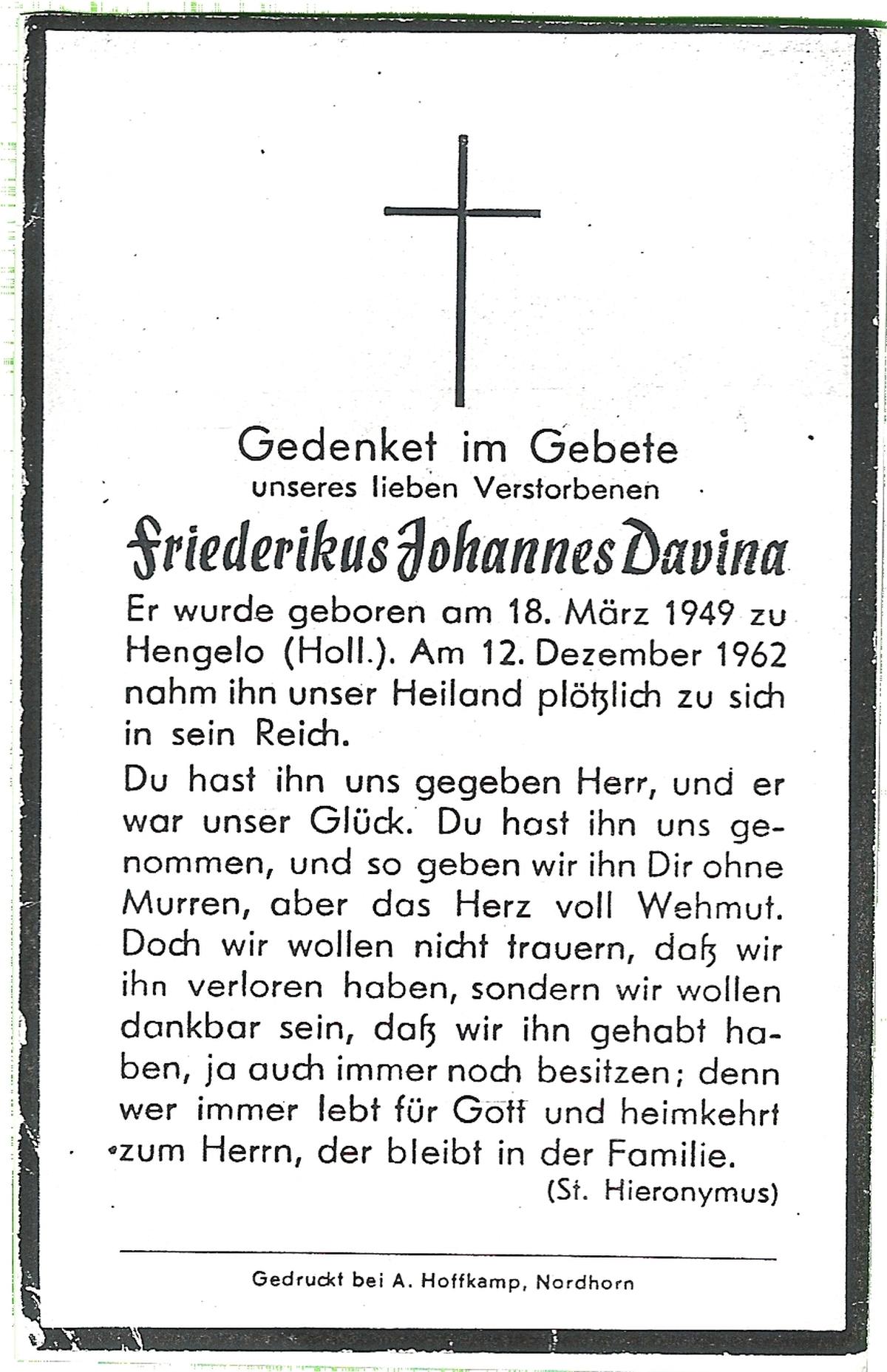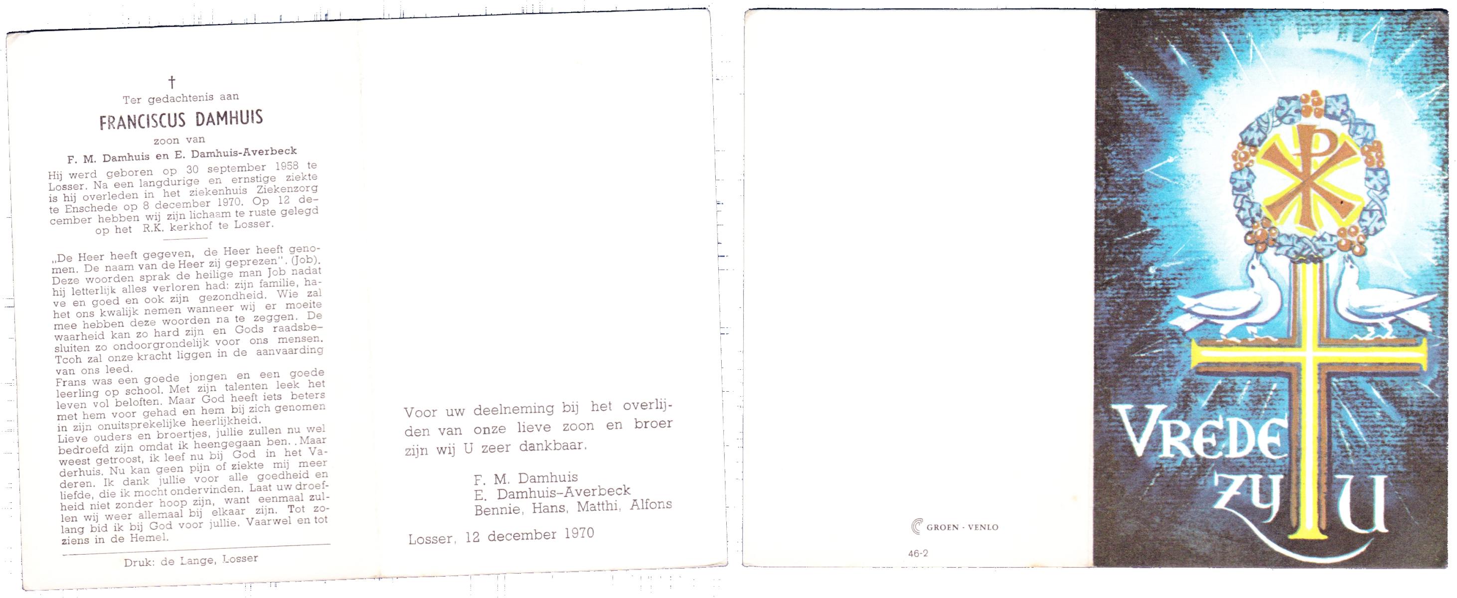 DAMHUIS, Franciscus, geboren op 30-9-1958 te Losser, overleden op 8-12-1970 te Enschede op 12-jarige leeftijd, begraven op 12-12-1970 te Losser.