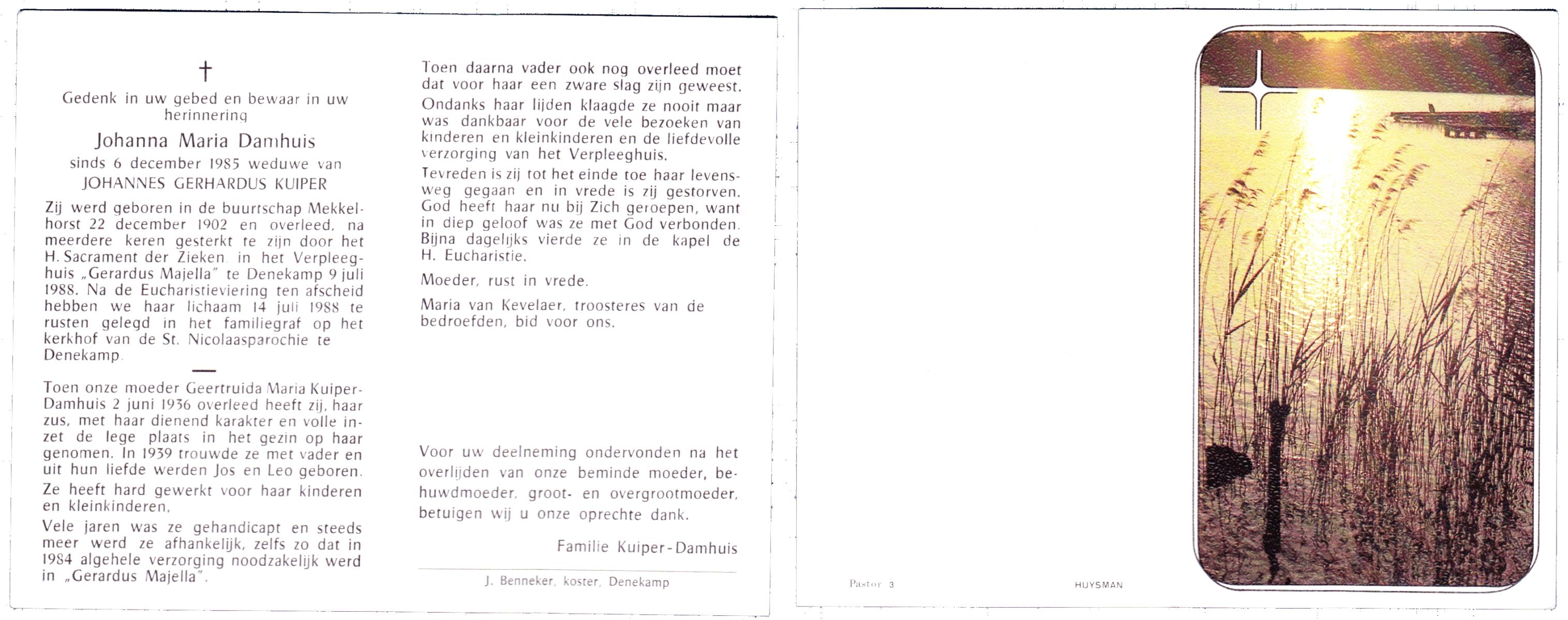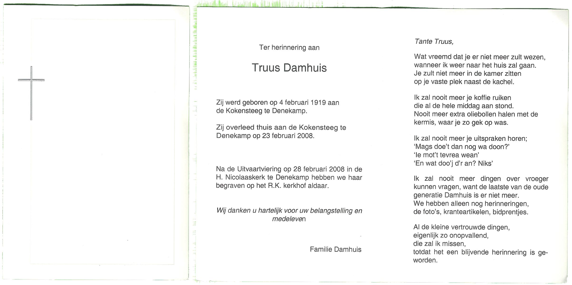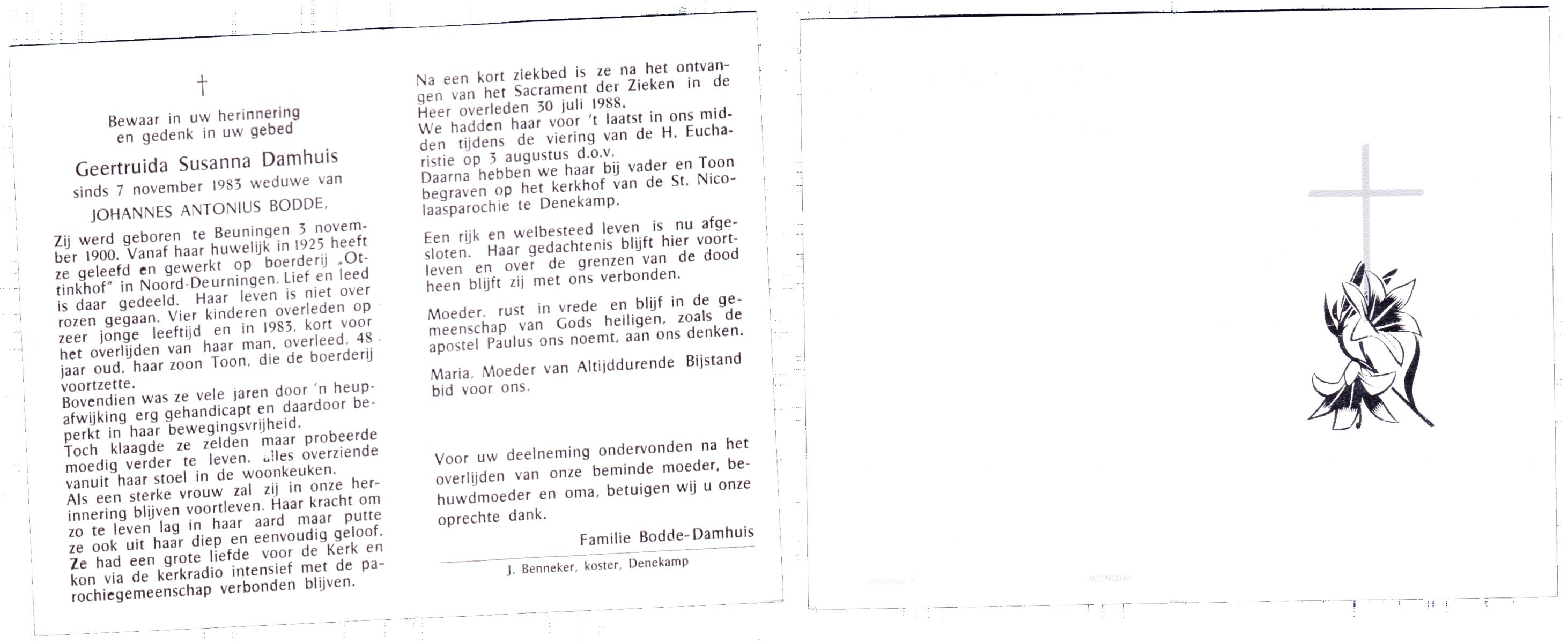 DAMHUIS, Geertruida Susanna, geboren op 3-11-1900 te Beuningen (Ov.), overleden op 30-7-1988 op 87-jarige leeftijd, begraven op 3-8-1988 te Denekamp.