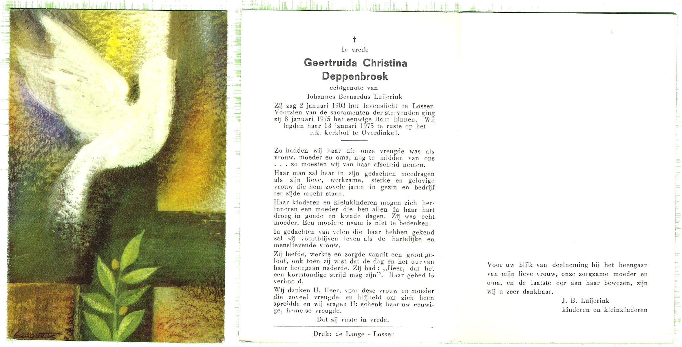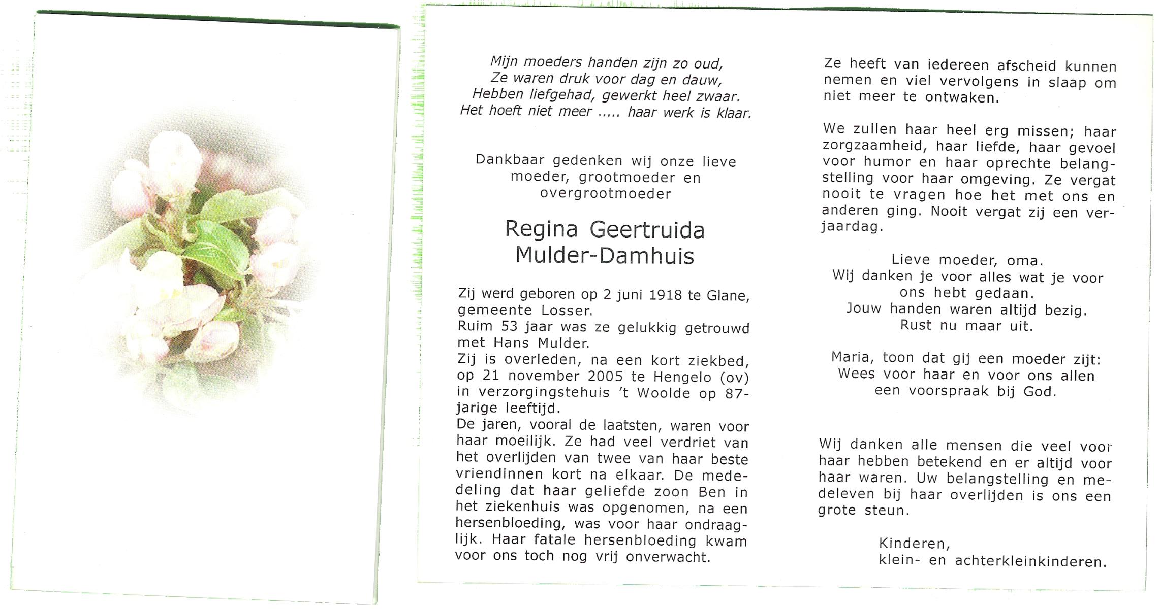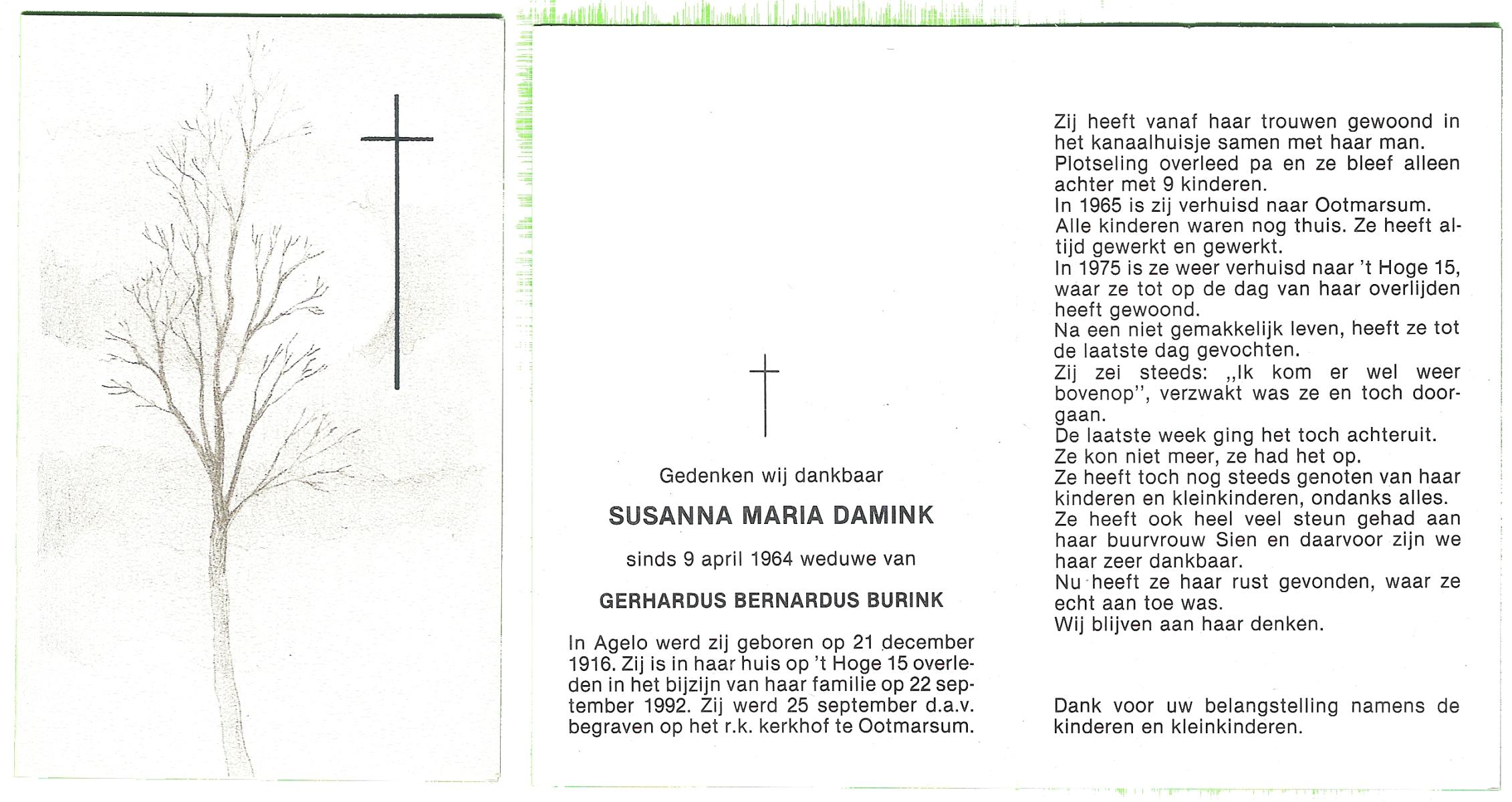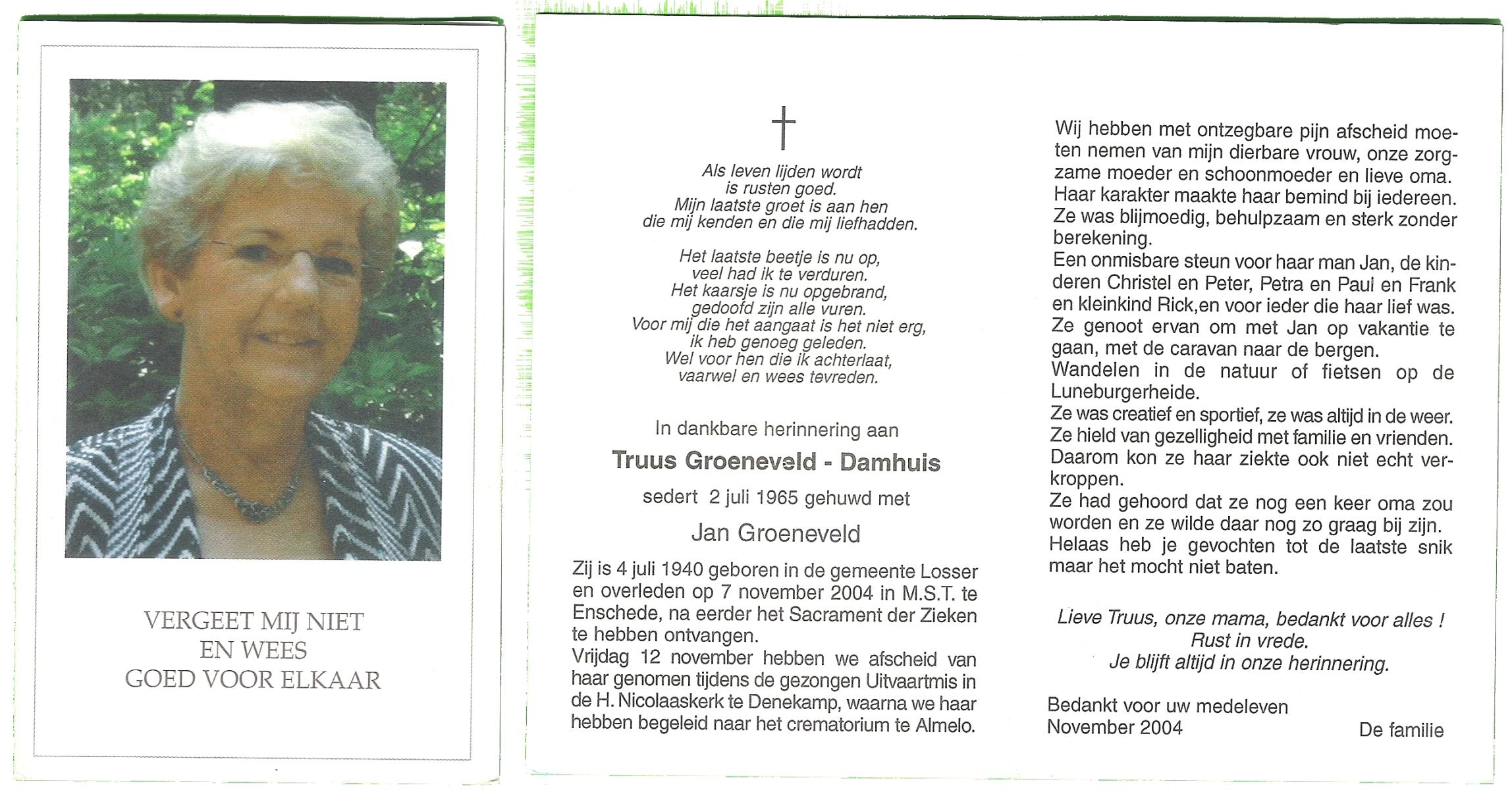 DAMHUIS, Geertruida Susanna, geboren op 3-11-1900 te Beuningen (Ov.), overleden op 30-7-1988 op 87-jarige leeftijd, begraven op 3-8-1988 te Denekamp.
