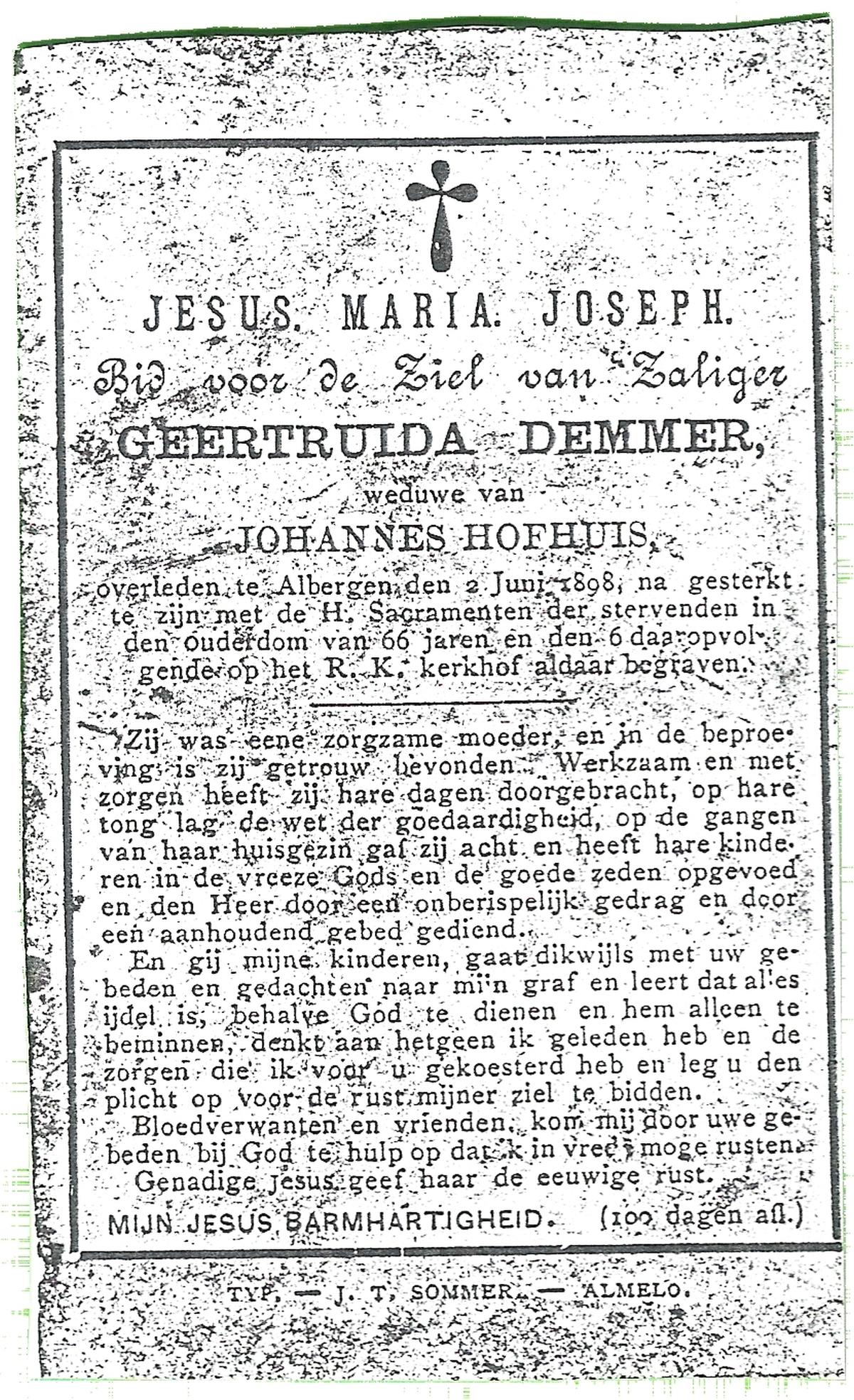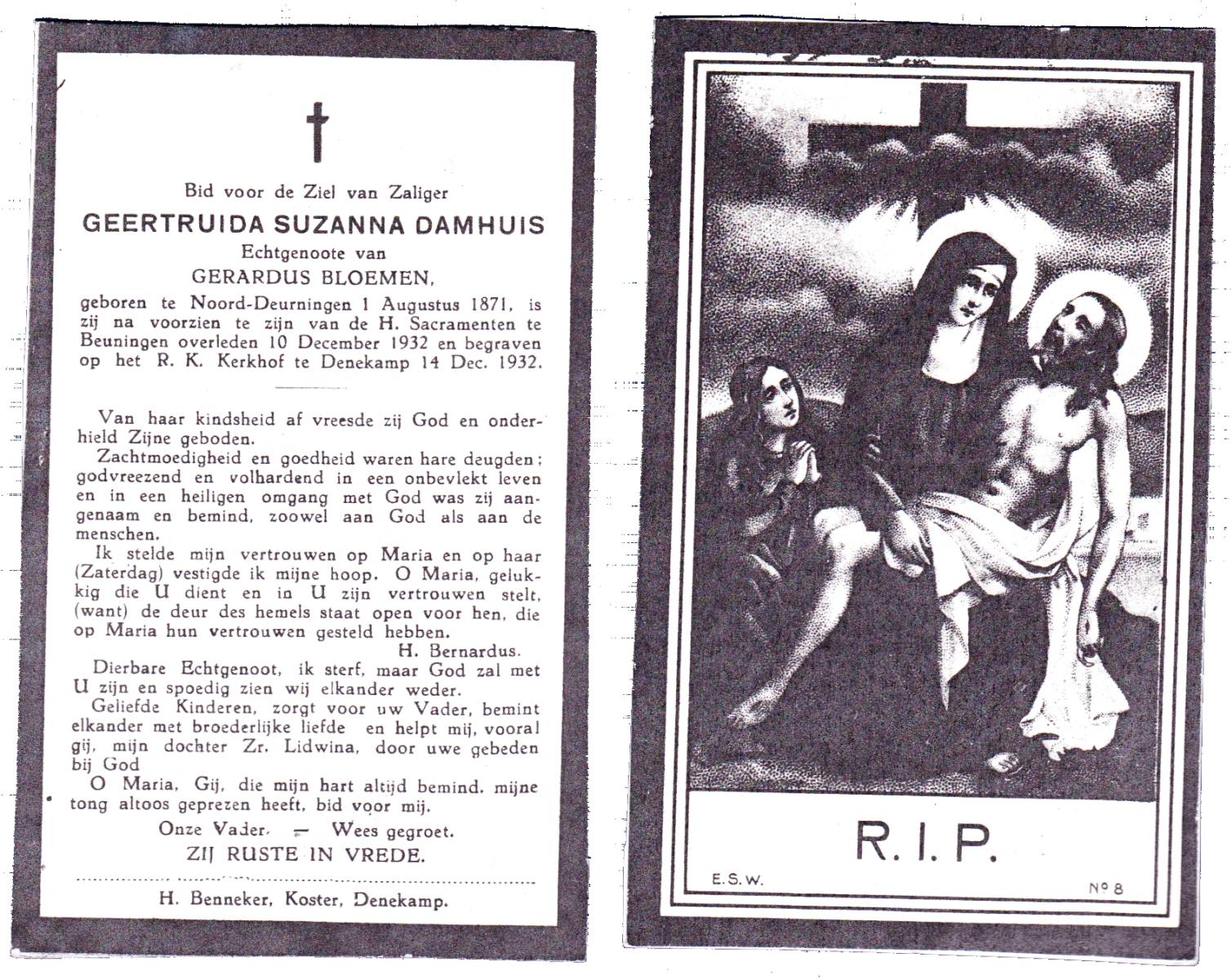DAMHUIS, Geertruida Suzanna, geboren op 01-08-1871 te Noord Deurningen, overleden op 10-12-1932 te Beuningen op 61-jarige leeftijd, begraven op 14-12-1932 te Denekamp.