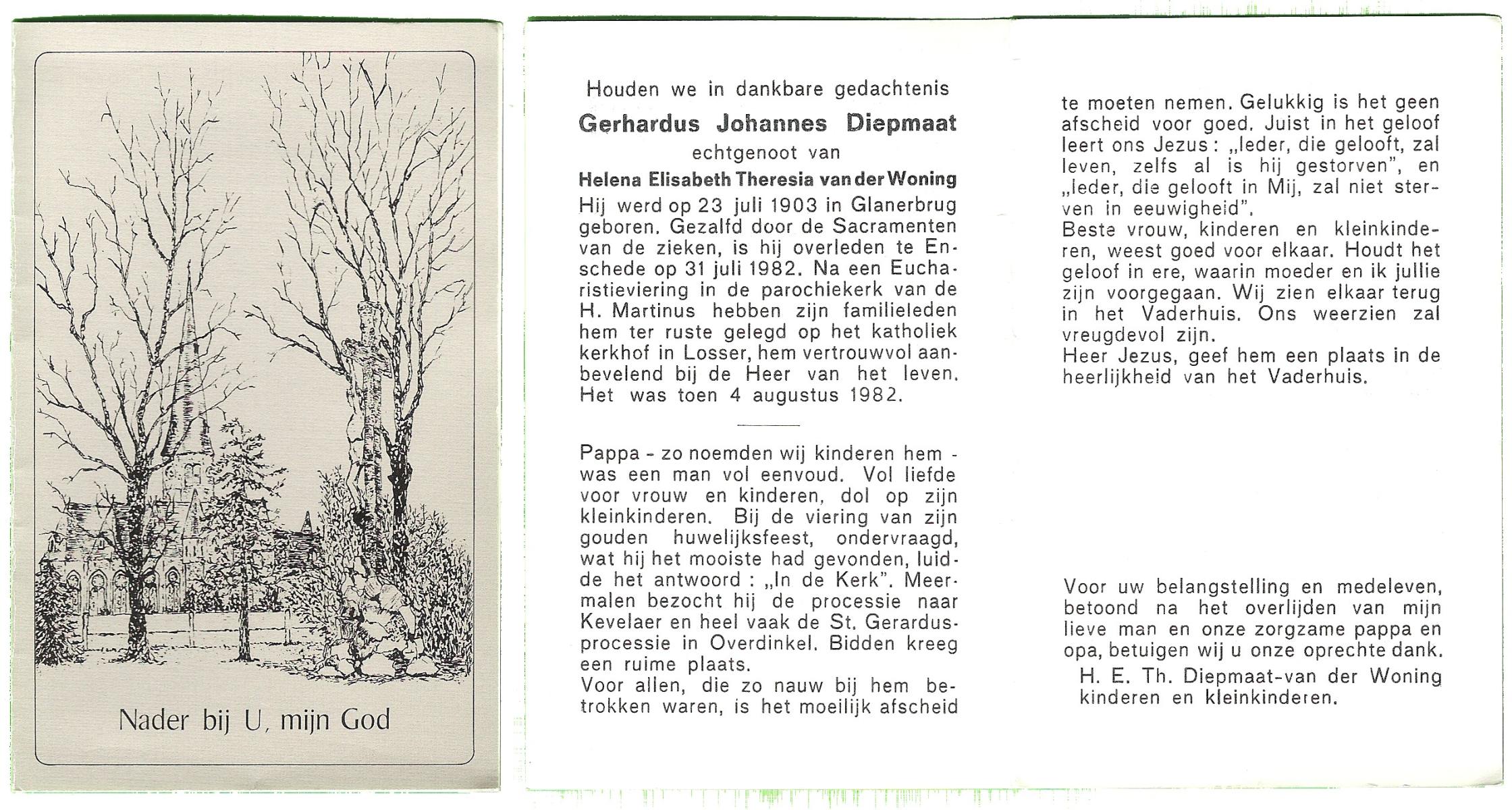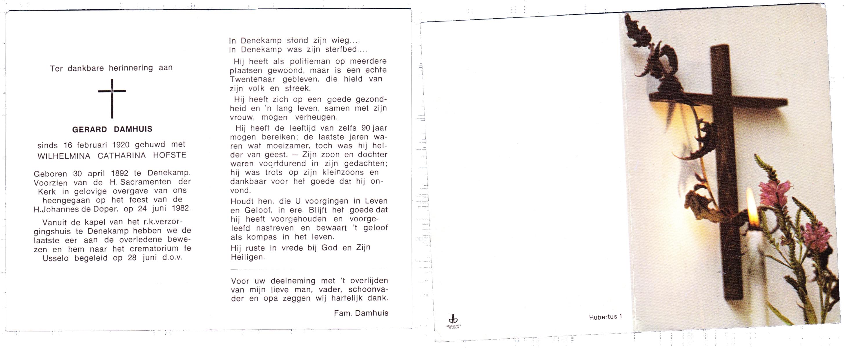 DAMHUIS, Gerard, geboren op 30-04-1892 te Denekamp, overleden op 24-6-1982 te Denekamp op 90-jarige leeftijd, gecremeerd op 28-6-1982 te Usselo.
