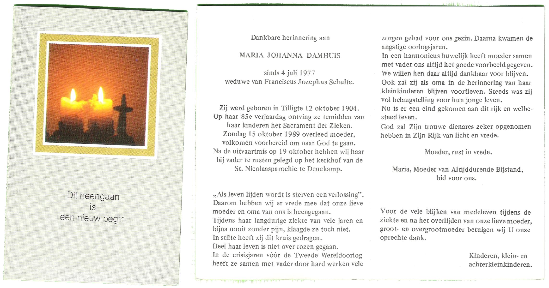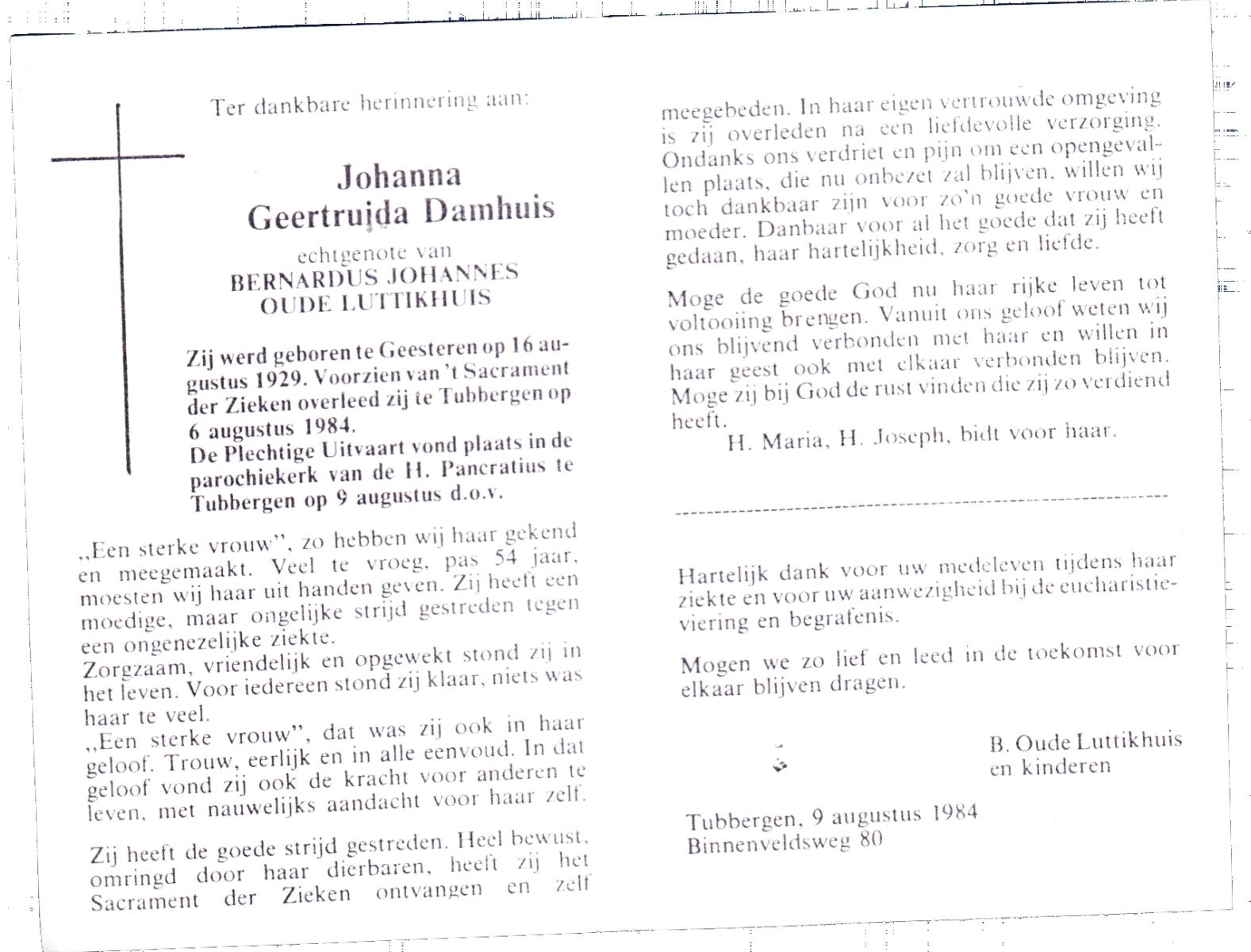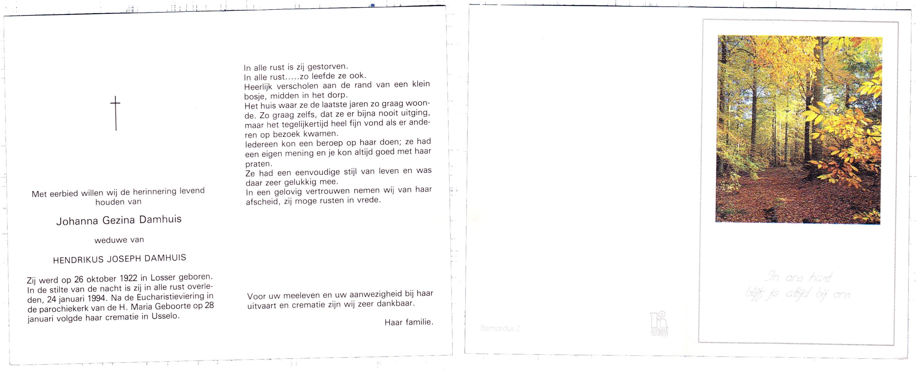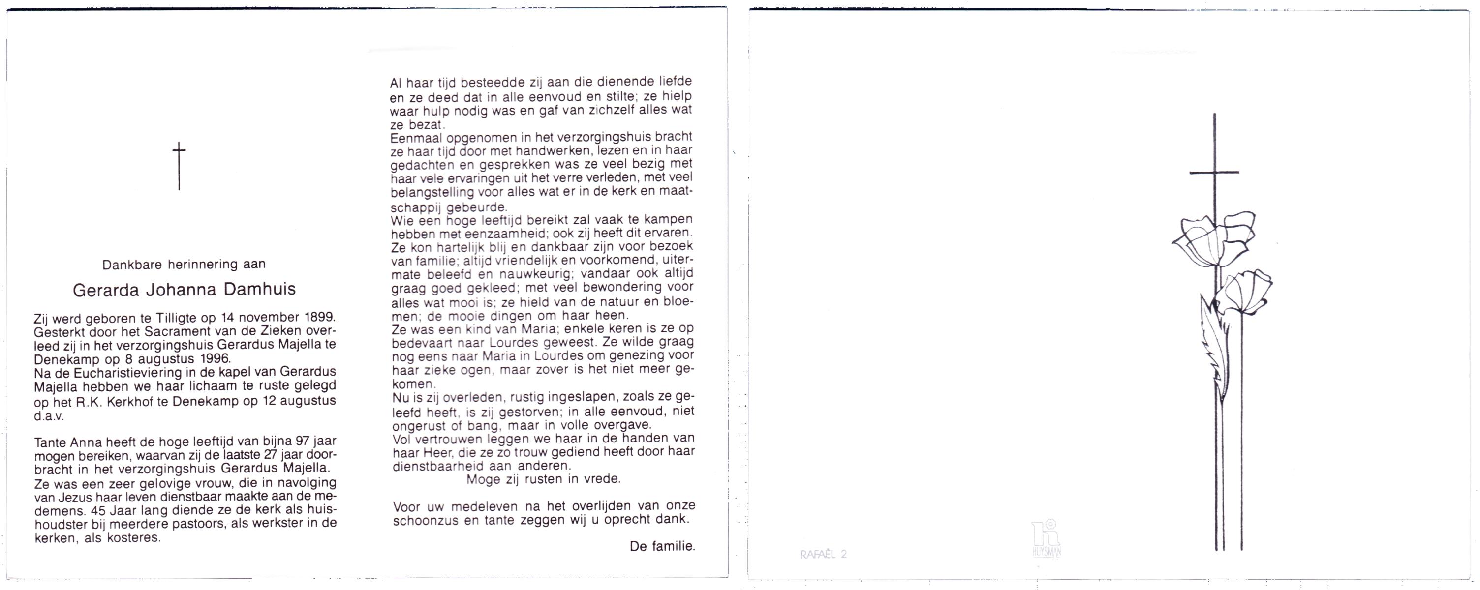DAMHUIS, Gerarda Johanna, geboren op 14-11-1899 te Tilligte, overleden op 8-8-1996 te Denekamp op 96-jarige leeftijd, begraven op 12-8-1996 te Denekamp.