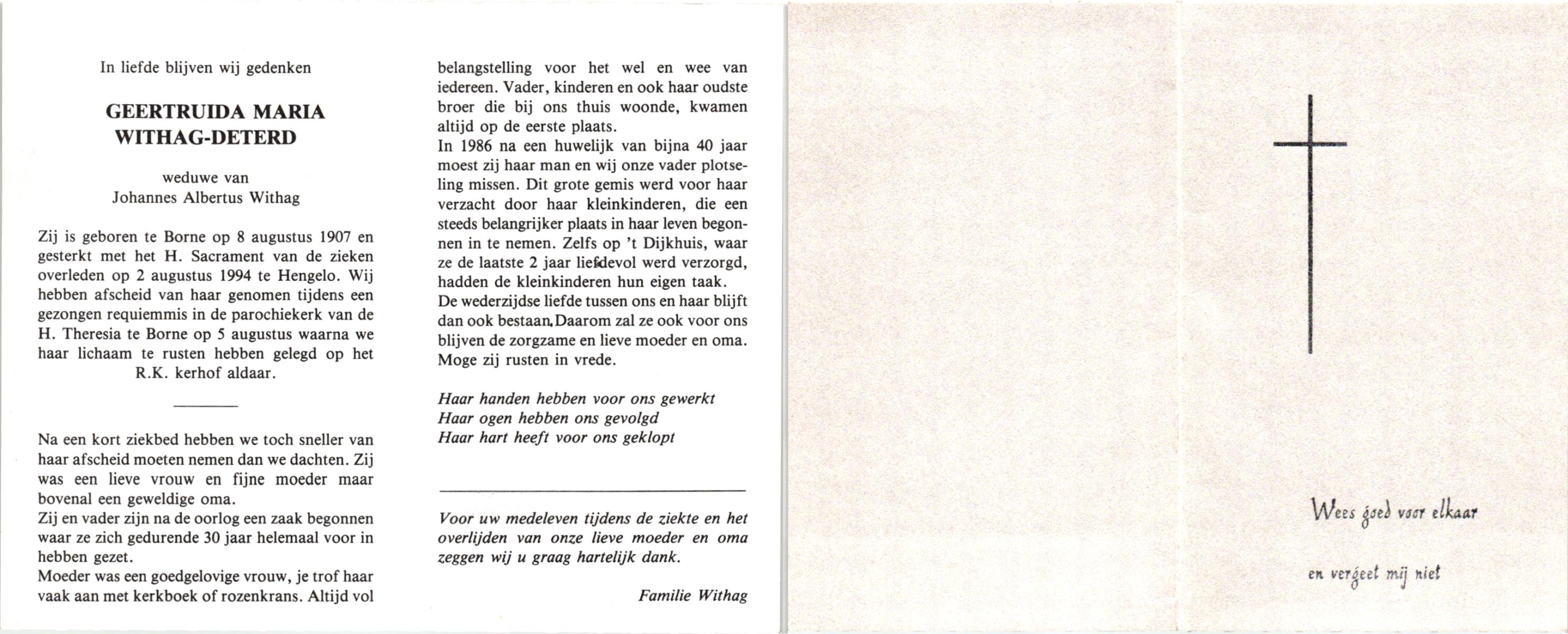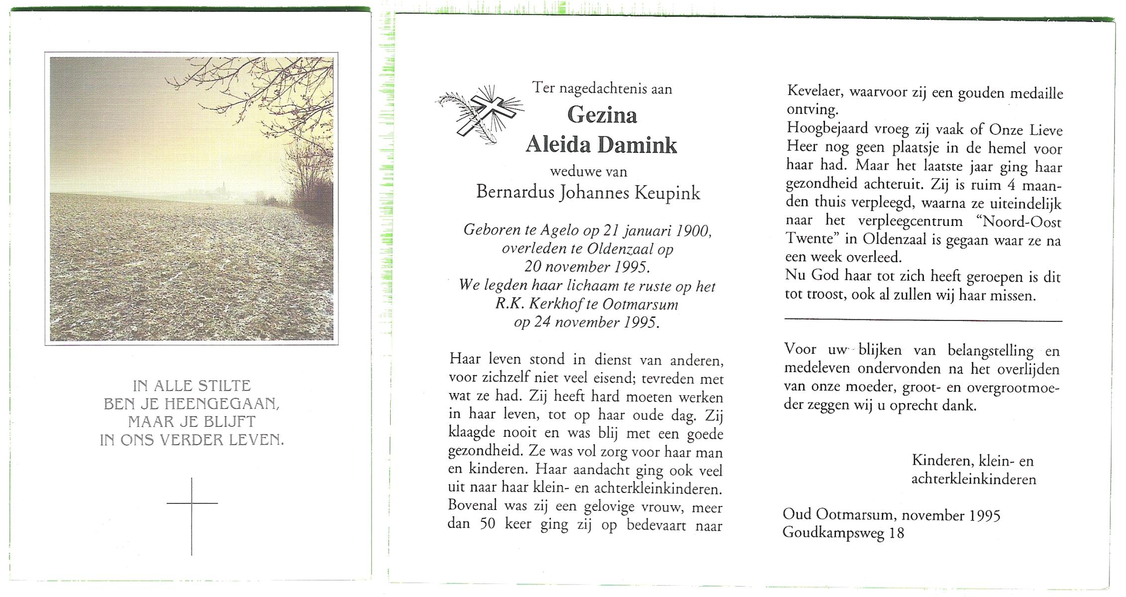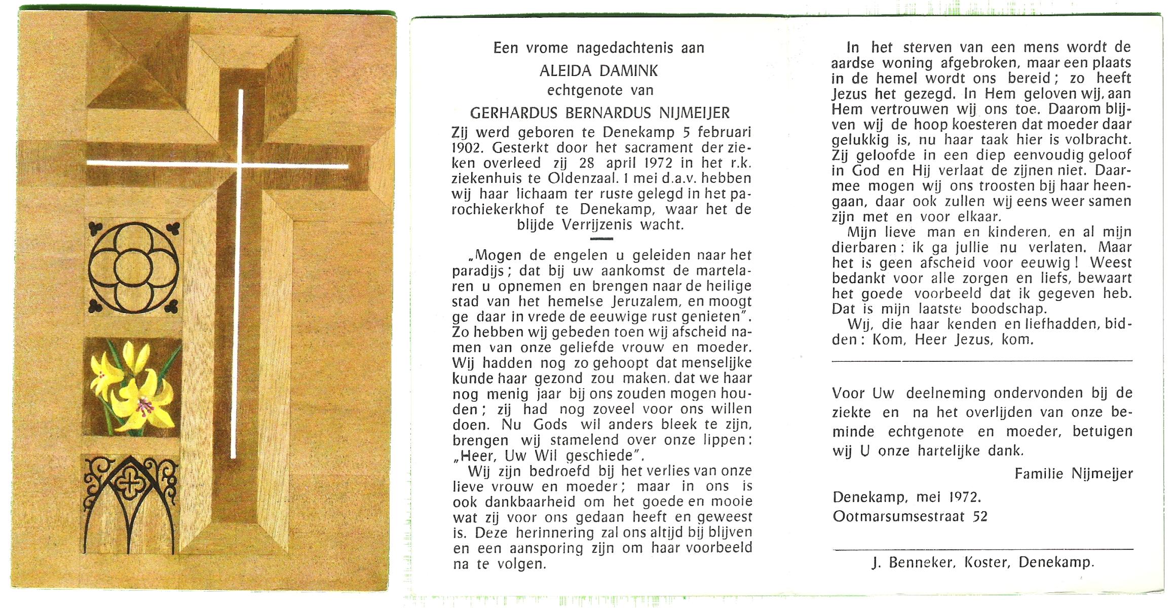 DAMHUIS, Gerarda Johanna, geboren op 14-11-1899 te Tilligte, overleden op 8-8-1996 te Denekamp op 96-jarige leeftijd, begraven op 12-8-1996 te Denekamp.