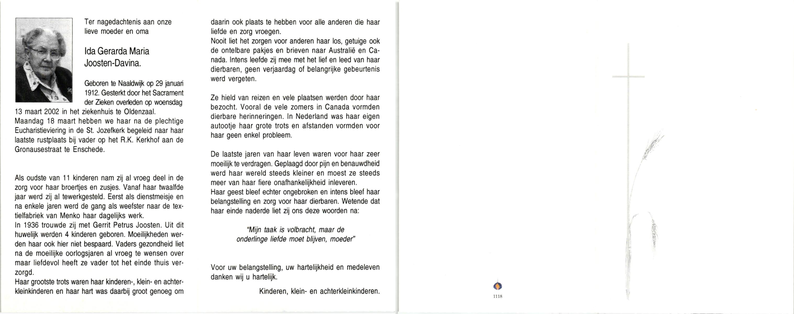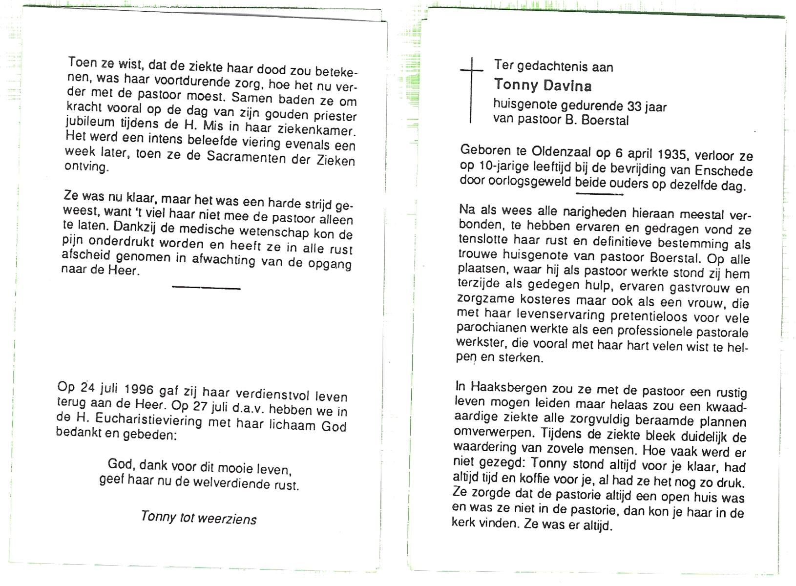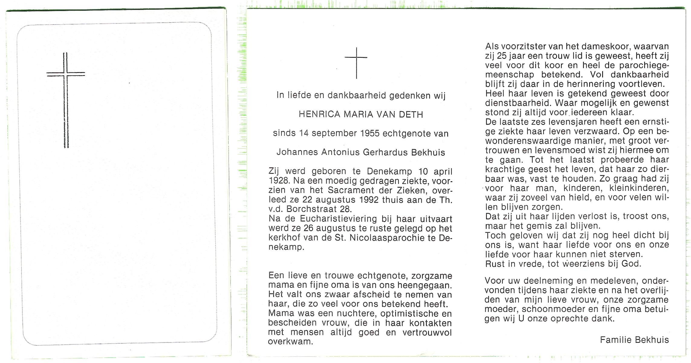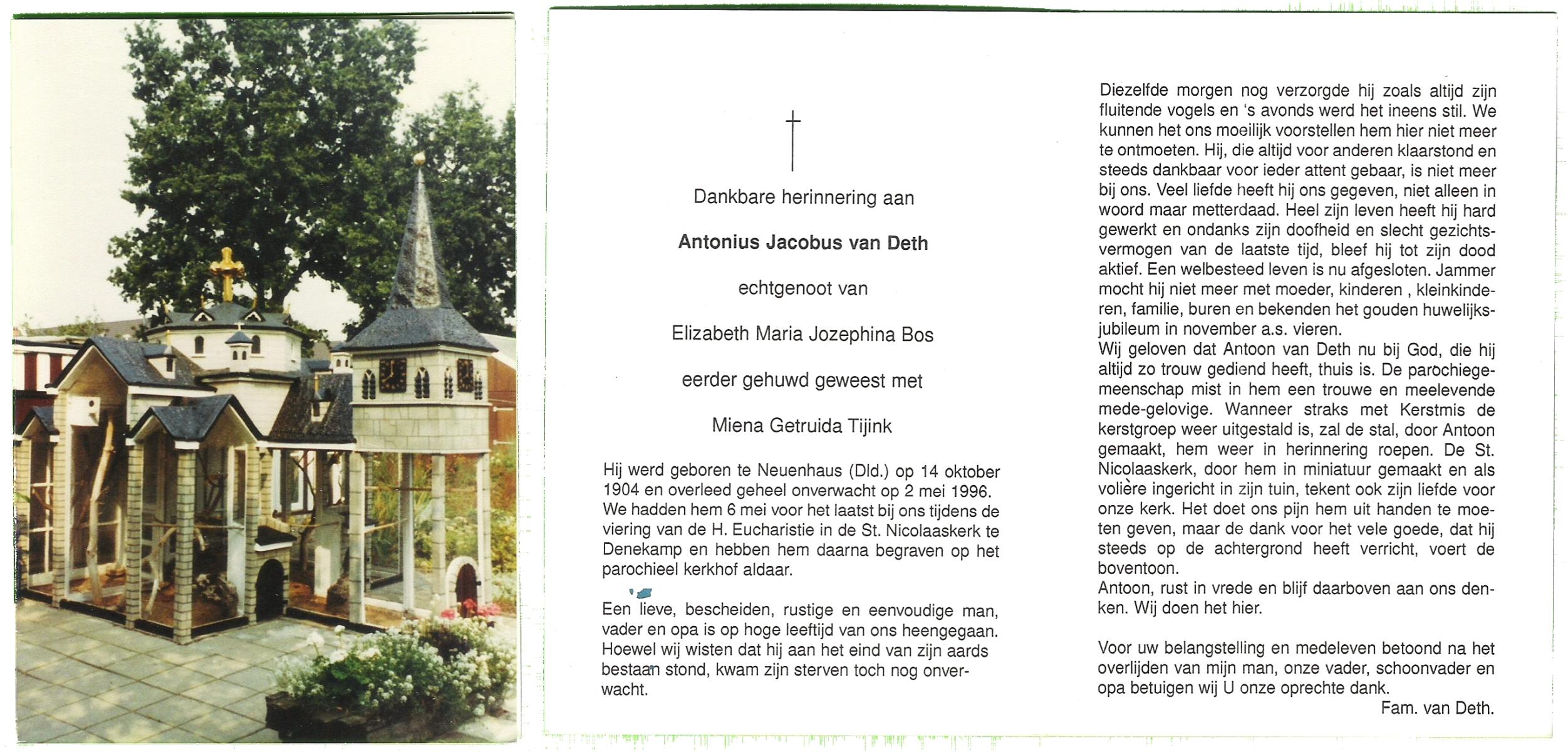 DAMHUIS, Gerarda Johanna, geboren op 14-11-1899 te Tilligte, overleden op 8-8-1996 te Denekamp op 96-jarige leeftijd, begraven op 12-8-1996 te Denekamp.