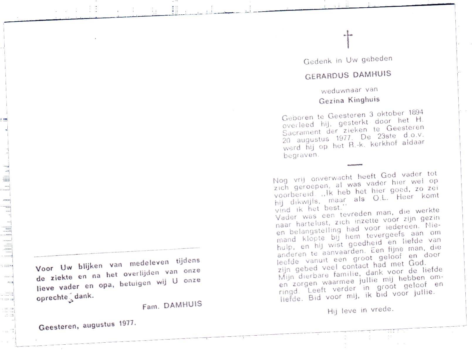 DAMHUIS, Gerardus, geboren op 03-10-1894 te Geesteren (Ov.), overleden op 20-8-1977 te Geesteren op 82-jarige leeftijd, begraven op 23-8-1977 te Geesteren.
