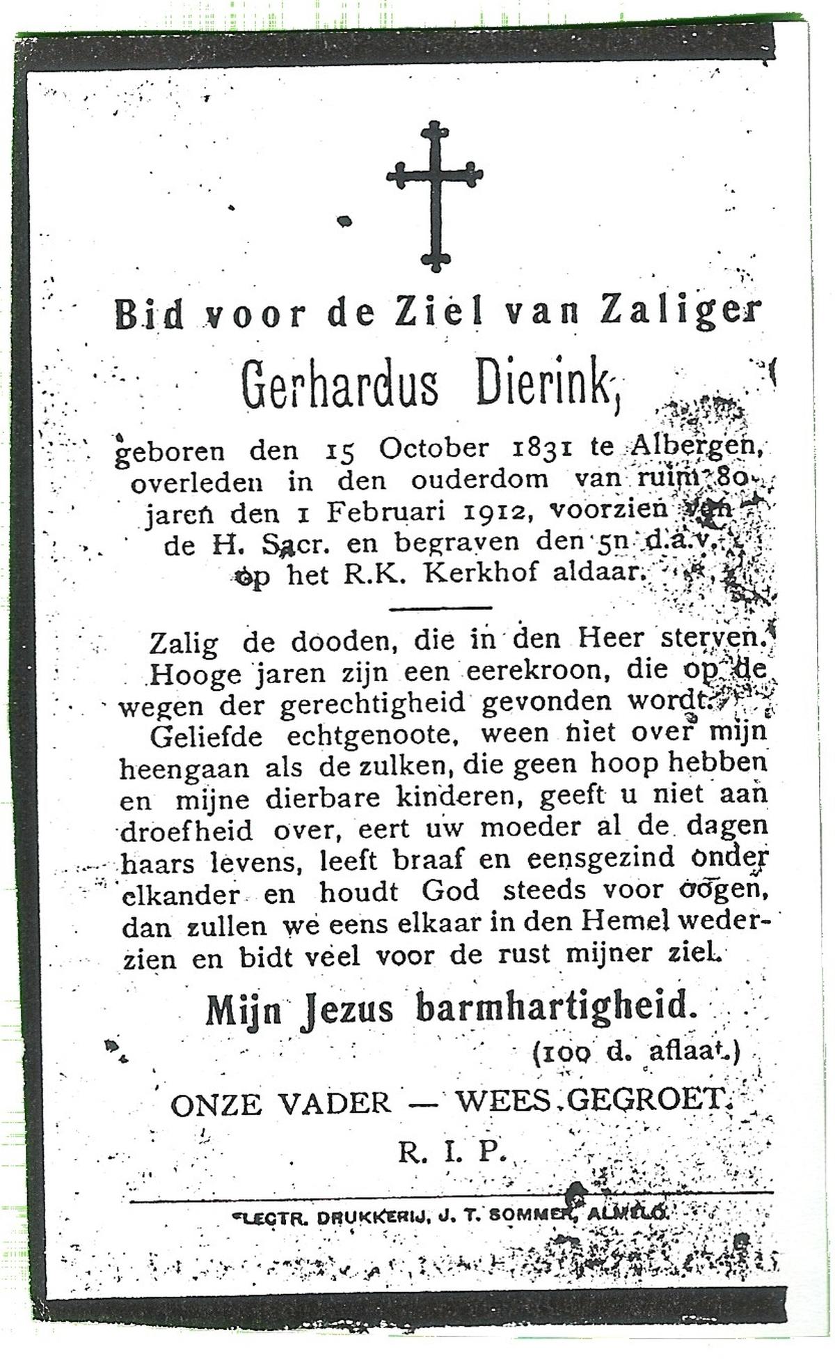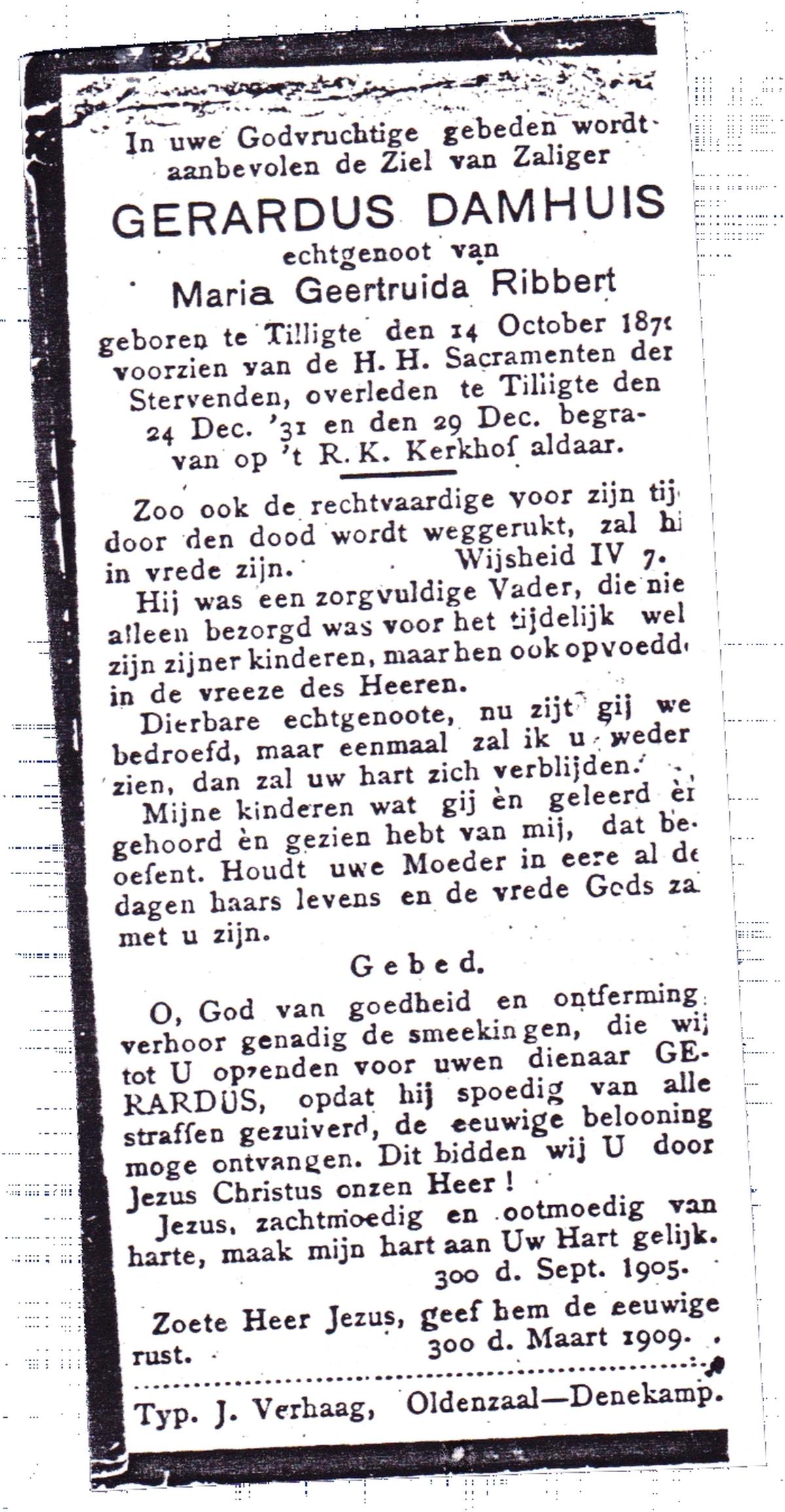 DAMHUIS, Gerardus, geboren op 14-10-187? te Tilligte, overleden op 24-12-1931 te Tilligte, begraven op 29-12-1931 te Tilligte.