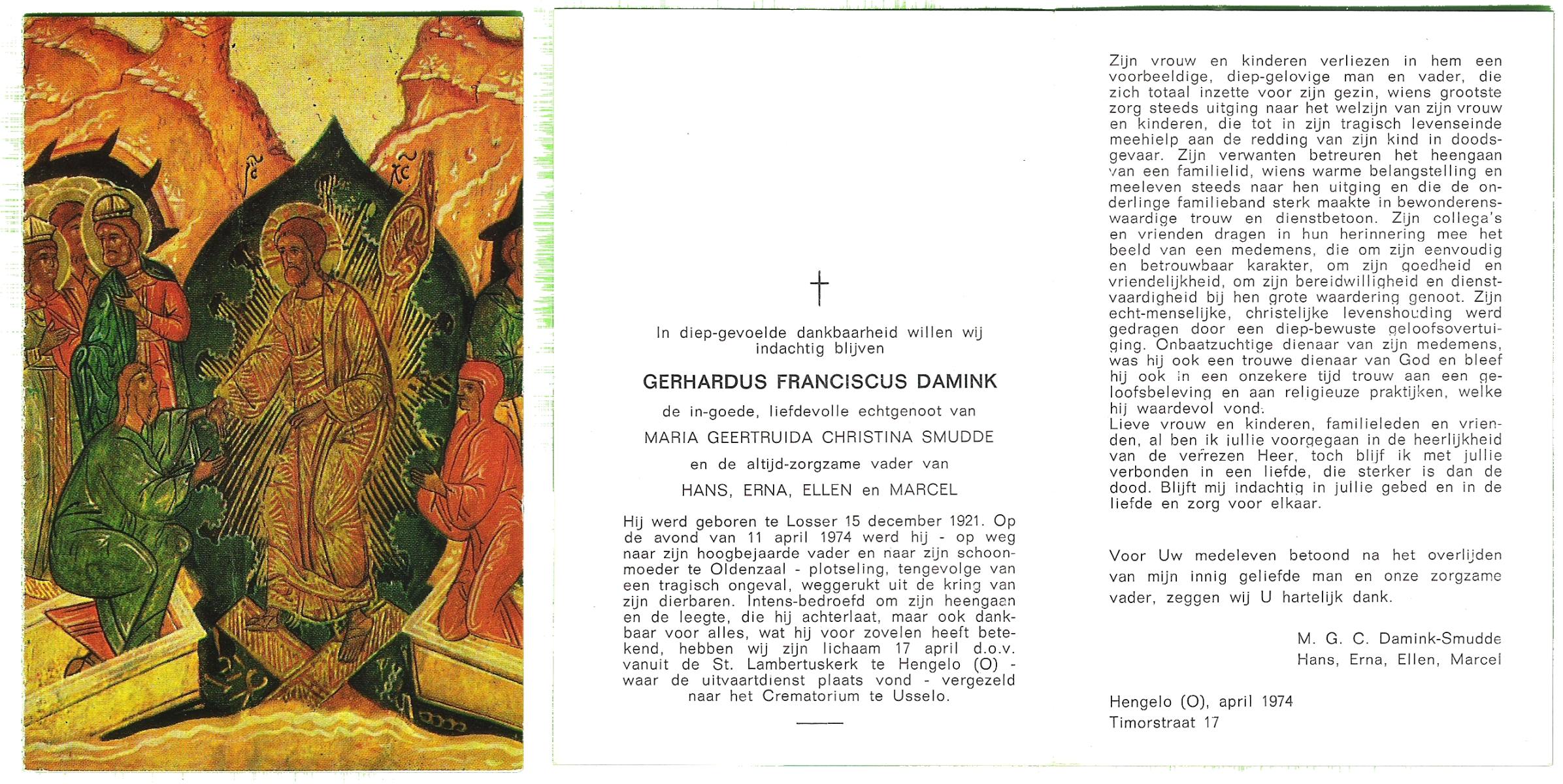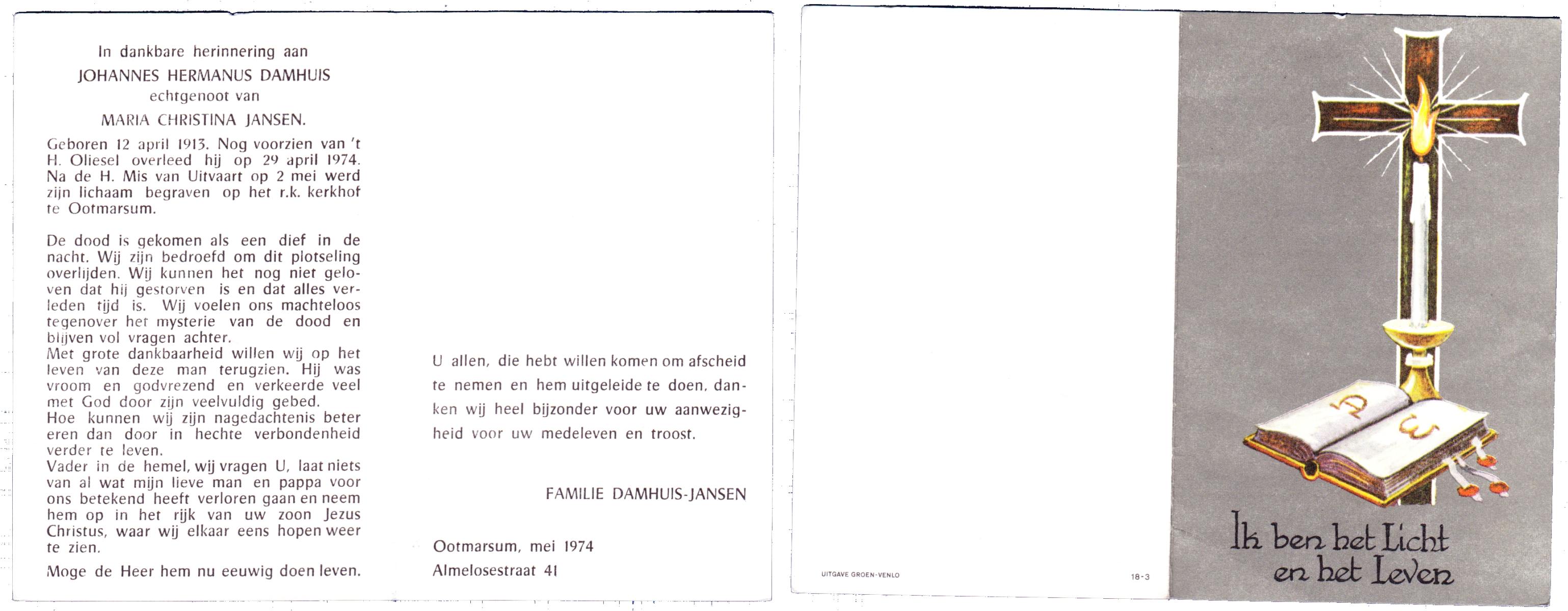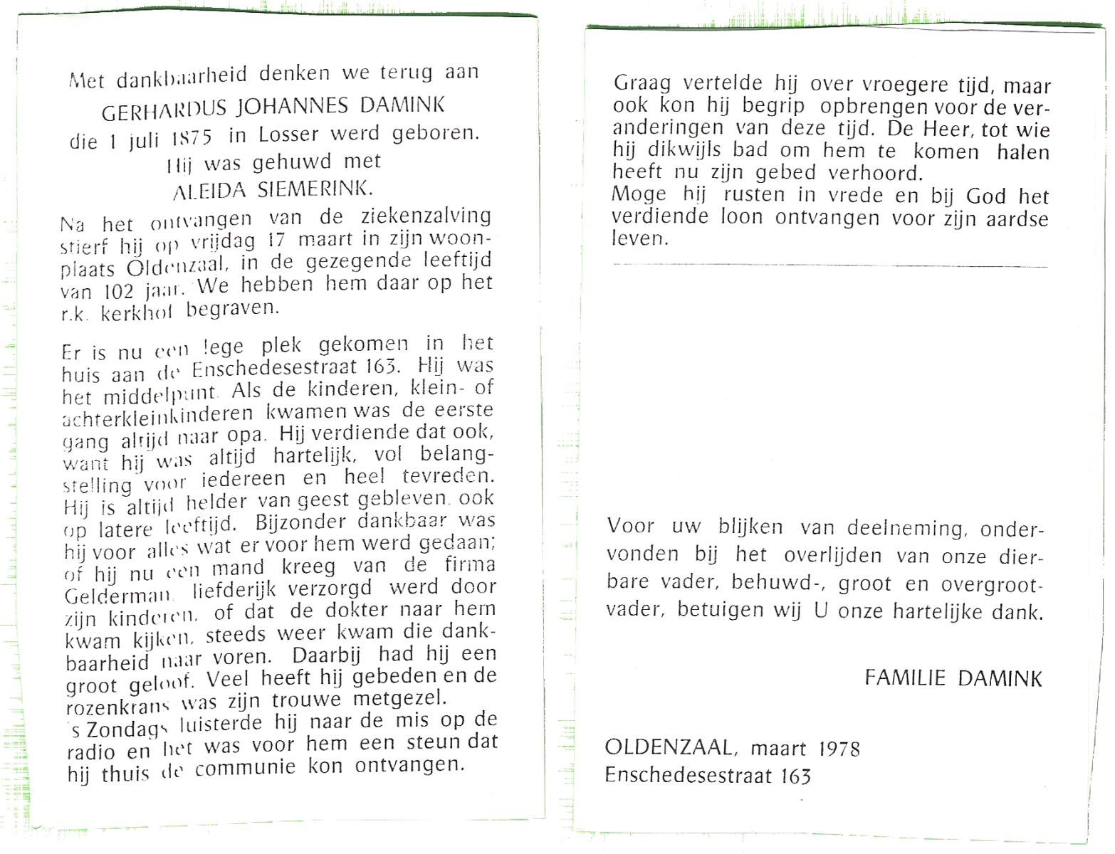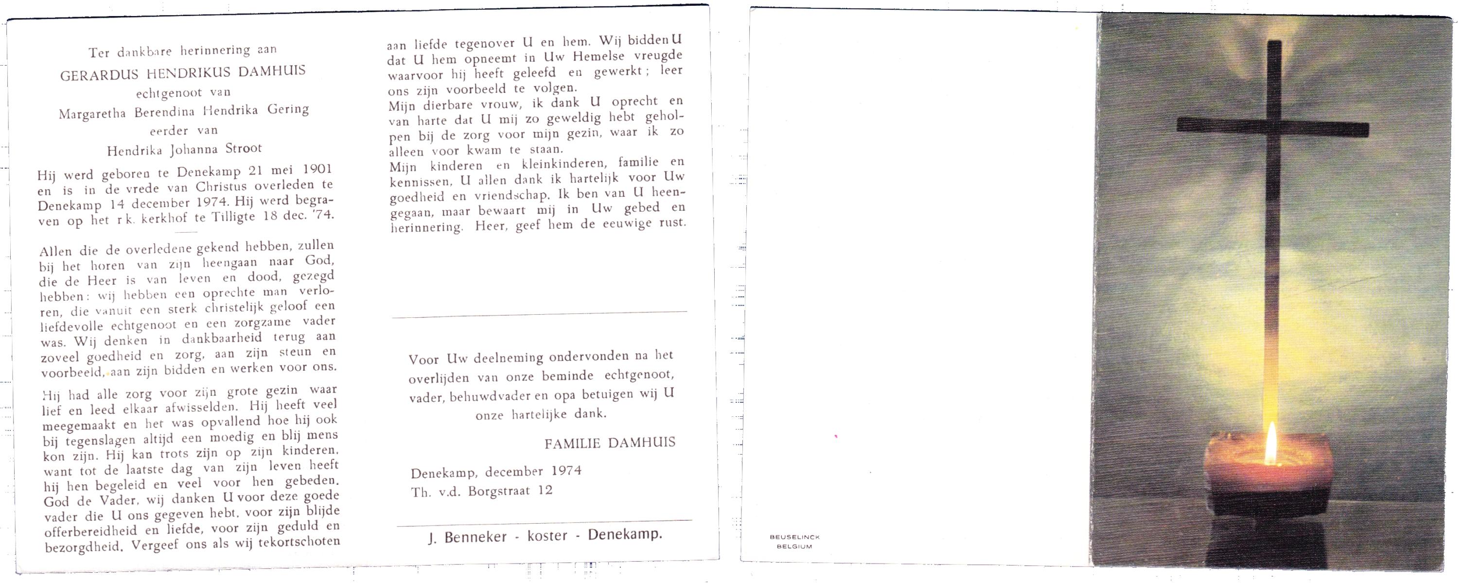 DAMHUIS, Gerardus Hendrikus, geboren op 21-5-1901 te Denekamp, overleden op 14-12-1974 te Denekamp op 73-jarige leeftijd, begraven op 18-12-1974 te Tilligte.