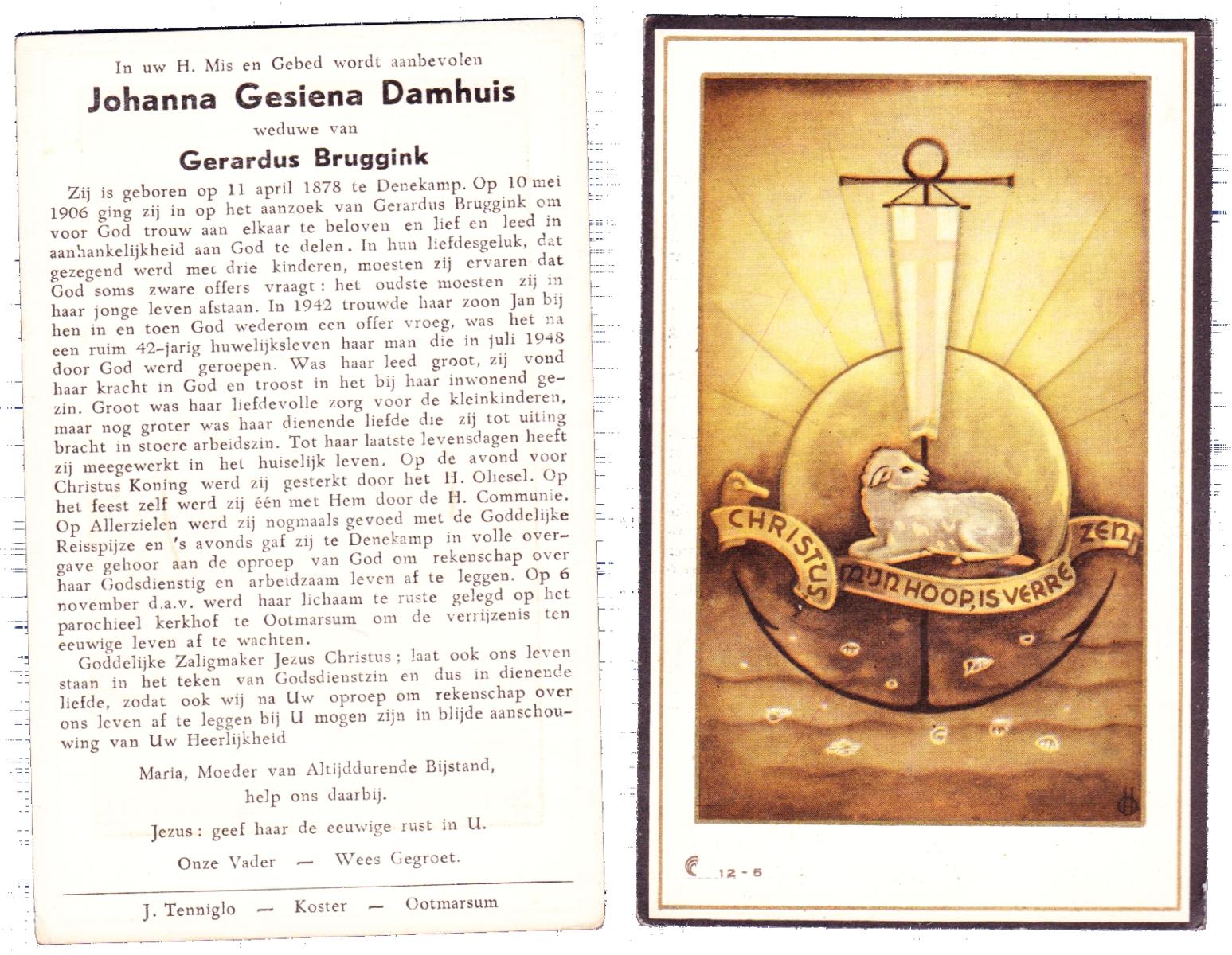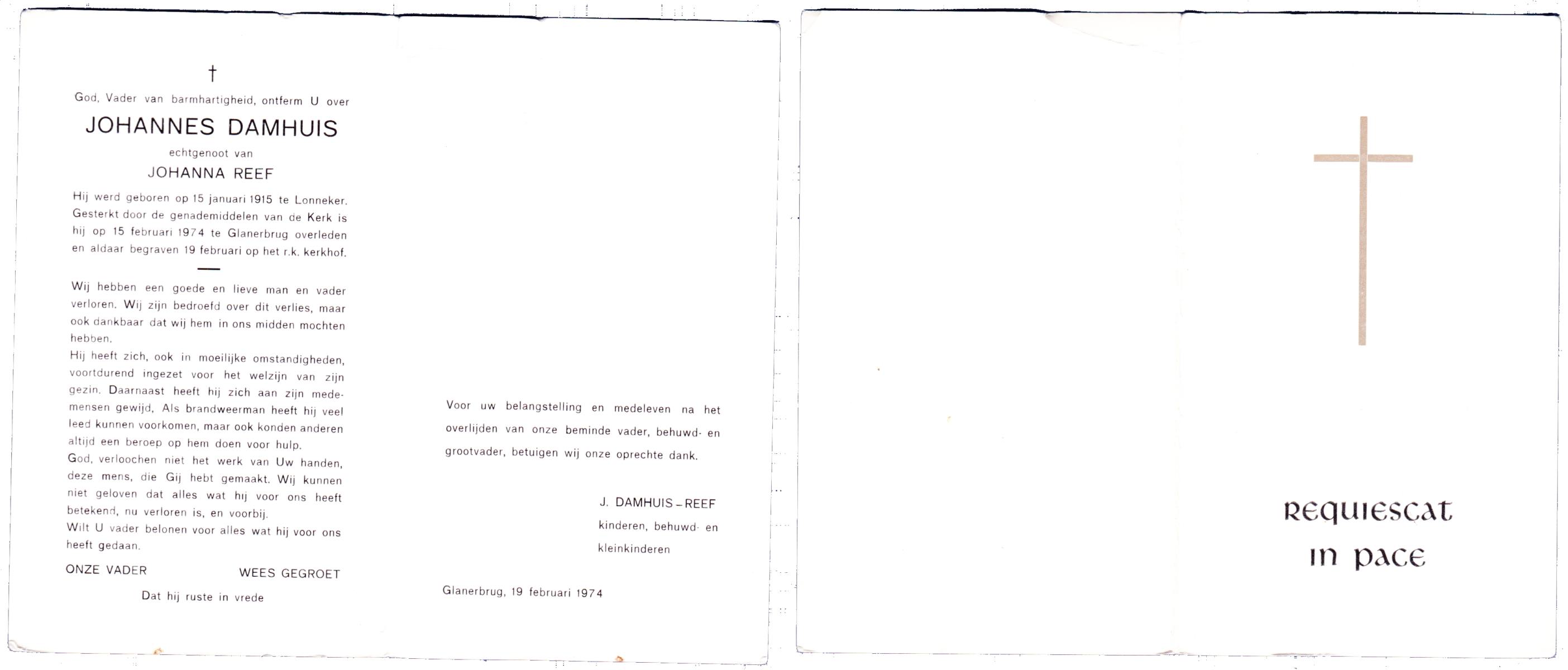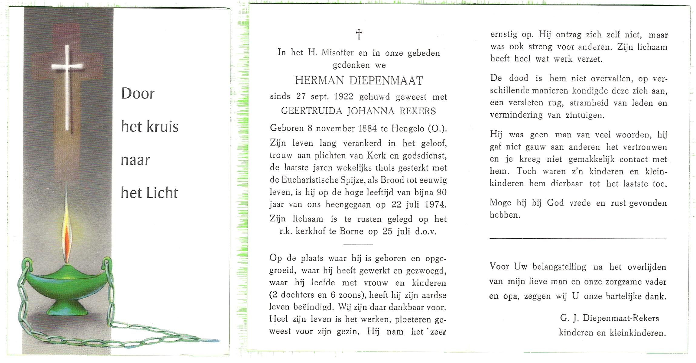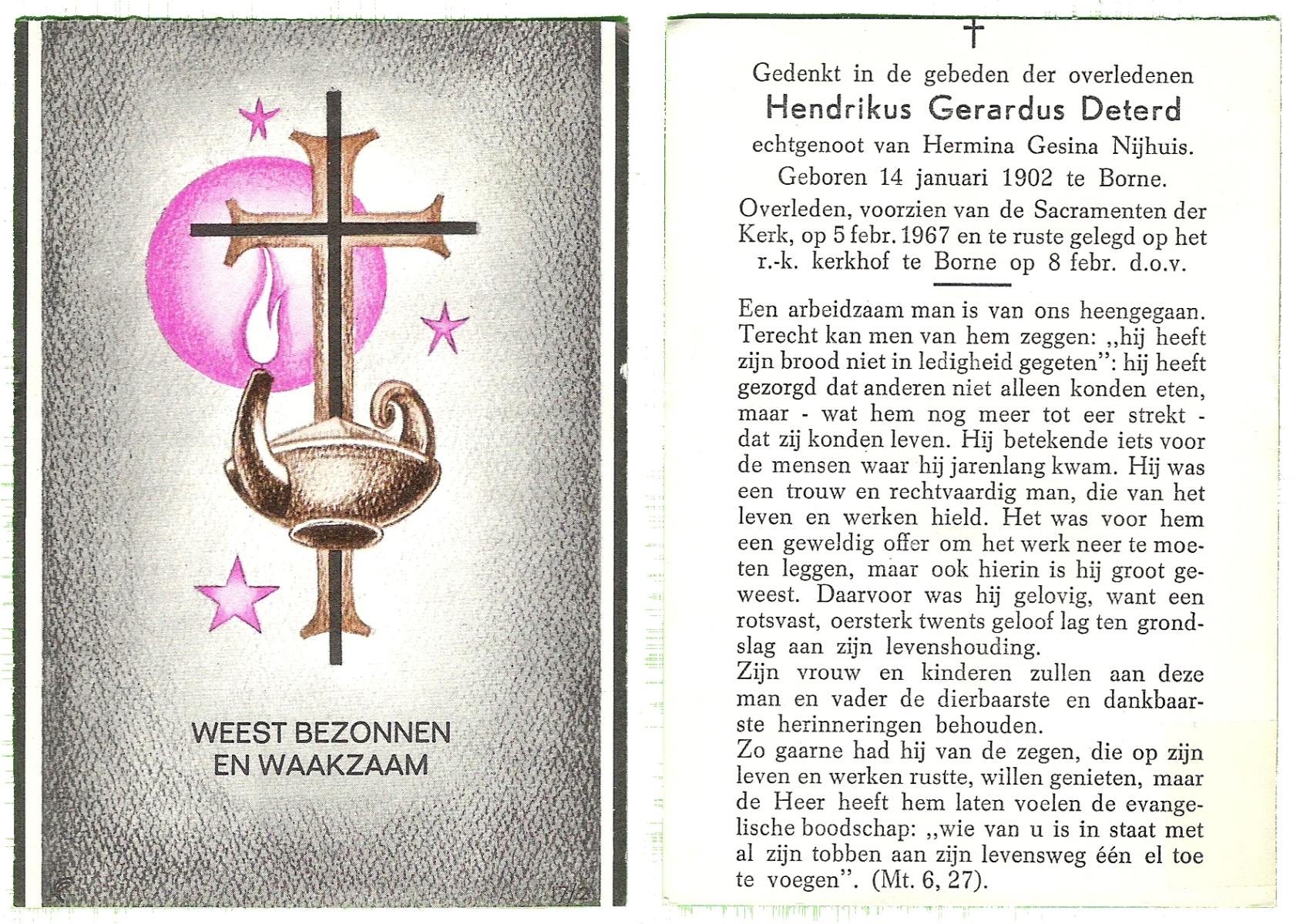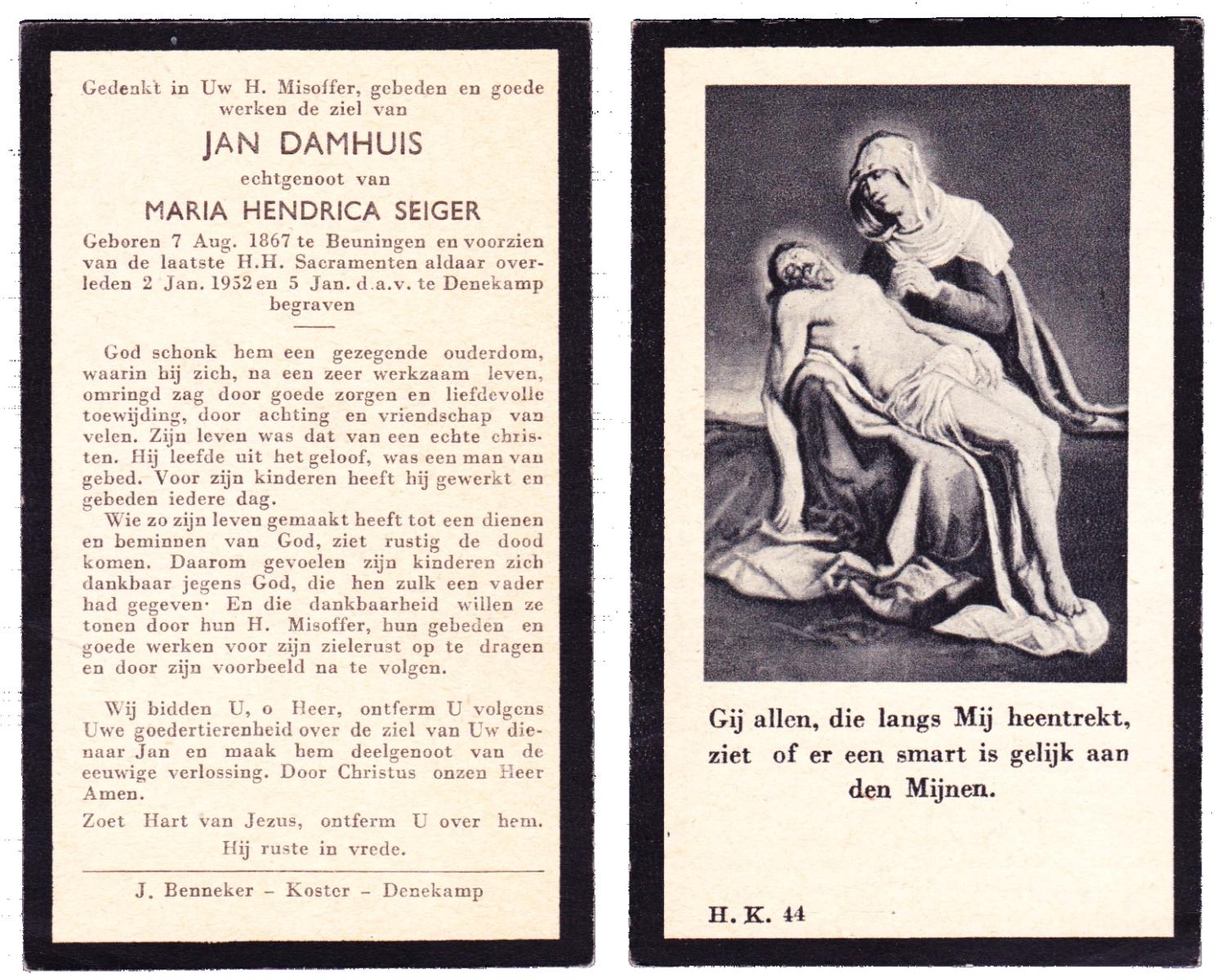 DAMHUIS, Gerardus Hendrikus, geboren op 21-5-1901 te Denekamp, overleden op 14-12-1974 te Denekamp op 73-jarige leeftijd, begraven op 18-12-1974 te Tilligte.