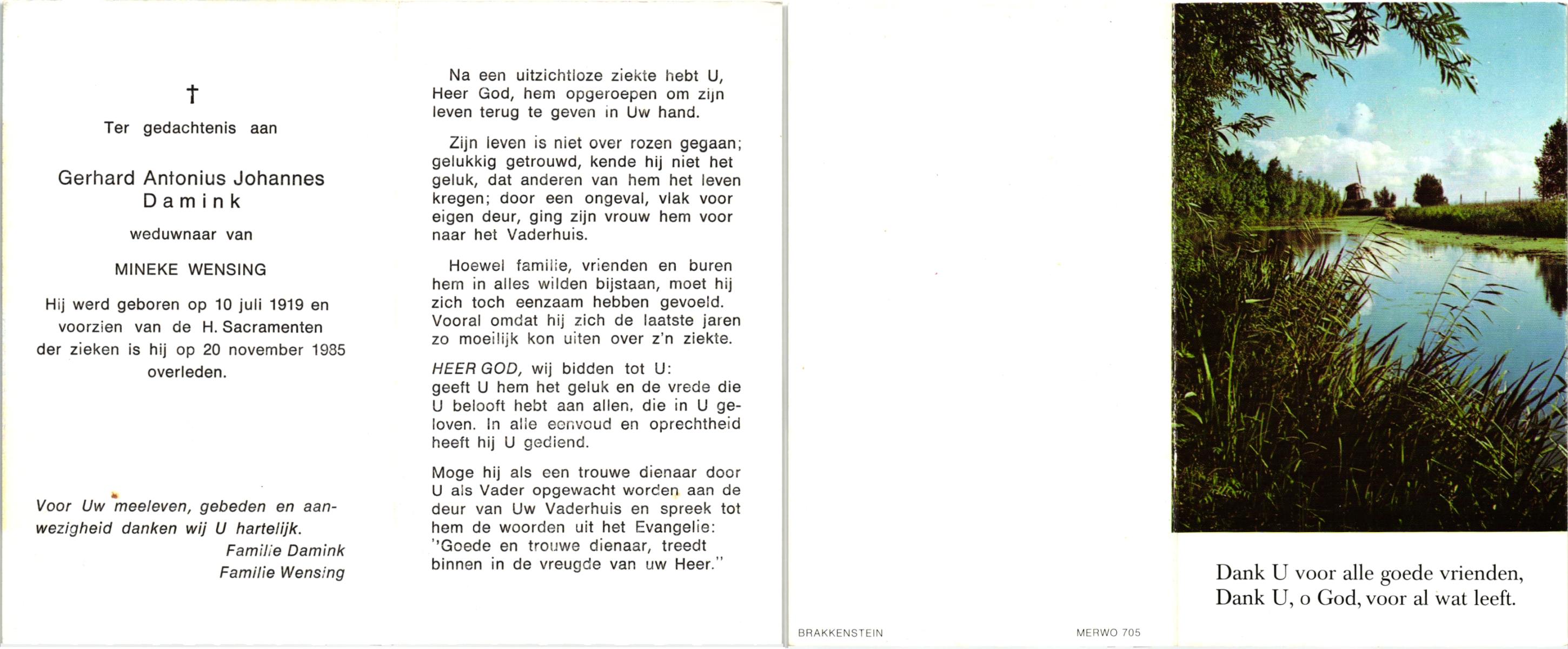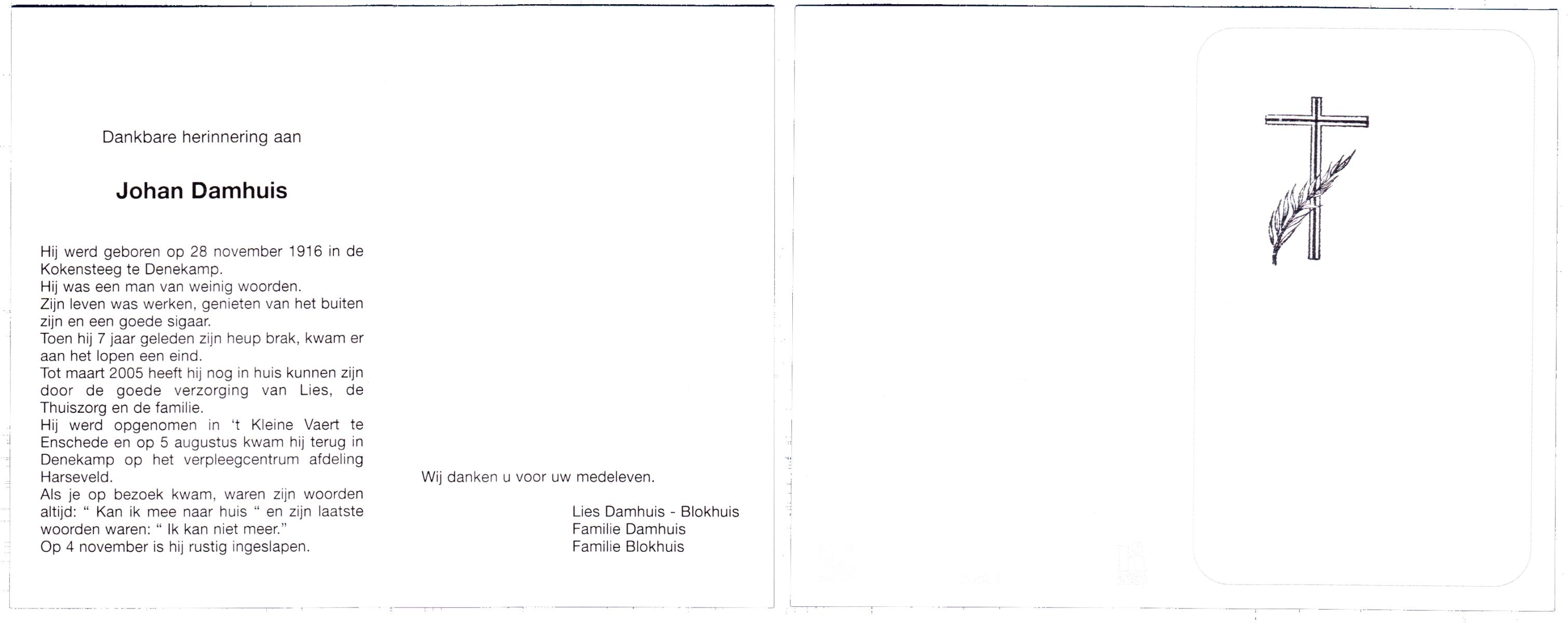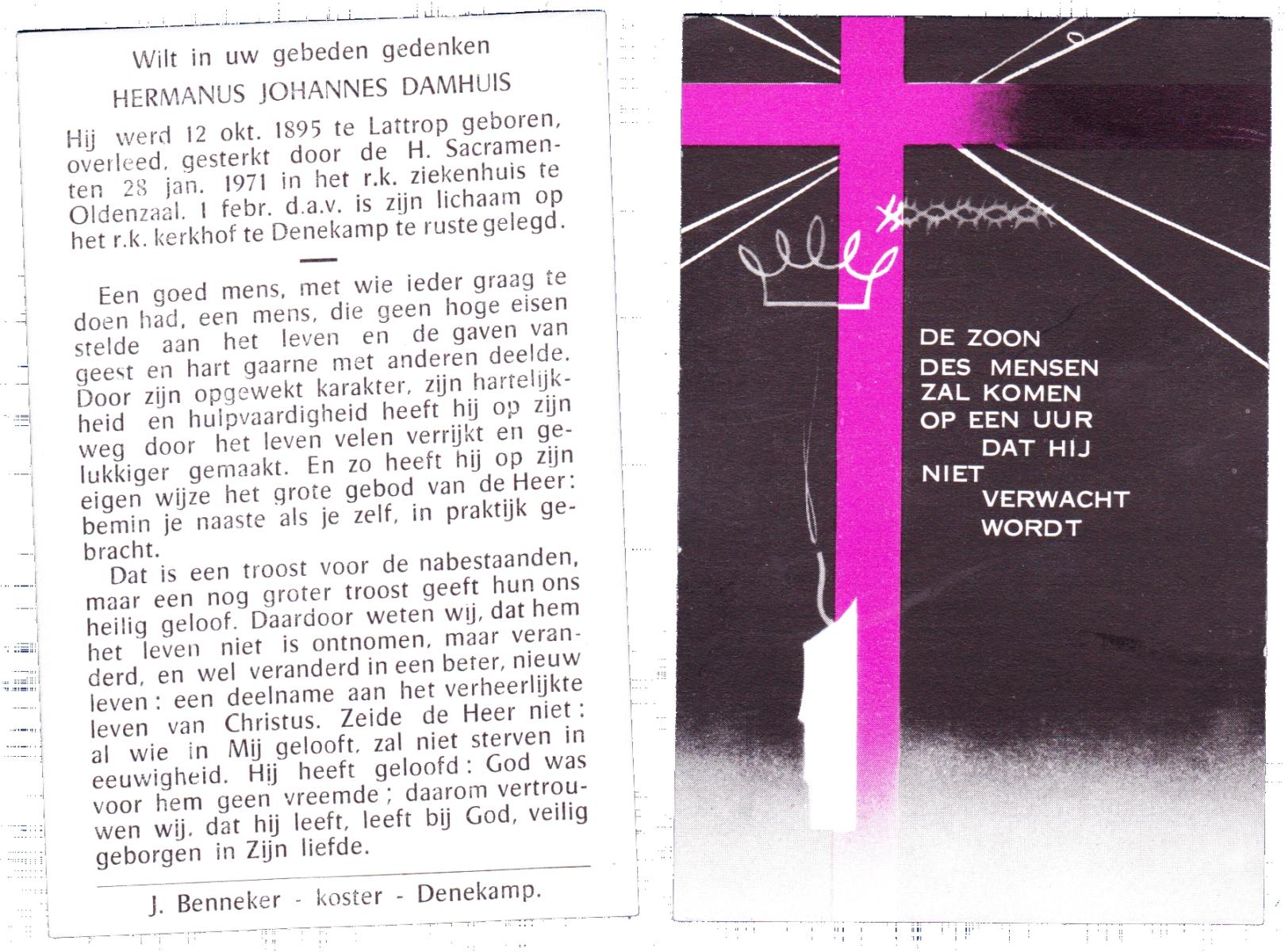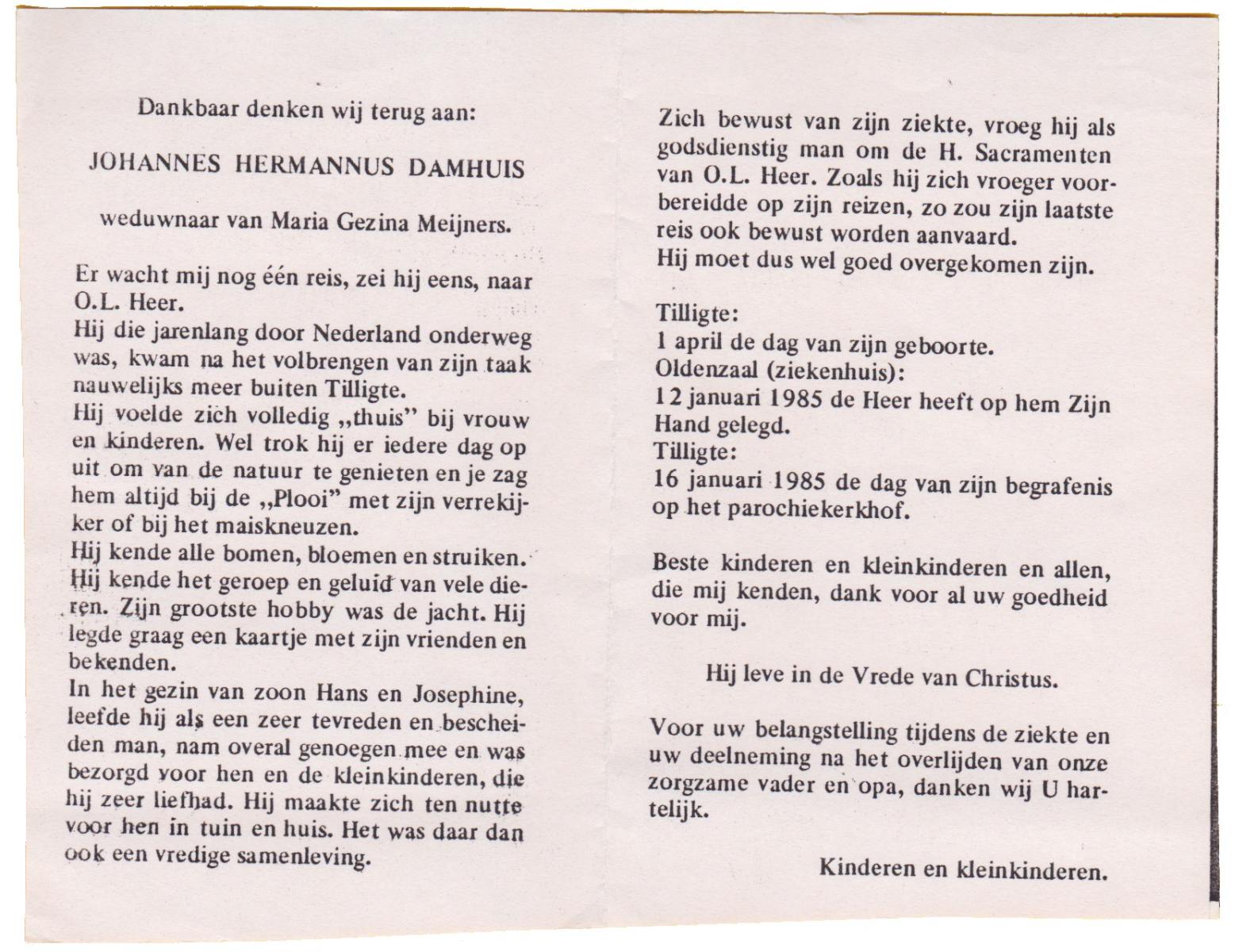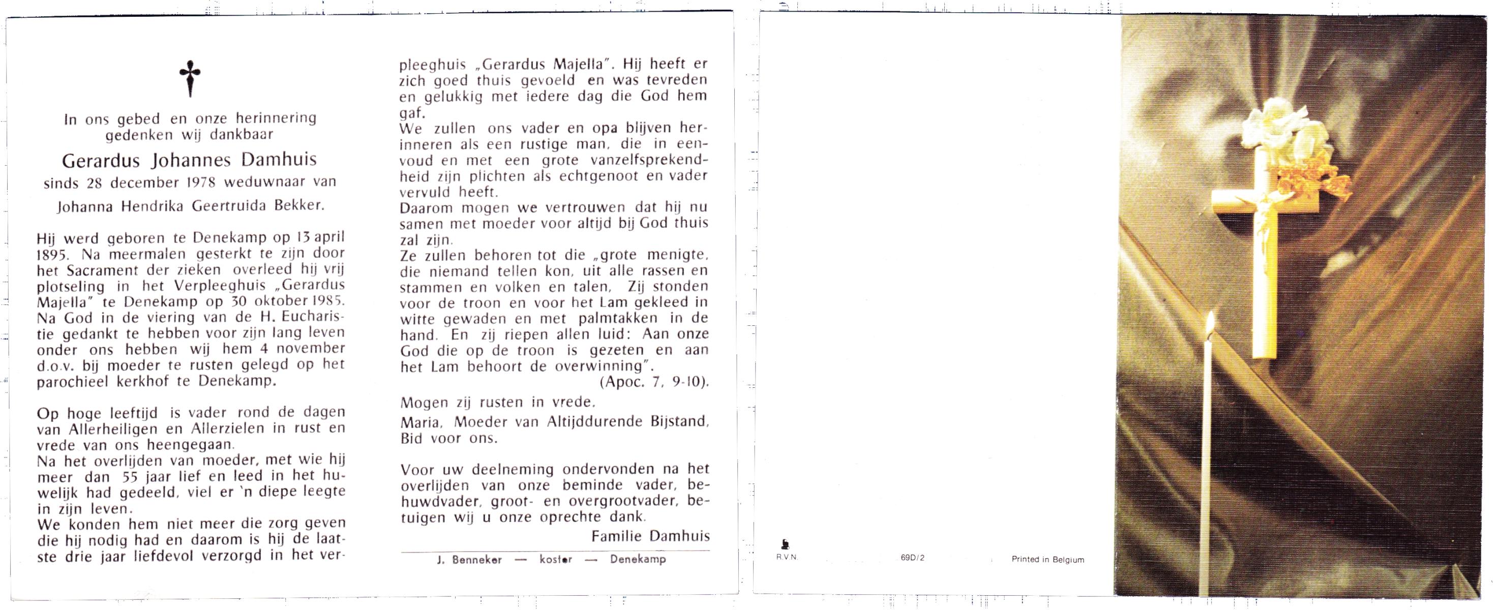DAMHUIS, Gerardus Johannes, geboren op 13-04-1895 te Denekamp, overleden op 30-10-1985 te Denekamp op 90-jarige leeftijd, begraven op 4-11-1985 te Denekamp.