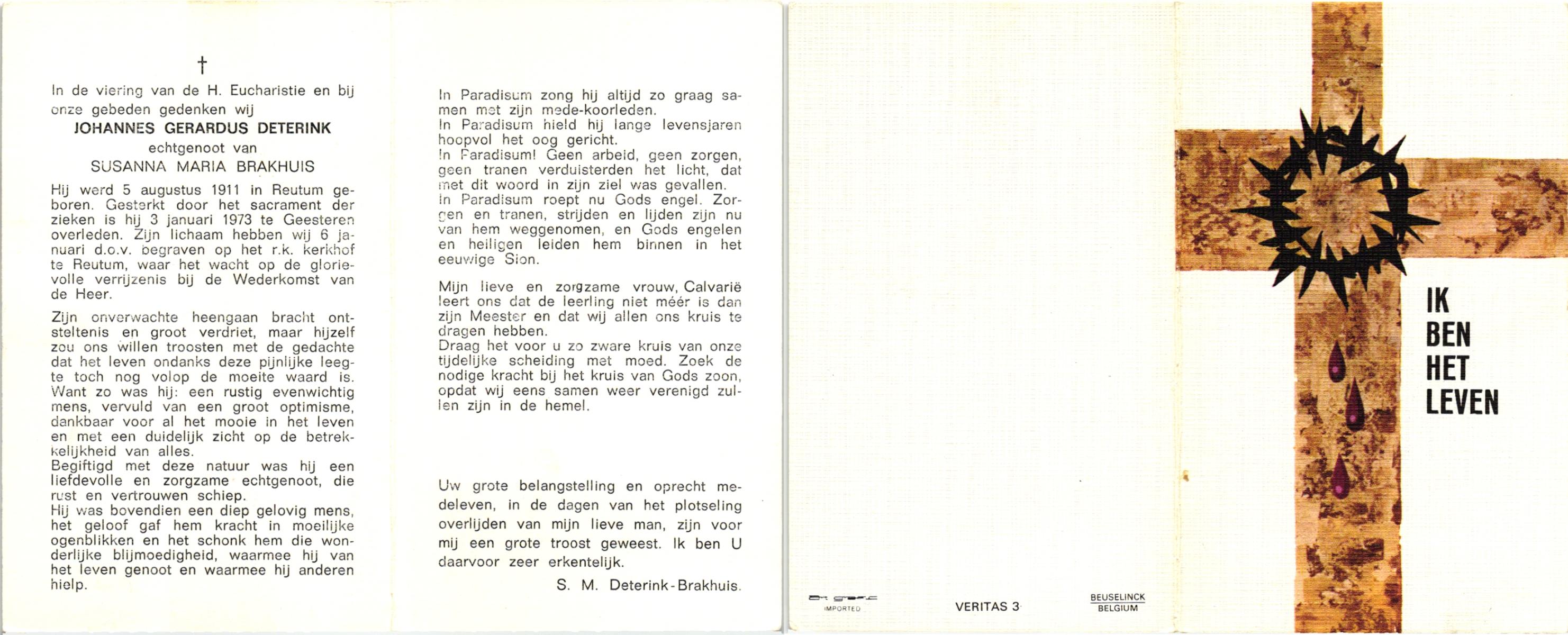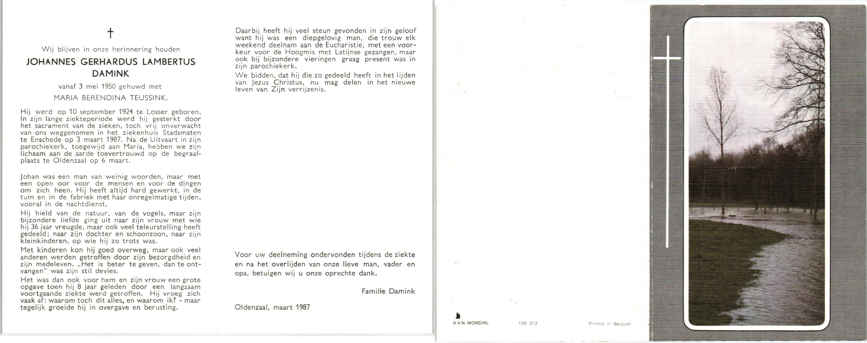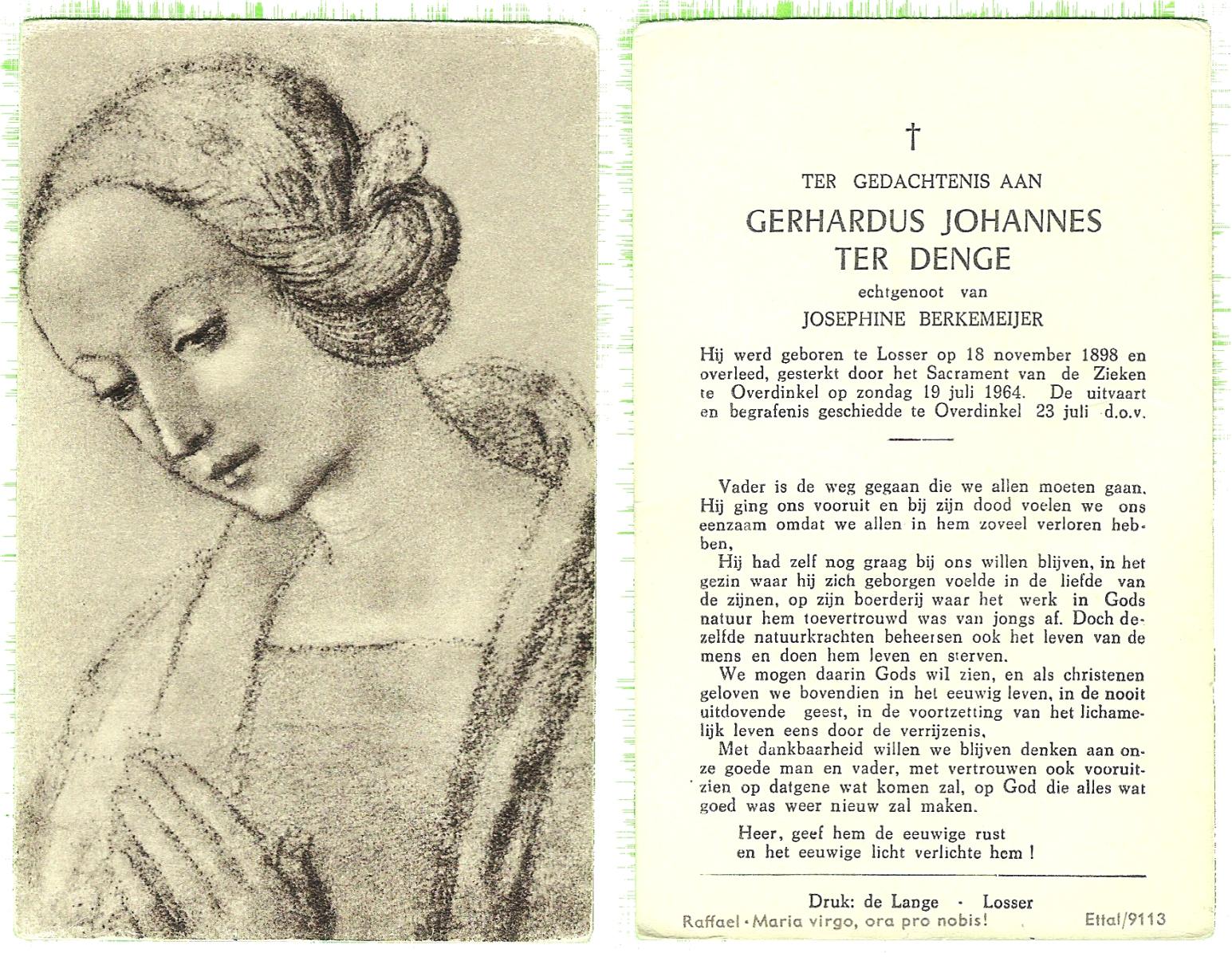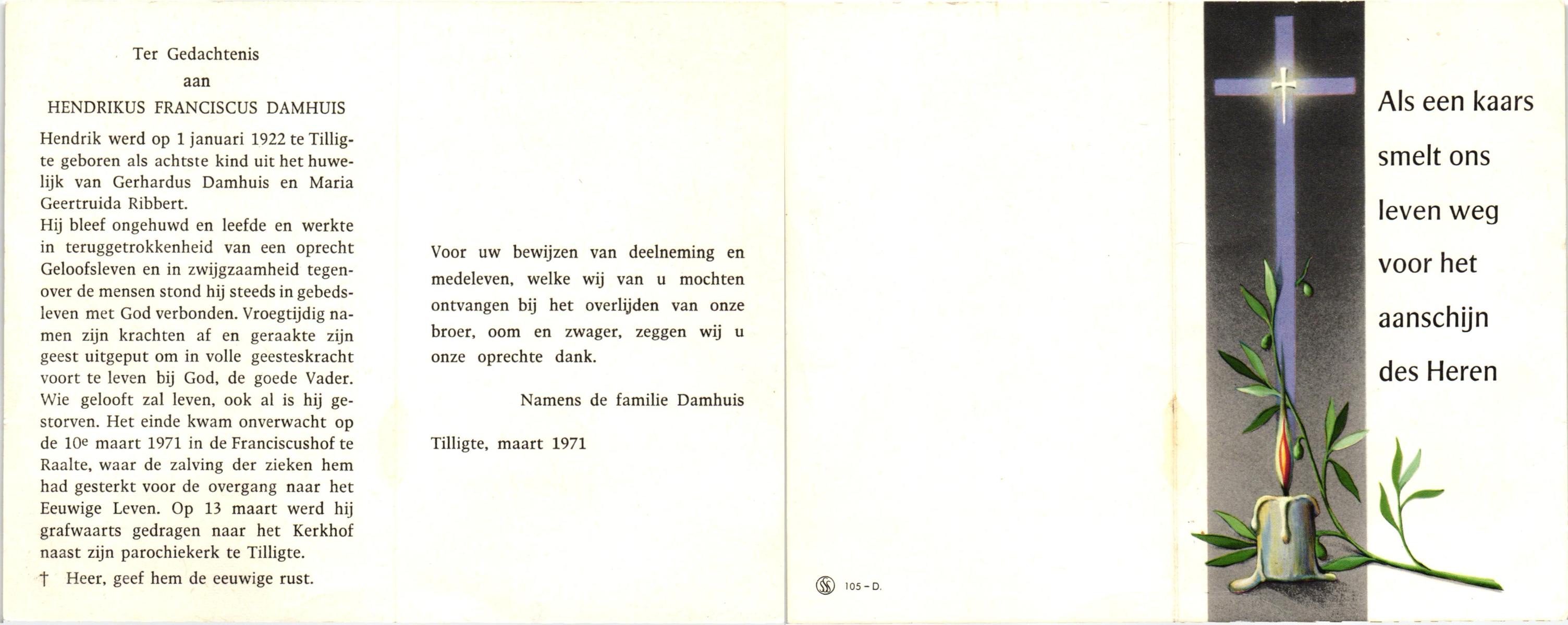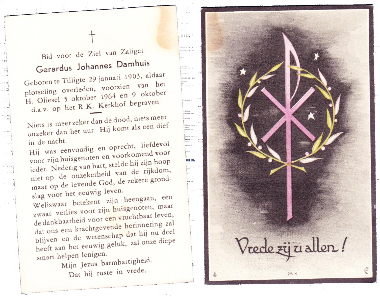 DAMHUIS, Gerardus Johannes, geboren op 29-1-1903 te Tilligte, overleden op 5-10-1964 te Tilligte op 61-jarige leeftijd, begraven op 9-10-1964 te Tilligte.