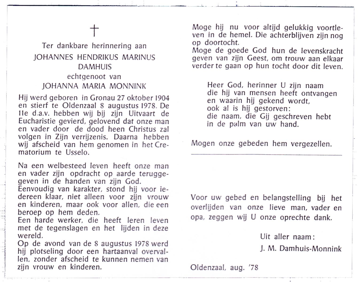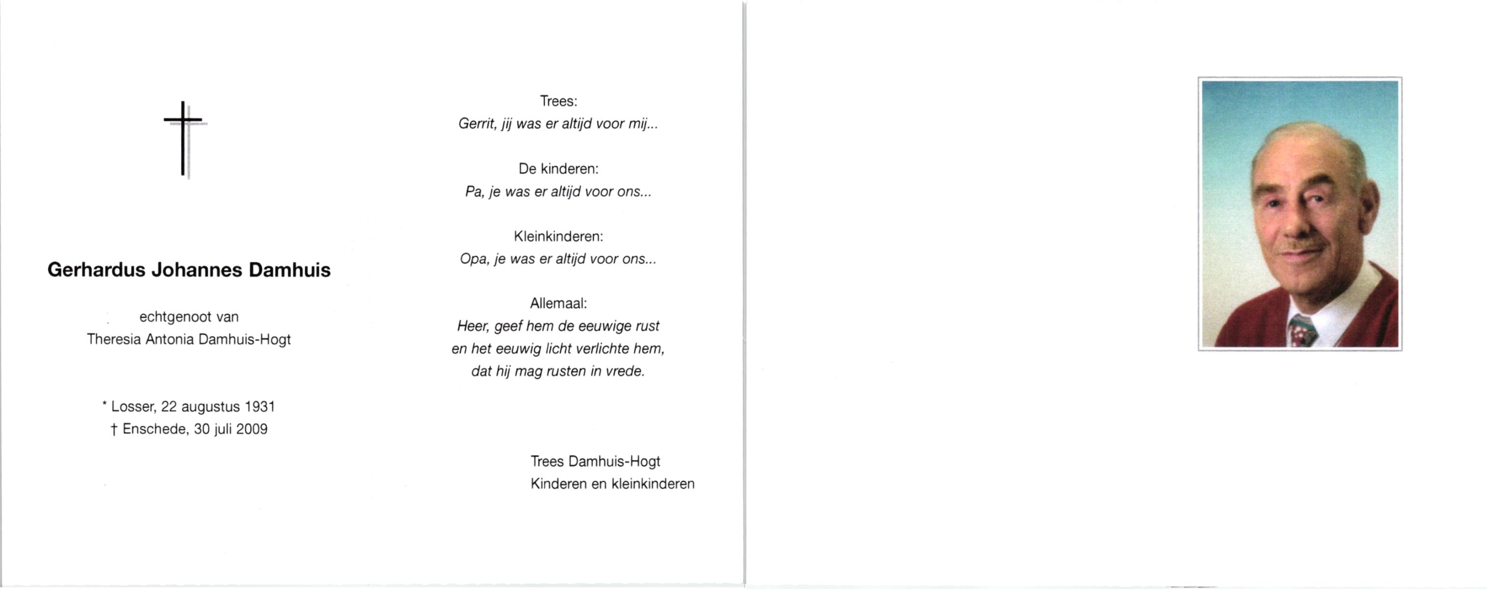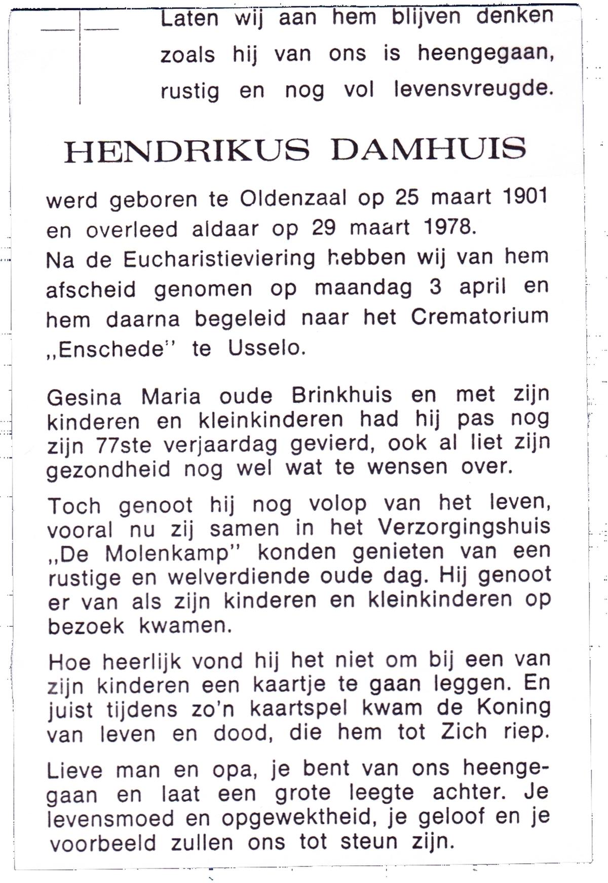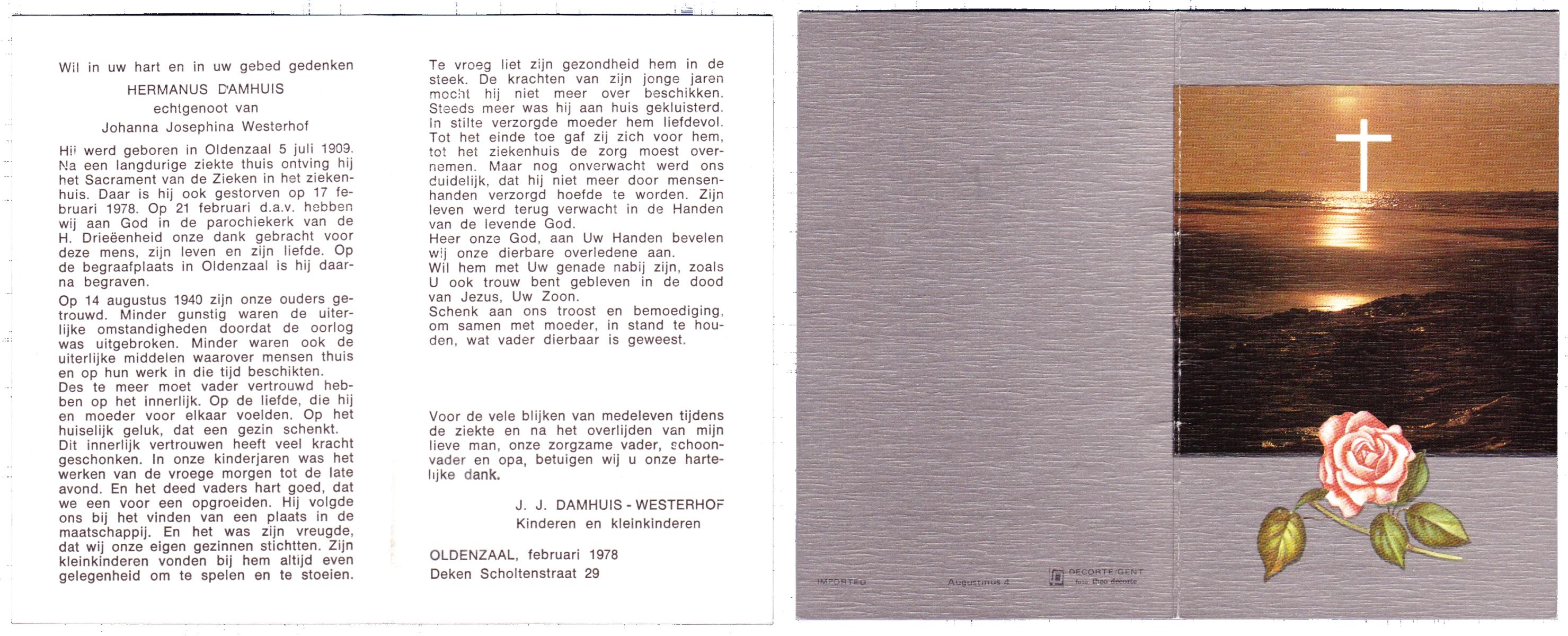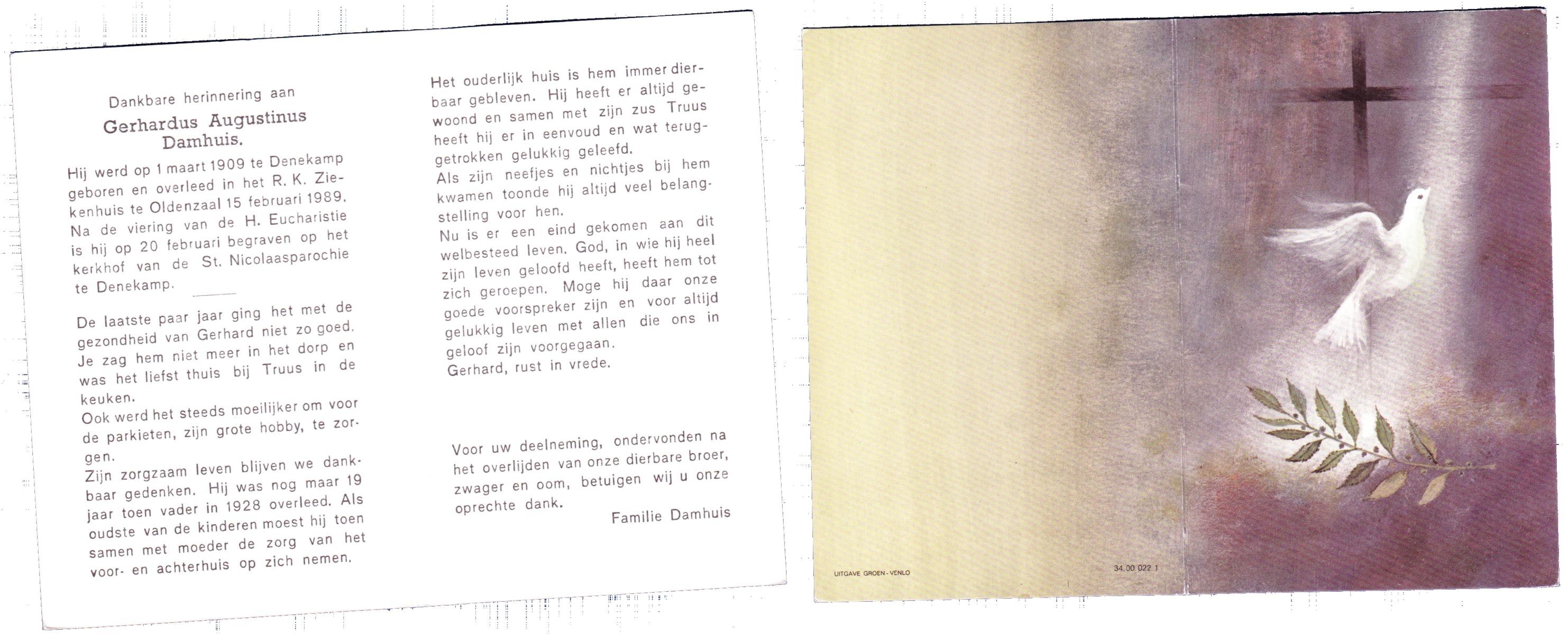 DAMHUIS, Gerhardus Augustinus, geboren op 1-3-1909 te Denekamp, overleden op 15-2-1989 te Oldenzaal op 79-jarige leeftijd, begraven op 20-2-1989 te Denekamp.