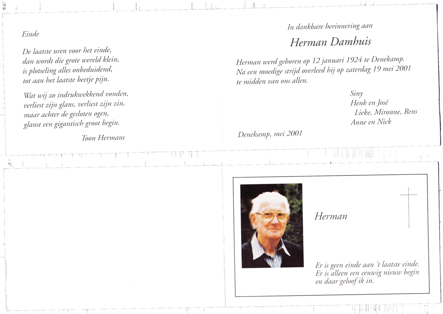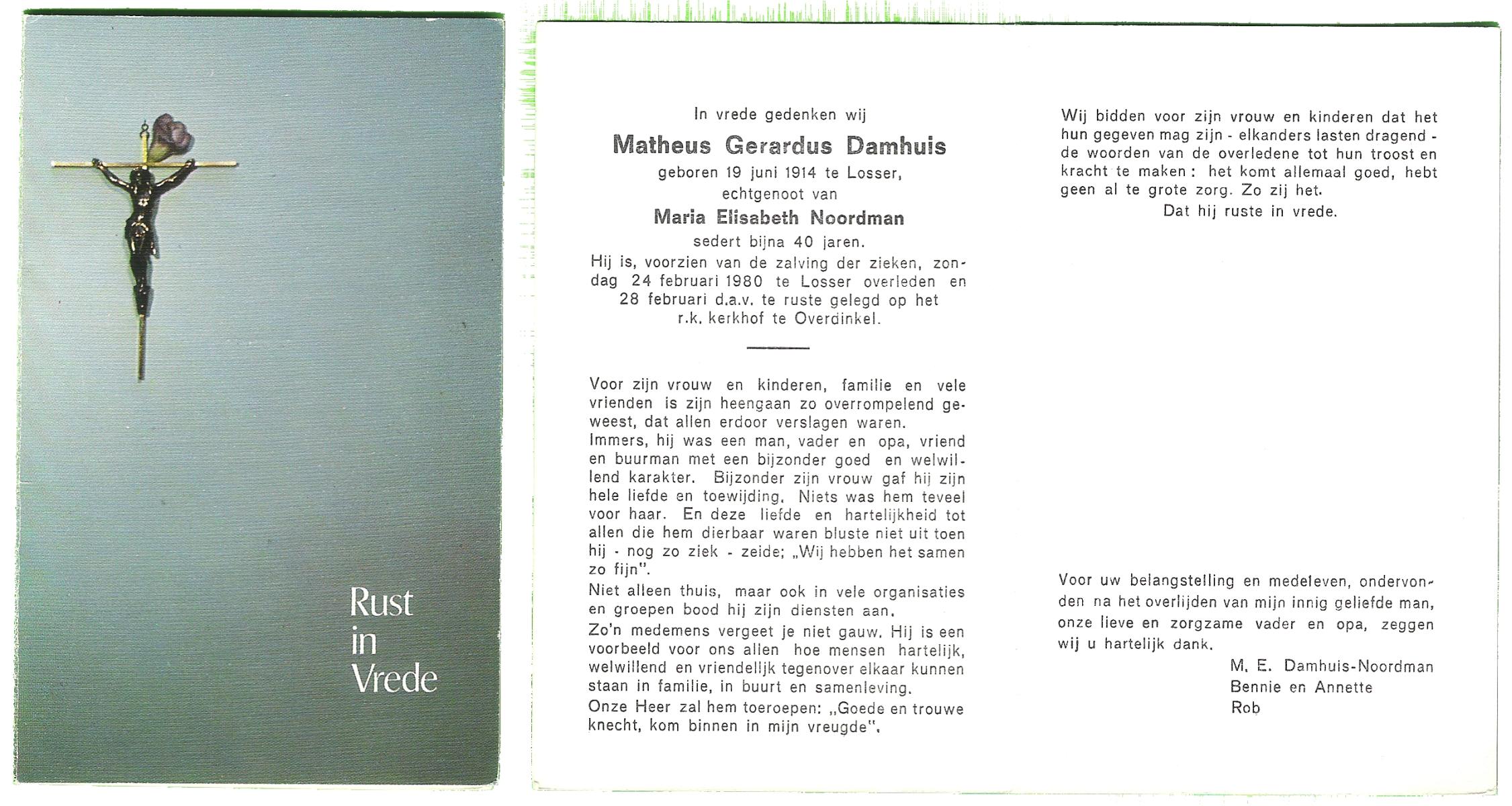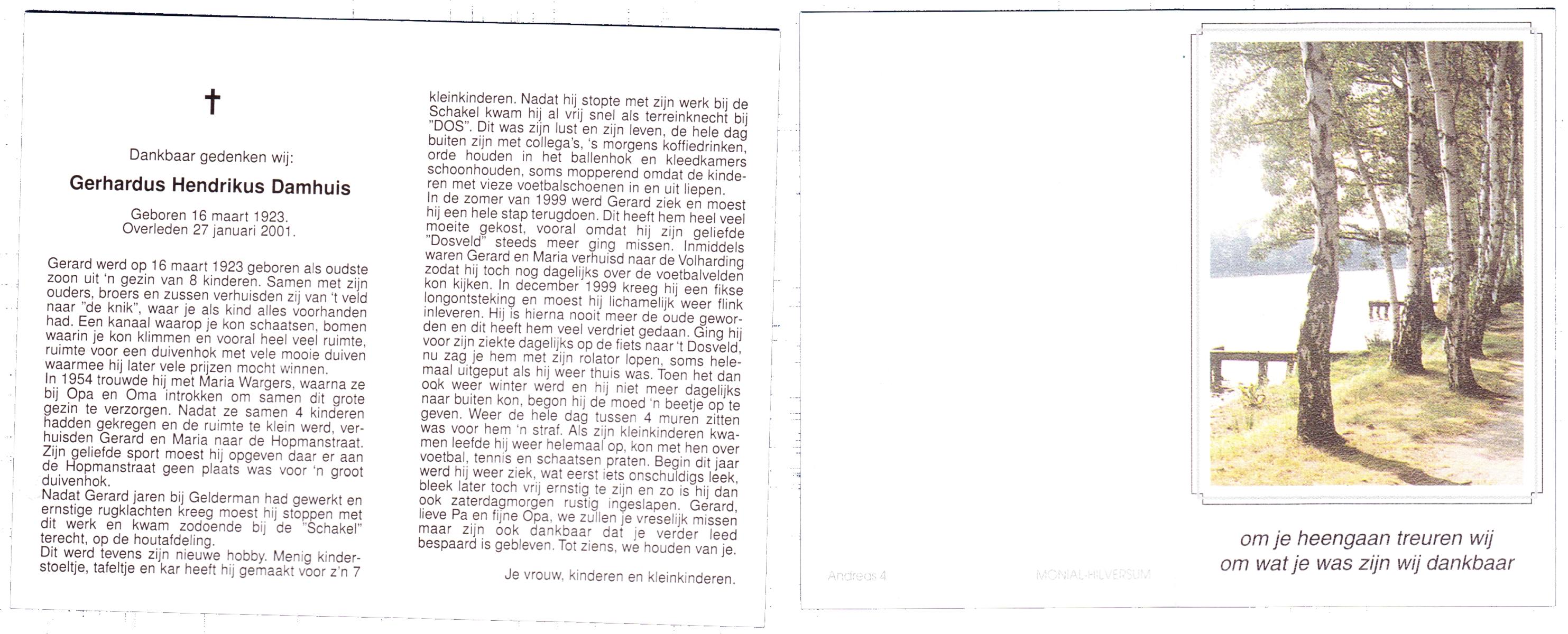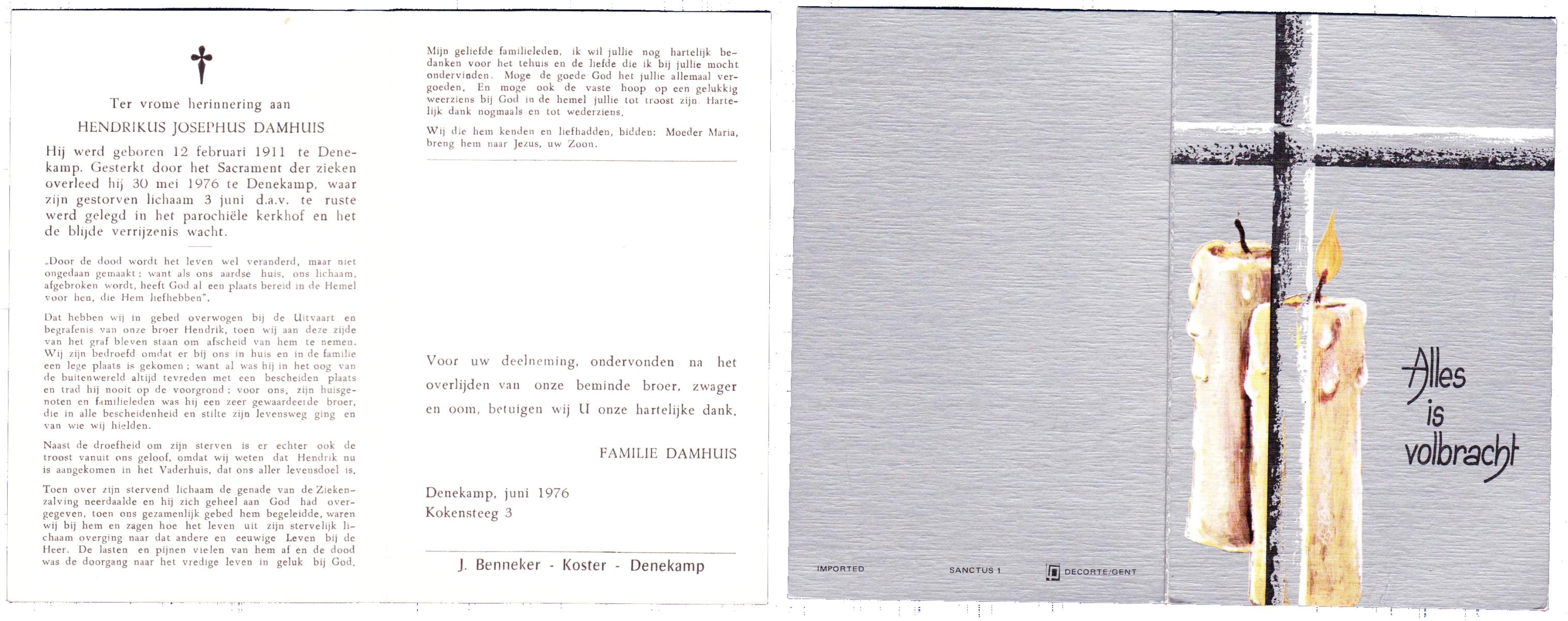 DAMHUIS, Gerhardus Augustinus, geboren op 1-3-1909 te Denekamp, overleden op 15-2-1989 te Oldenzaal op 79-jarige leeftijd, begraven op 20-2-1989 te Denekamp.