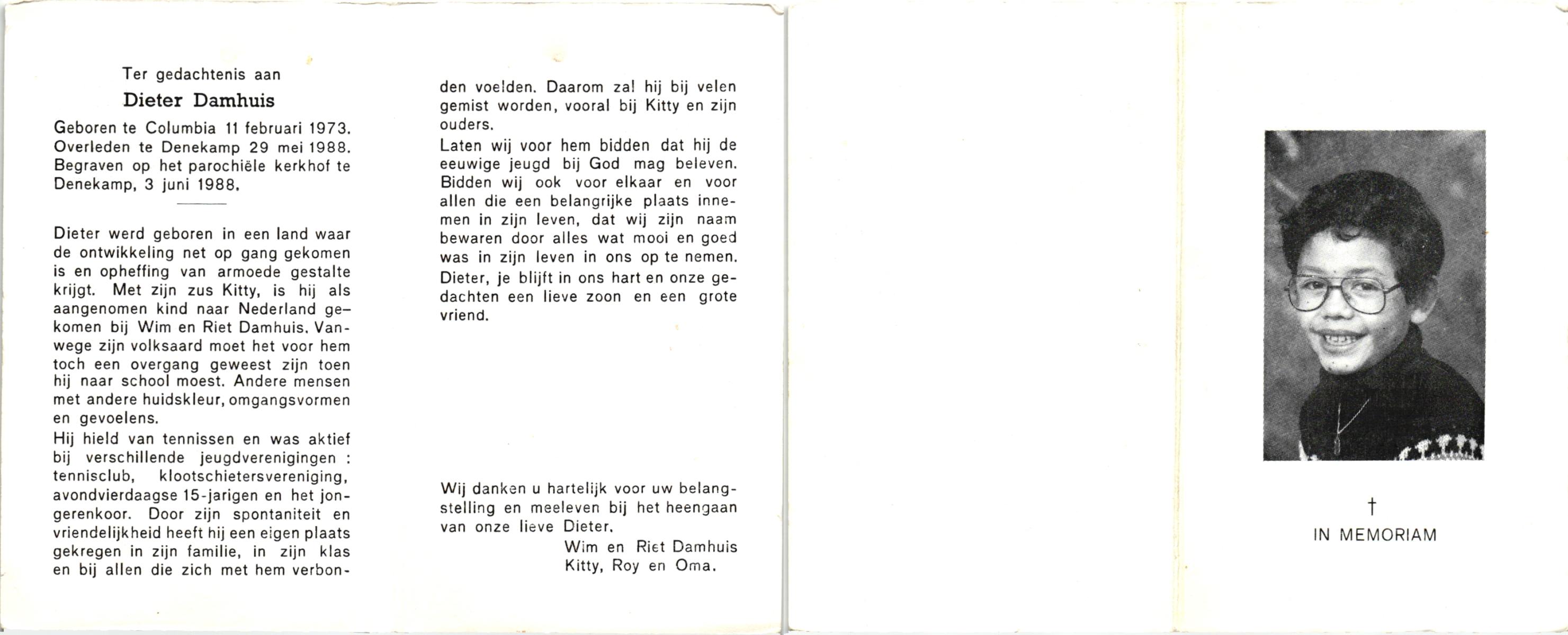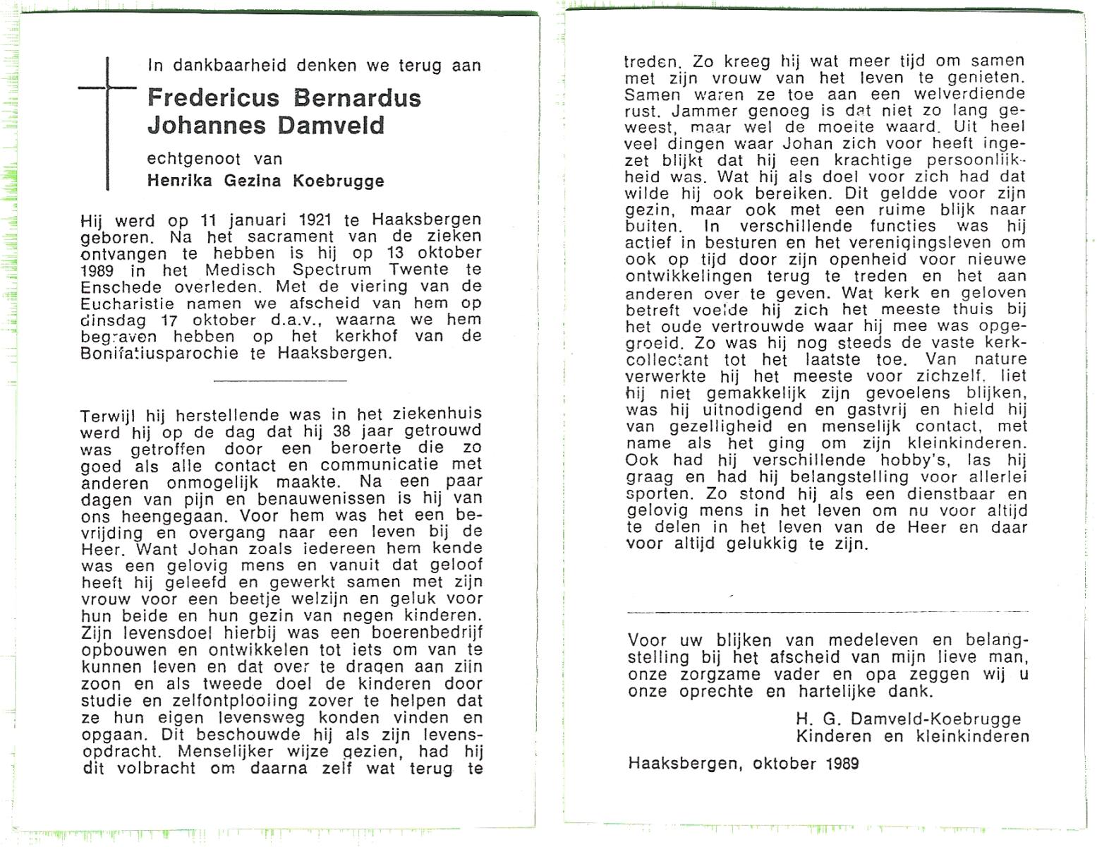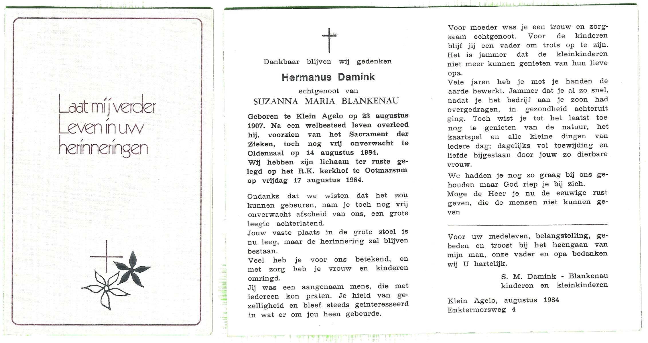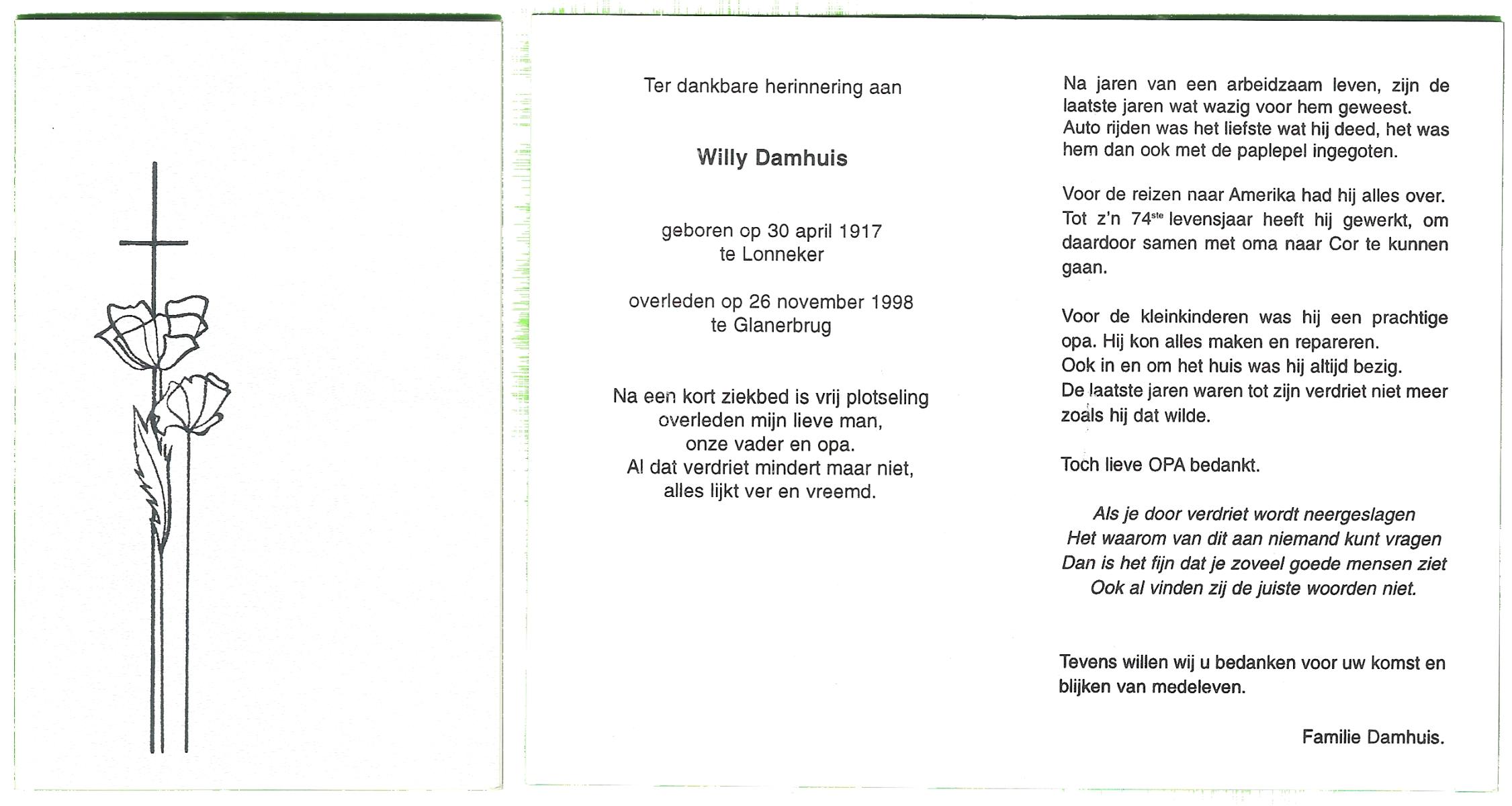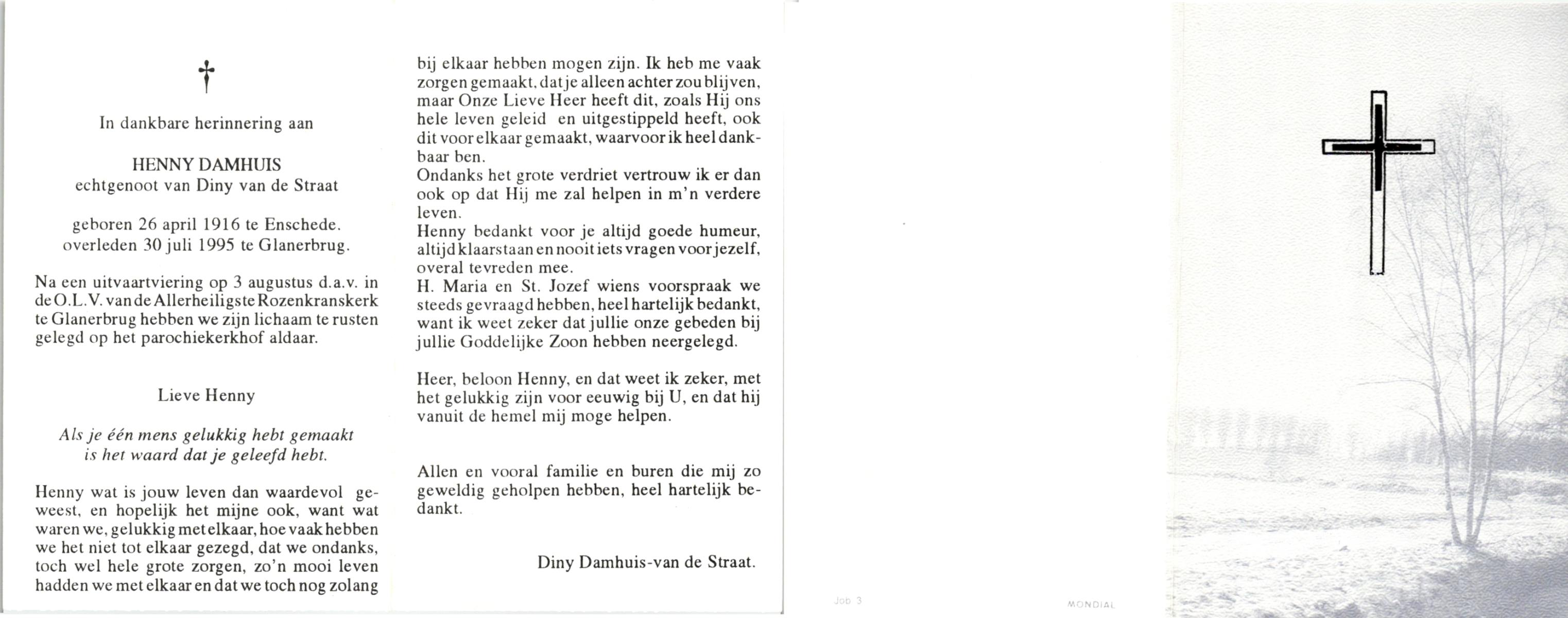 DAMHUIS, Gerhardus Augustinus, geboren op 1-3-1909 te Denekamp, overleden op 15-2-1989 te Oldenzaal op 79-jarige leeftijd, begraven op 20-2-1989 te Denekamp.