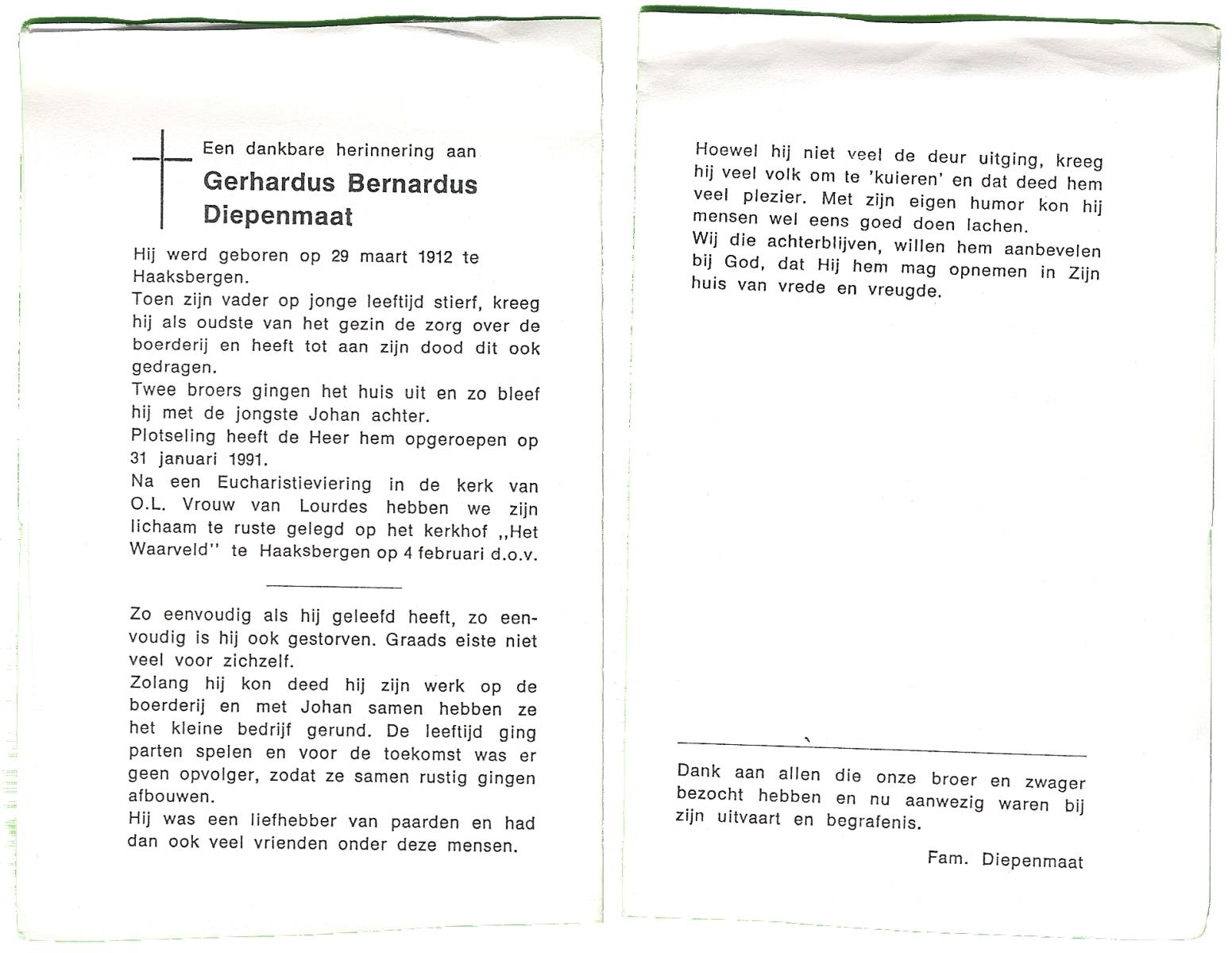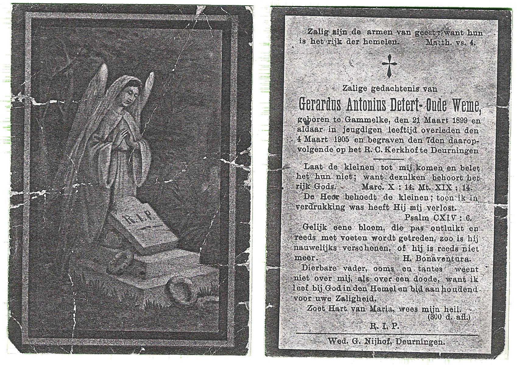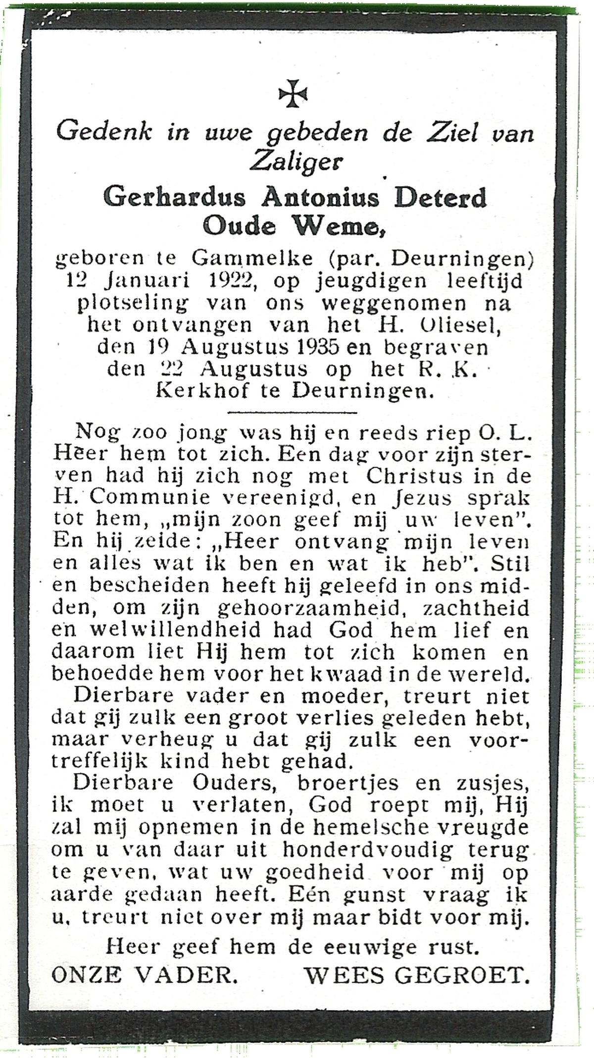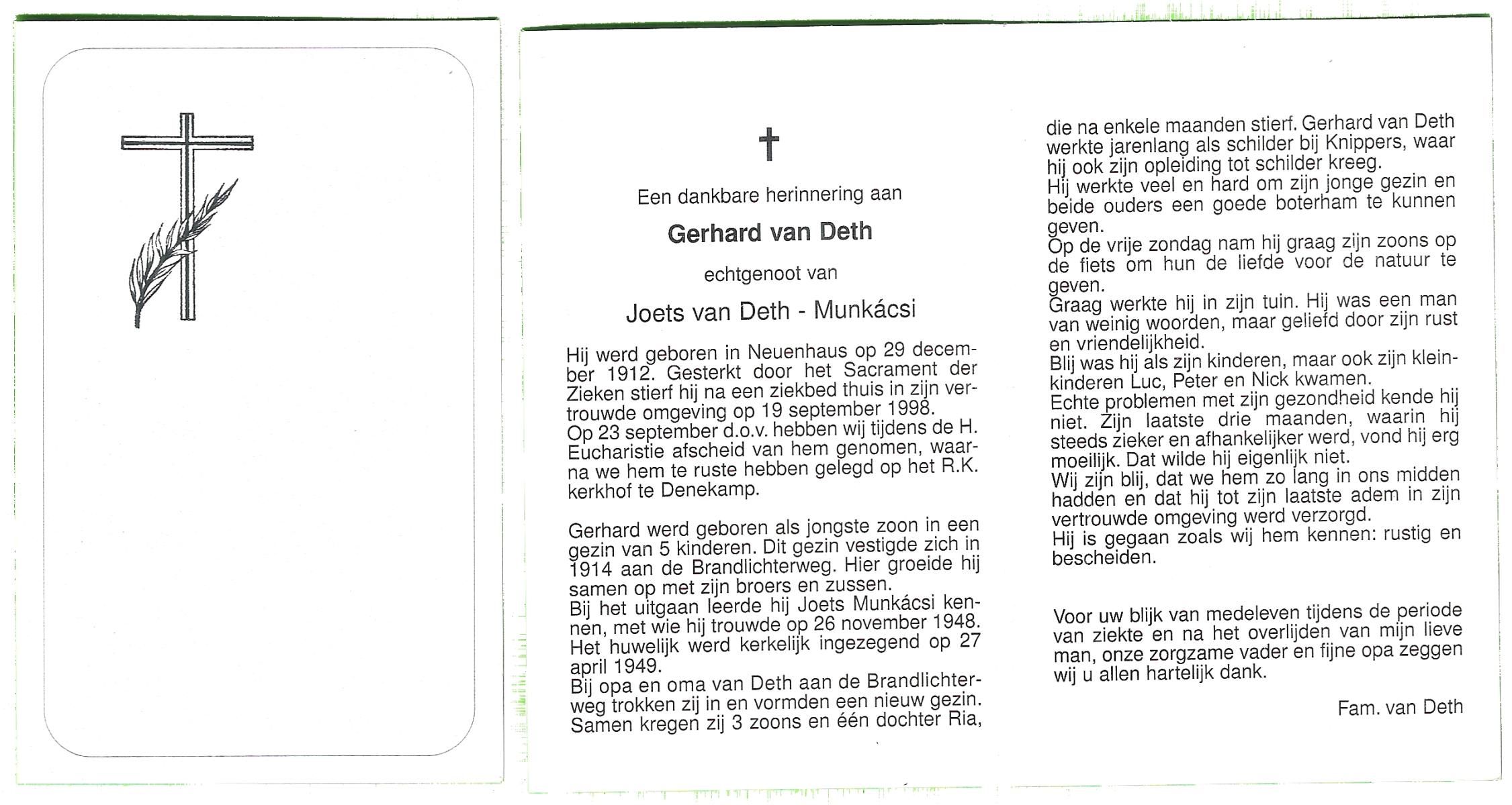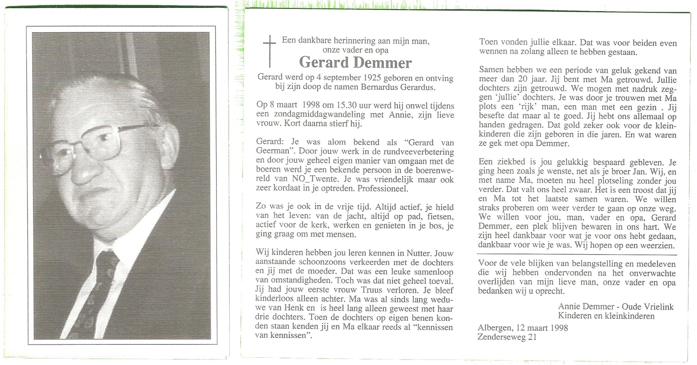 DAMHUIS, Gerhardus Augustinus, geboren op 1-3-1909 te Denekamp, overleden op 15-2-1989 te Oldenzaal op 79-jarige leeftijd, begraven op 20-2-1989 te Denekamp.