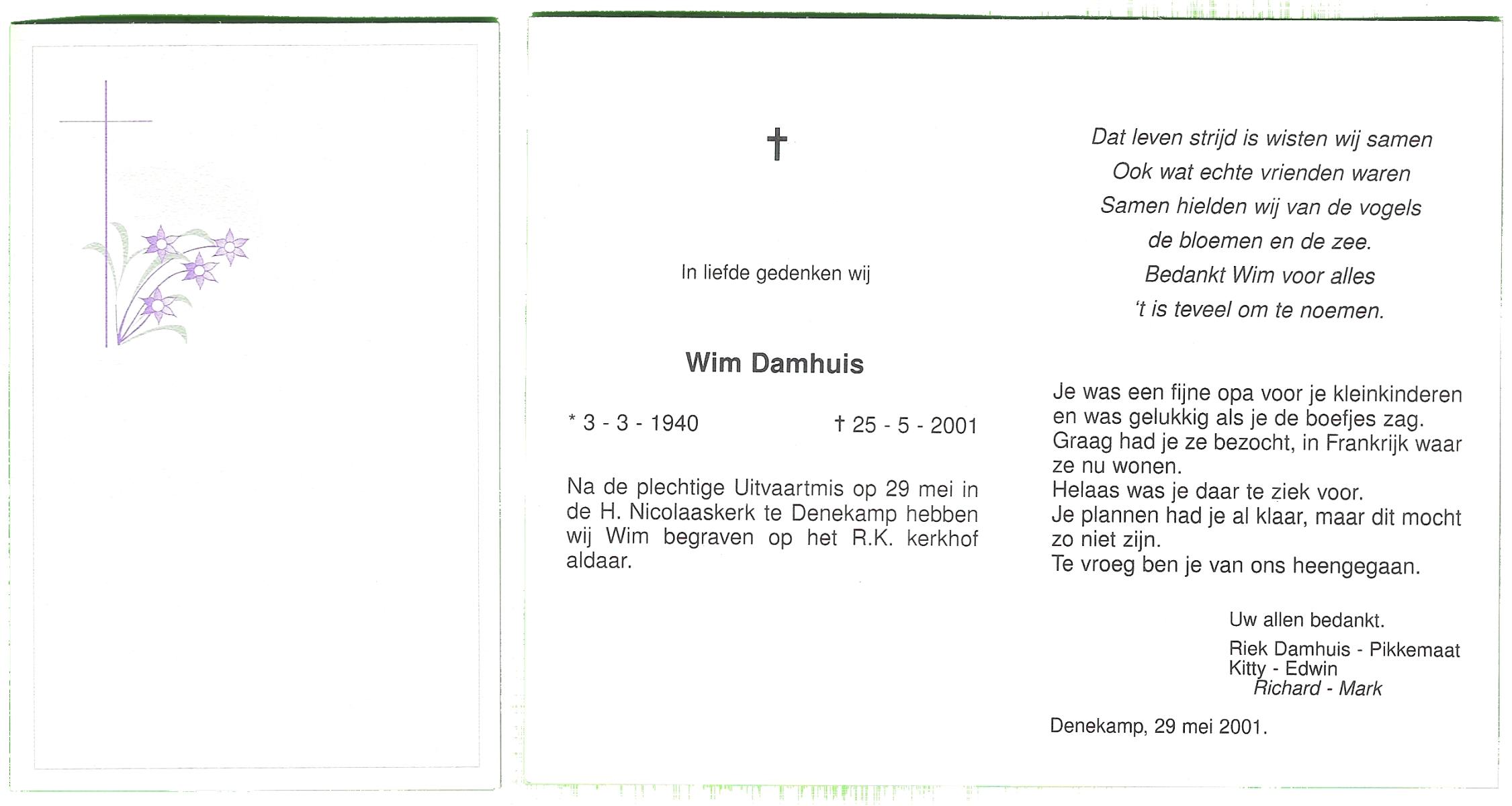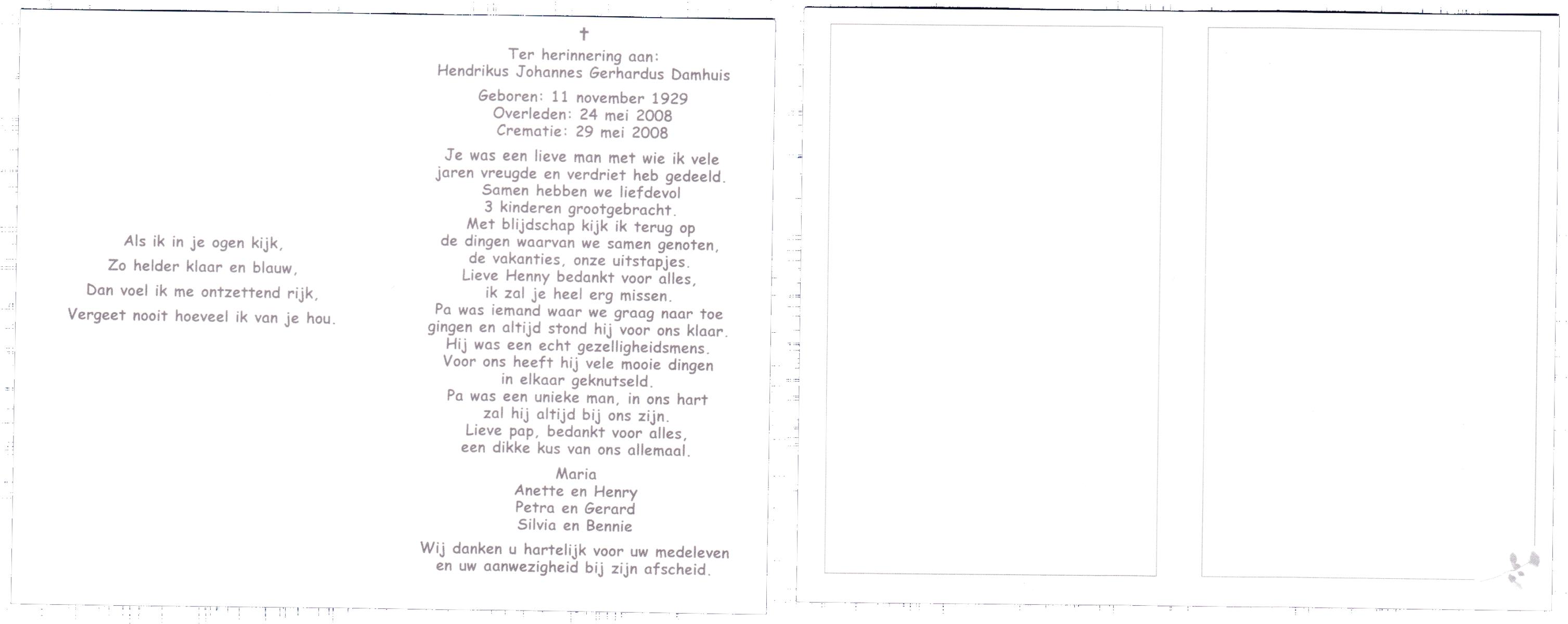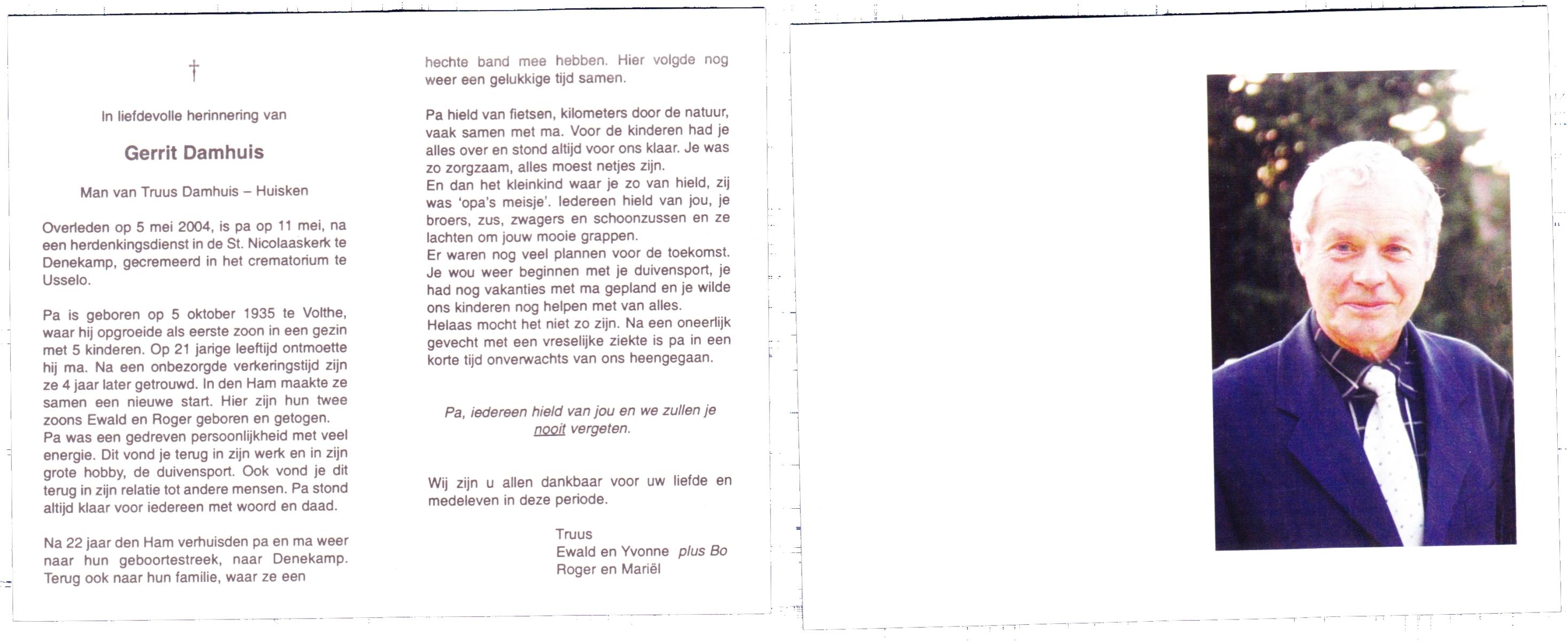 DAMHUIS, Gerrit, geboren op 5-10-1935 te Volthe, overleden op 5-5-2004 op 68-jarige leeftijd, gecremeerd op 11-5-2004 te Usselo.