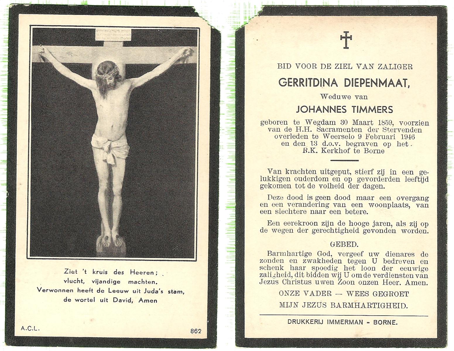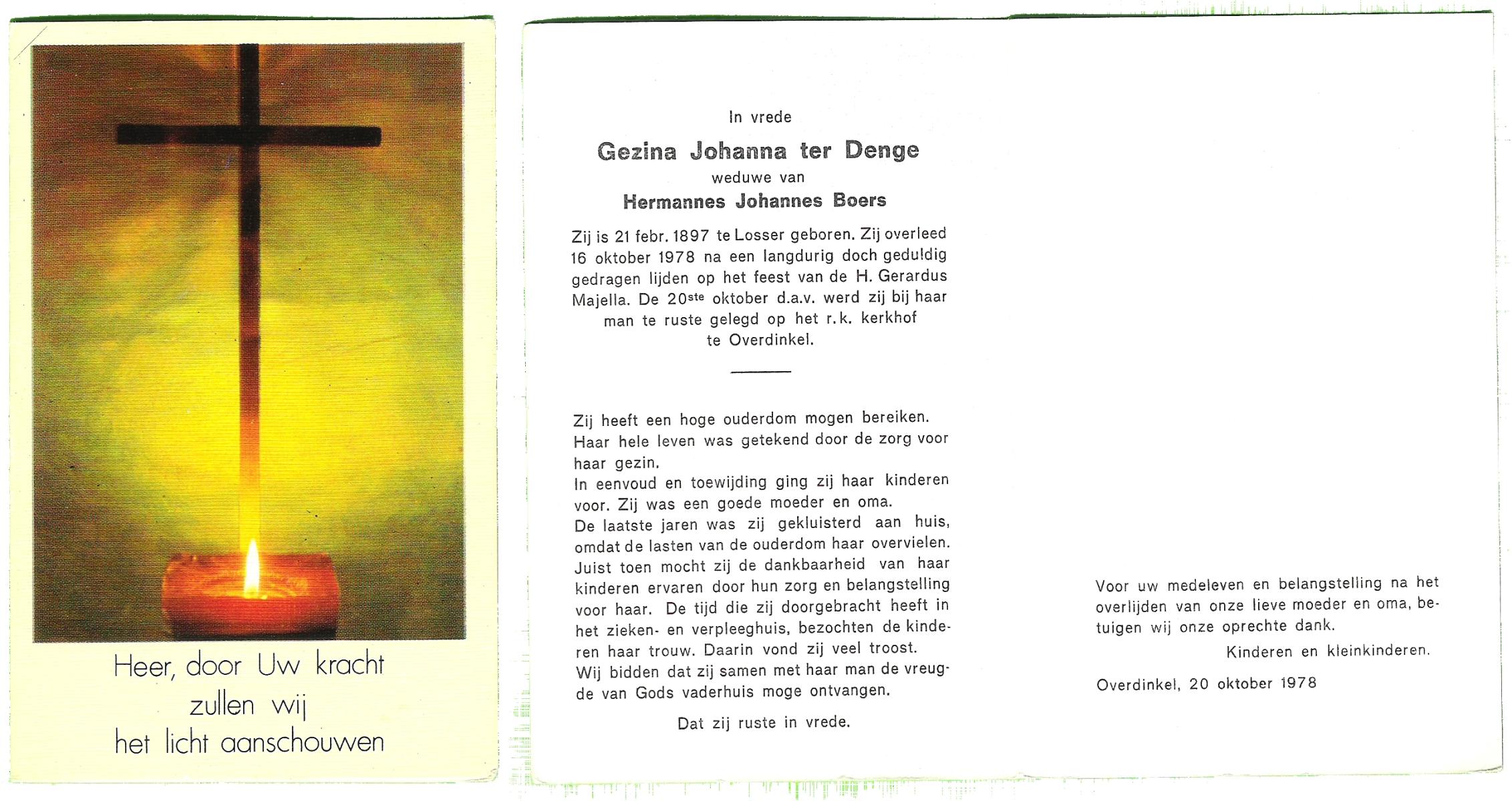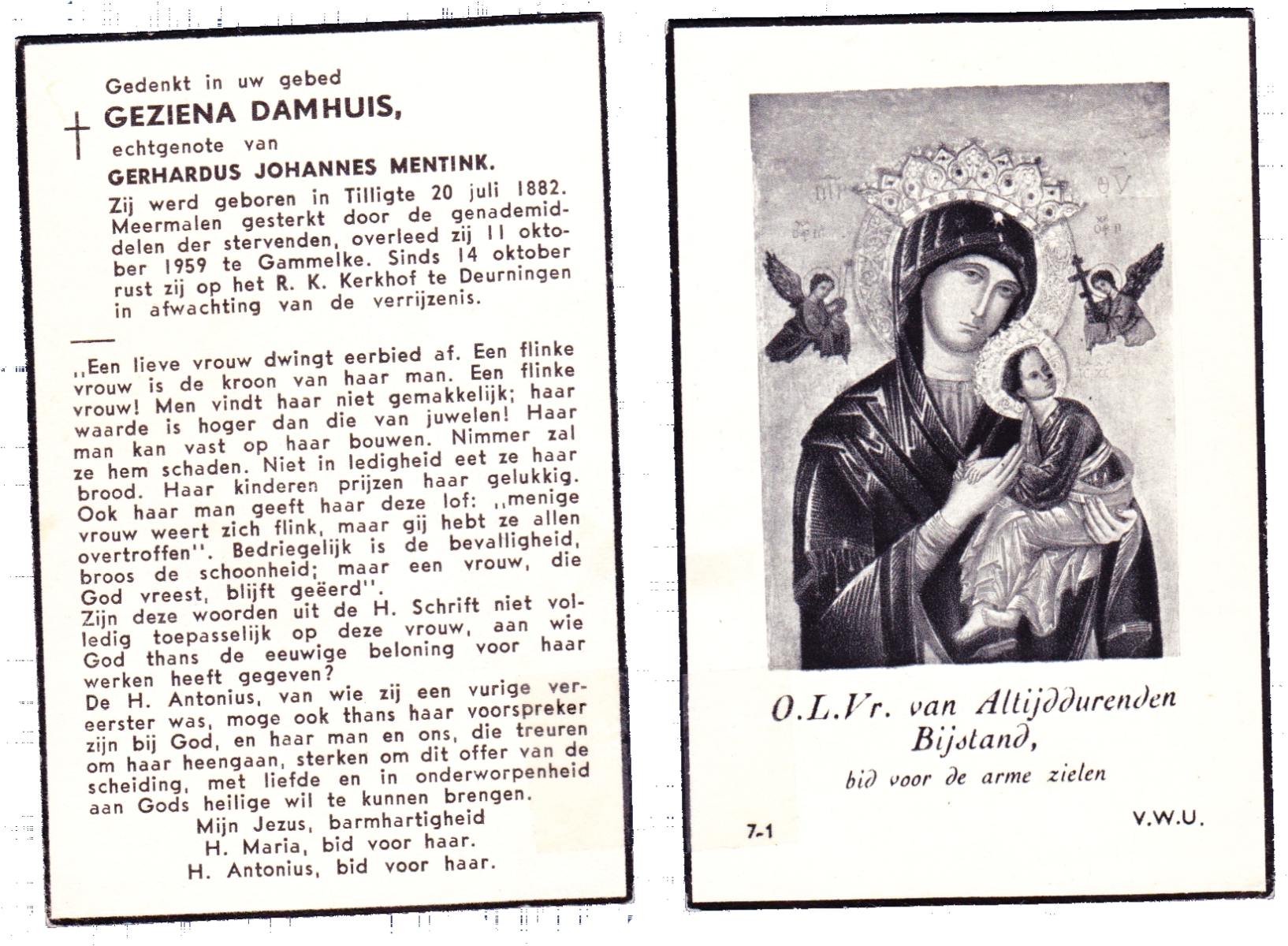 DAMHUIS, Geziena, geboren op 20-07-1882 te Tilligte, overleden op 11-10-1959 te Gammelke op 77-jarige leeftijd, begraven op 14-10-1959 te Deurningen.
