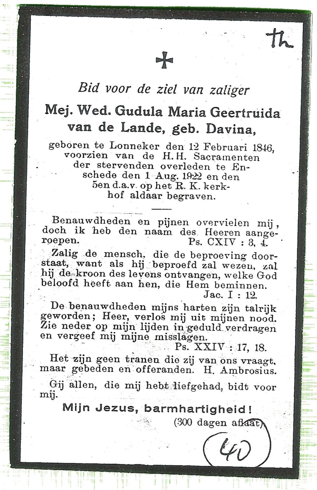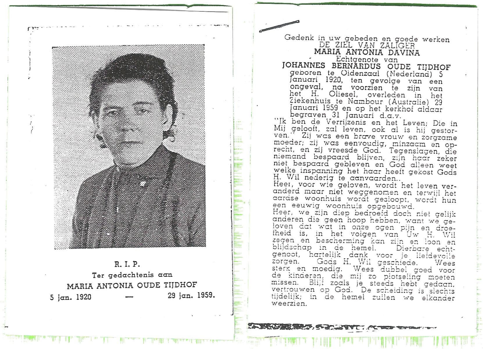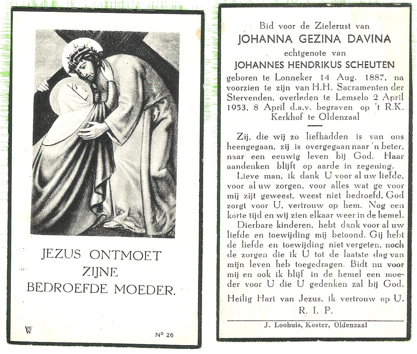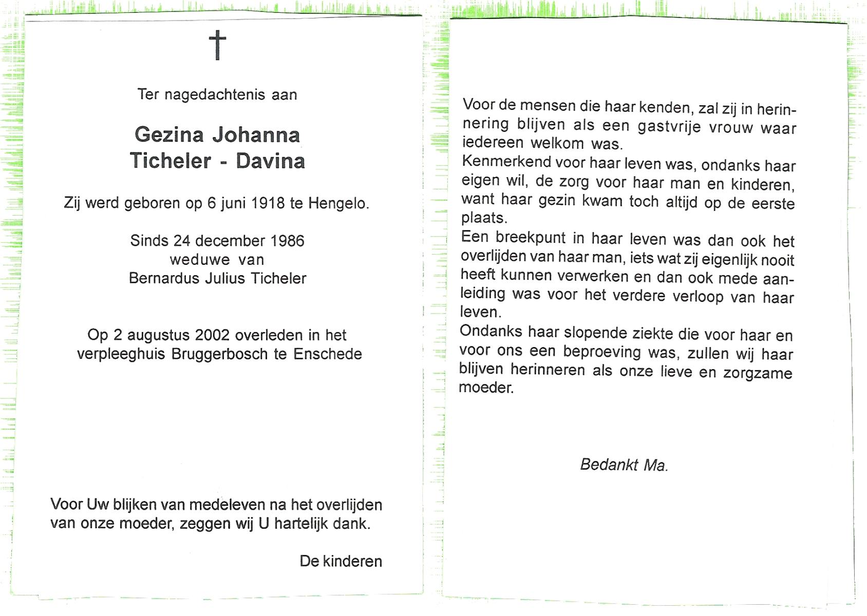 DAMHUIS, Geziena, geboren op 20-07-1882 te Tilligte, overleden op 11-10-1959 te Gammelke op 77-jarige leeftijd, begraven op 14-10-1959 te Deurningen.