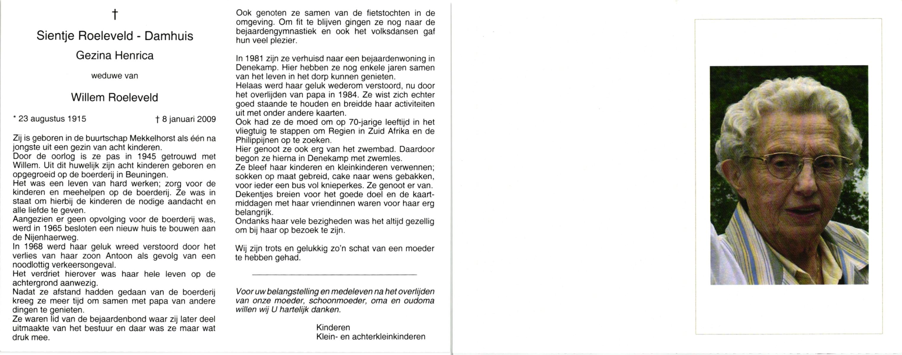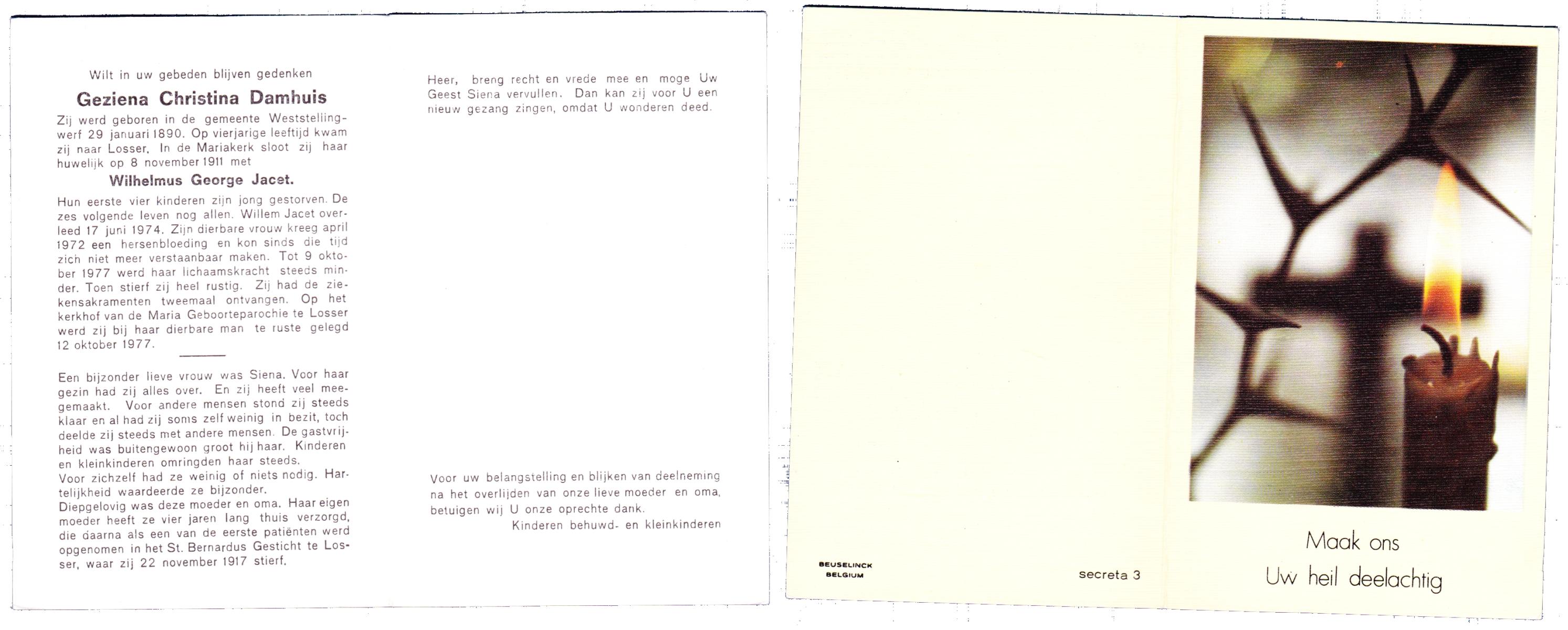DAMHUIS, Geziena Christina, geboren op 29-01-1890 te Weststellingwerf, overleden op 9-10-1977 op 87-jarige leeftijd, begraven op 12-10-1977 te Losser.