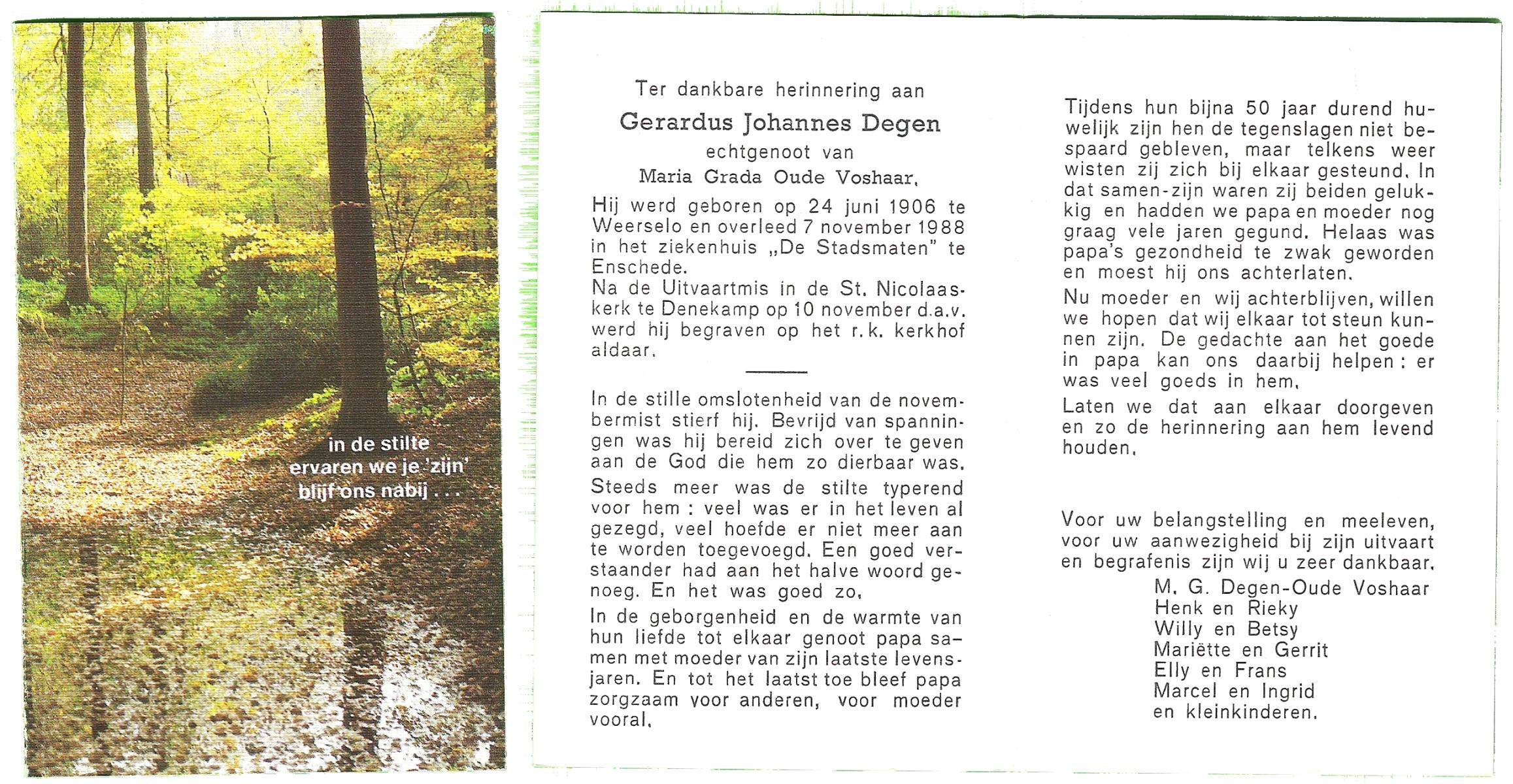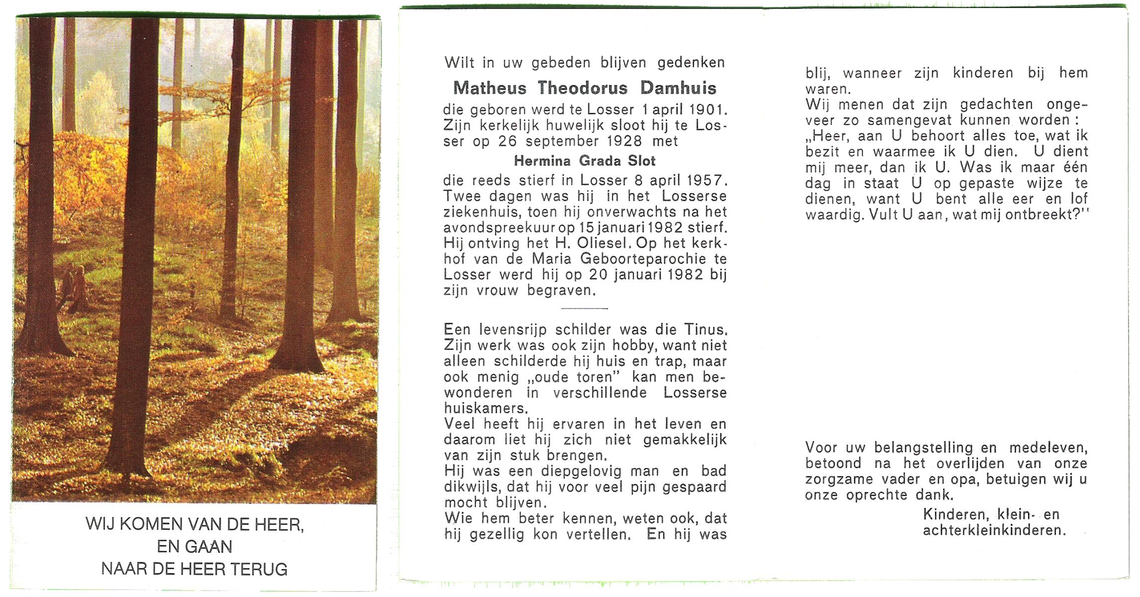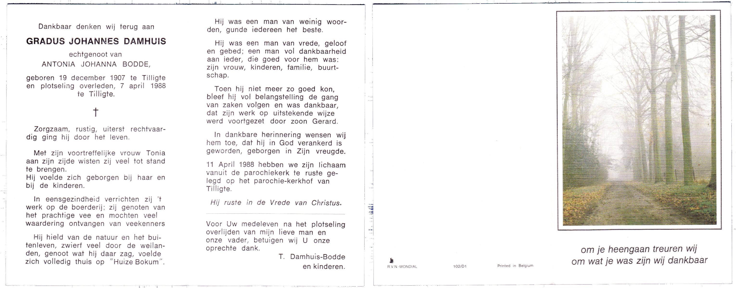 DAMHUIS, Gradus Johannes, geboren op 19-12-1907 te Tilligte, overleden op 7-4-1988 te Tilligte op 80-jarige leeftijd, begraven op 11-4-1988 te Tilligte.