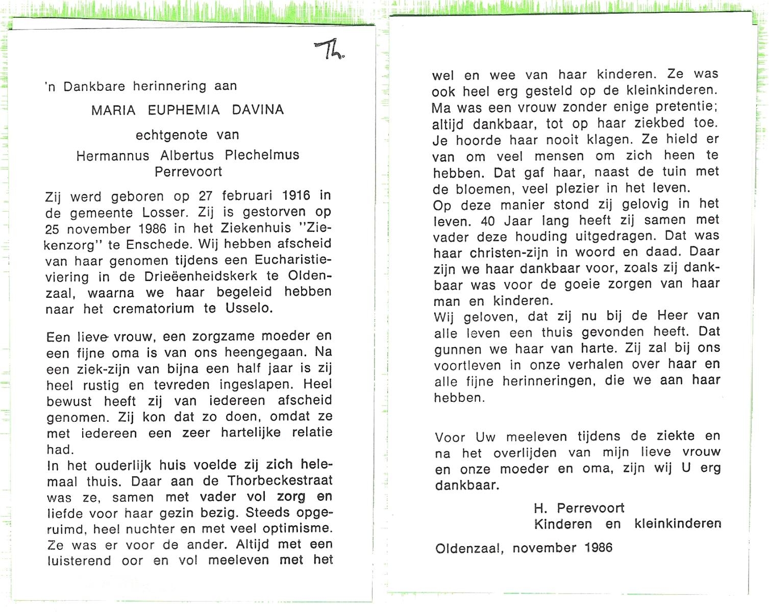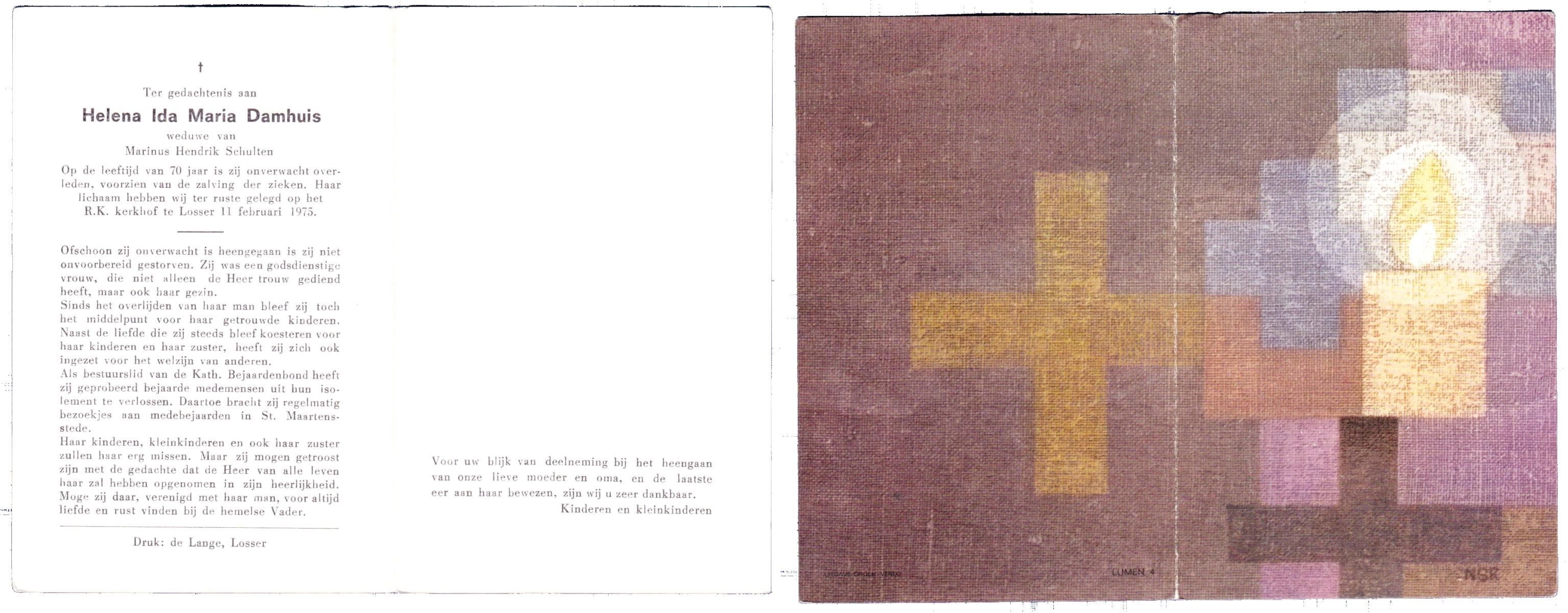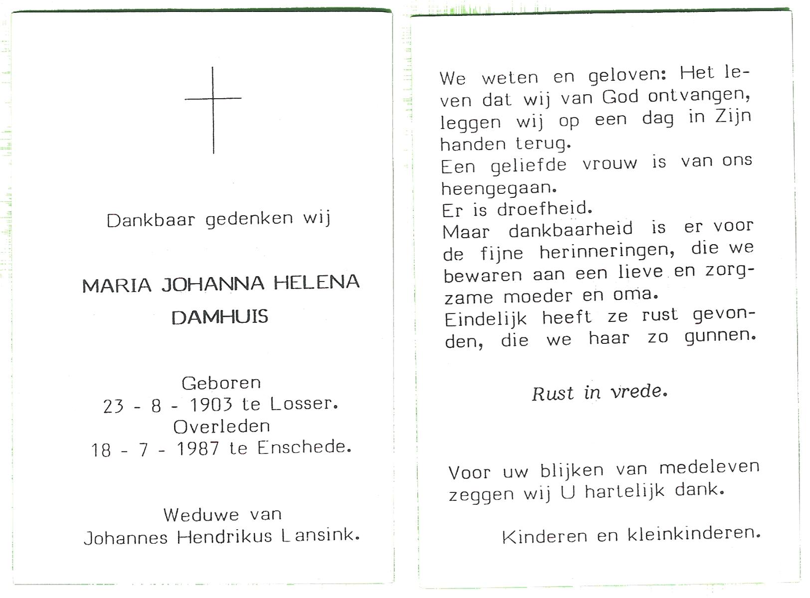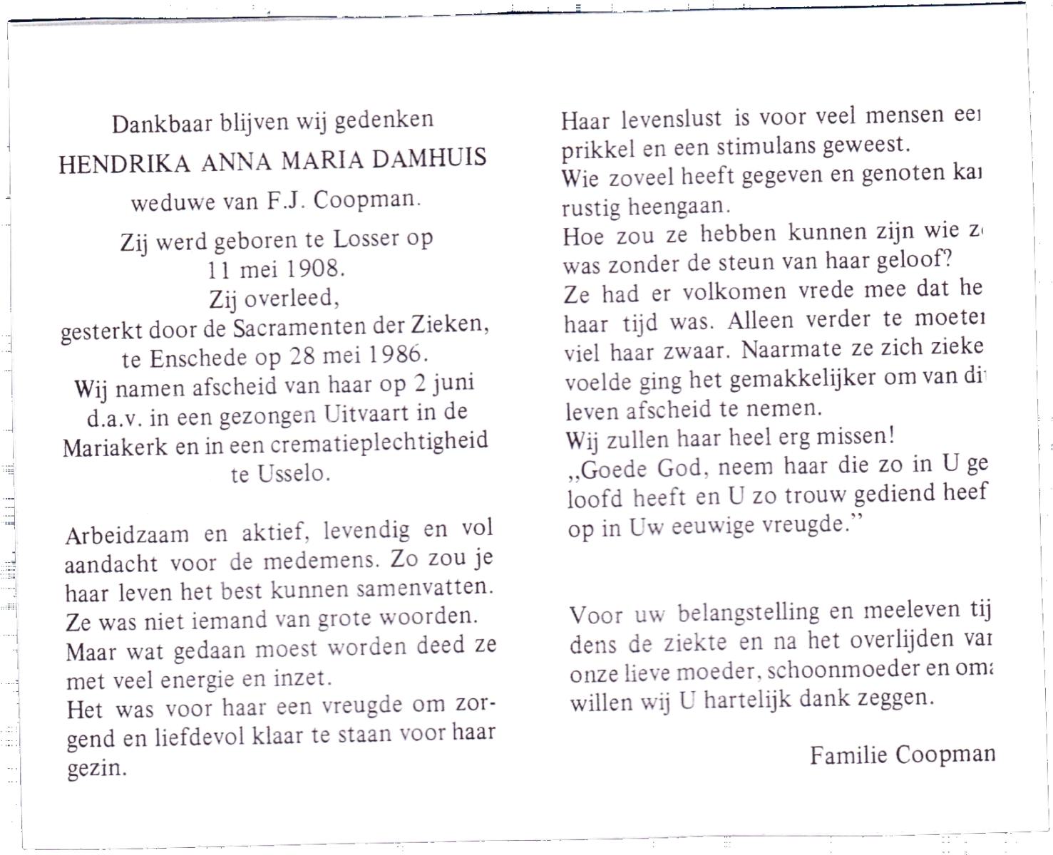 DAMHUIS, Hendrika Anna Maria, geboren op 11-5-1908 te Losser, overleden op 28-5-1986 te Enschede op 78-jarige leeftijd, gecremeerd op 2-6-1986 te Usselo.