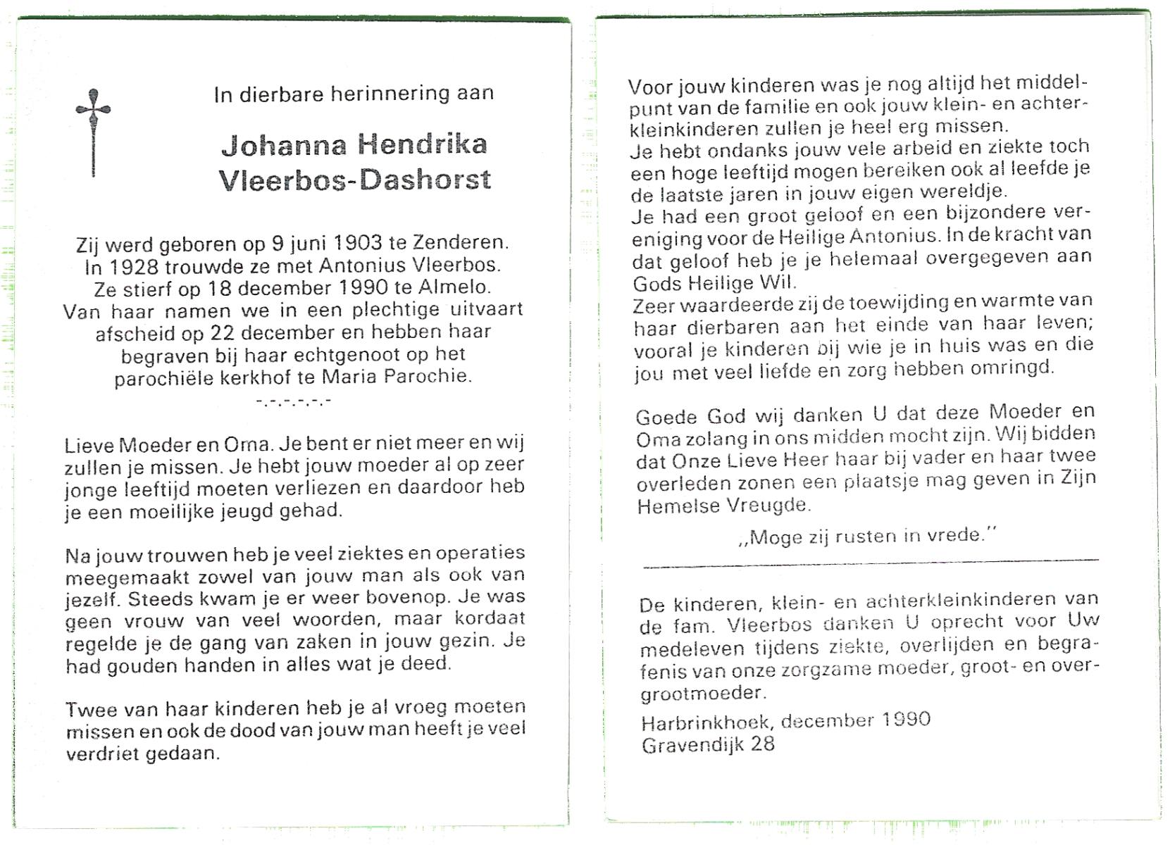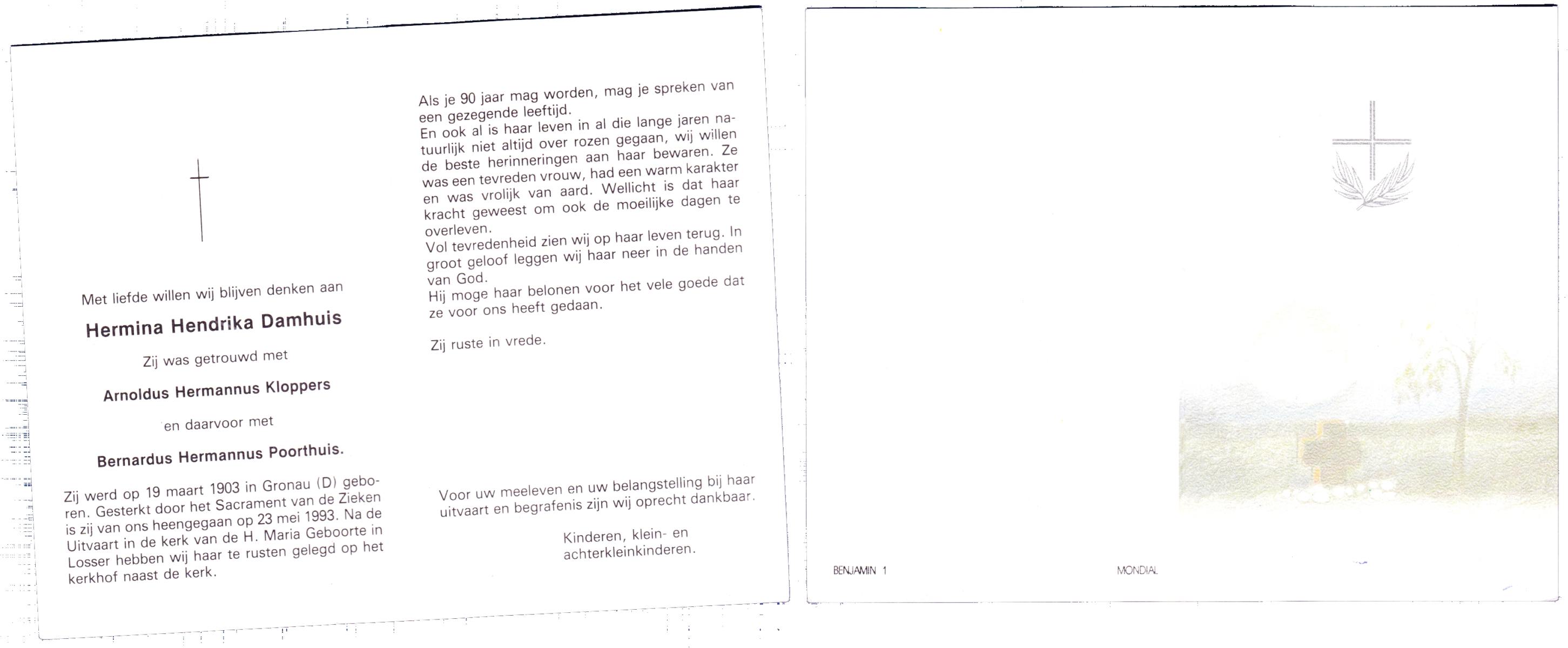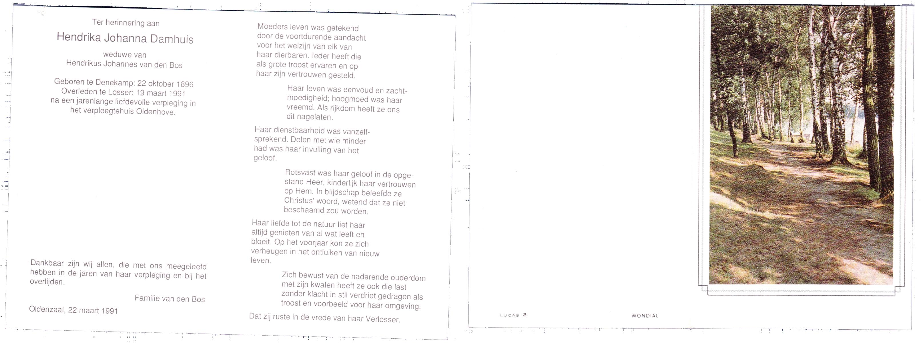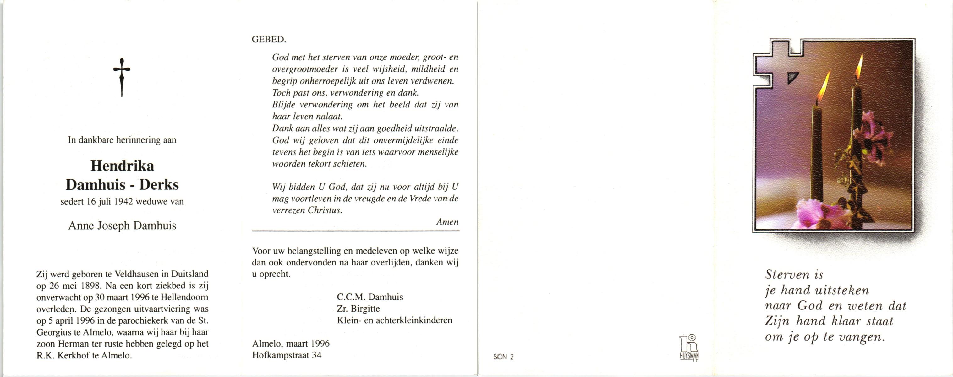 DAMHUIS, Hendrika Johanna, geboren op 22-10-1896 te Denekamp, overleden op 19-3-1991 te Losser op 94-jarige leeftijd.