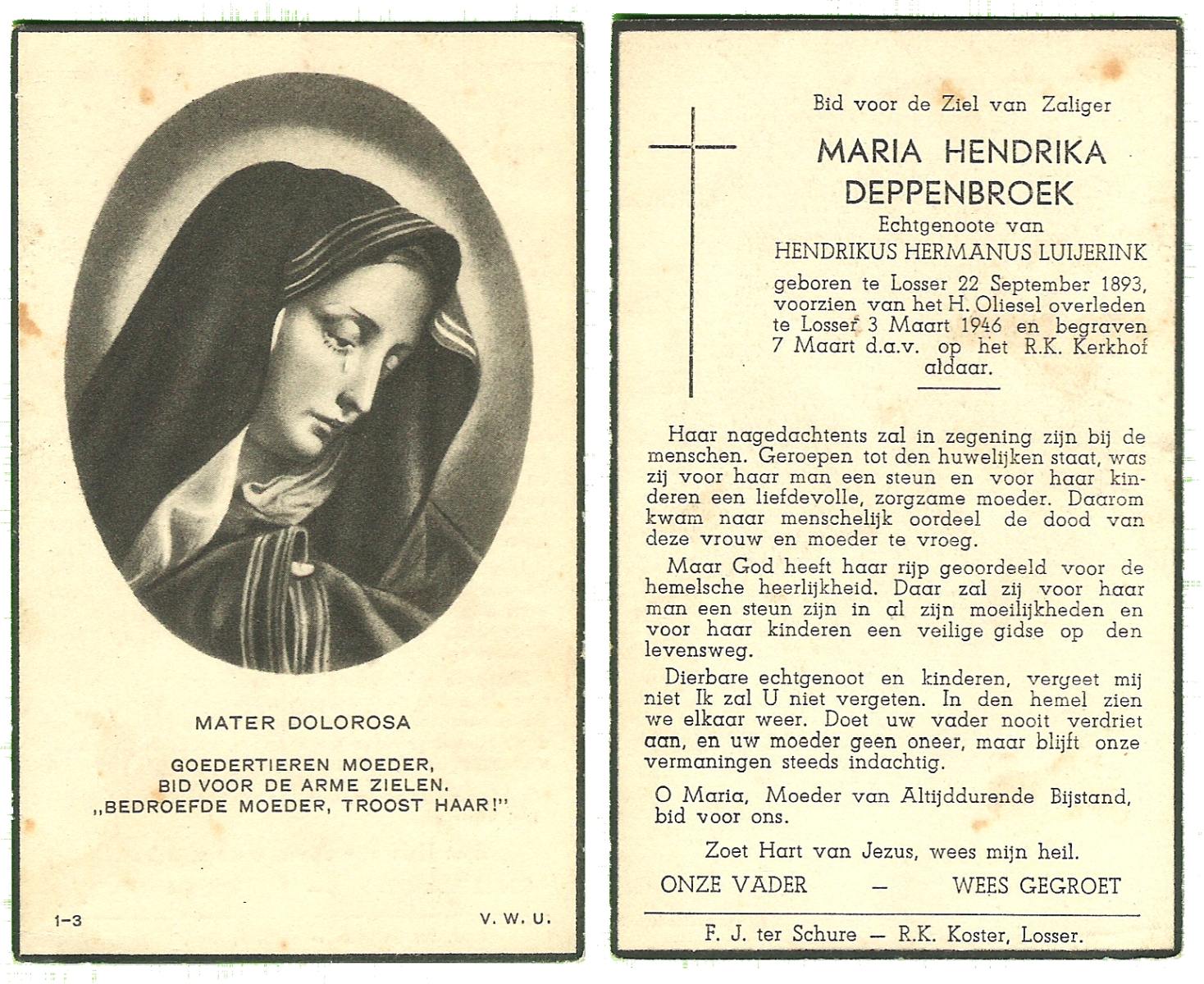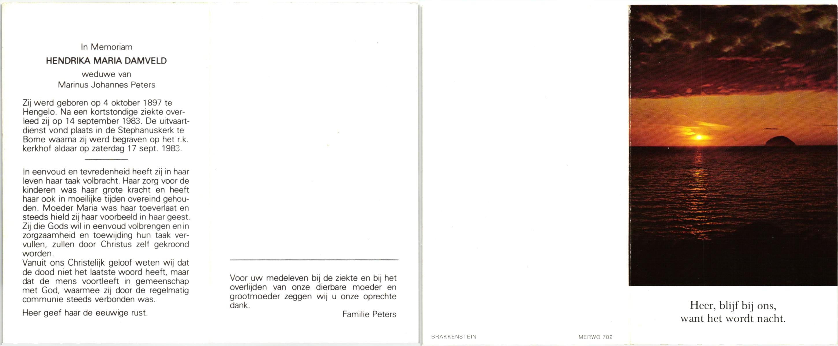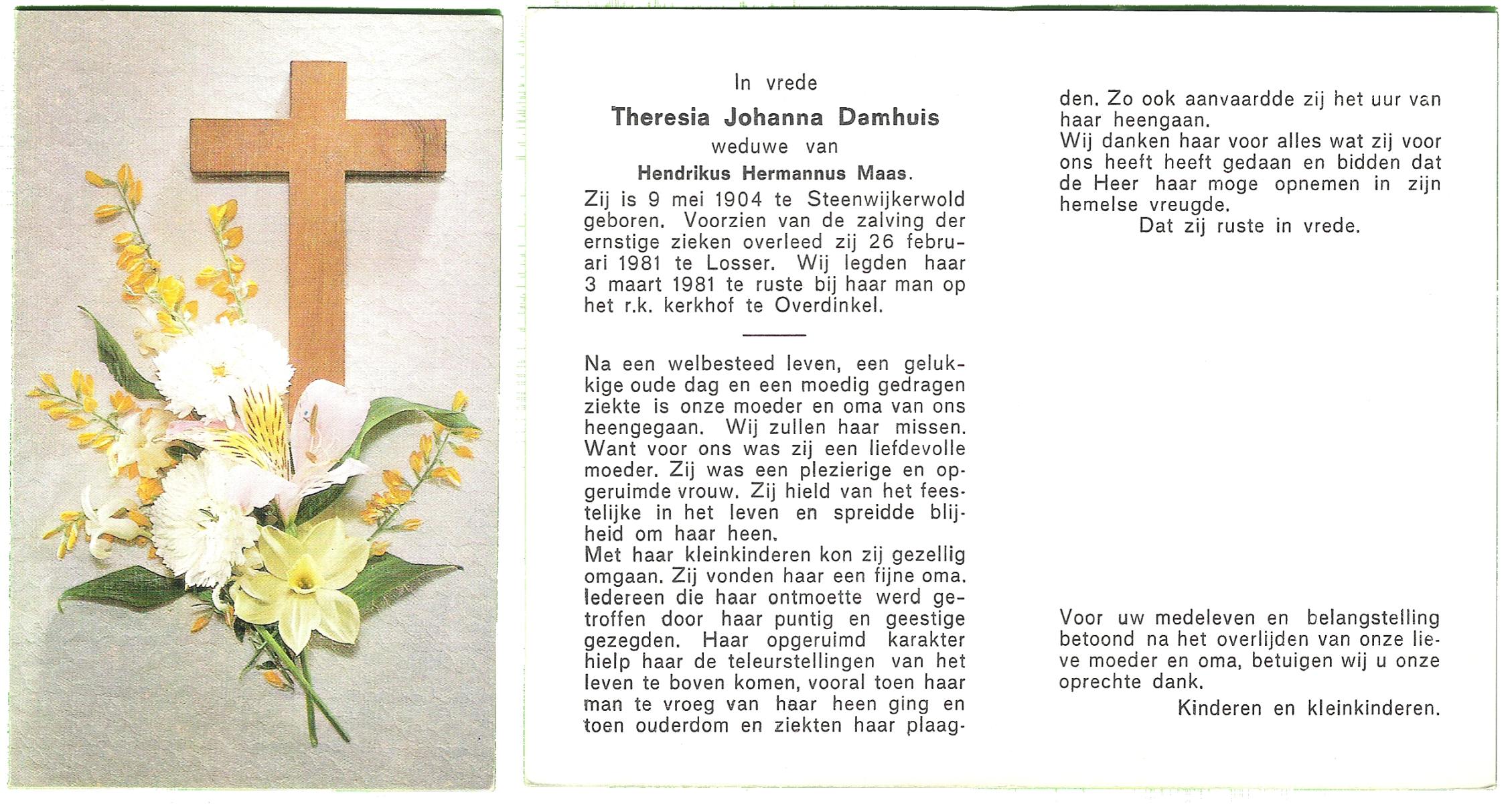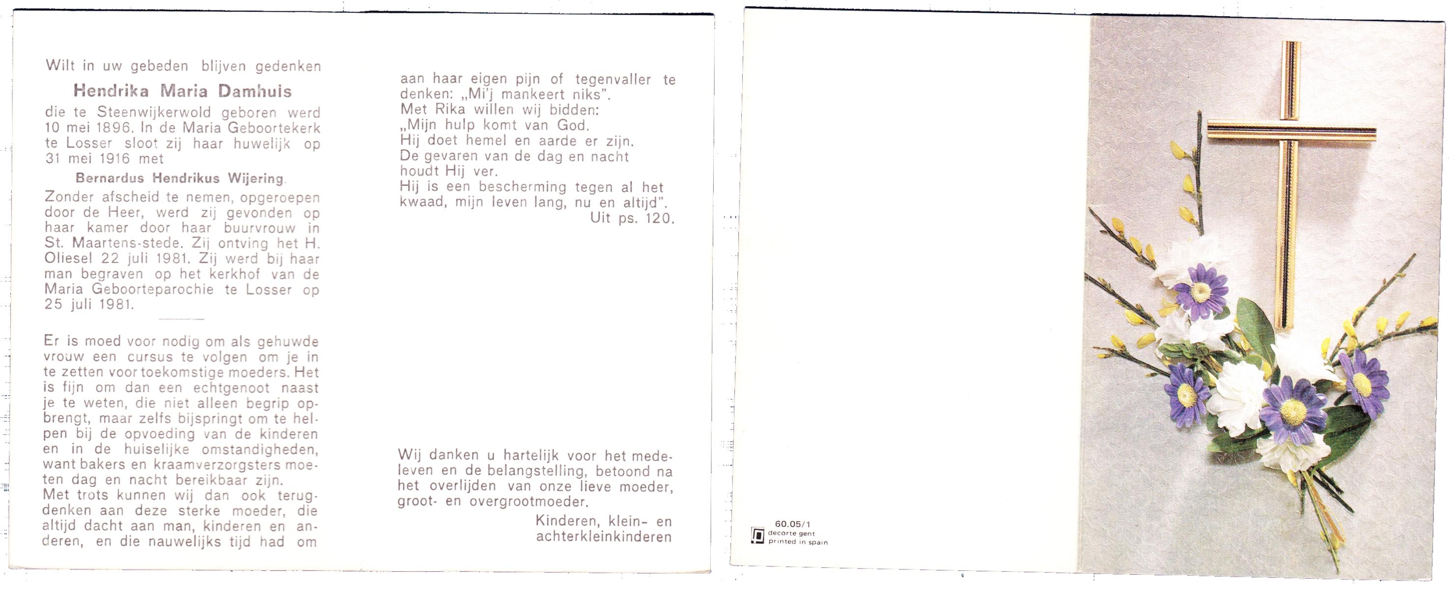 DAMHUIS, Hendrika Maria, geboren op 10-05-1896 te Steenwijkerwold, overleden op 22-7-1981 te Losser op 85-jarige leeftijd, begraven op 25-7-1981 te Losser.