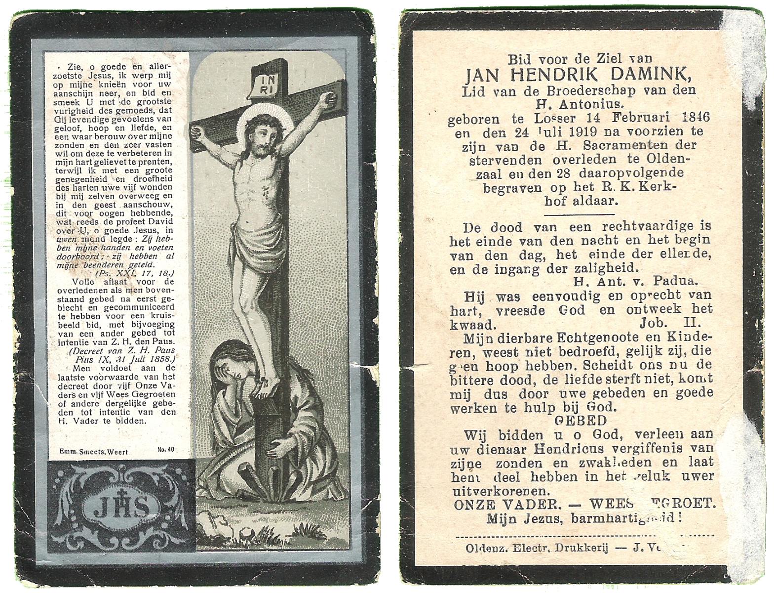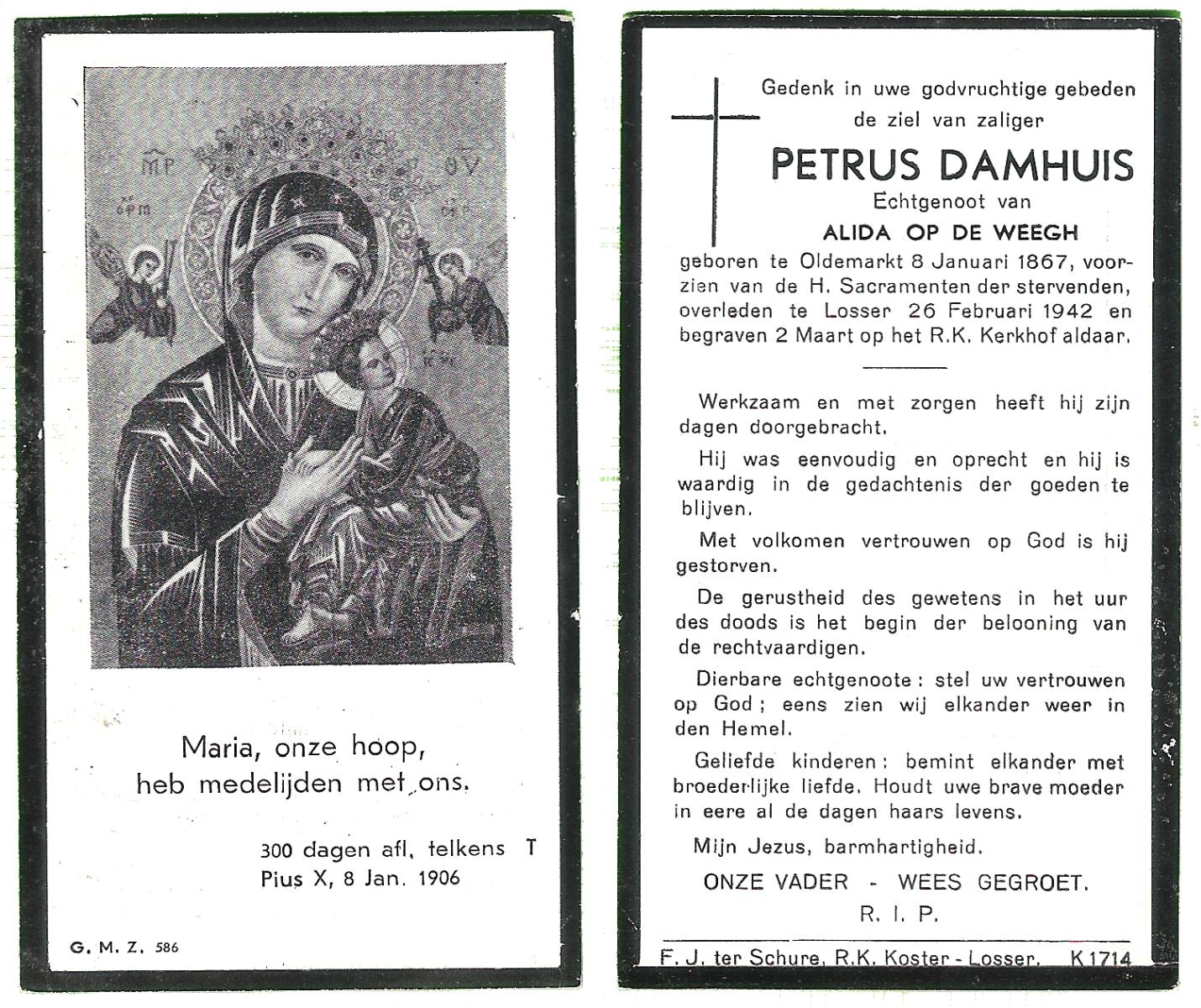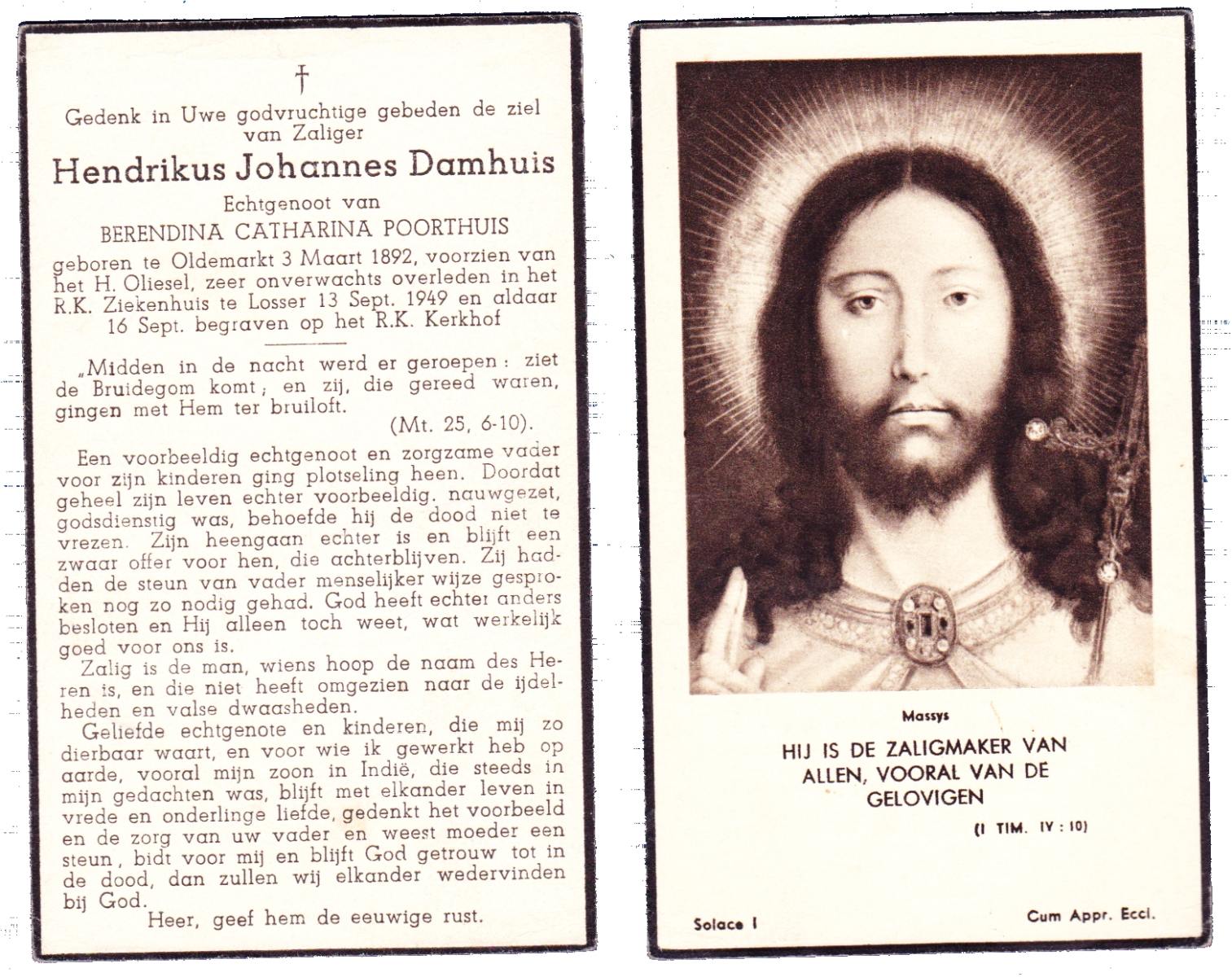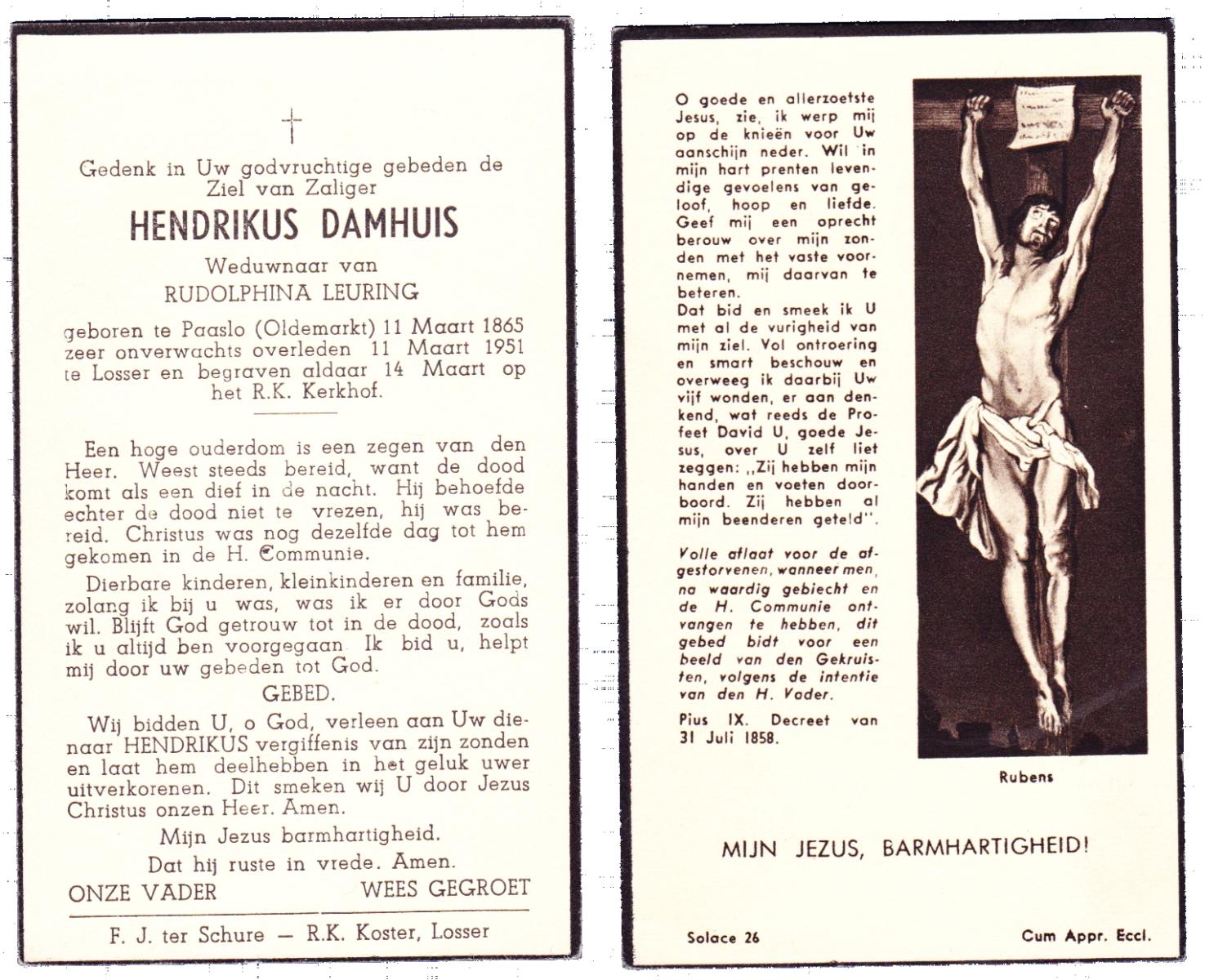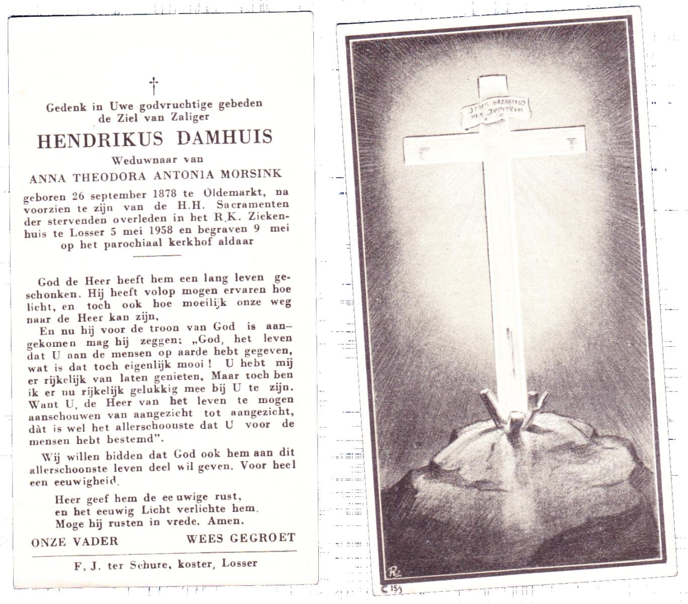 DAMHUIS, Hendrikus, geboren op 11-03-1865 te Paaslo, Oldemarkt, overleden op 11-3-1951 te Losser op 86-jarige leeftijd, begraven op 14-3-1951 te Losser.
