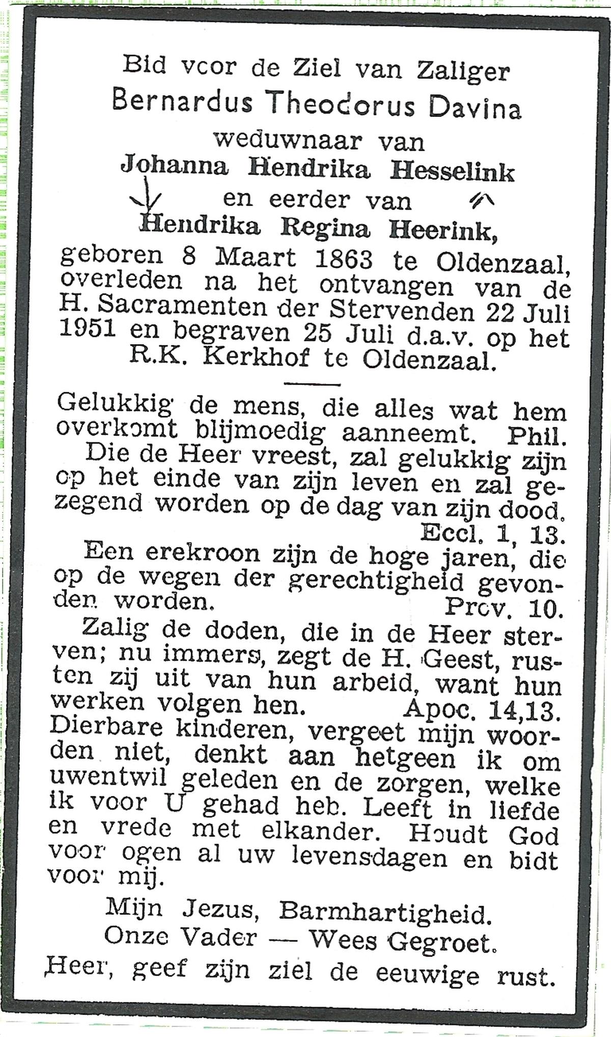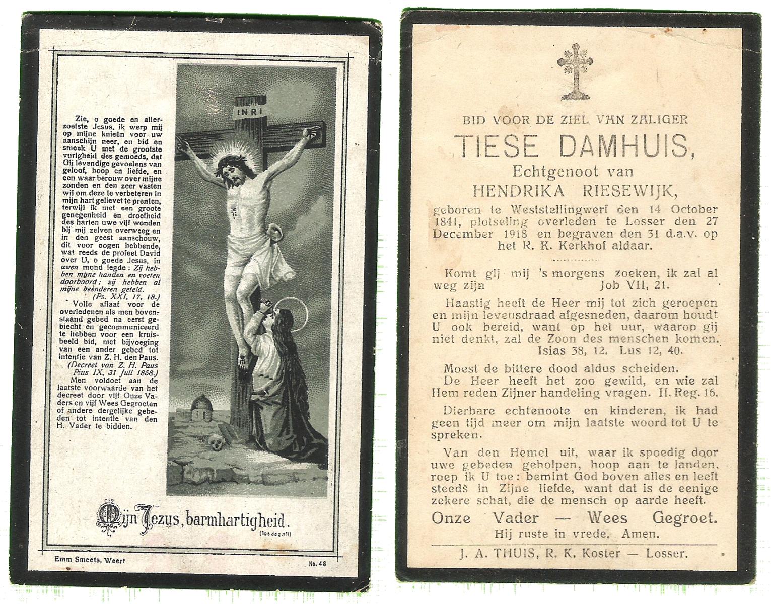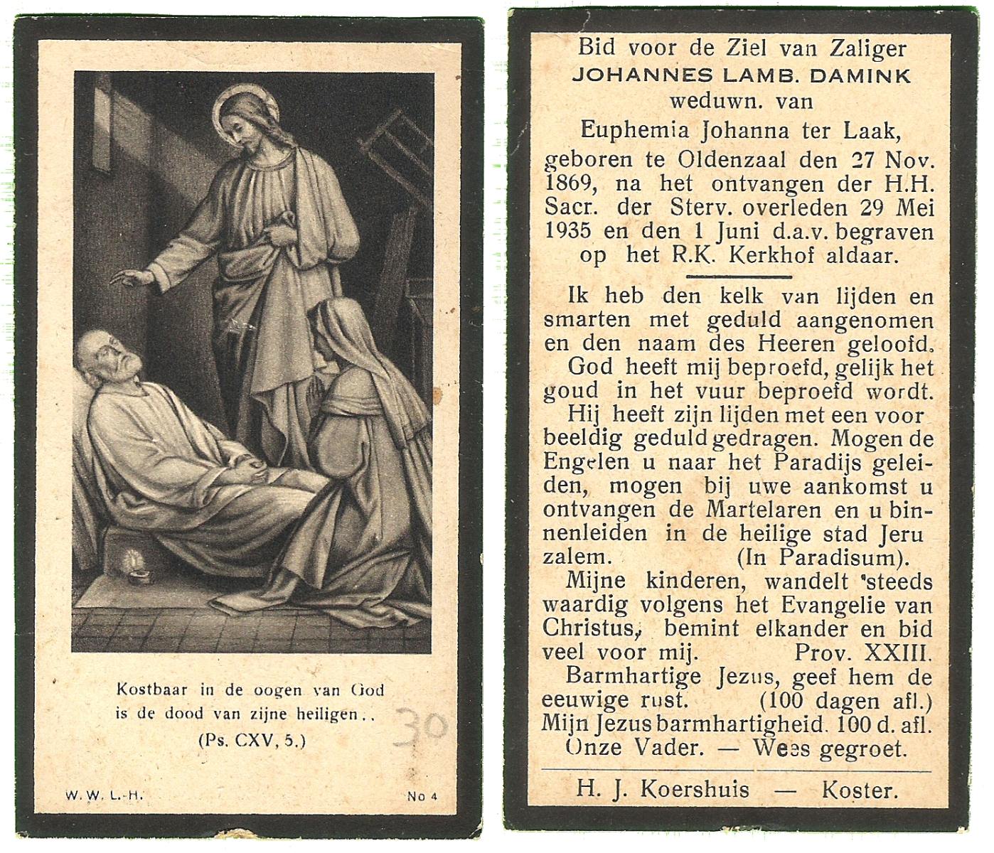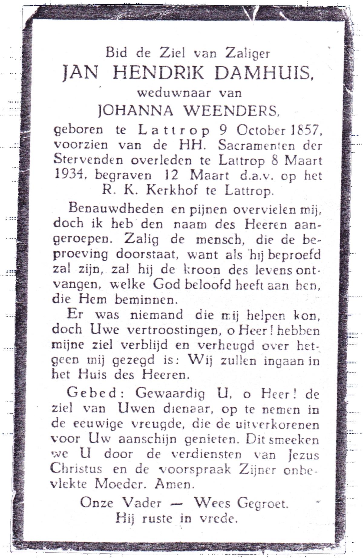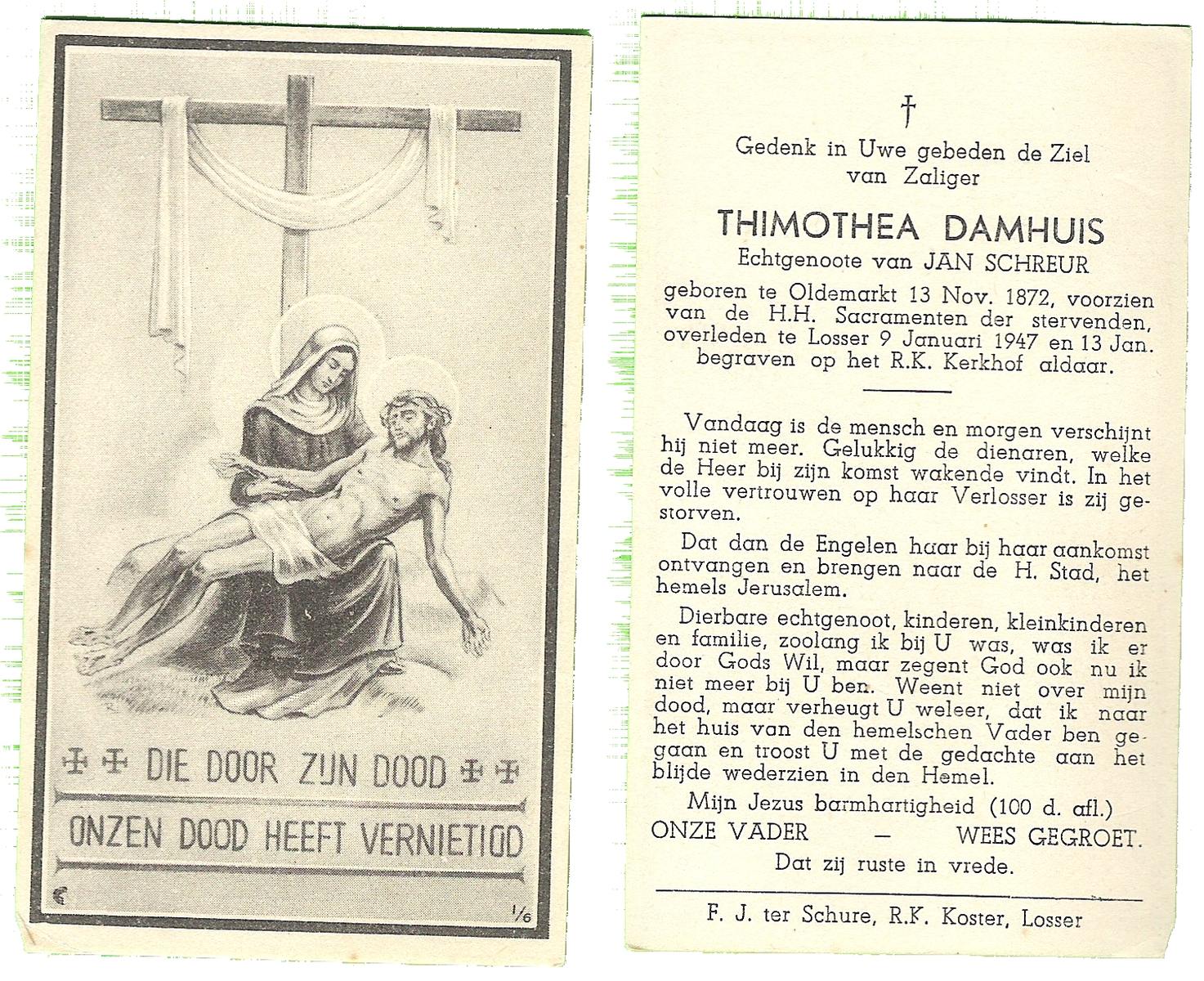 DAMHUIS, Hendrikus, geboren op 11-03-1865 te Paaslo, Oldemarkt, overleden op 11-3-1951 te Losser op 86-jarige leeftijd, begraven op 14-3-1951 te Losser.