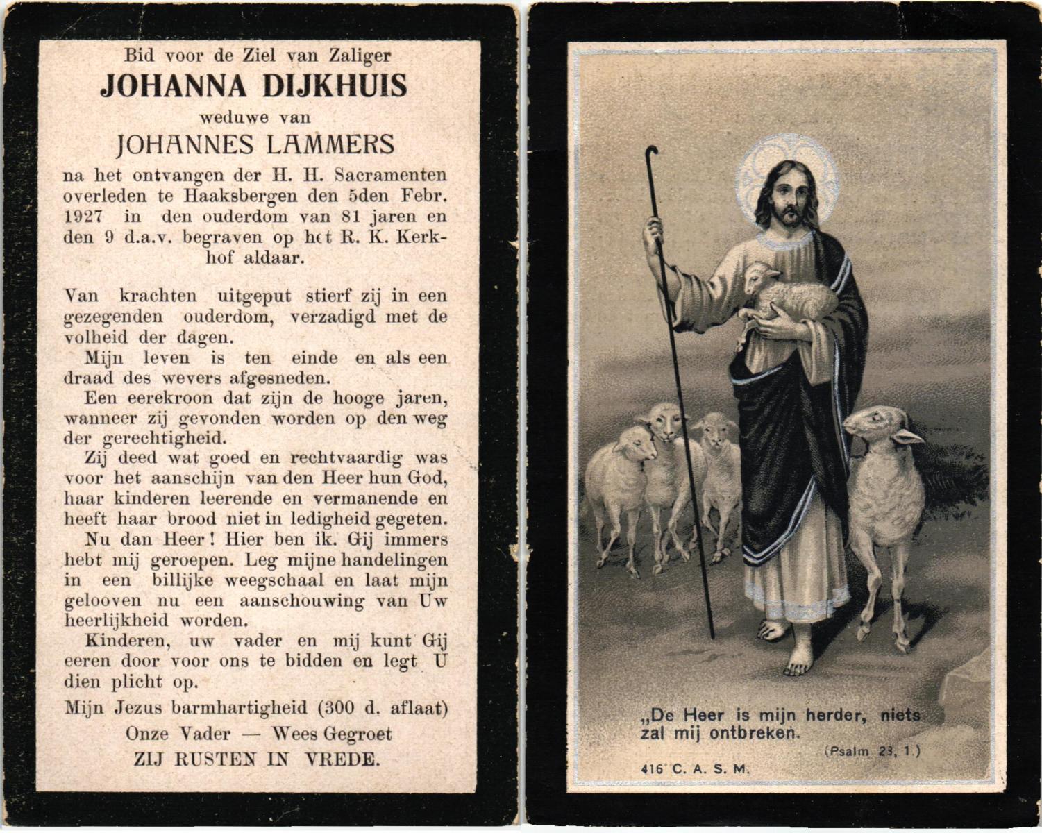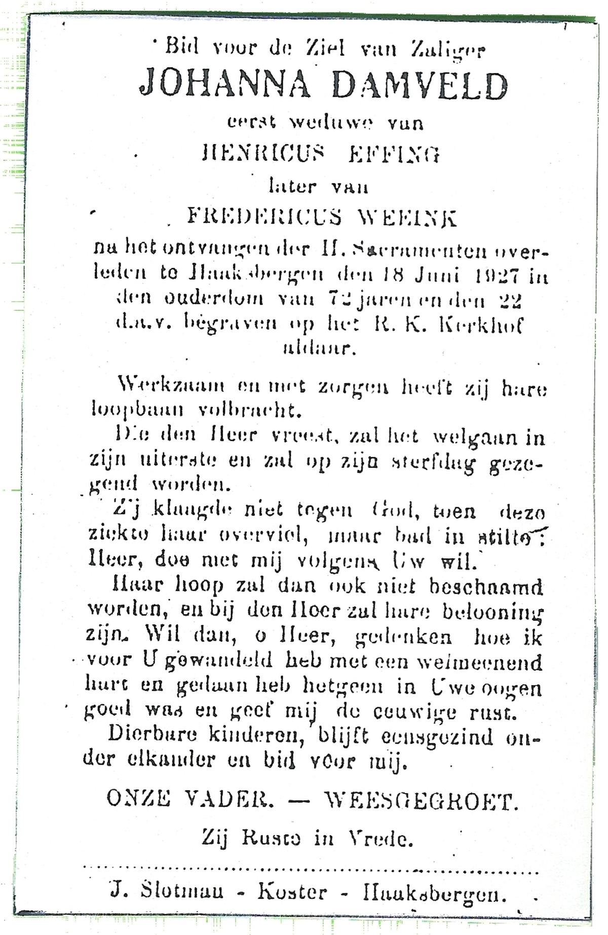 DIJKHUIS, Johanna, overleden op 5-2-1927 te Haaksbergen op 81-jarige leeftijd, begraven op 9-2-1927 te Haaksbergen.