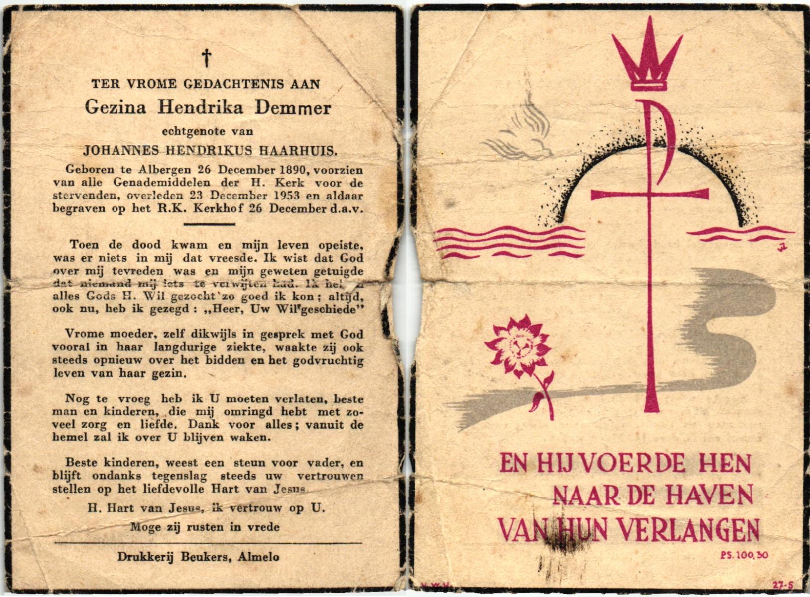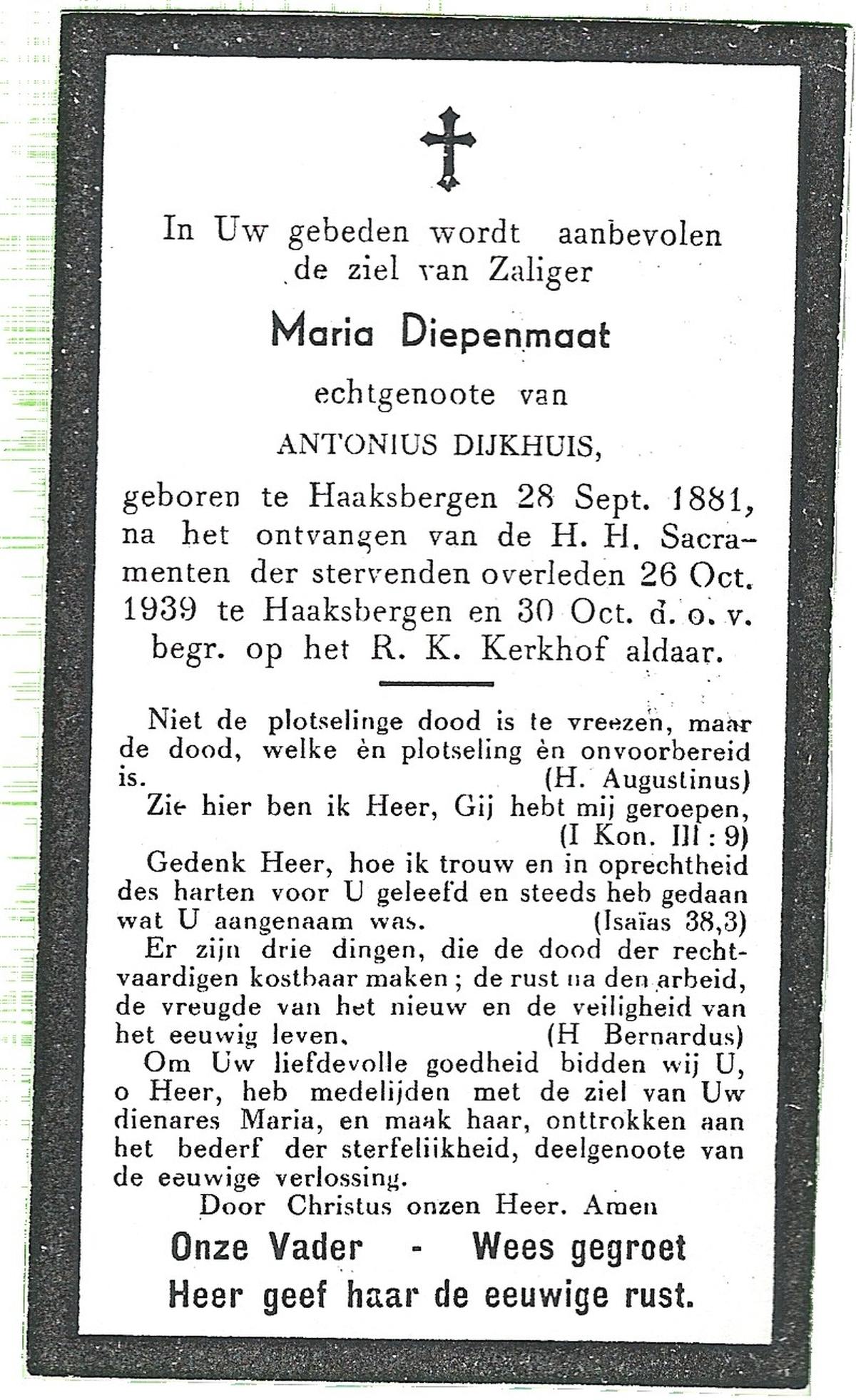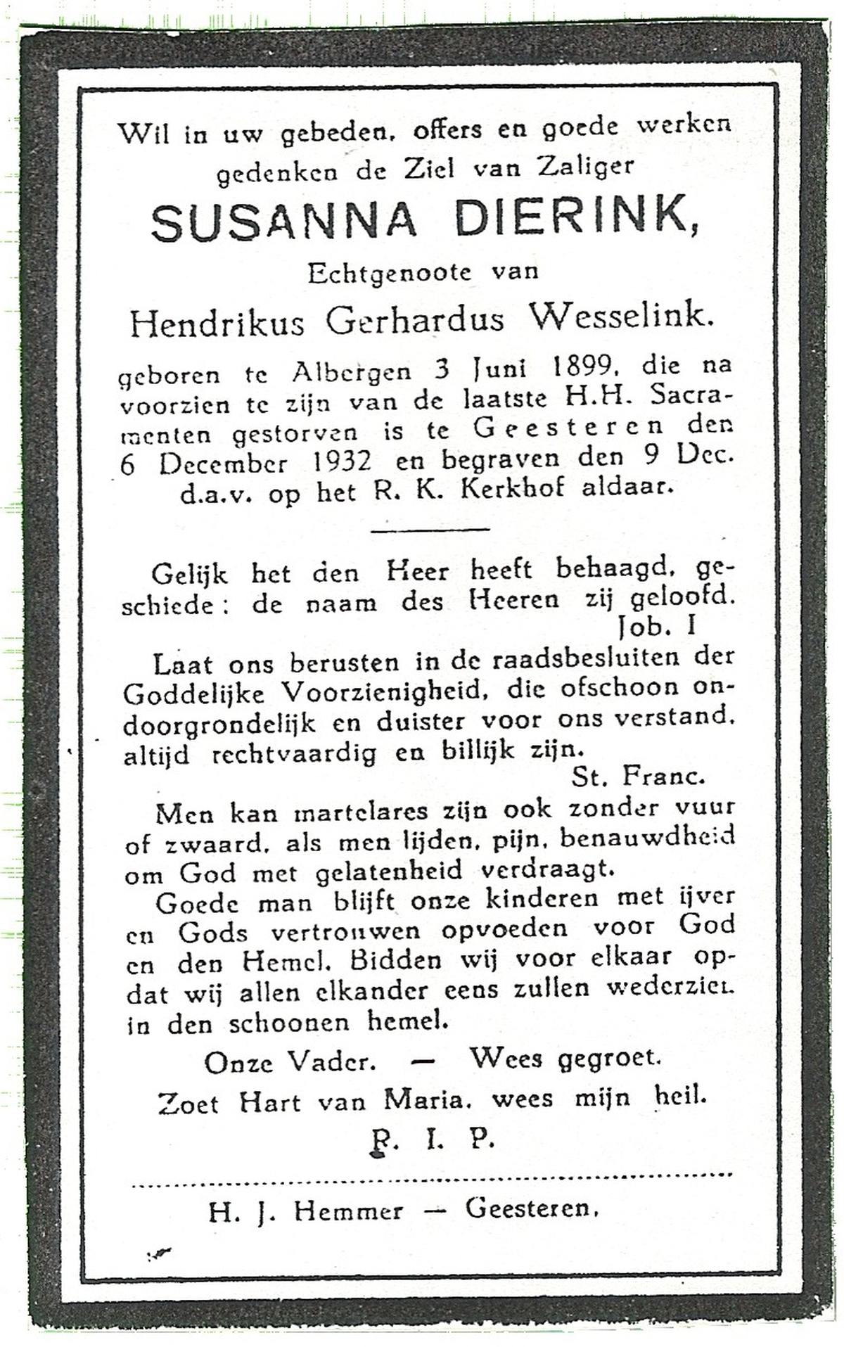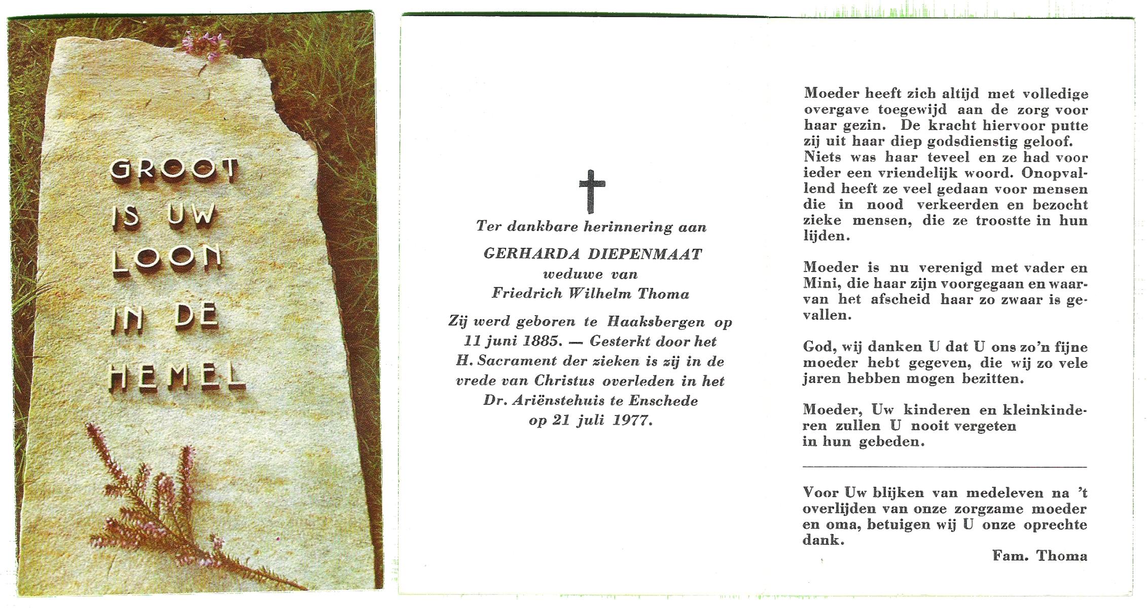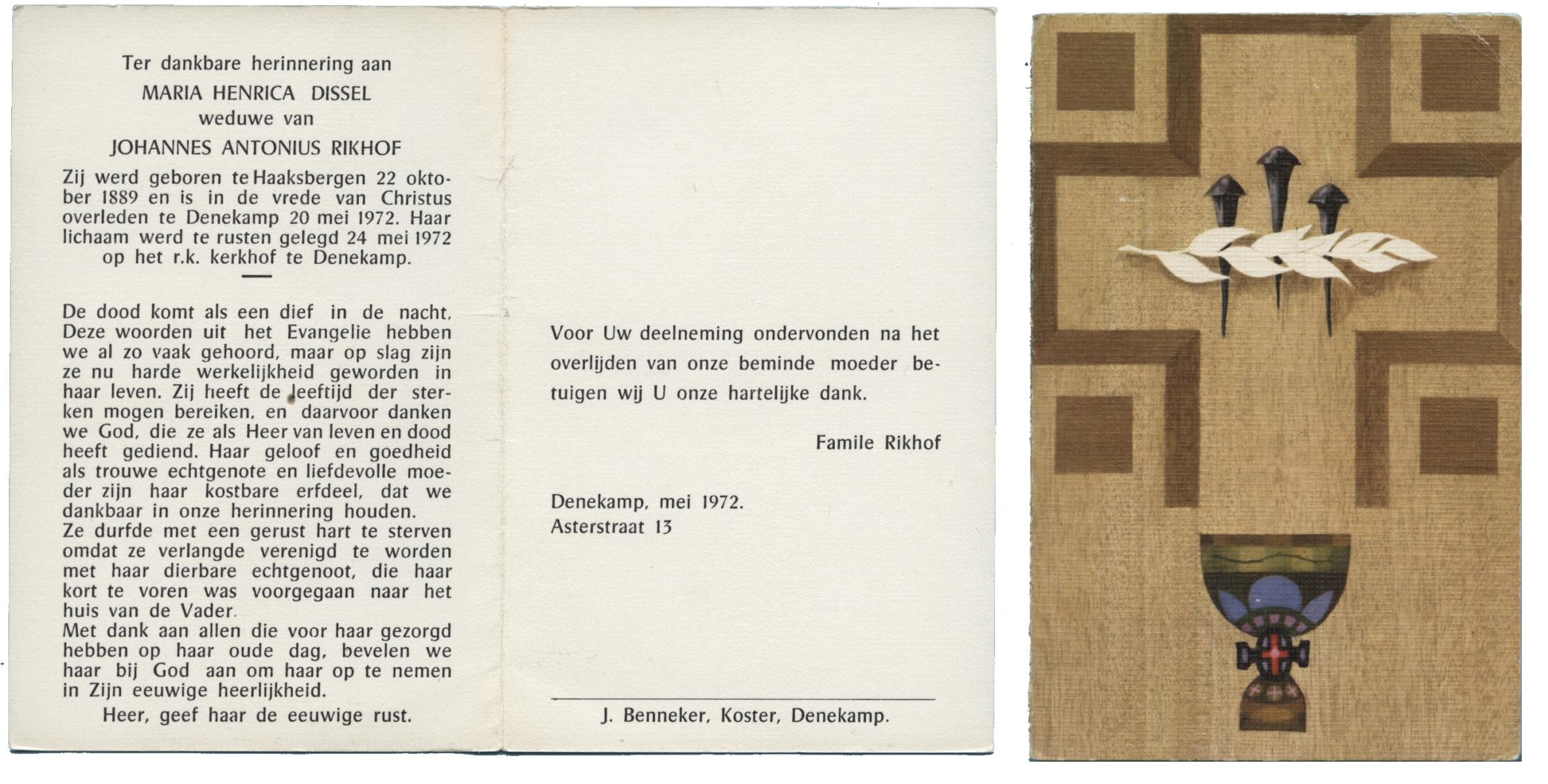 DISSEL, Maria Henrica, geboren op 22-10-1889 te Haaksbergen, overleden op 20-5-1972 te Denekamp op 82-jarige leeftijd, begraven op 24-5-1972 te Denekamp.