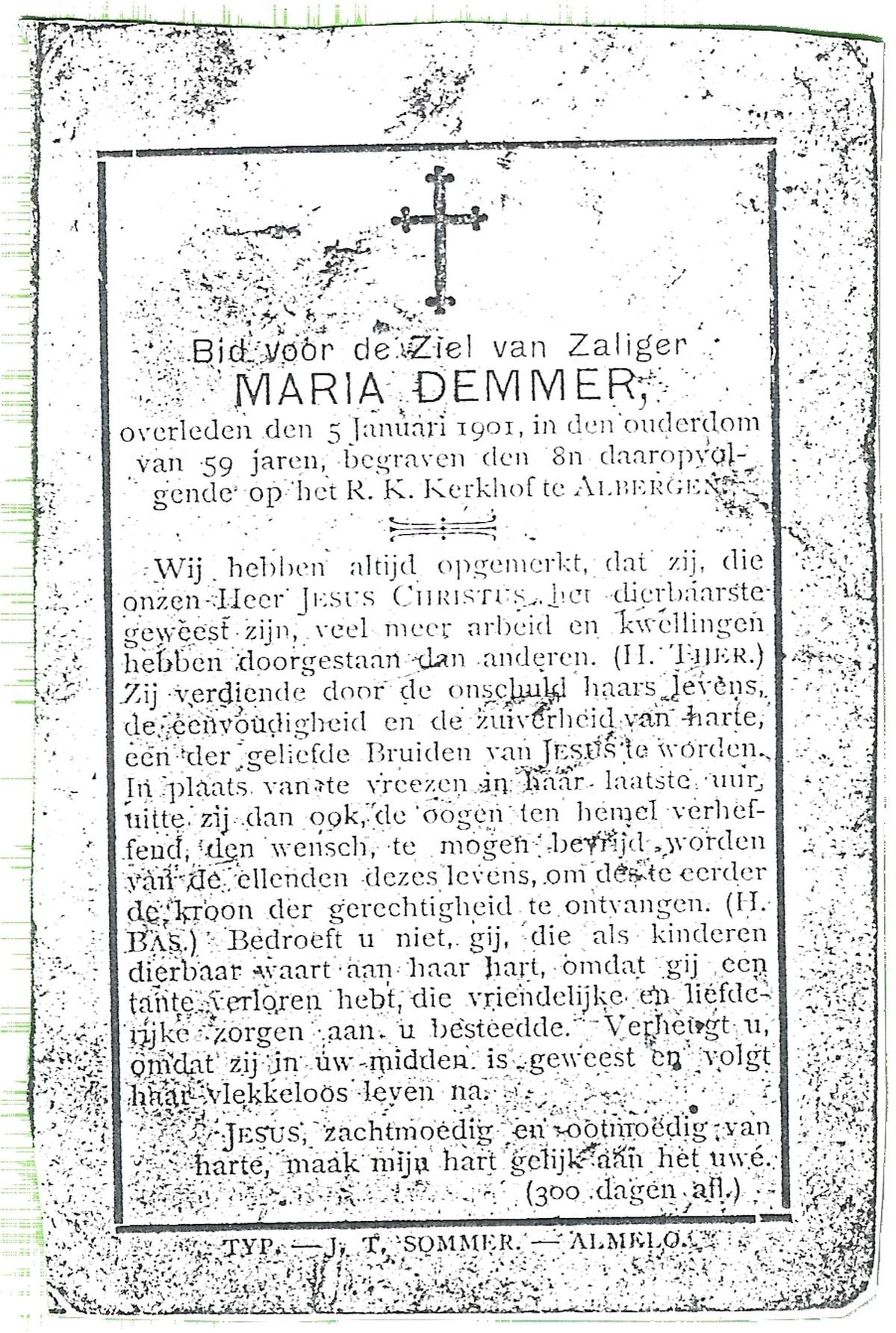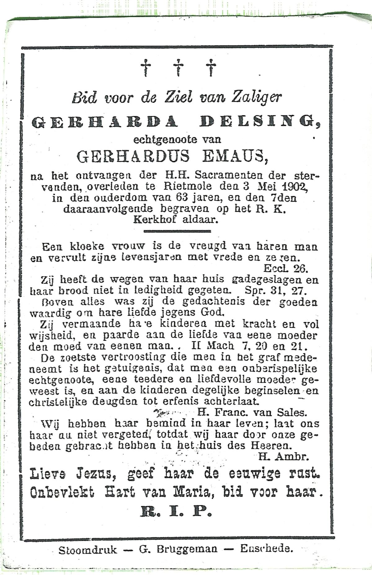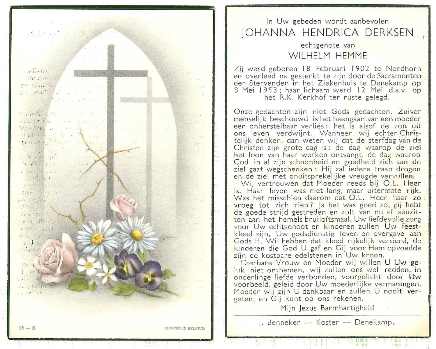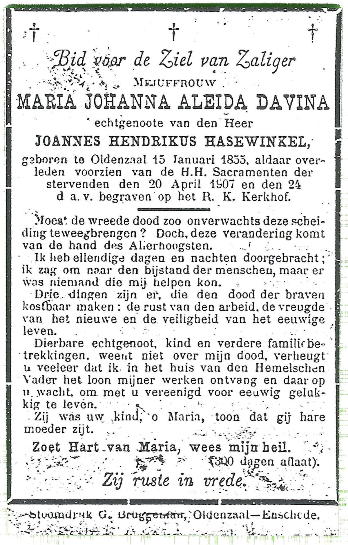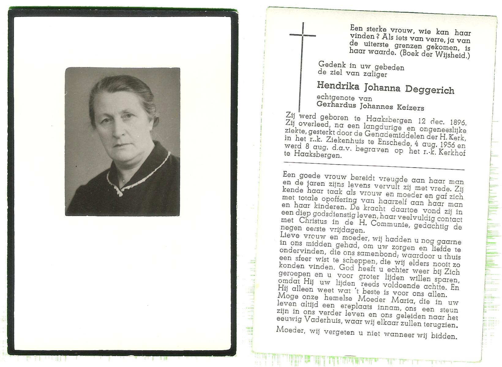 DISSEL, Maria Henrica, geboren op 22-10-1889 te Haaksbergen, overleden op 20-5-1972 te Denekamp op 82-jarige leeftijd, begraven op 24-5-1972 te Denekamp.