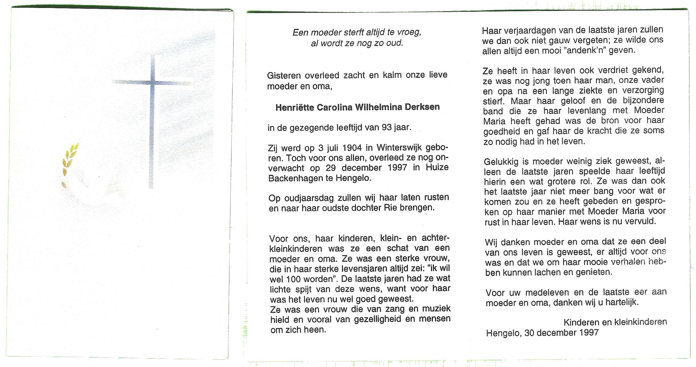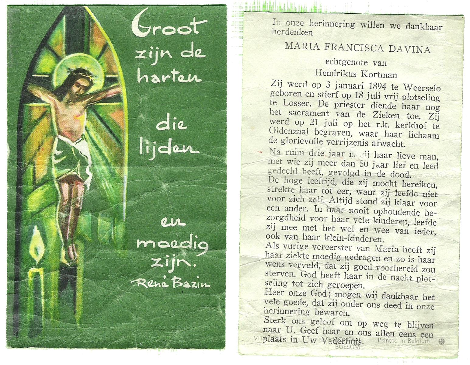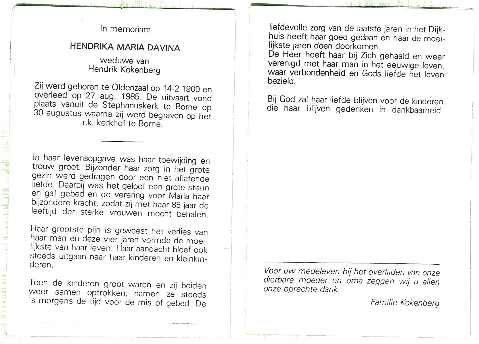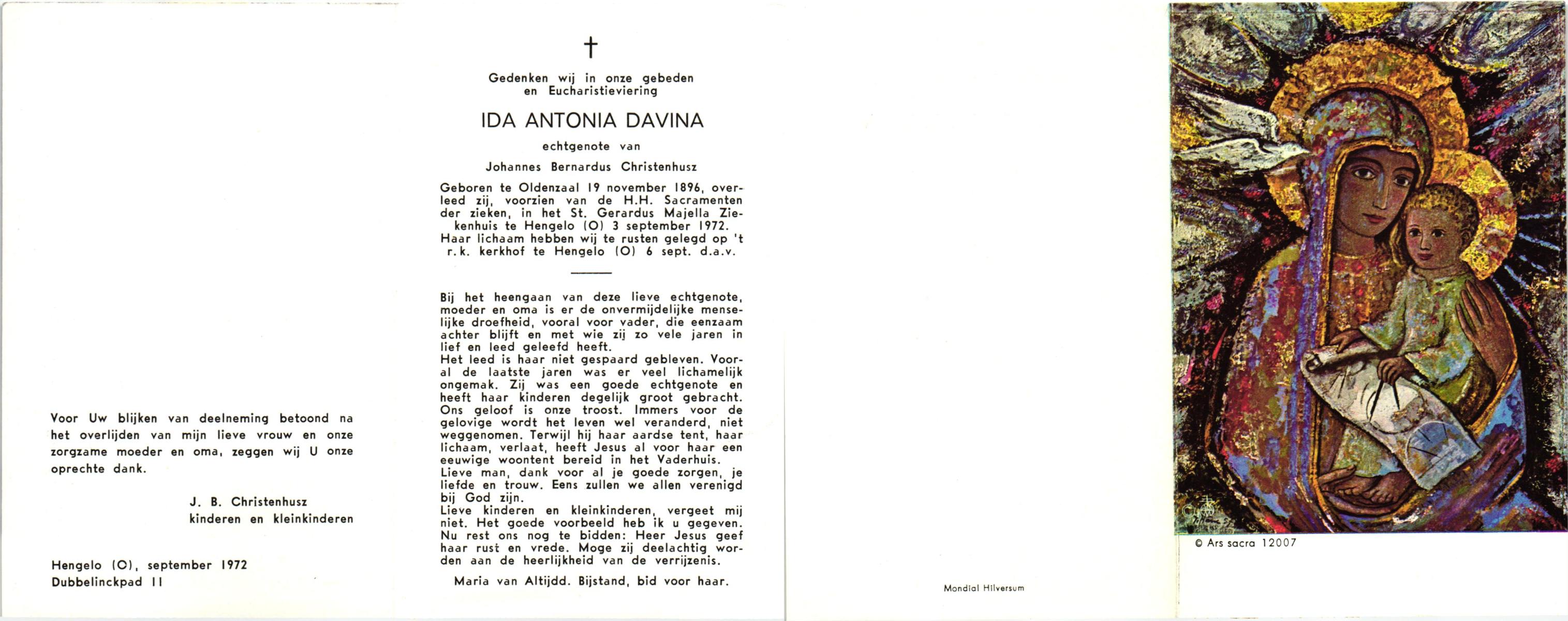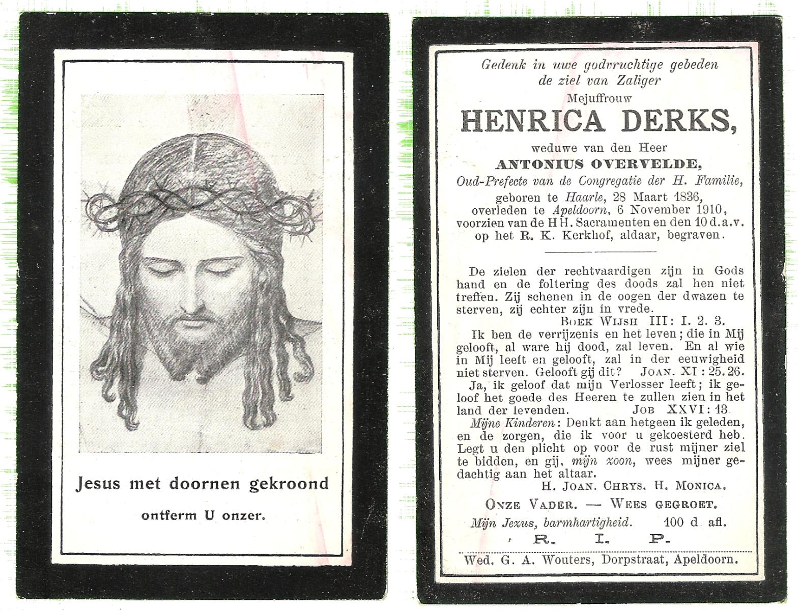 DISSEL, Maria Henrica, geboren op 22-10-1889 te Haaksbergen, overleden op 20-5-1972 te Denekamp op 82-jarige leeftijd, begraven op 24-5-1972 te Denekamp.