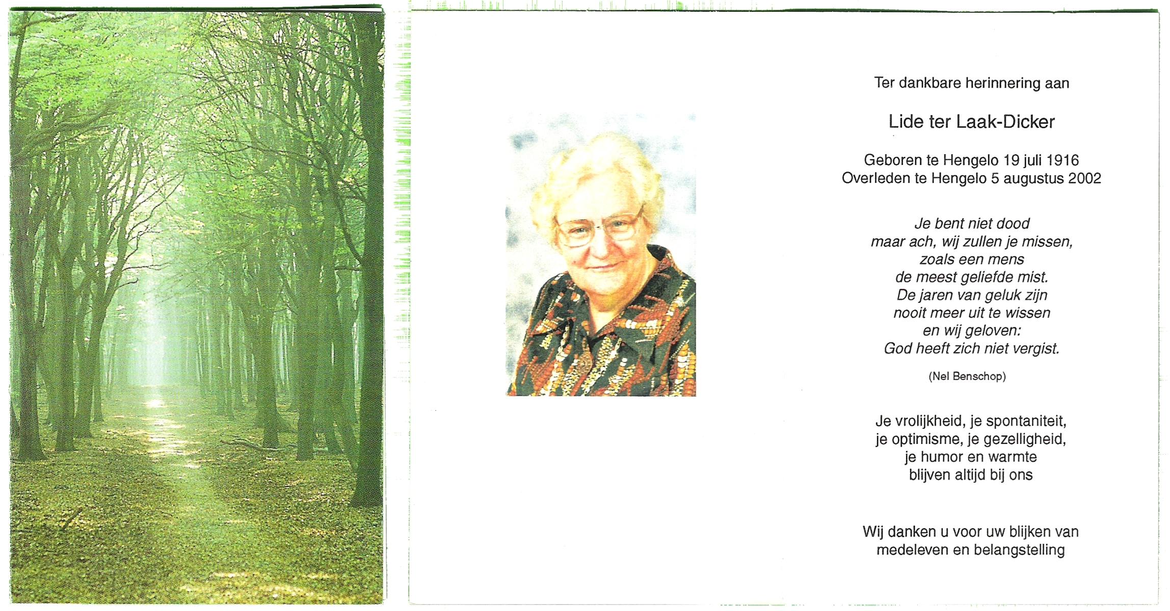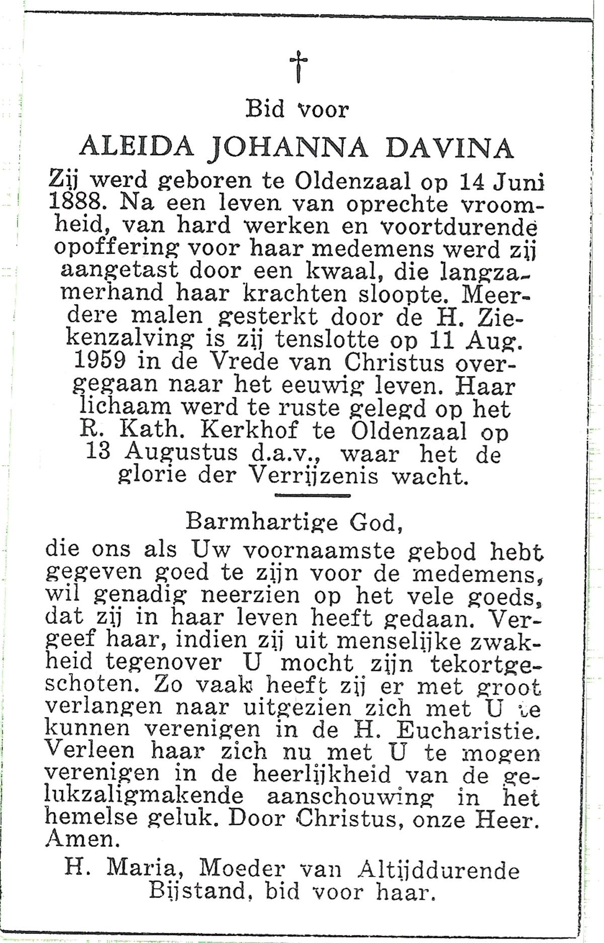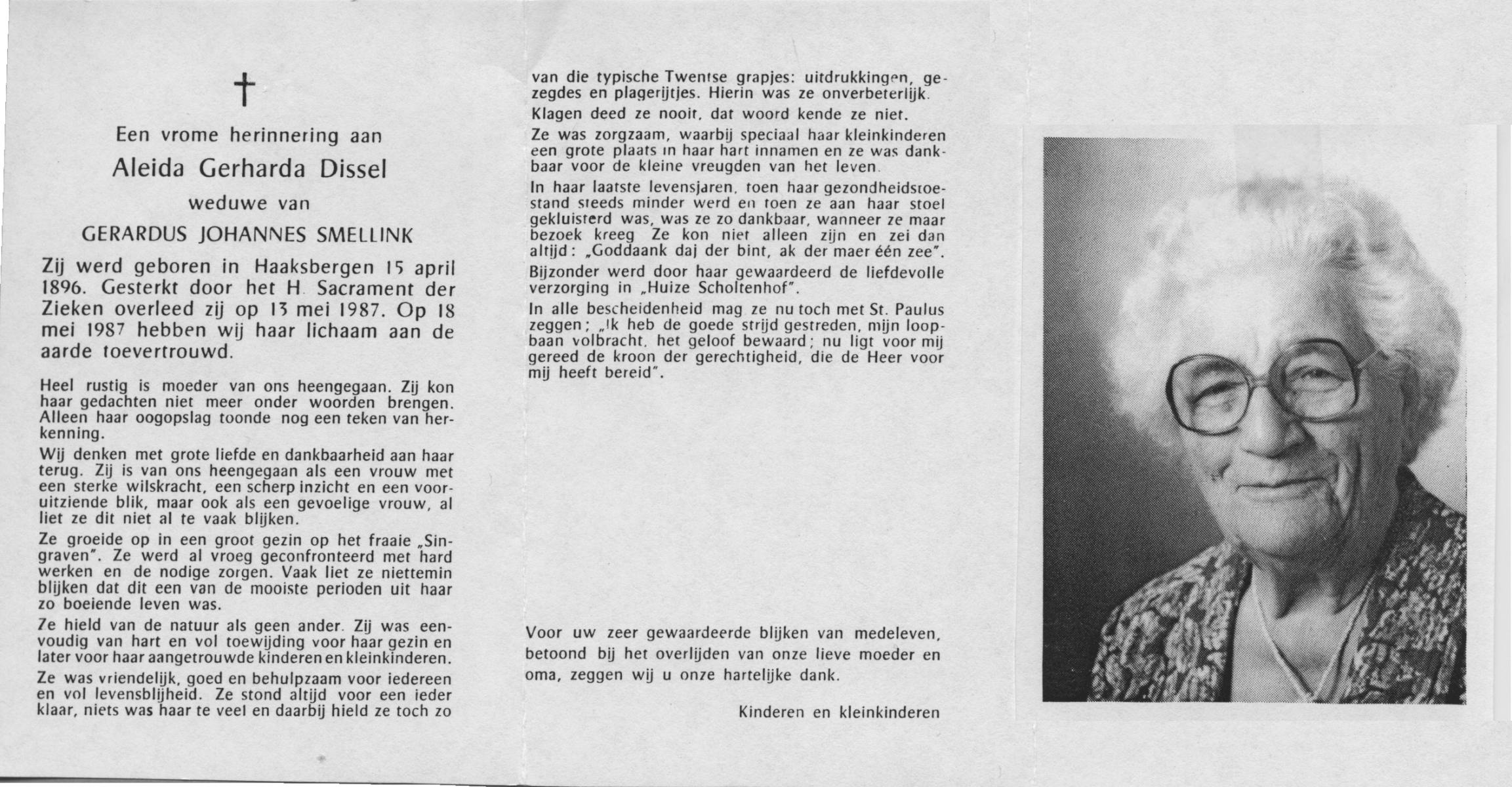 DISSEL, Aleida Gerharda, geboren op 15-04-1896 te Haaksbergen, overleden op 13-5-1987 op 91-jarige leeftijd, begraven op 18-5-1987.