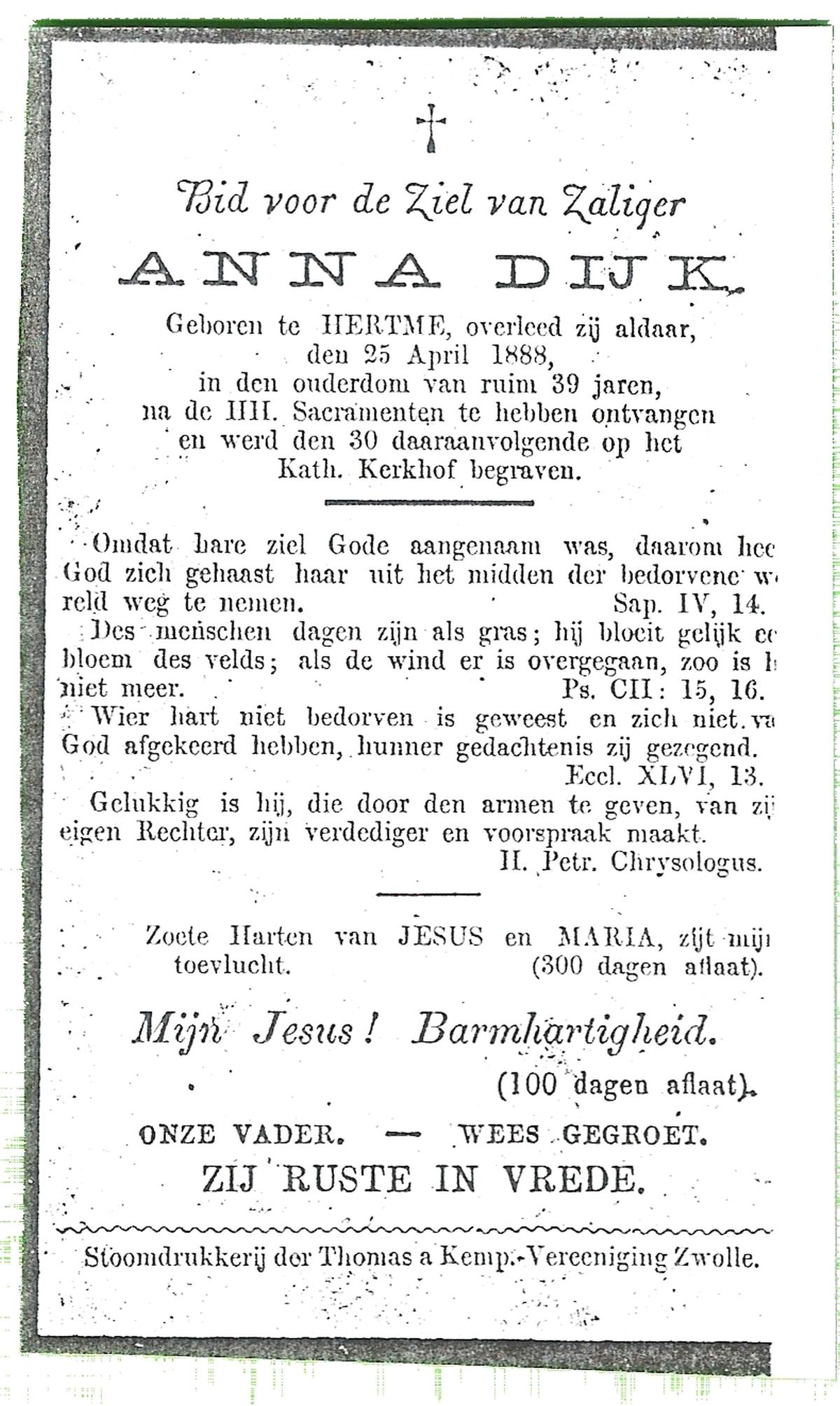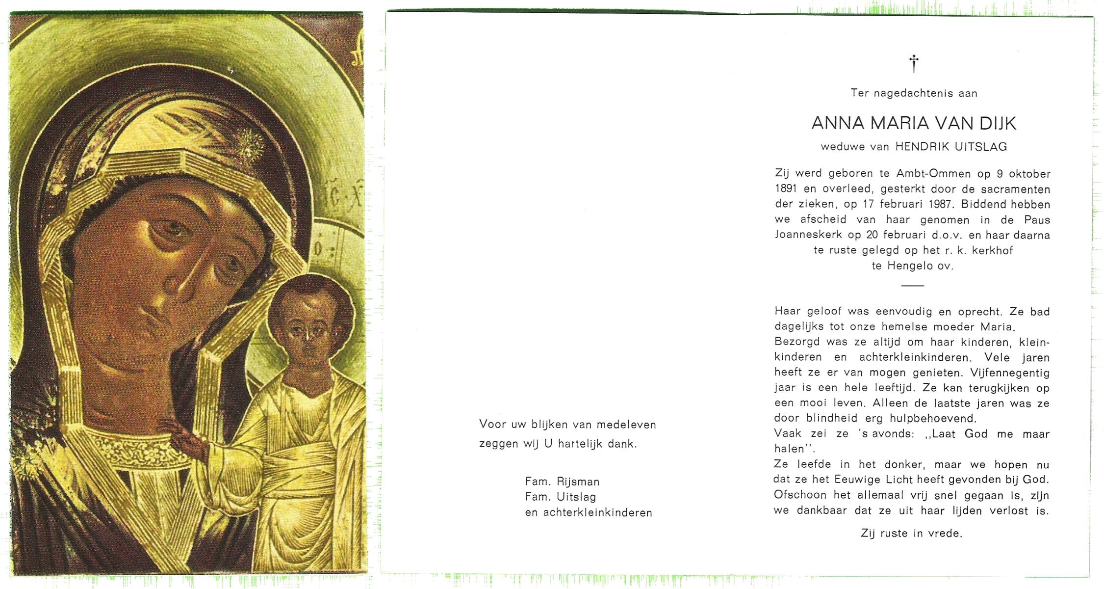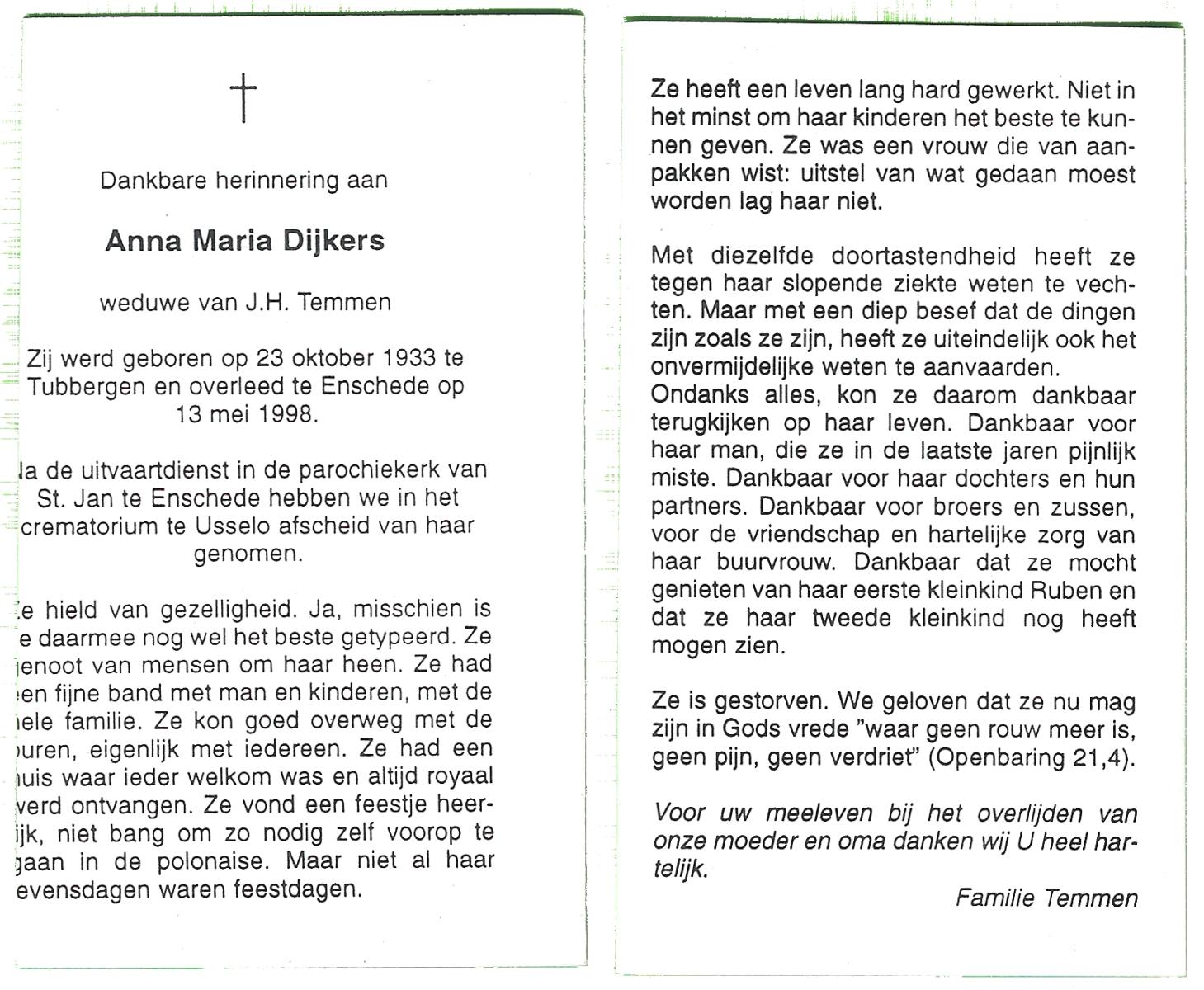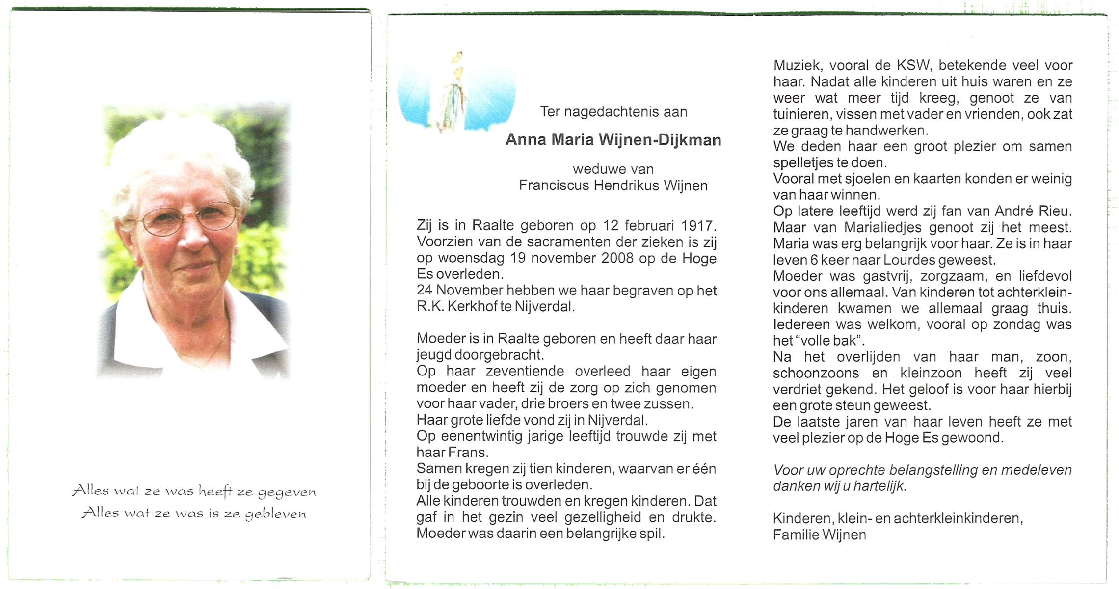 DIJKMAN, Anna Maria, geboren op 12-2-1917 te Raalte, overleden op 19-11-2008 te Hellendoorn, Nijverdal, Hoge Es op 91-jarige leeftijd, begraven op 24-11-2008 te Hellendoorn, Nijverdal.