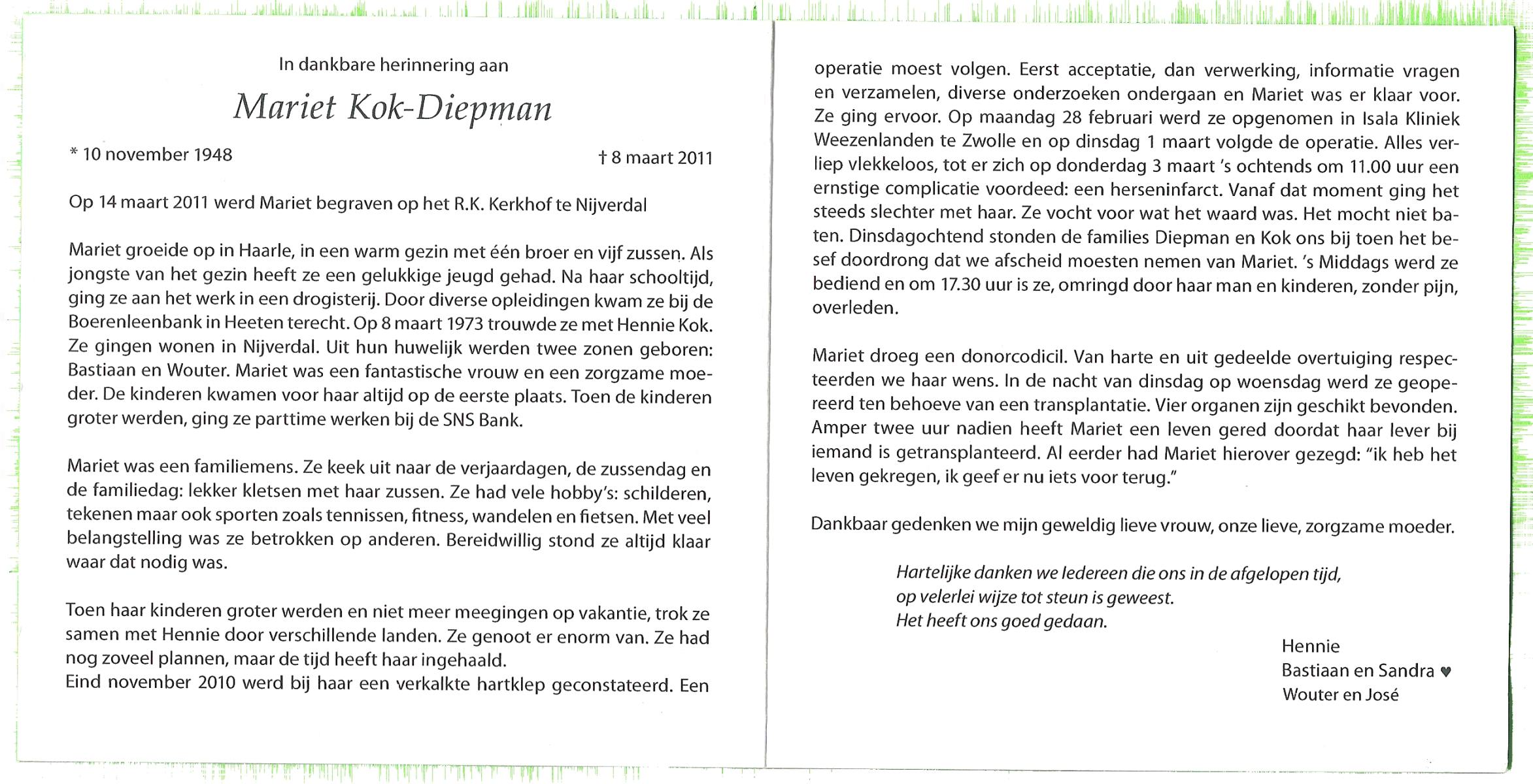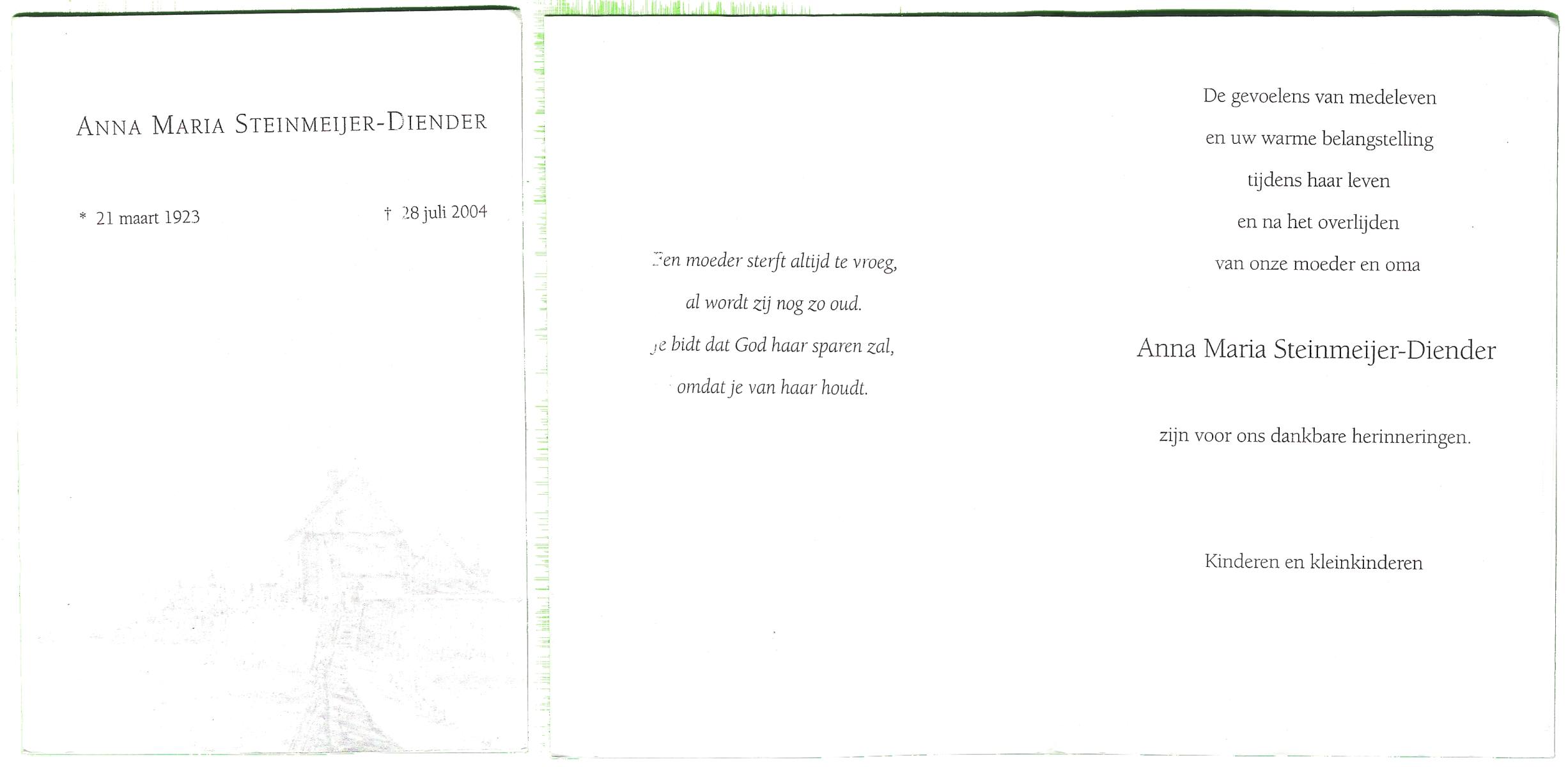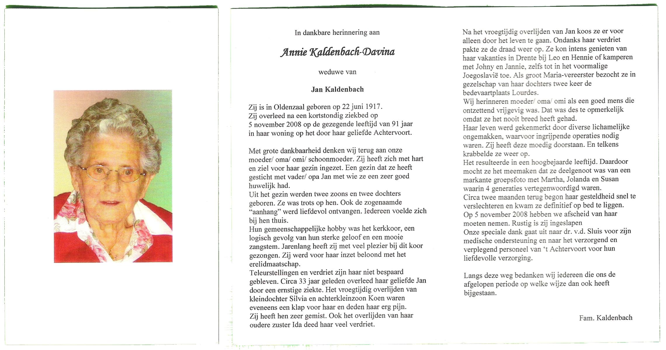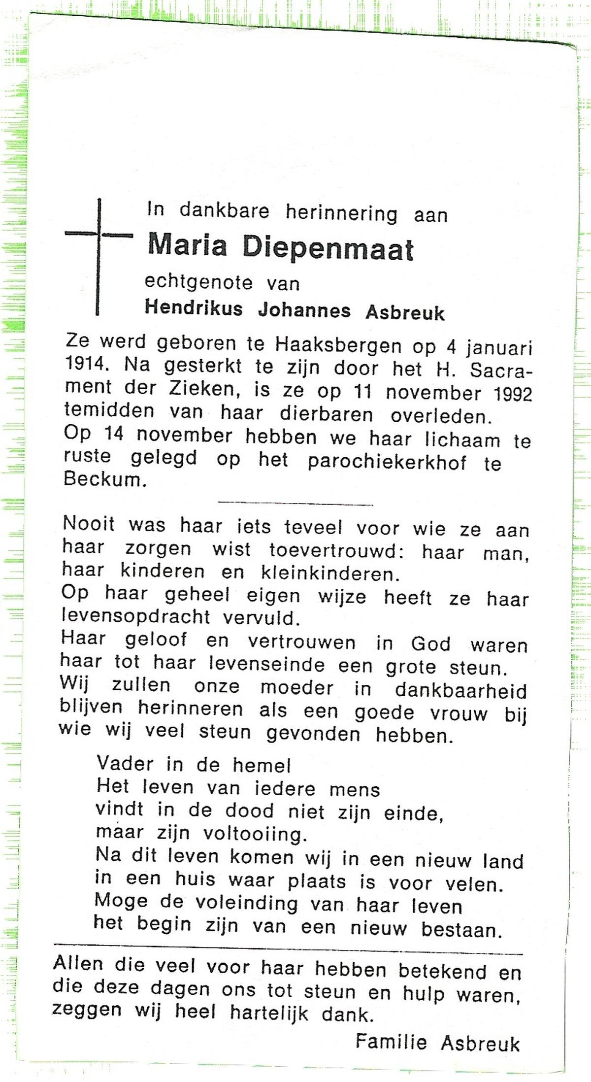 DIJKMAN, Anna Maria, geboren op 12-2-1917 te Raalte, overleden op 19-11-2008 te Hellendoorn, Nijverdal, Hoge Es op 91-jarige leeftijd, begraven op 24-11-2008 te Hellendoorn, Nijverdal.