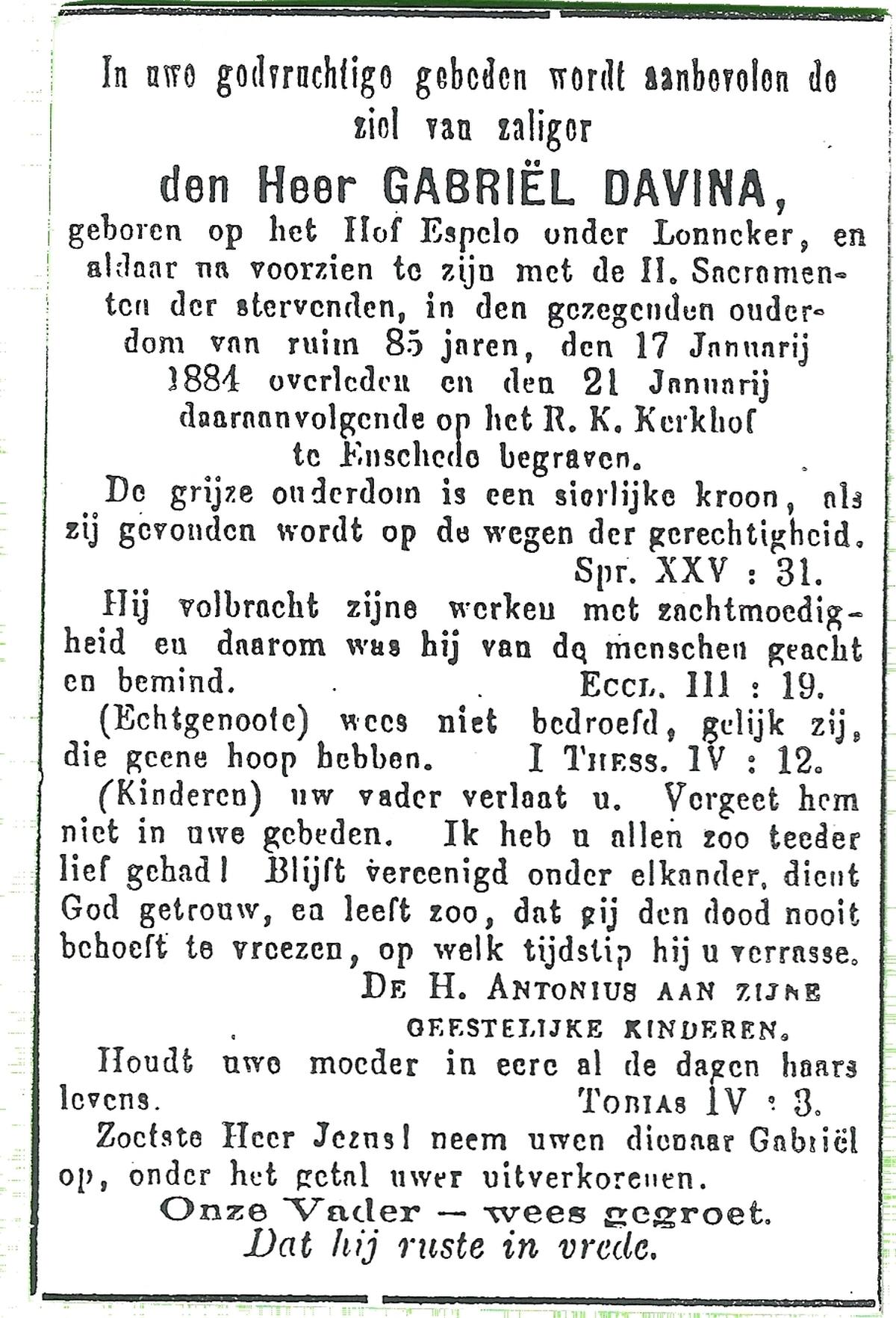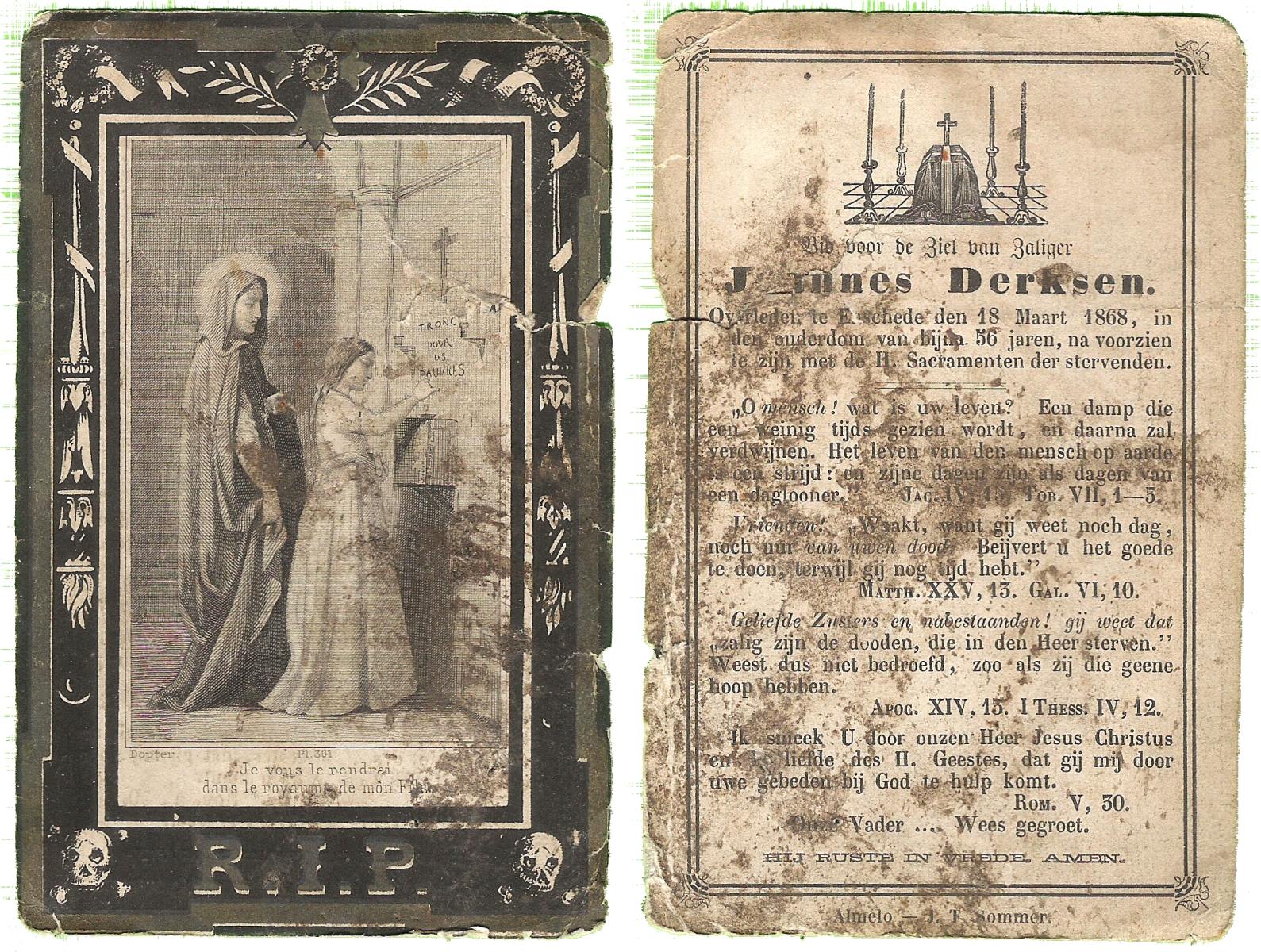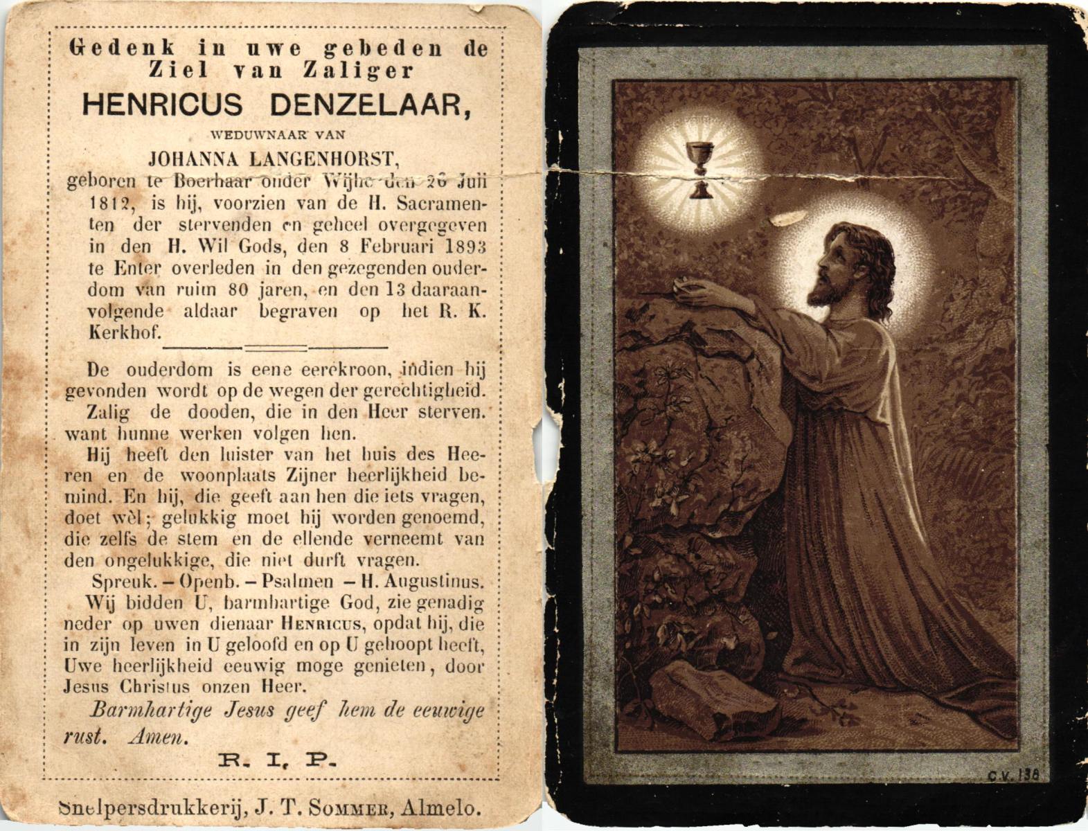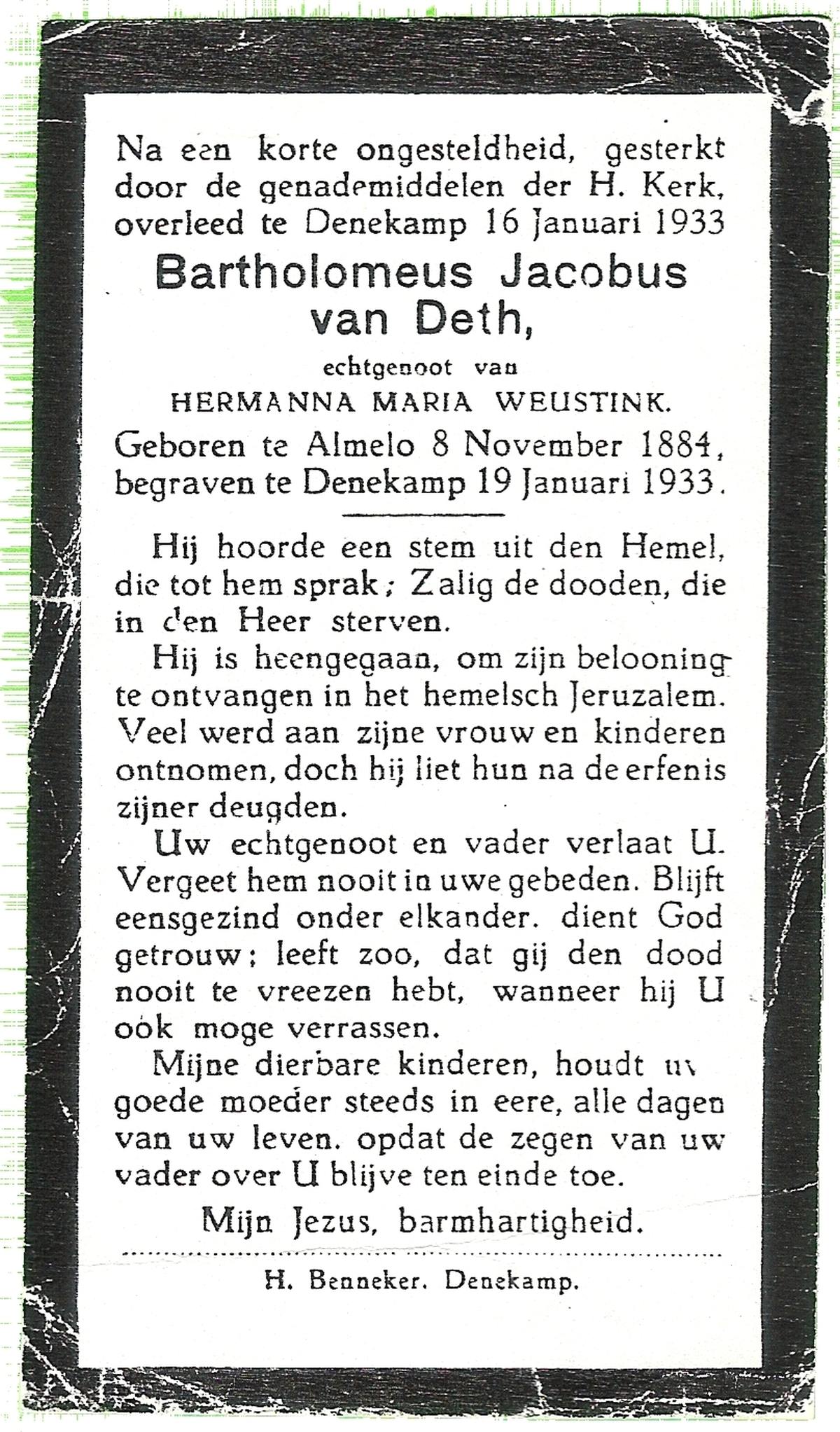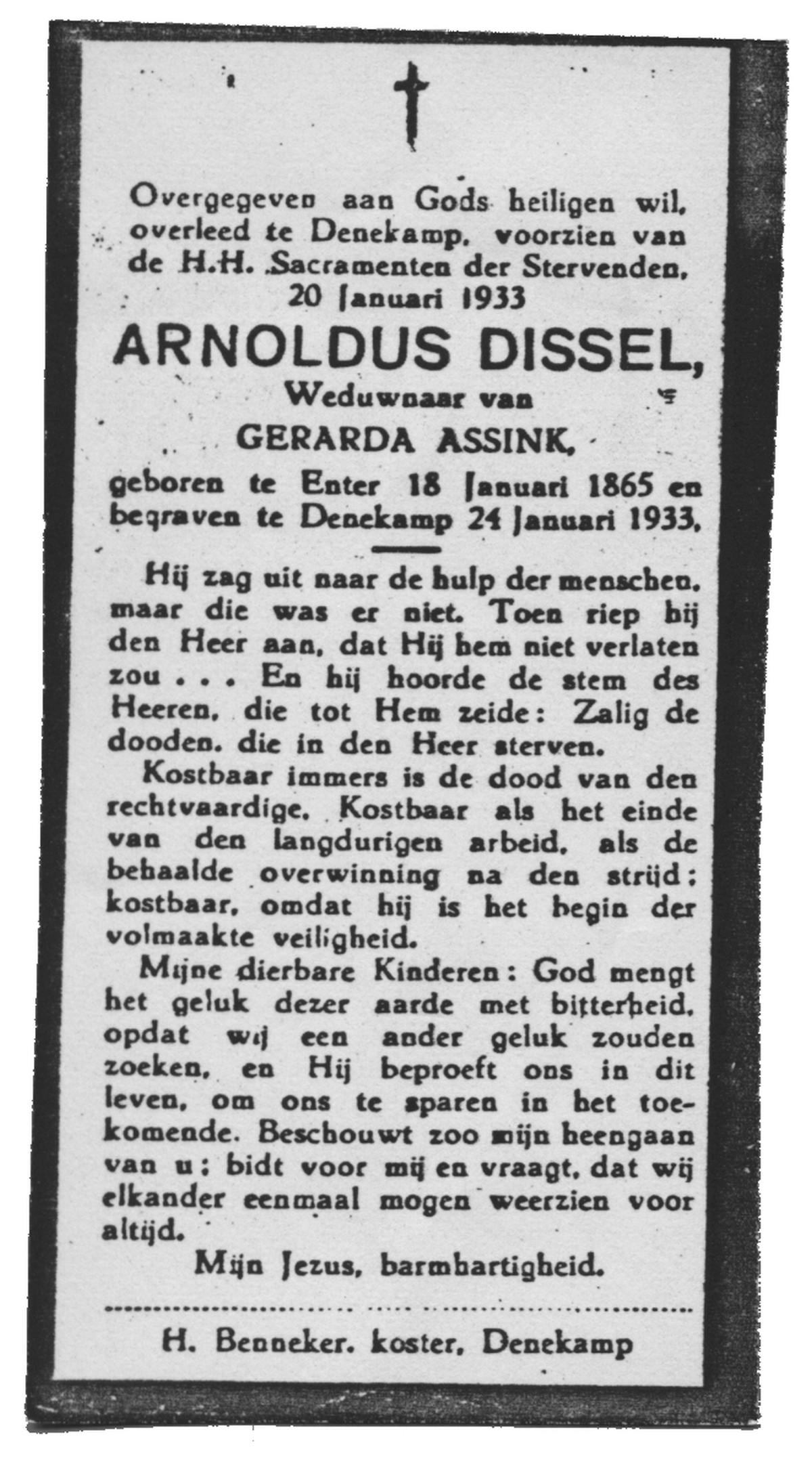 DISSEL, Arnoldus, geboren op 18-01-1865 te Enter, overleden op 20-1-1933 te Denekamp op 68-jarige leeftijd, begraven op 24-1-1933 te Denekamp.