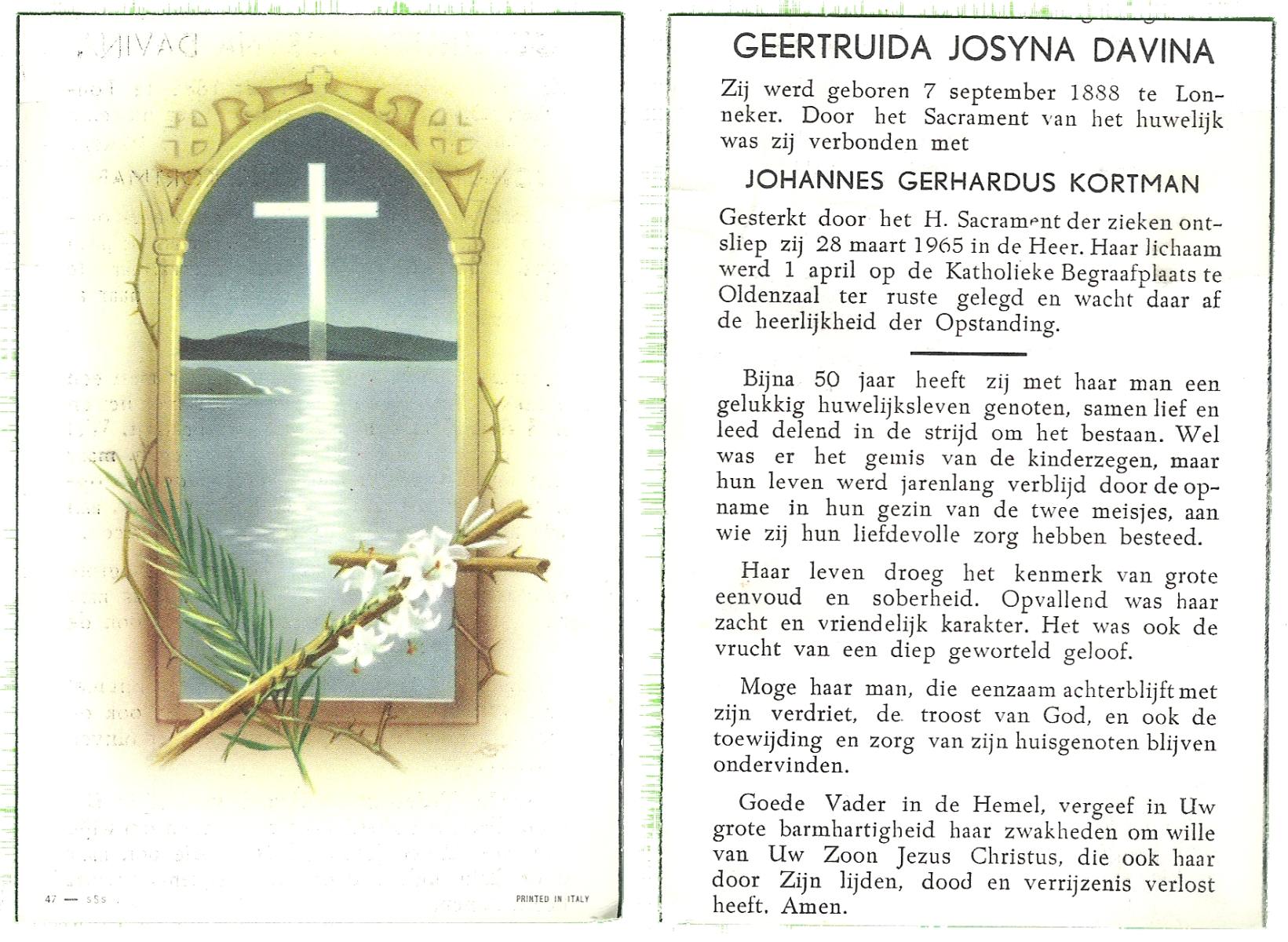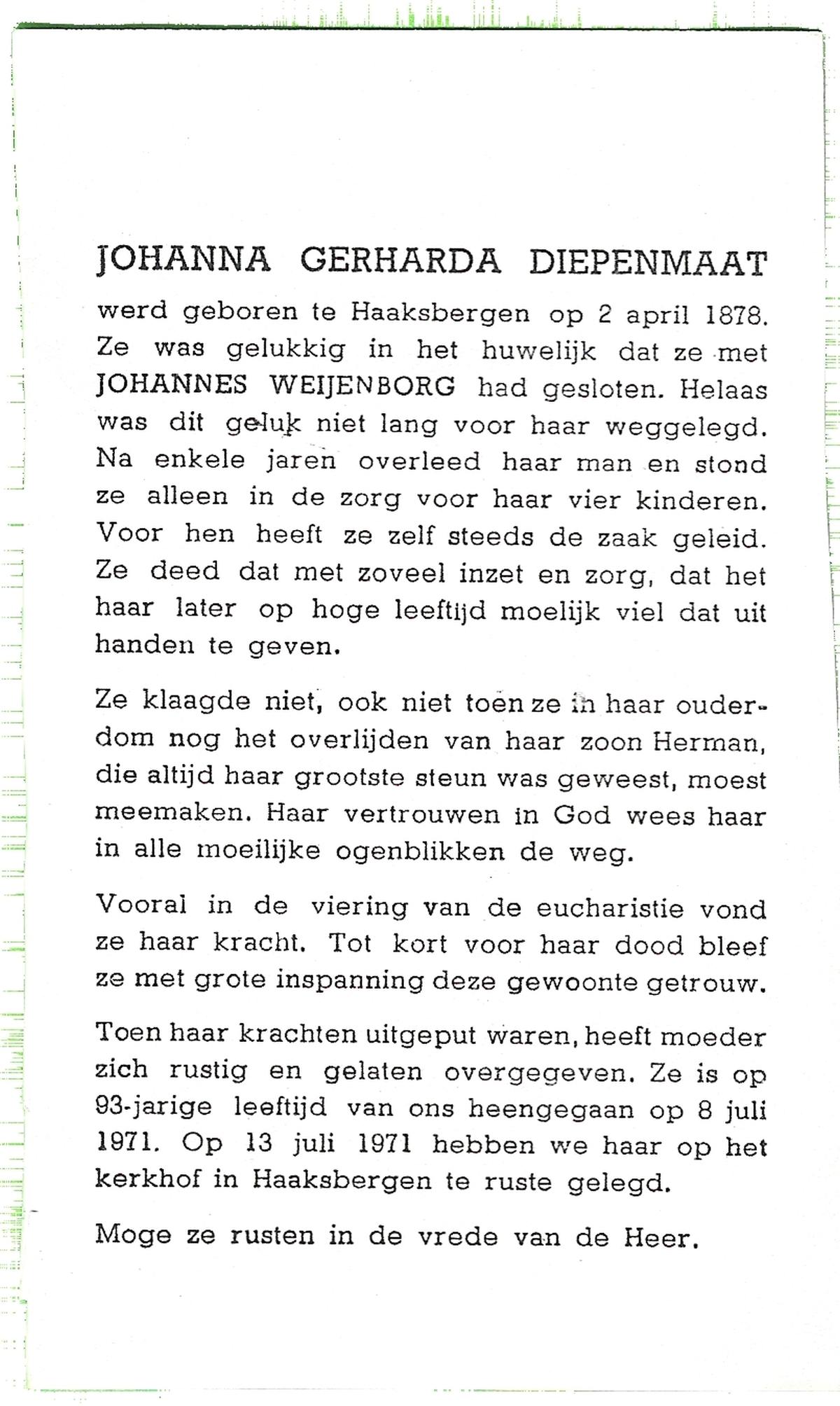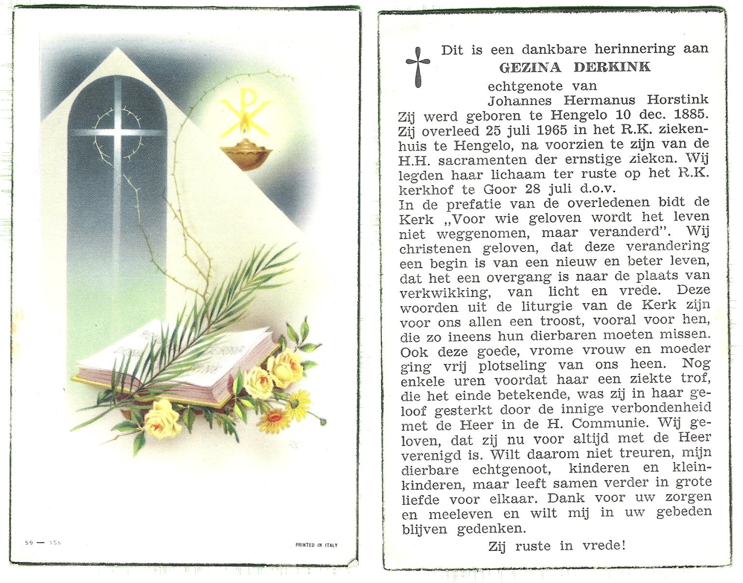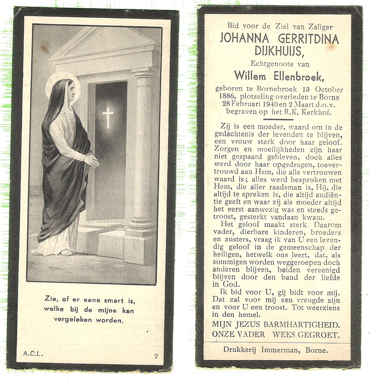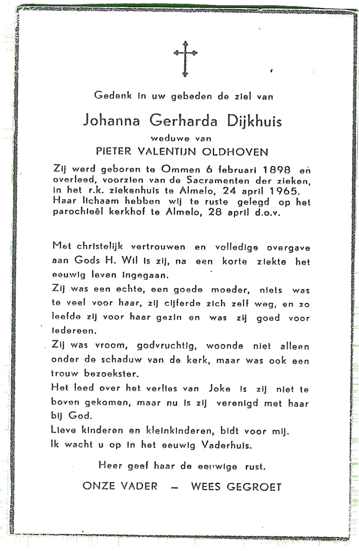 DIJKHUIS, Johanna Gerharda, geboren op 06-02-1898 te Ommen, overleden op 24-4-1965 te Almelo op 67-jarige leeftijd, begraven op 28-4-1965 te Almelo.