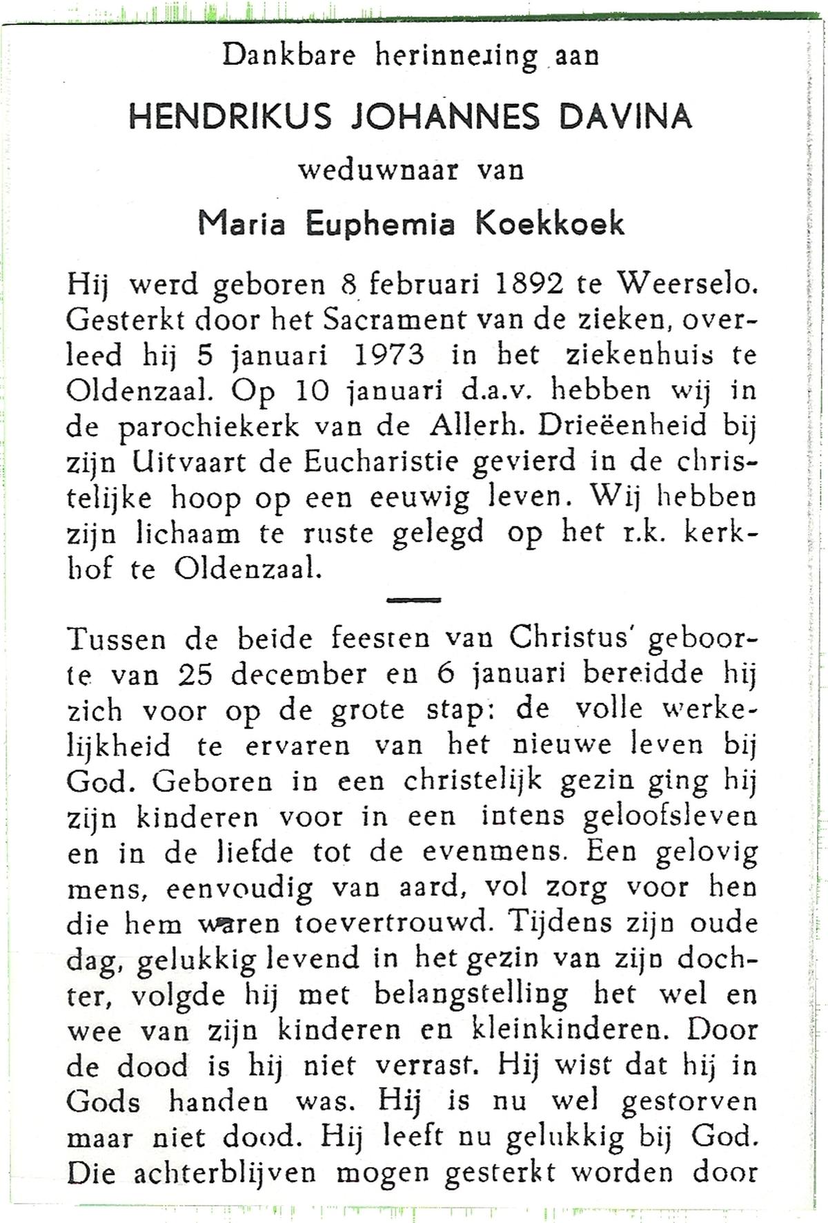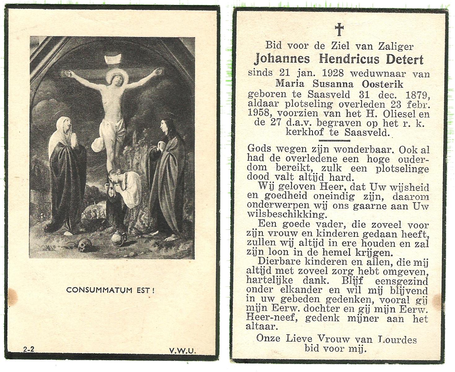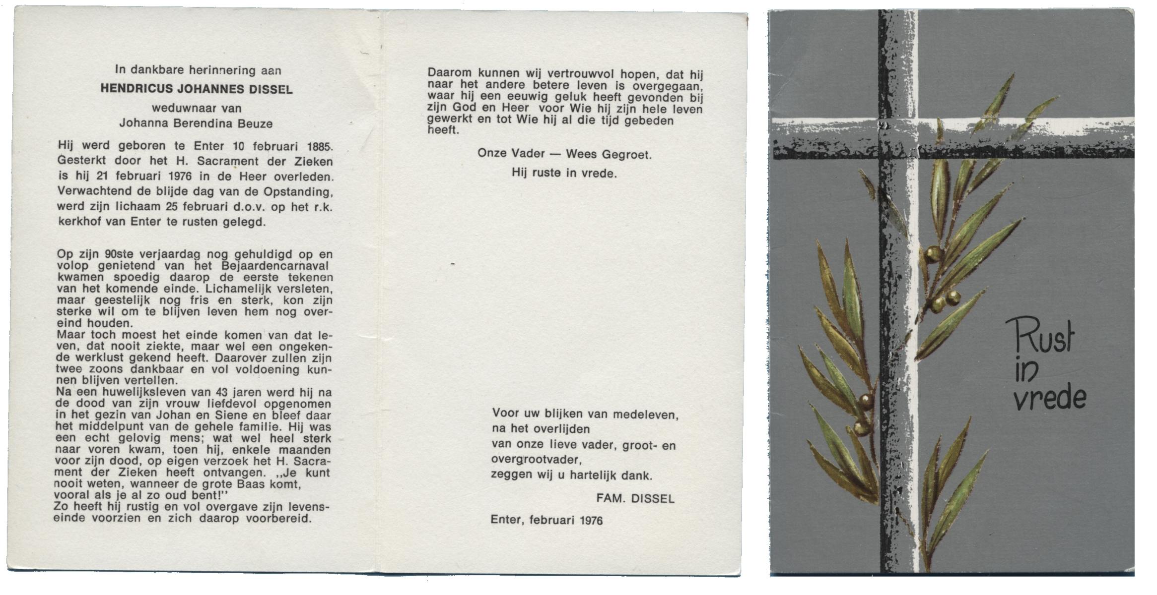DISSEL, Hendricus Johannes, geboren op 10-02-1885 te Enter, overleden op 21-2-1976 te Enter op 91-jarige leeftijd, begraven op 25-2-1976 te Enter.