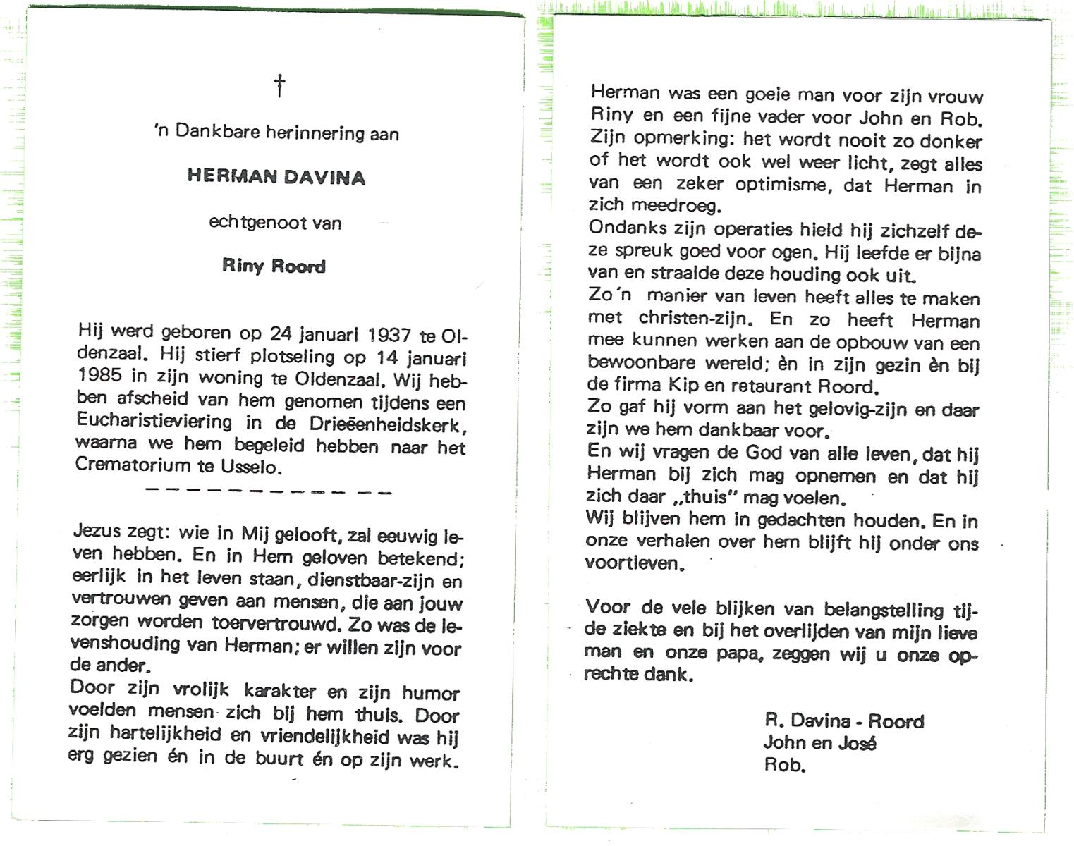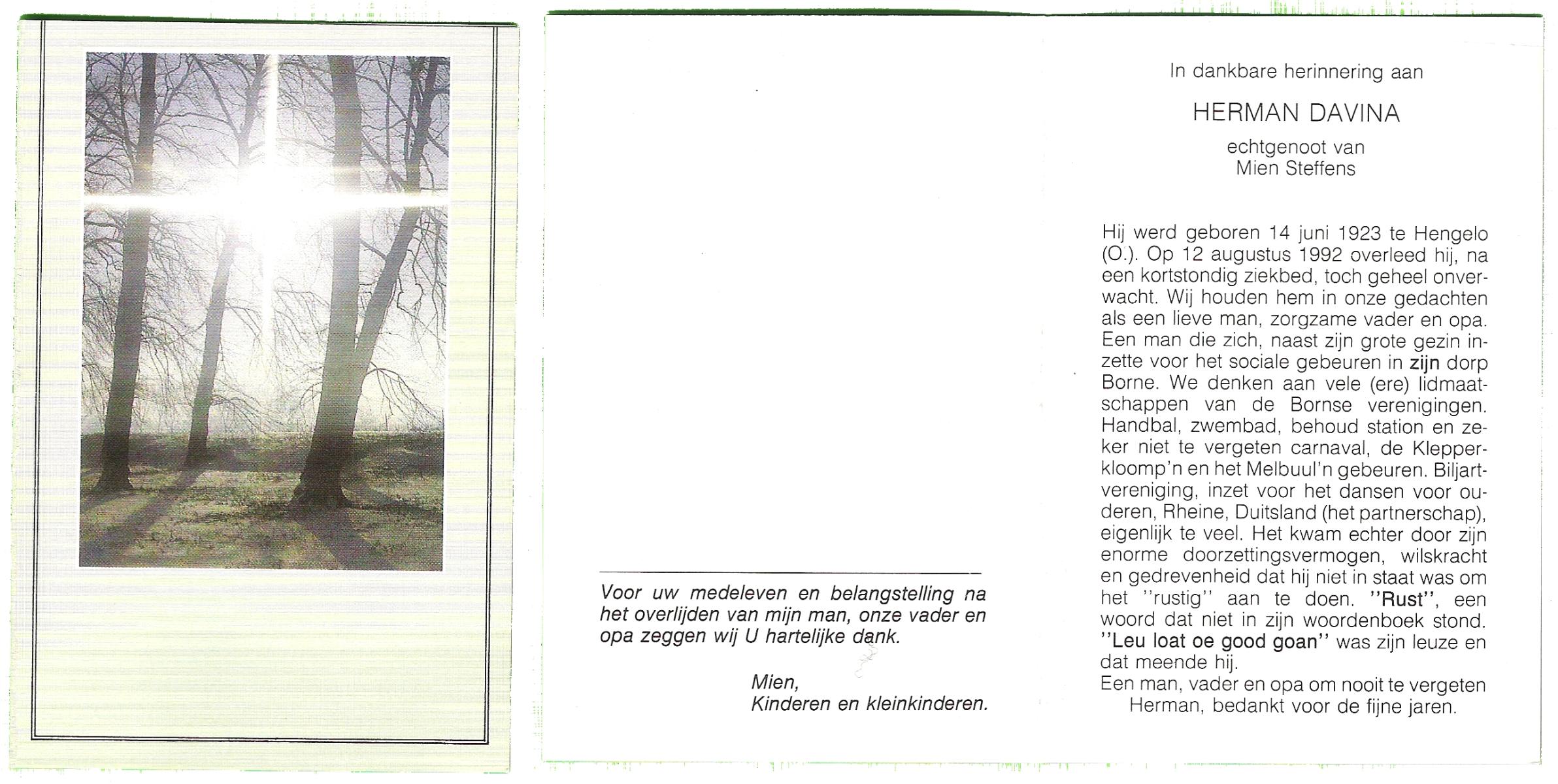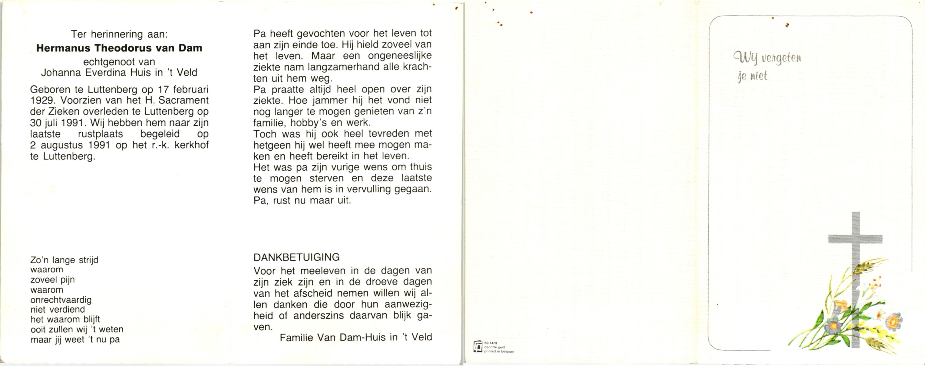 DAM, van, Herman Theodorus, geboren op 17-2-1929 te Raalte, overleden op 30-7-1991 te Raalte, Luttenberg op 62-jarige leeftijd, begraven op 2-8-1991 te Raalte, Luttenberg.