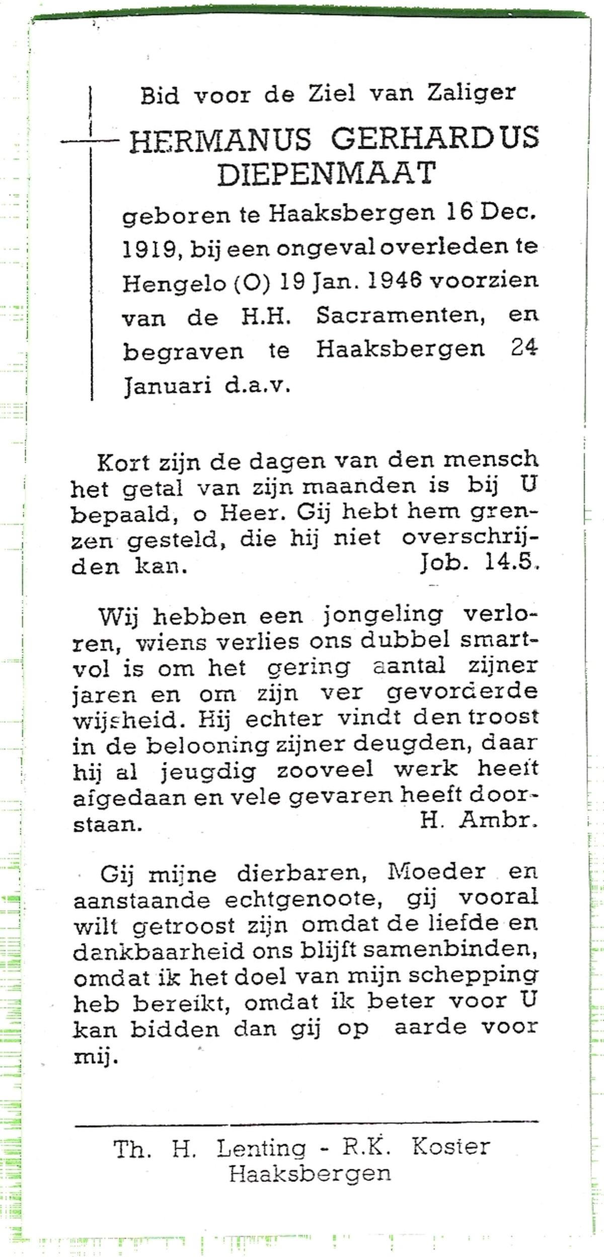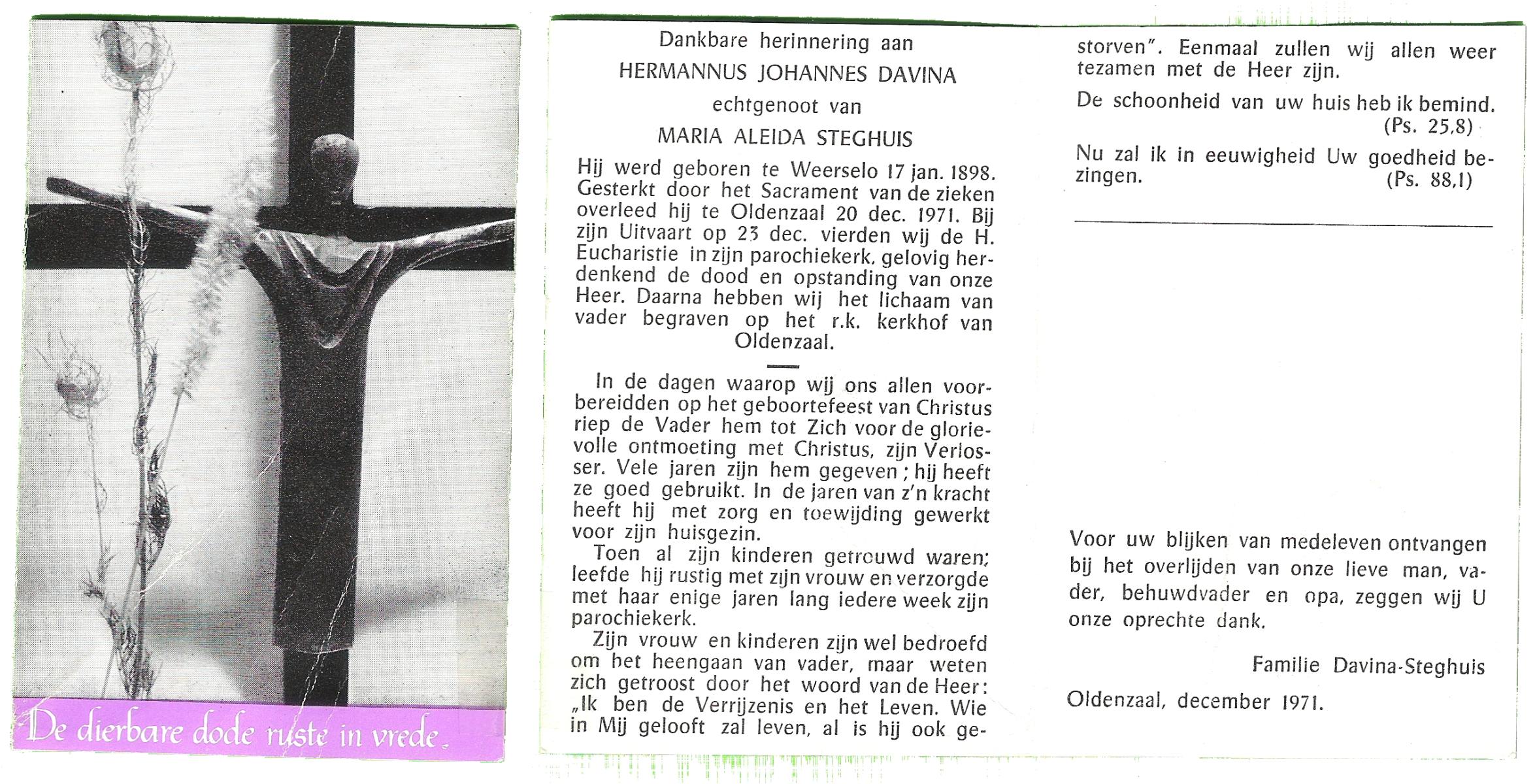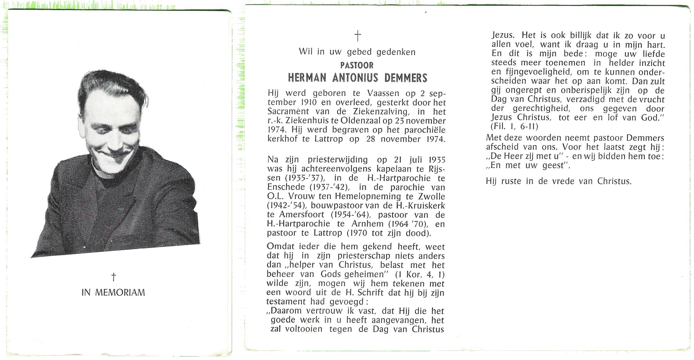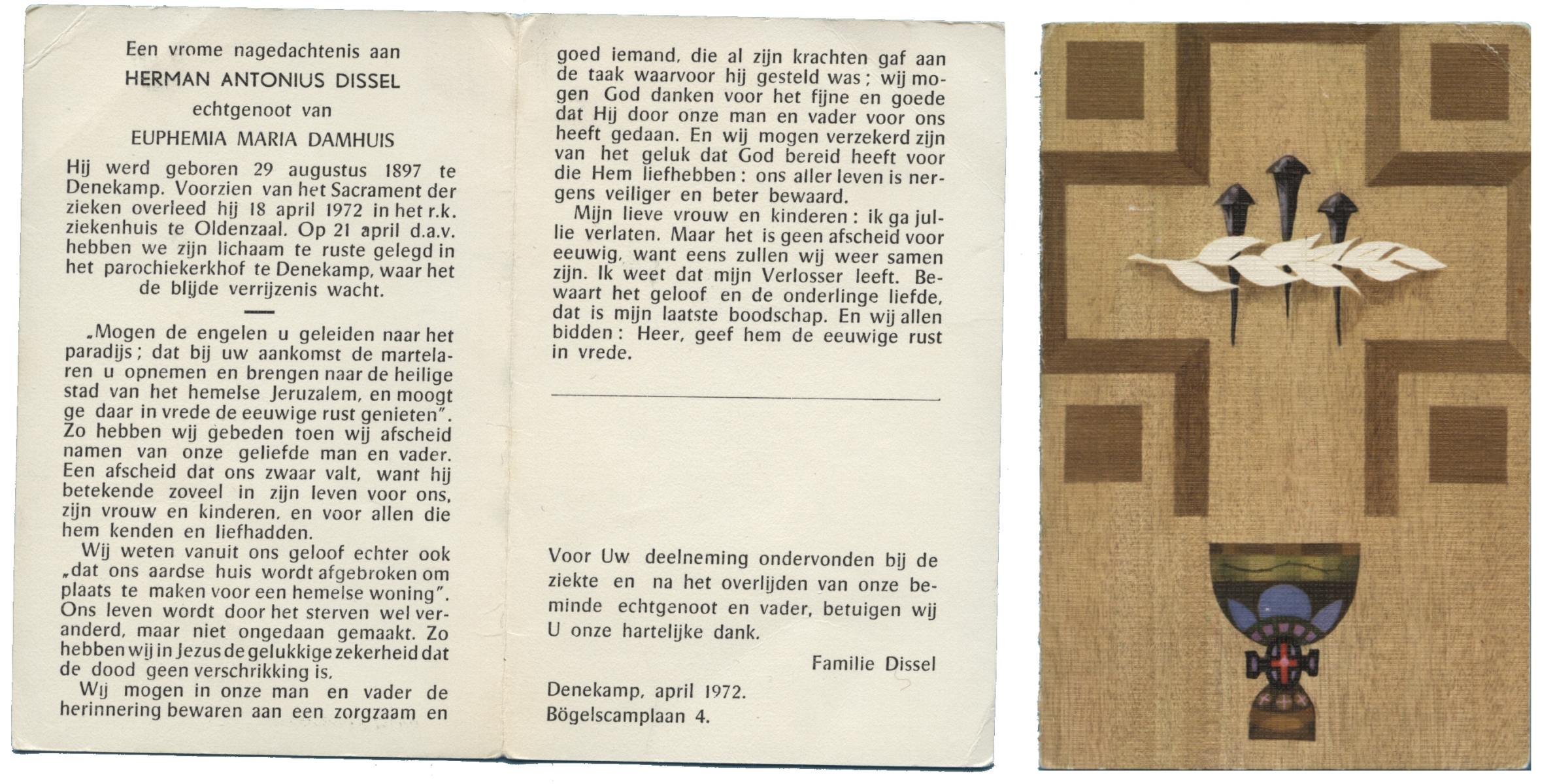 DISSEL, Herman Antonius, geboren op 29-08-1897 te Denekamp, overleden op 18-4-1972 te Oldenzaal op 74-jarige leeftijd, begraven op 21-4-1972 te Denekamp.